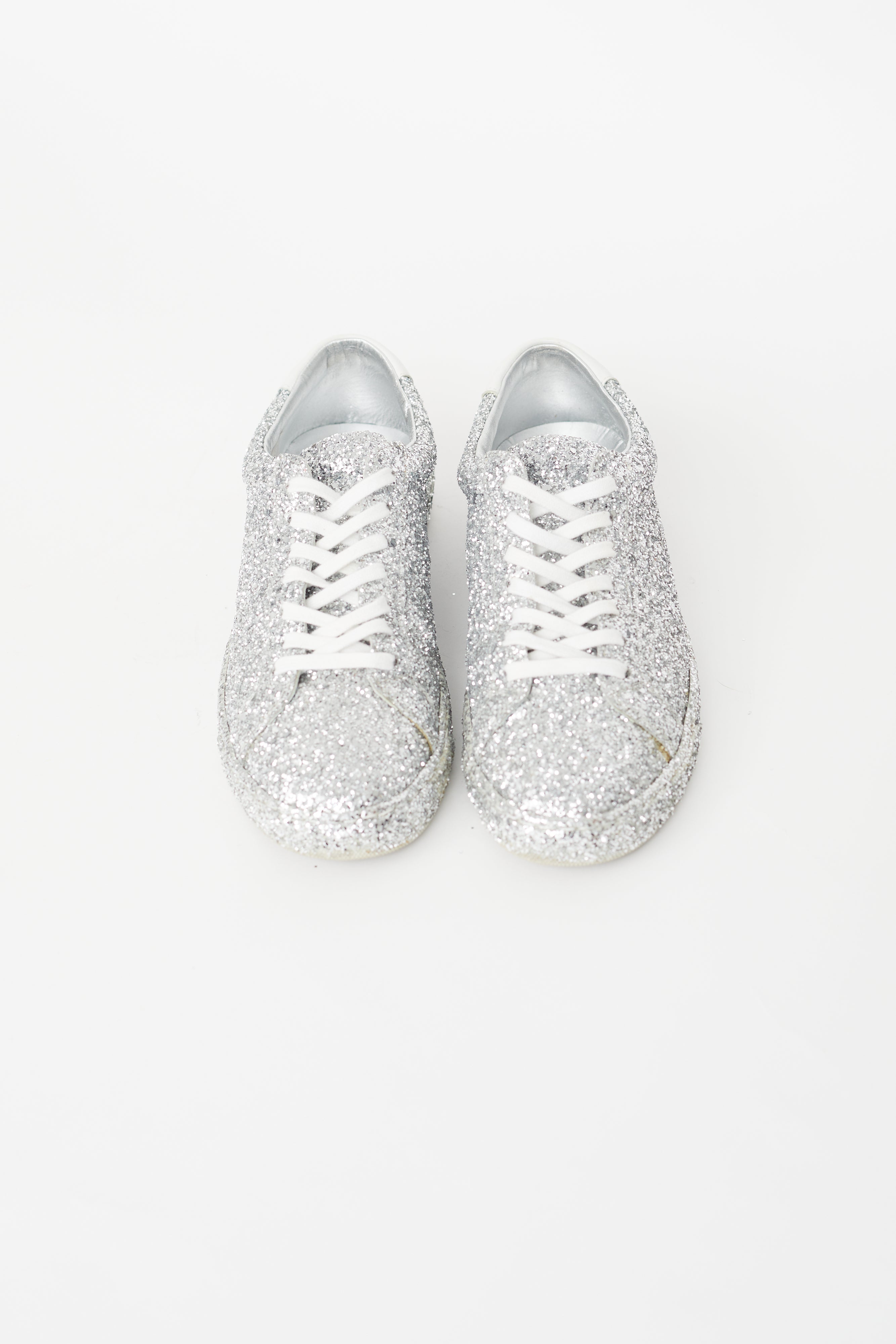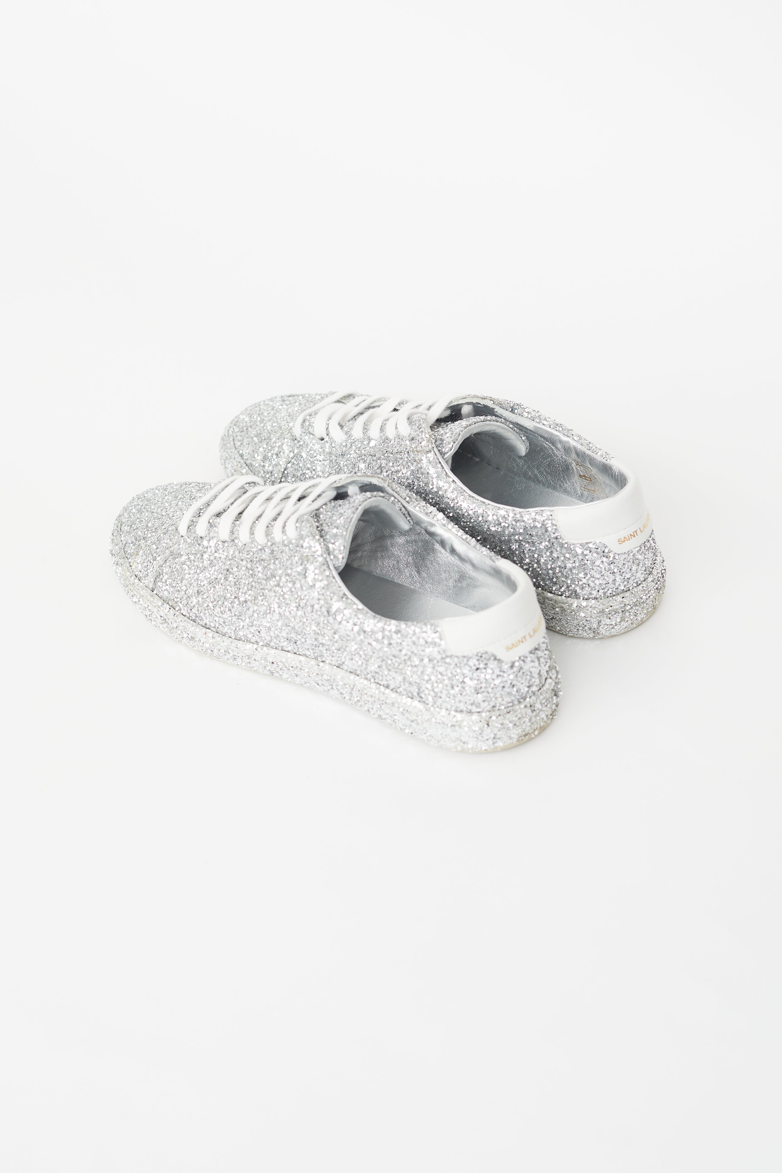 Pre-owned Saint Laurent silver Andy sneaker featuring tonal glitter detailing throughout, round toe, embossed logo at heel, and lace up closure. Comes with original dust bag.