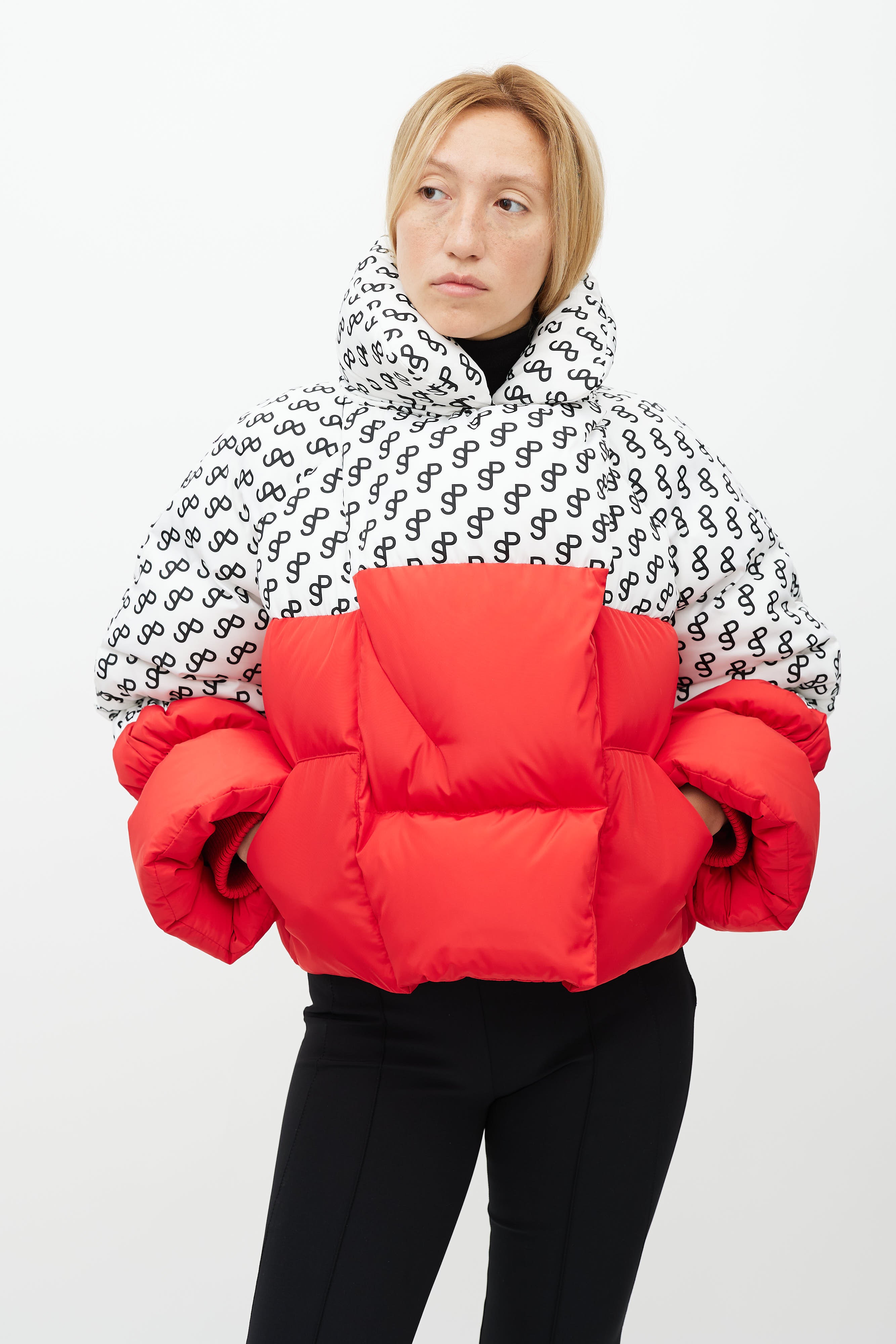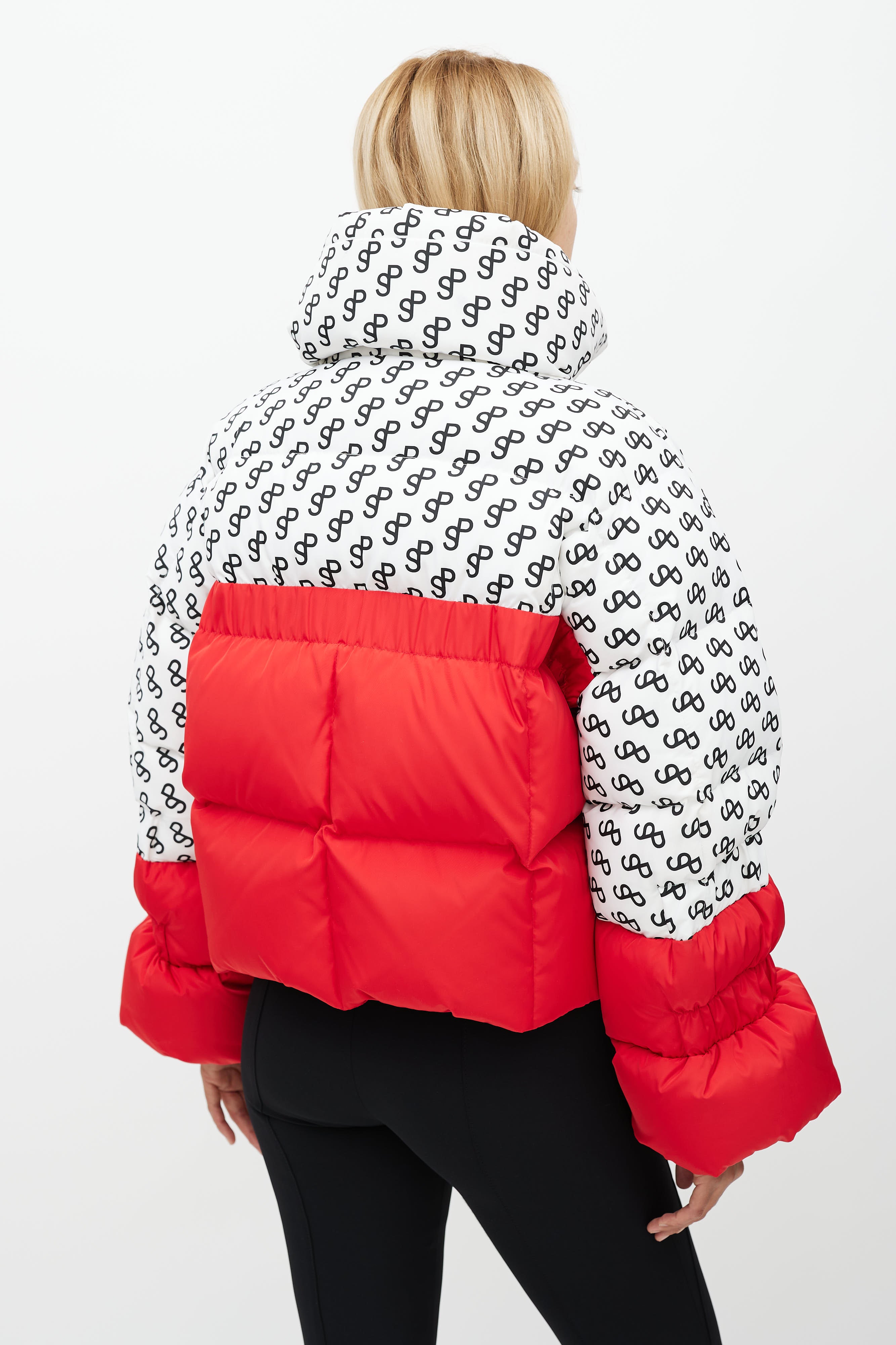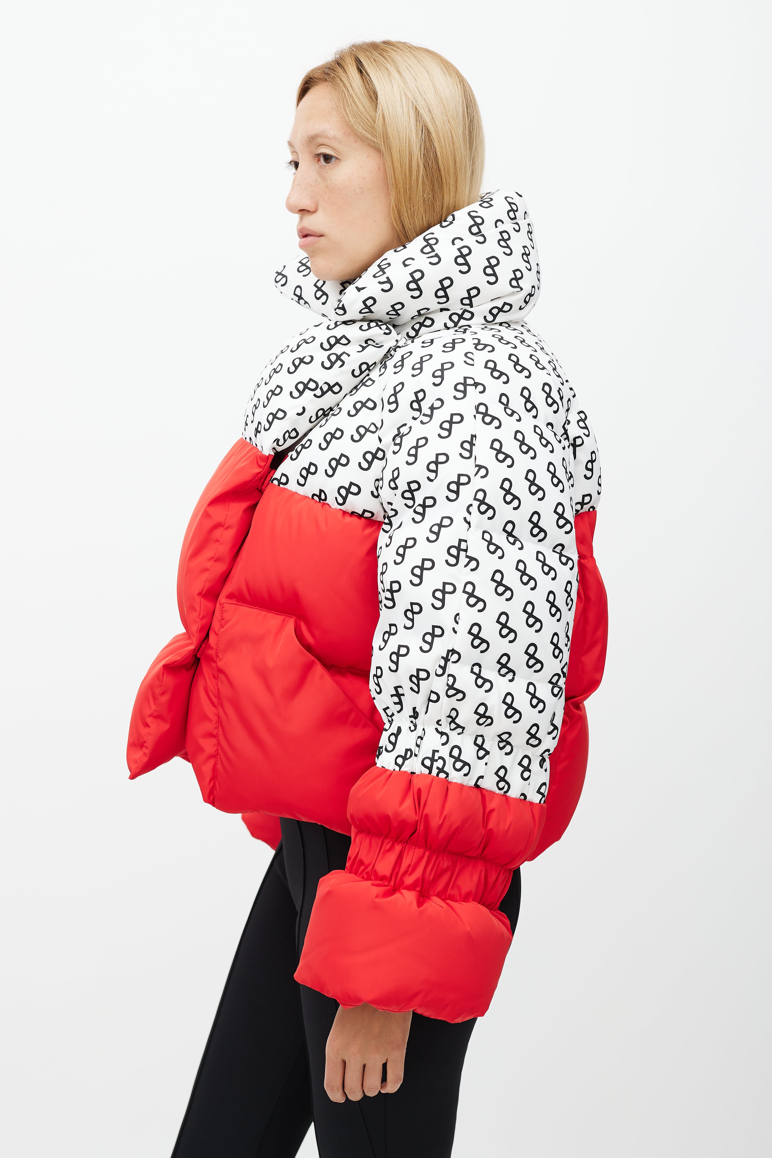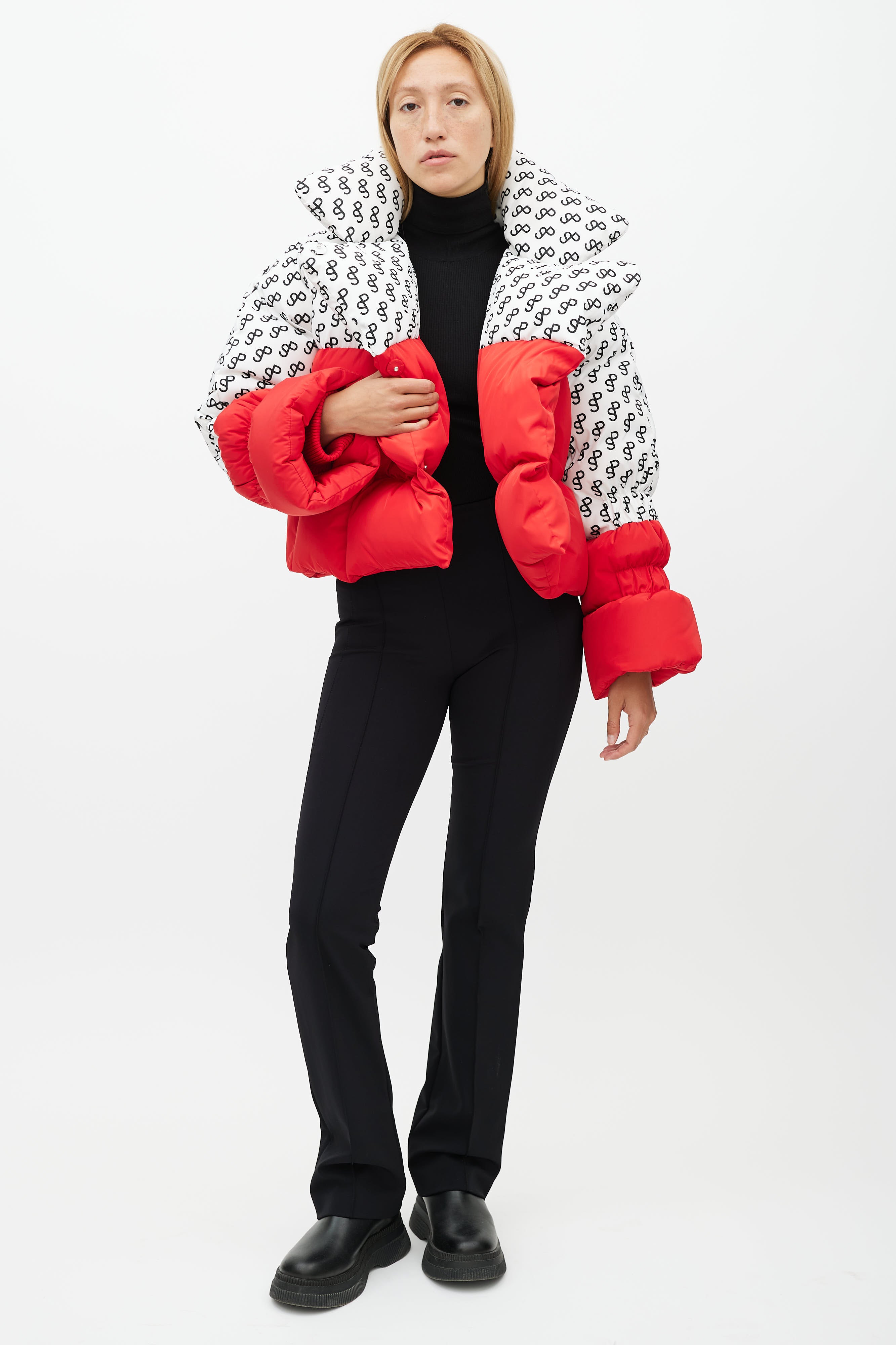 Pre-owned Saks Potts red and white puffer jacket featuring a black monogram print throughout, high collar, front slash pockets, elasticized cuffs, ribbed knit inserts under sleeve, and double breasted button up front.