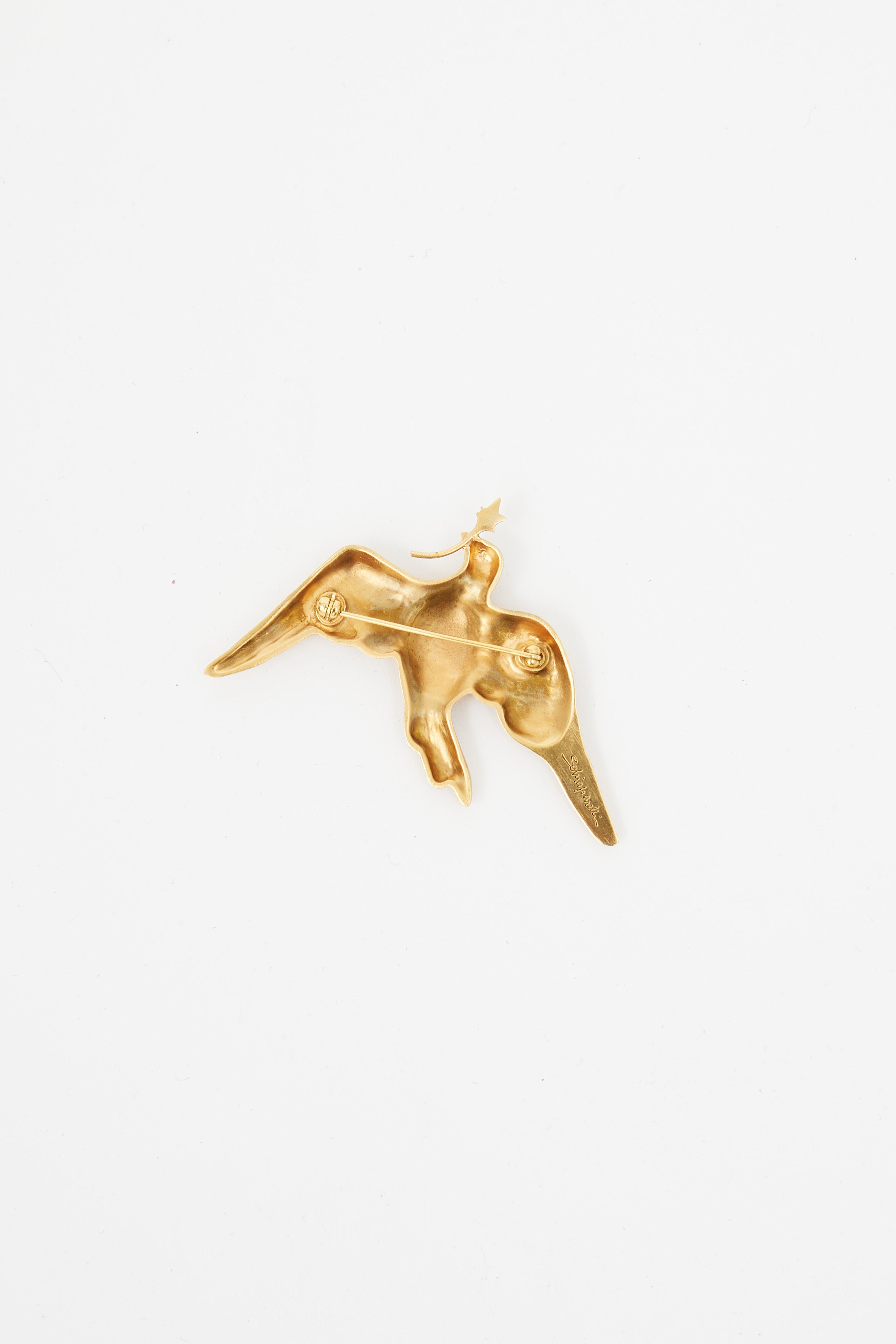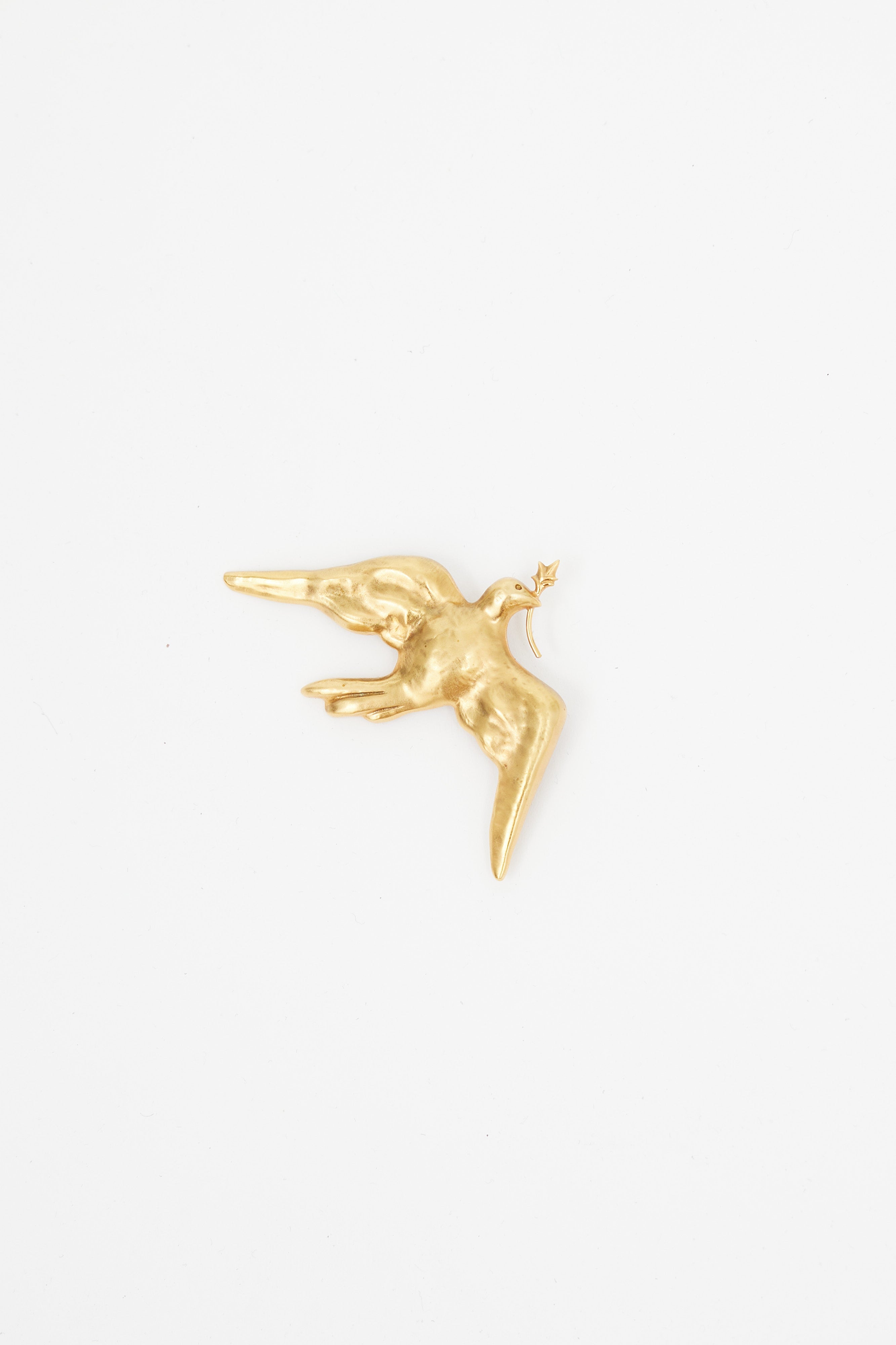 Pre-owned Schiaparelli gold tone brooch featuring dove and olive branch design and back engraved logo.