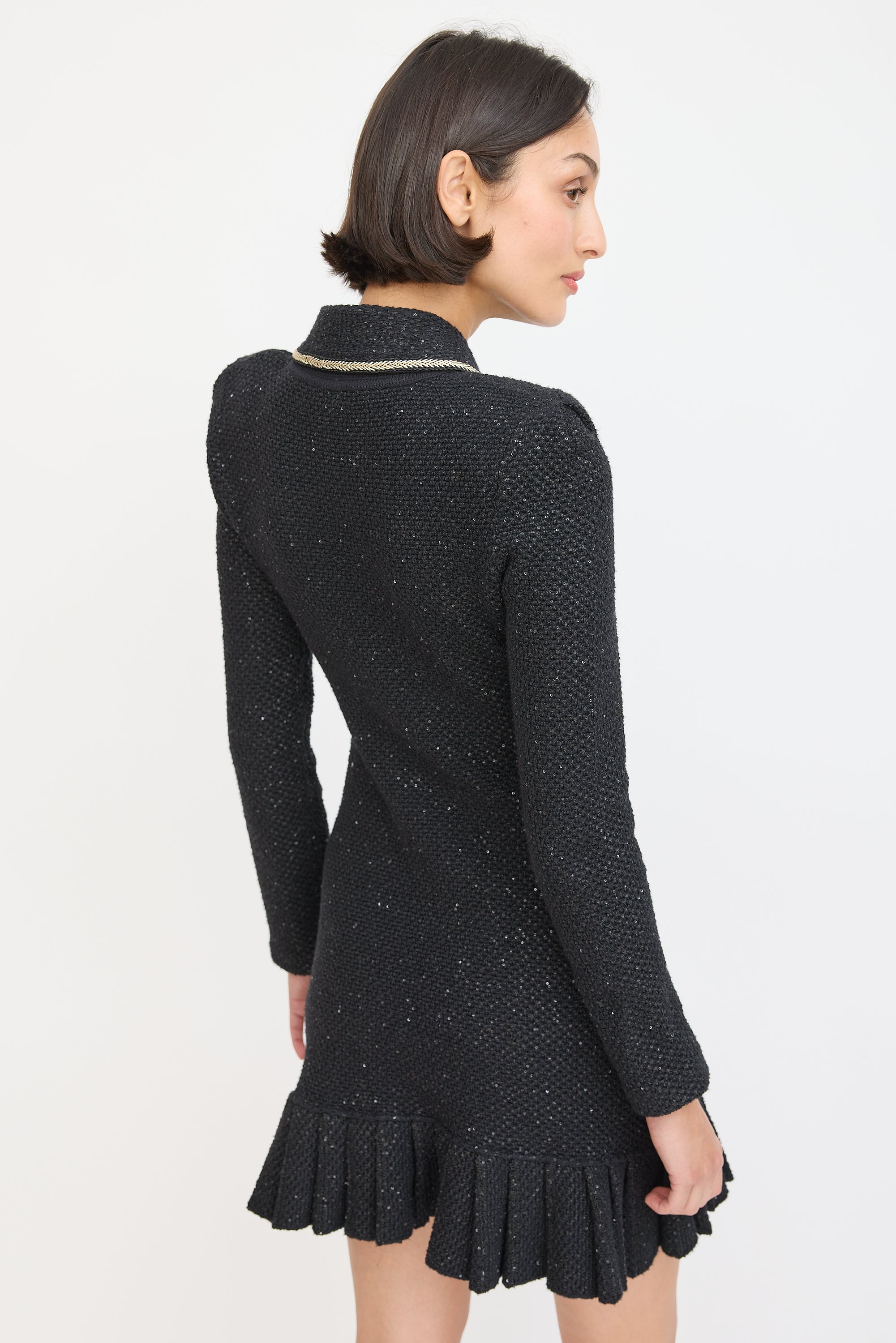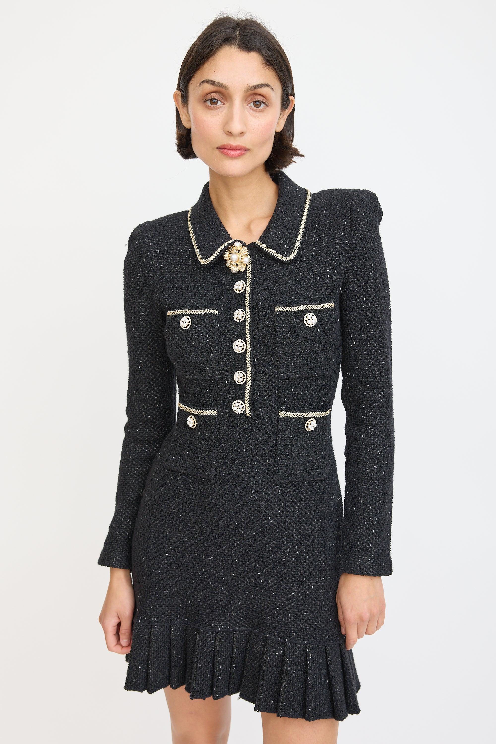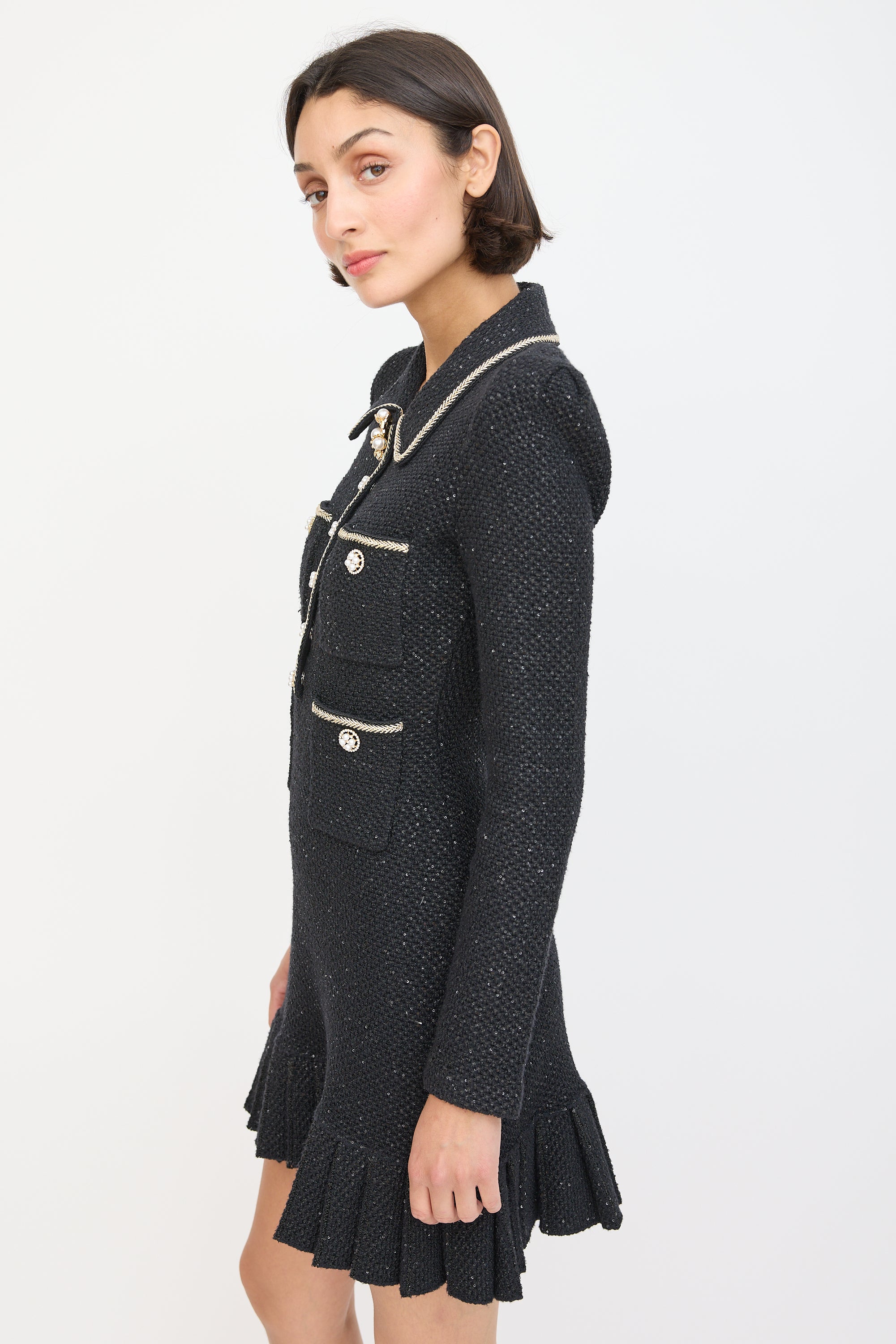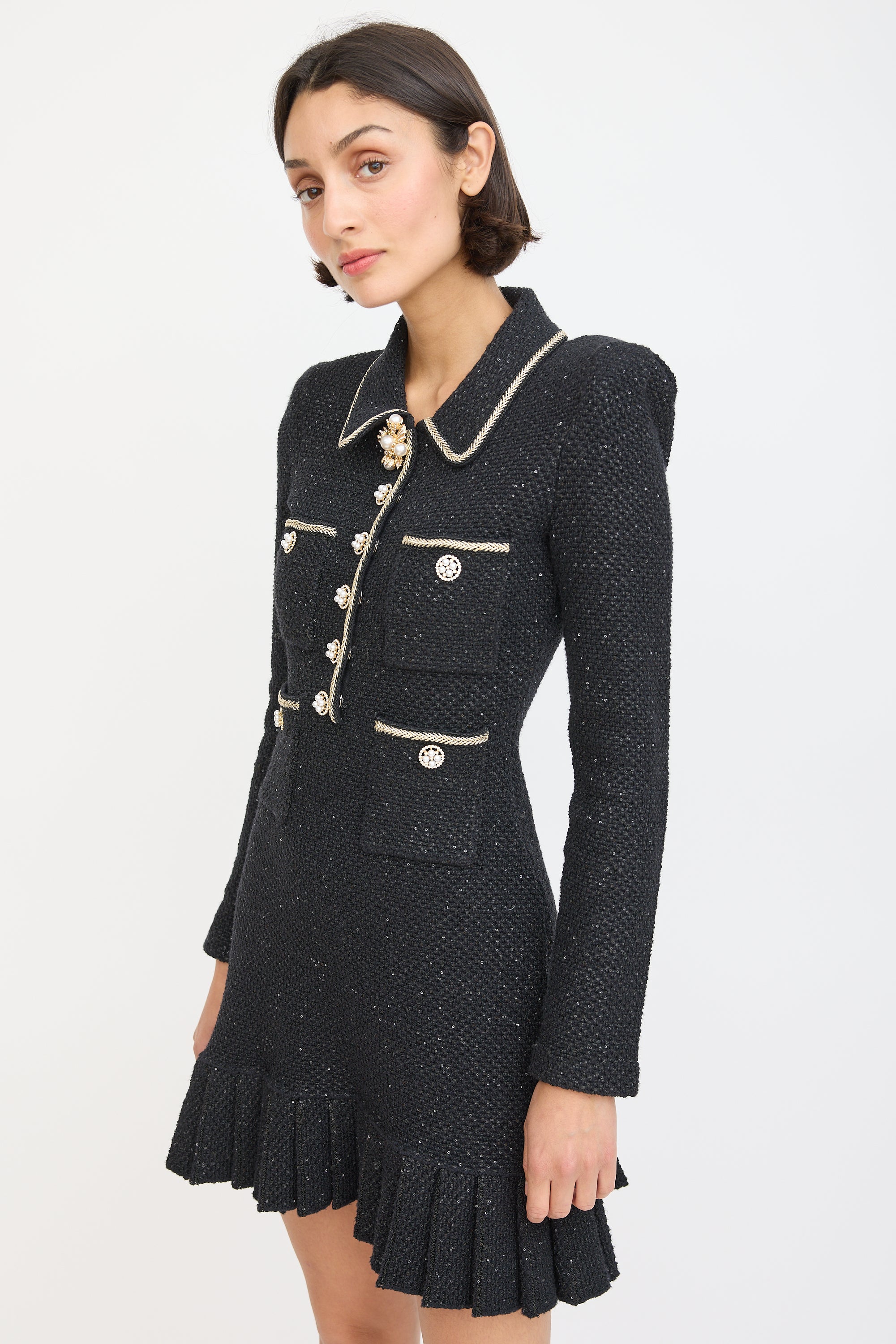 Pre-owned Self-Portrait black knit mini dress featuring a collared neck, sequins throughout, four front patch pockets, braided gold tone trim and decorative pearl and rhinestone embellished buttons throughout, pleated hem, padded shoulders, long sleeves, and removable brooch.