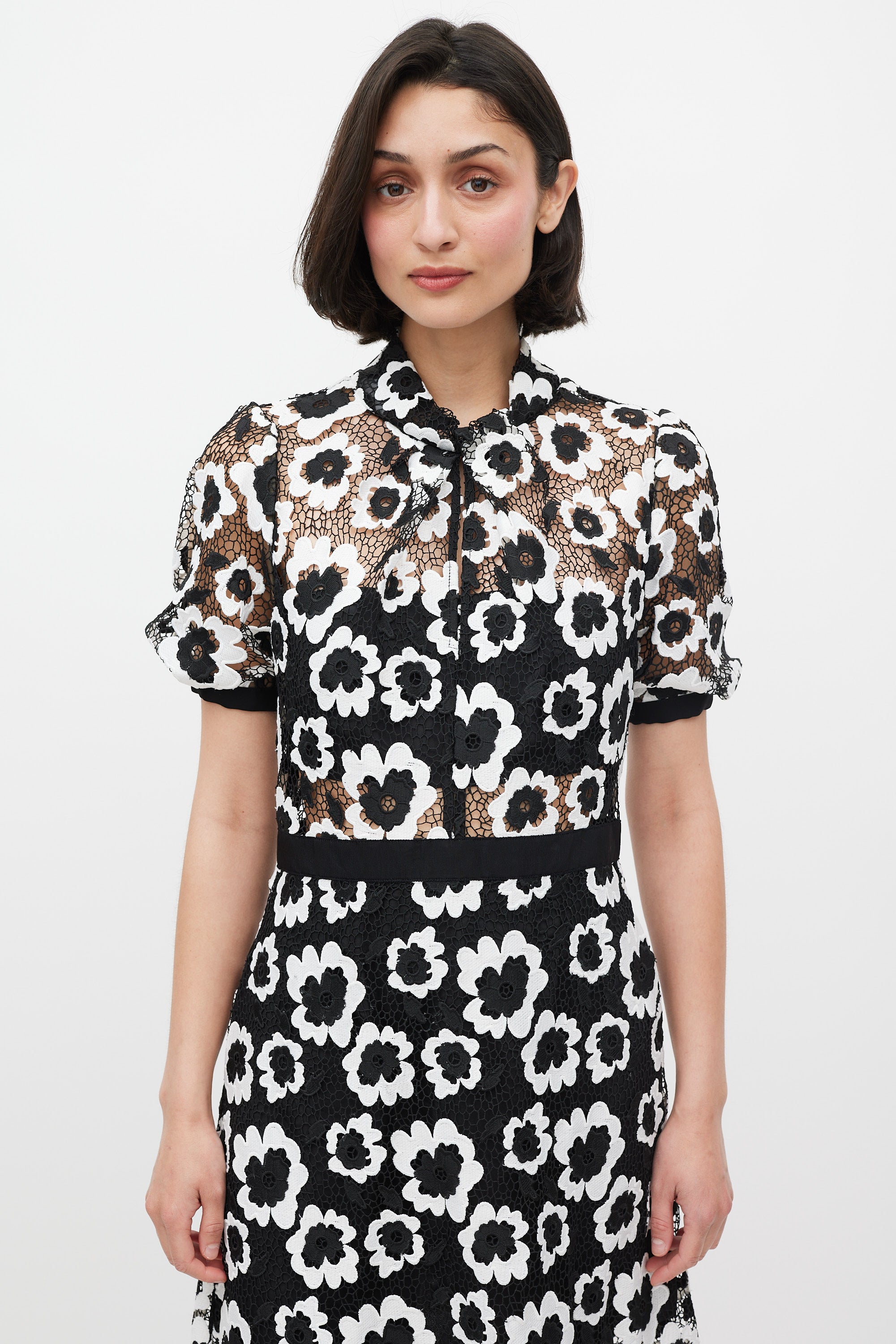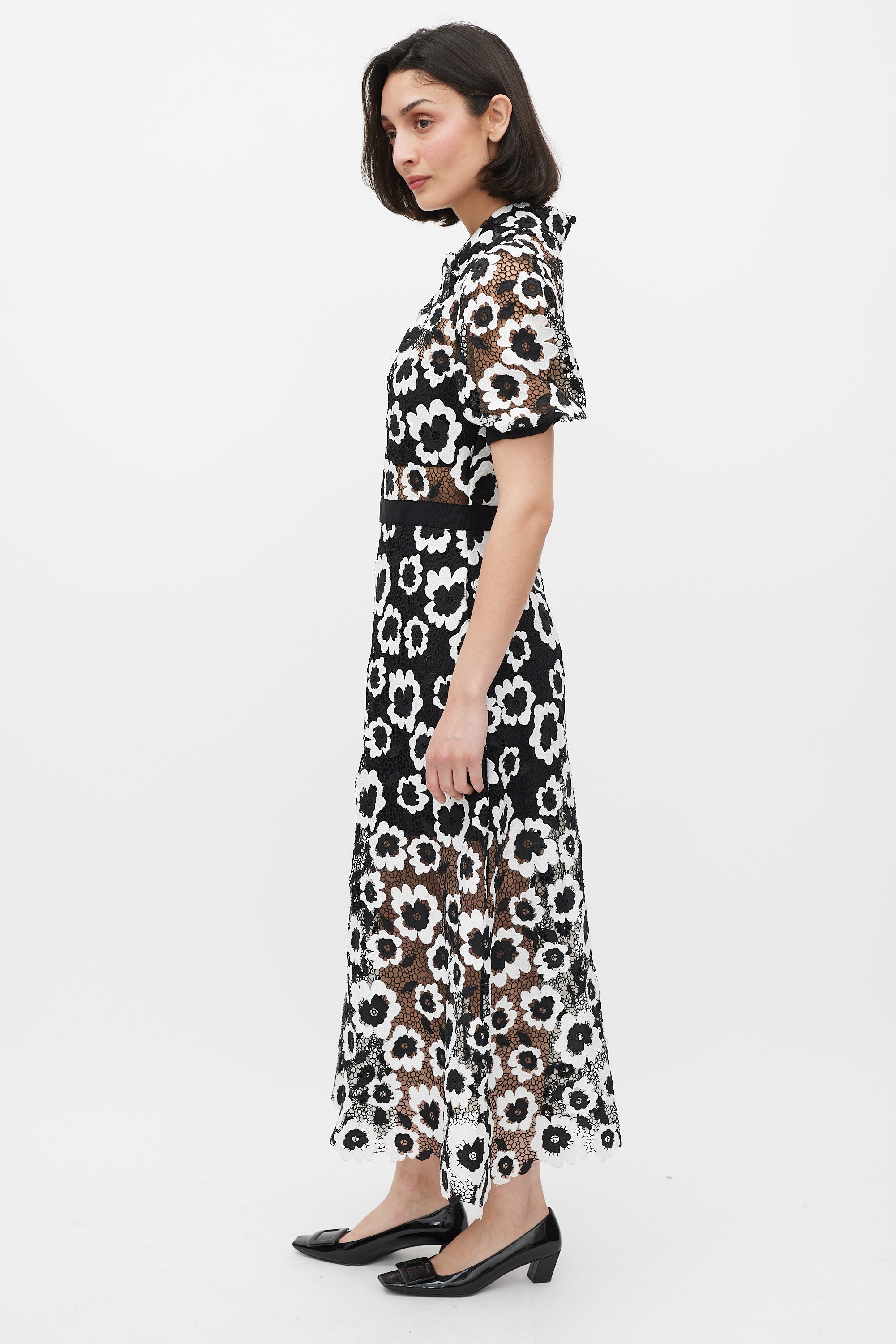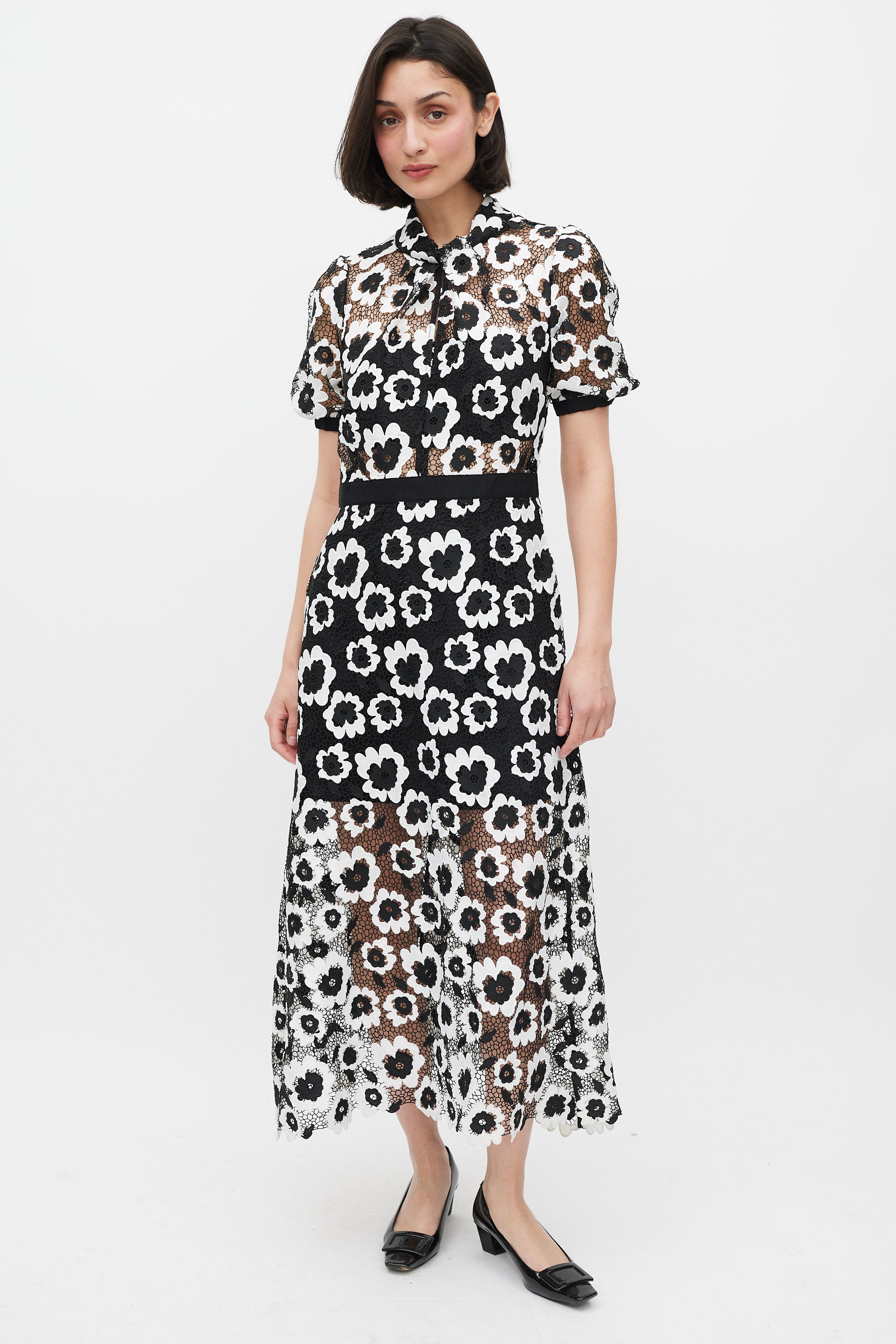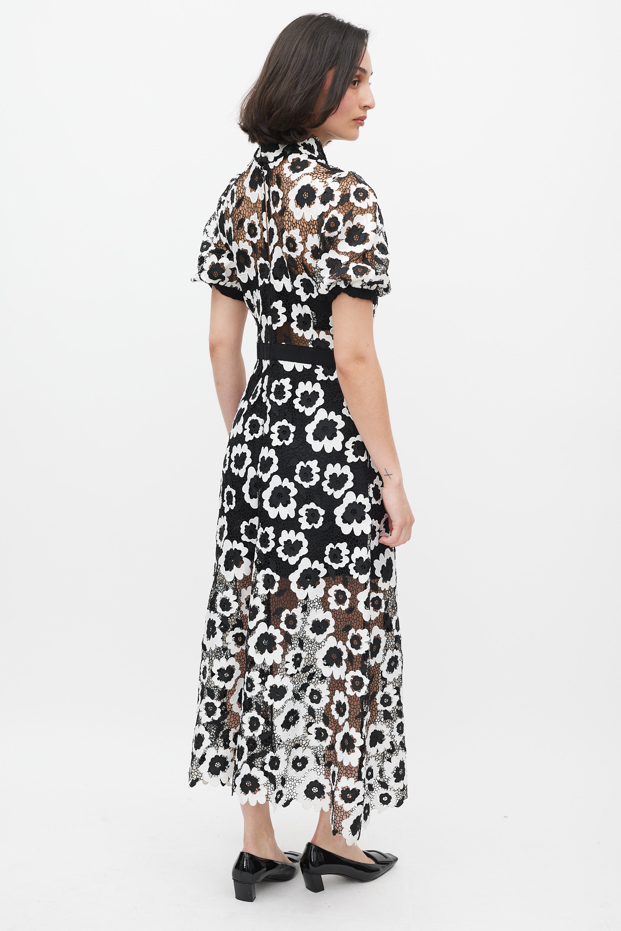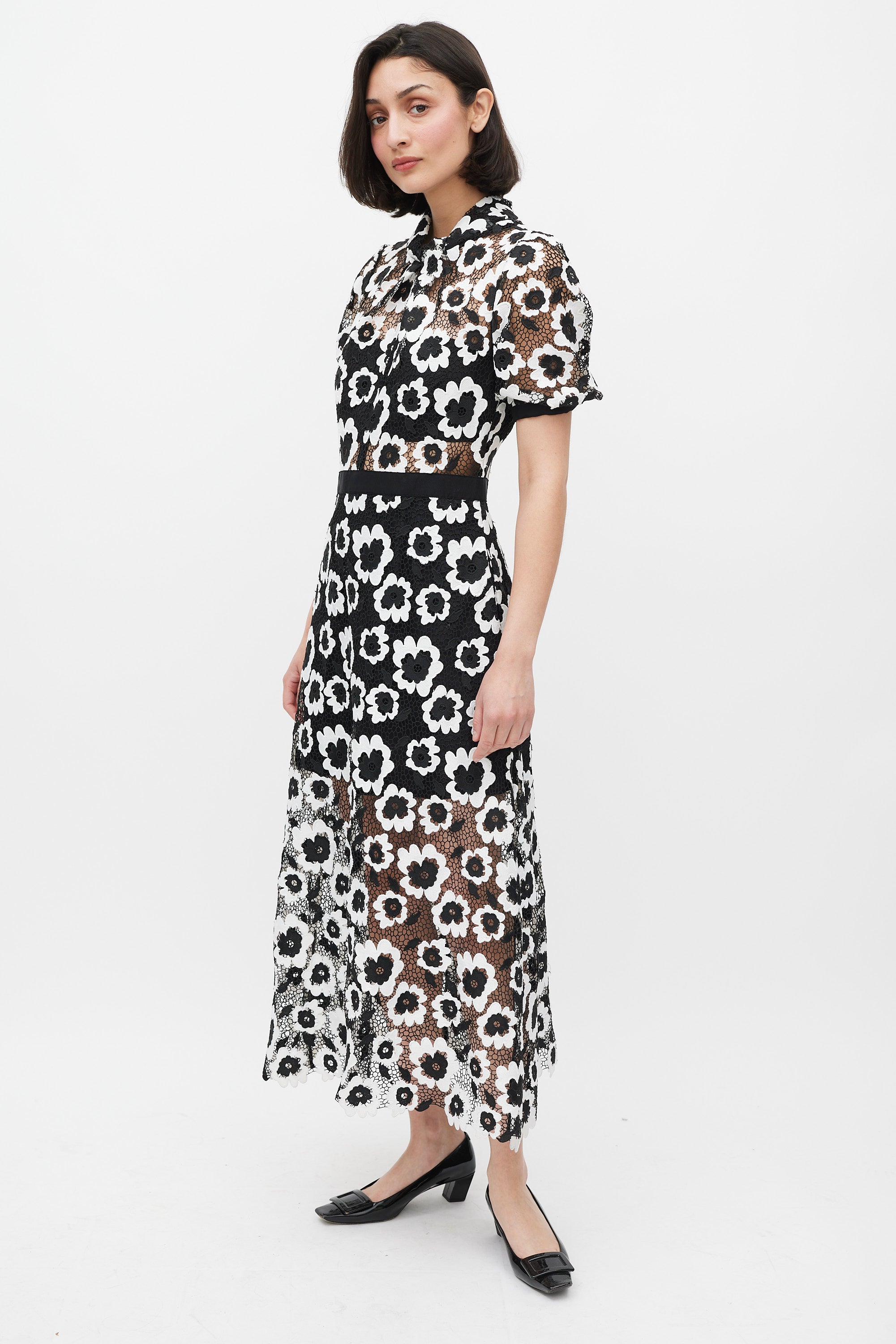 Pre-owned Self-Portrait black and white floral Guipure lace midi dress featuring a mock neck, keyhole cutout at centre front with pleat detail, grosgrain ribbon at waist, in seam pockets, full skirt, short puff sleeves with elasticized cuffs, and concealed back zip closure. Lined.