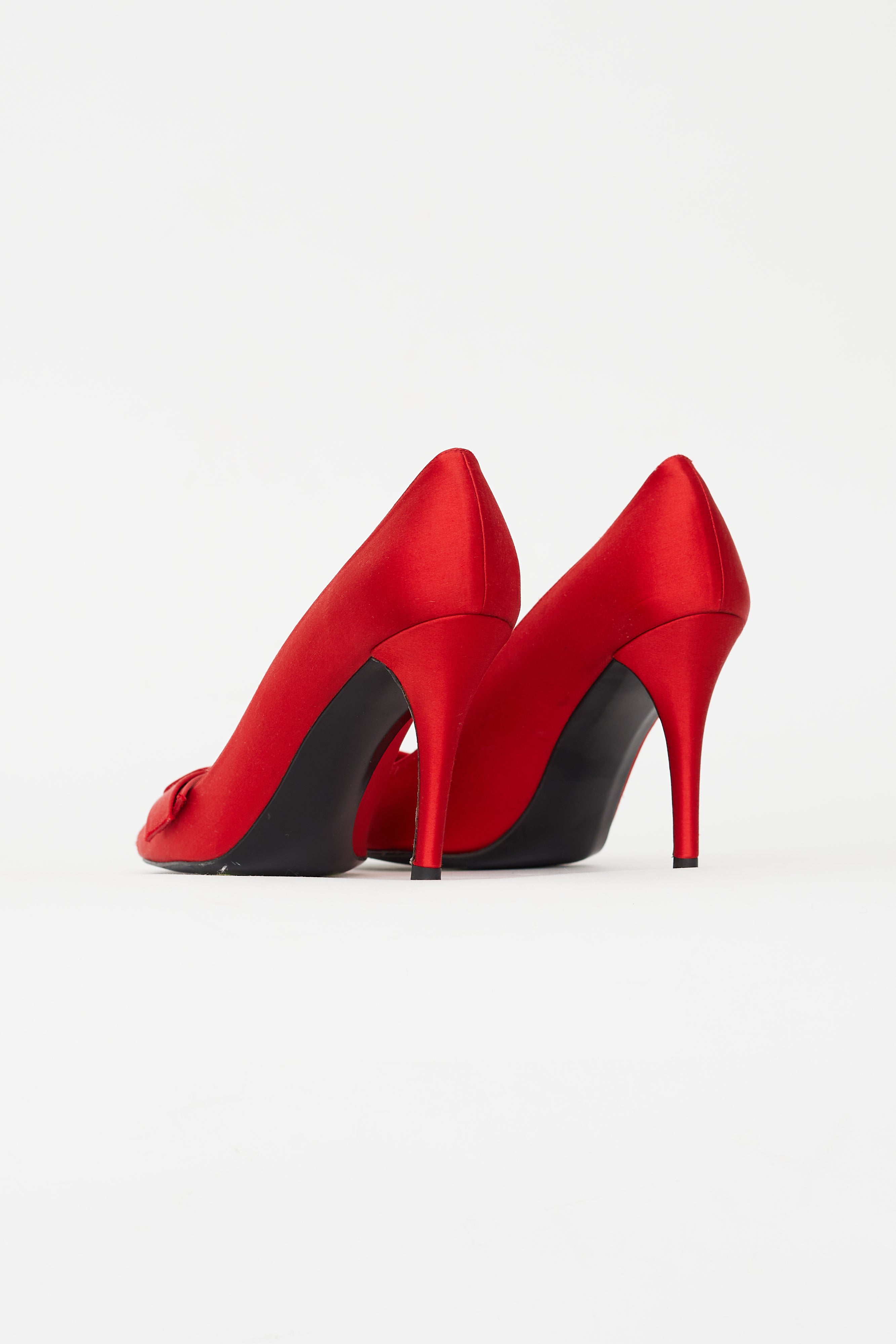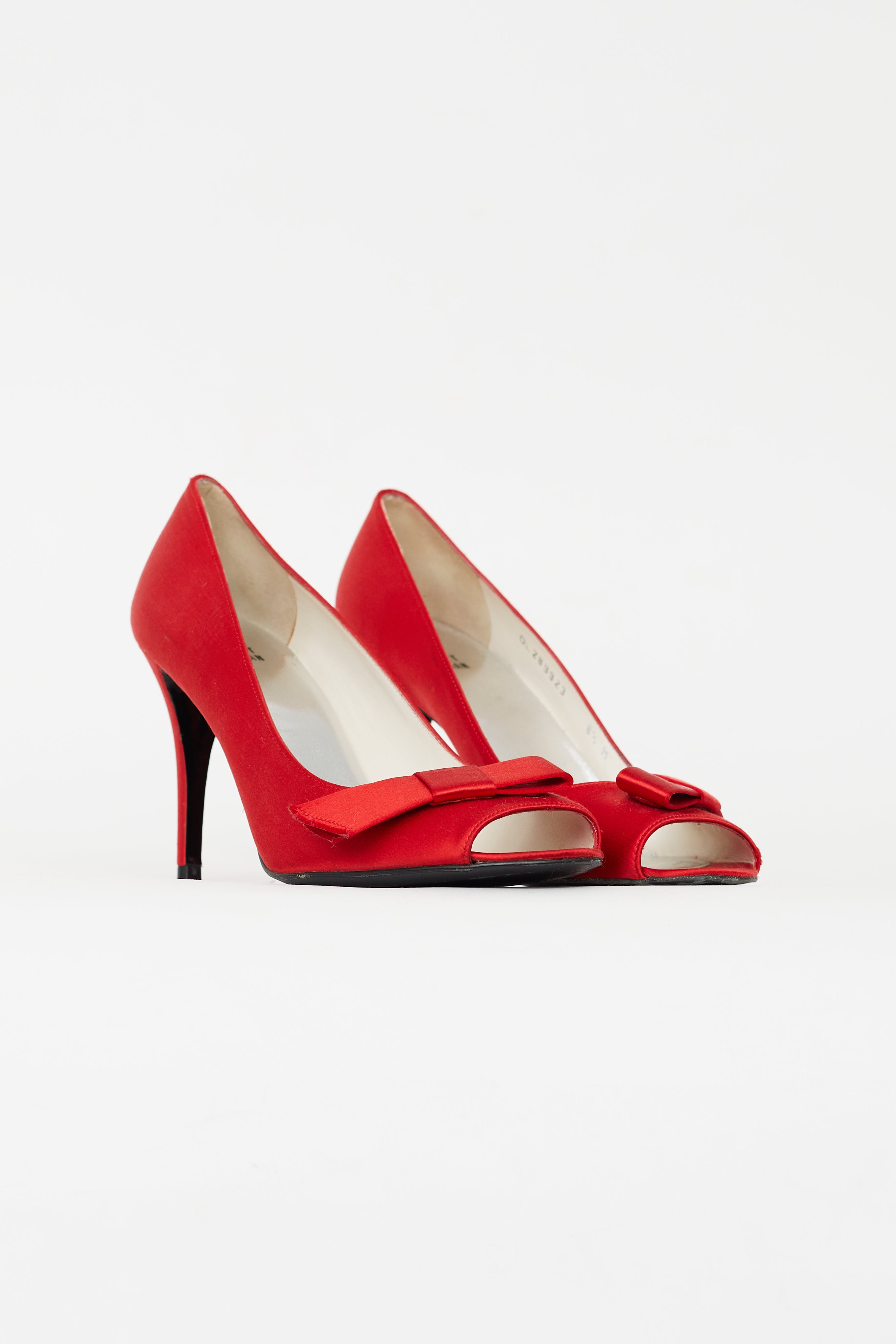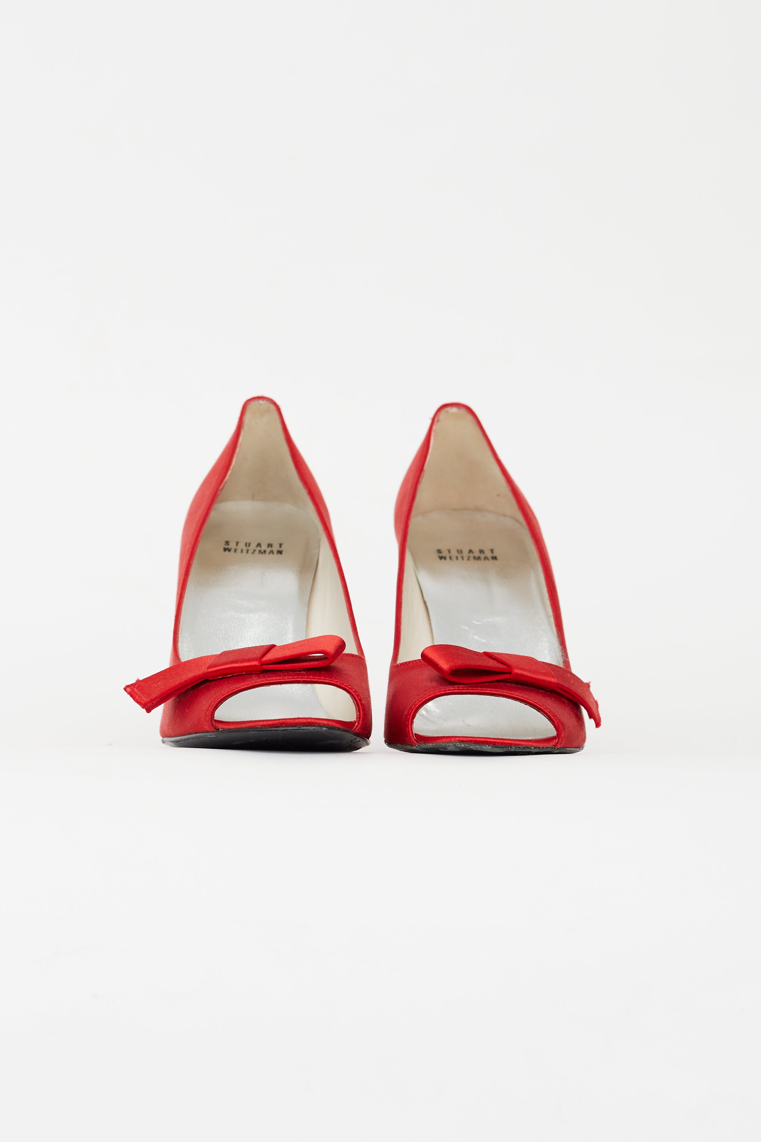 Pre-owned Stuart Weitzman red satin heels featuring a peep toe, bow detail at vamp, and wrapped stiletto heel. Comes with original dust bag.