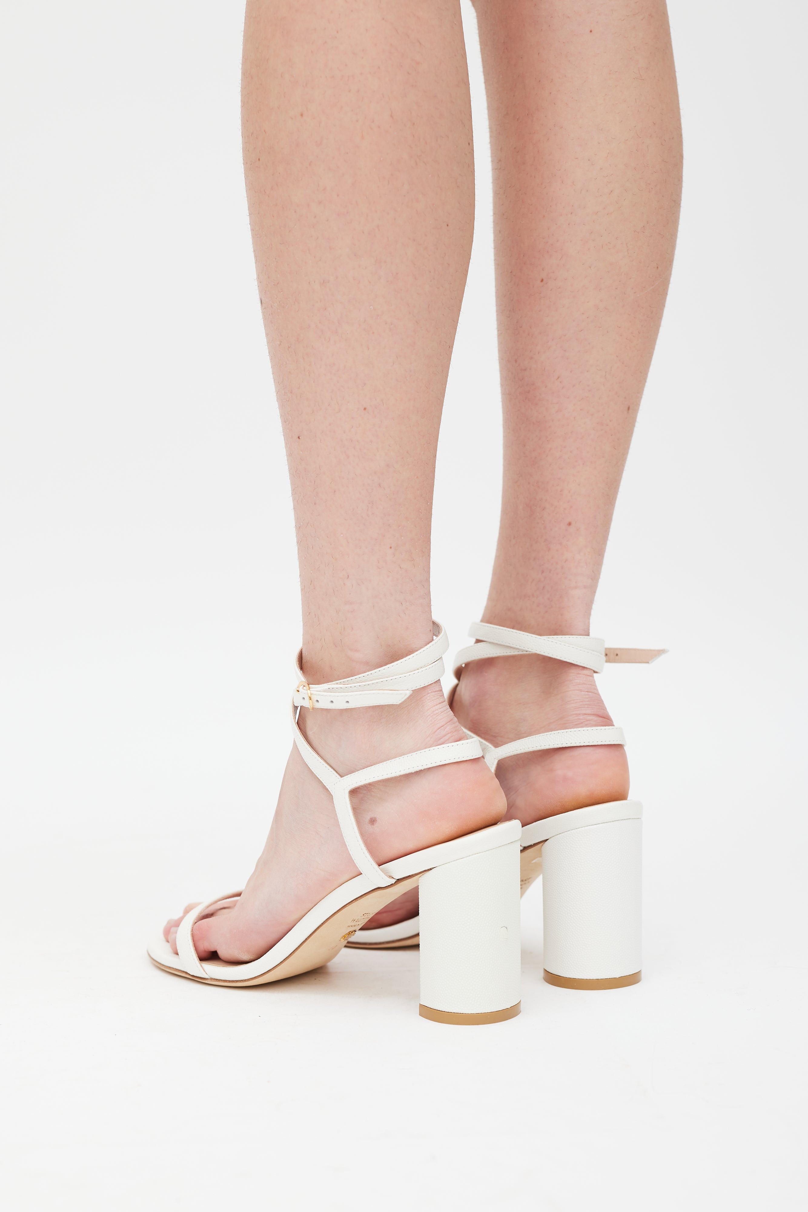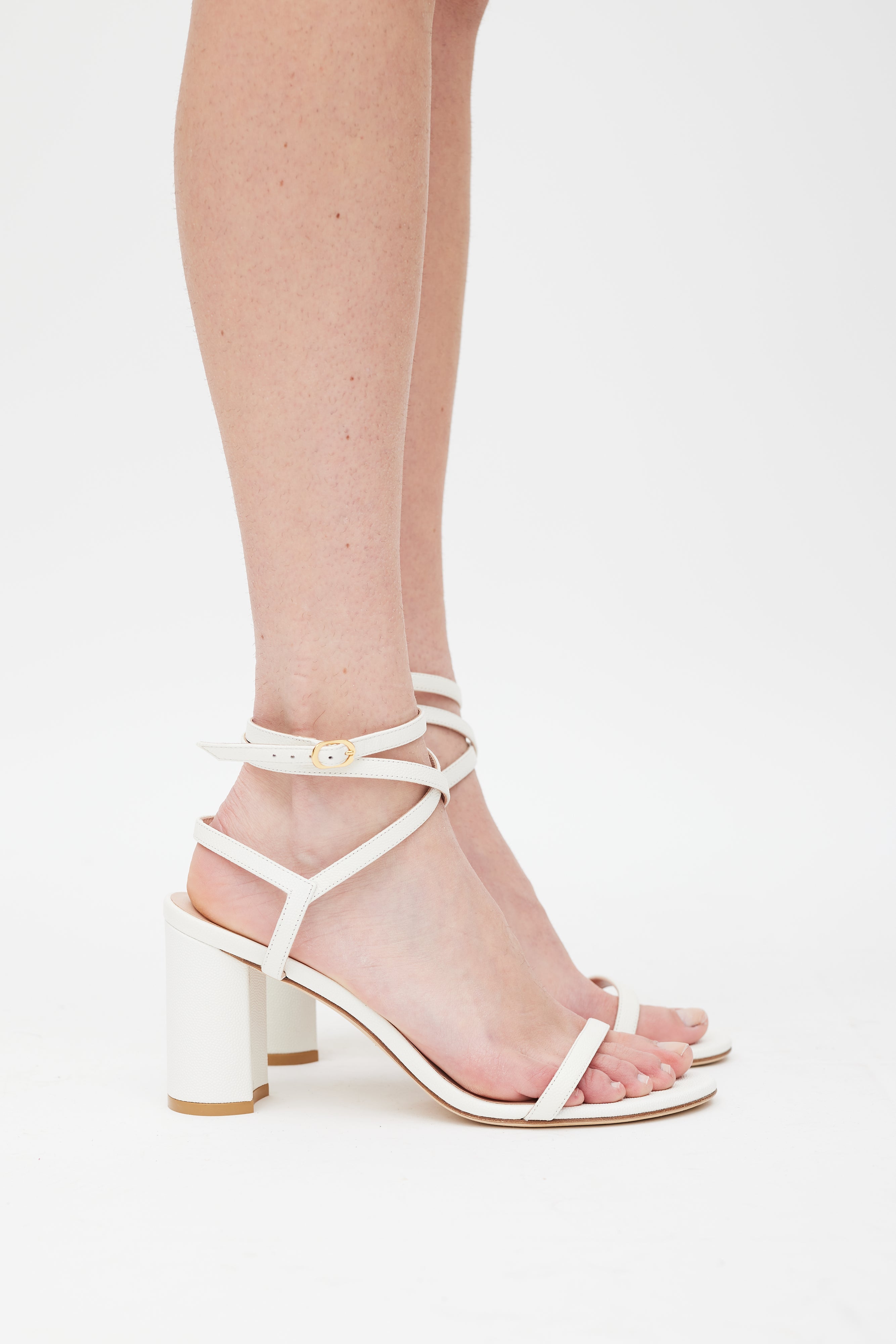 Pre-owned Stuart Weitzman white leather Merinda Block heels featuring an open rounded toe, strap across vamp, wrap around ankle straps with gold tone buckle, and covered block heel. Comes with original dust bag.