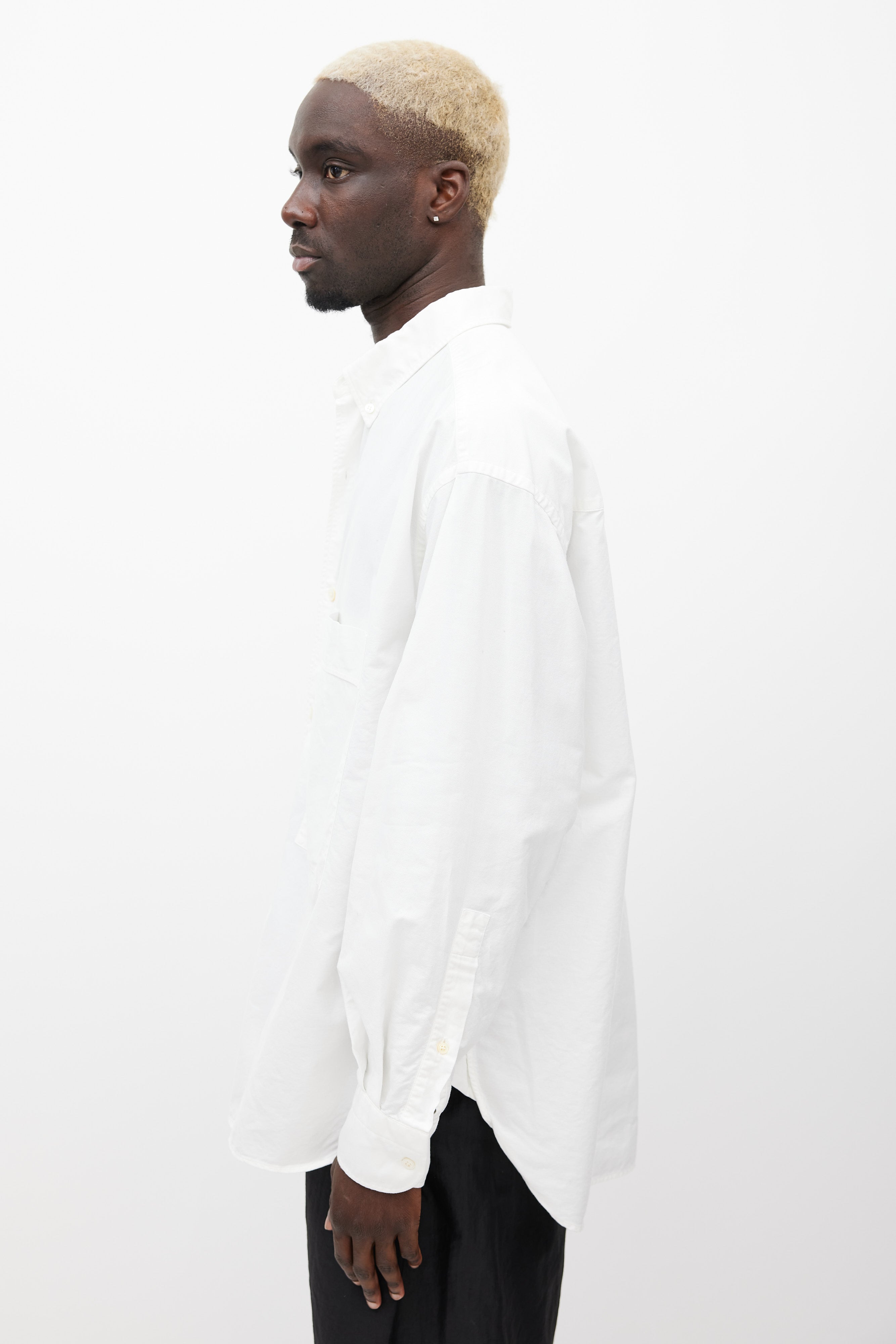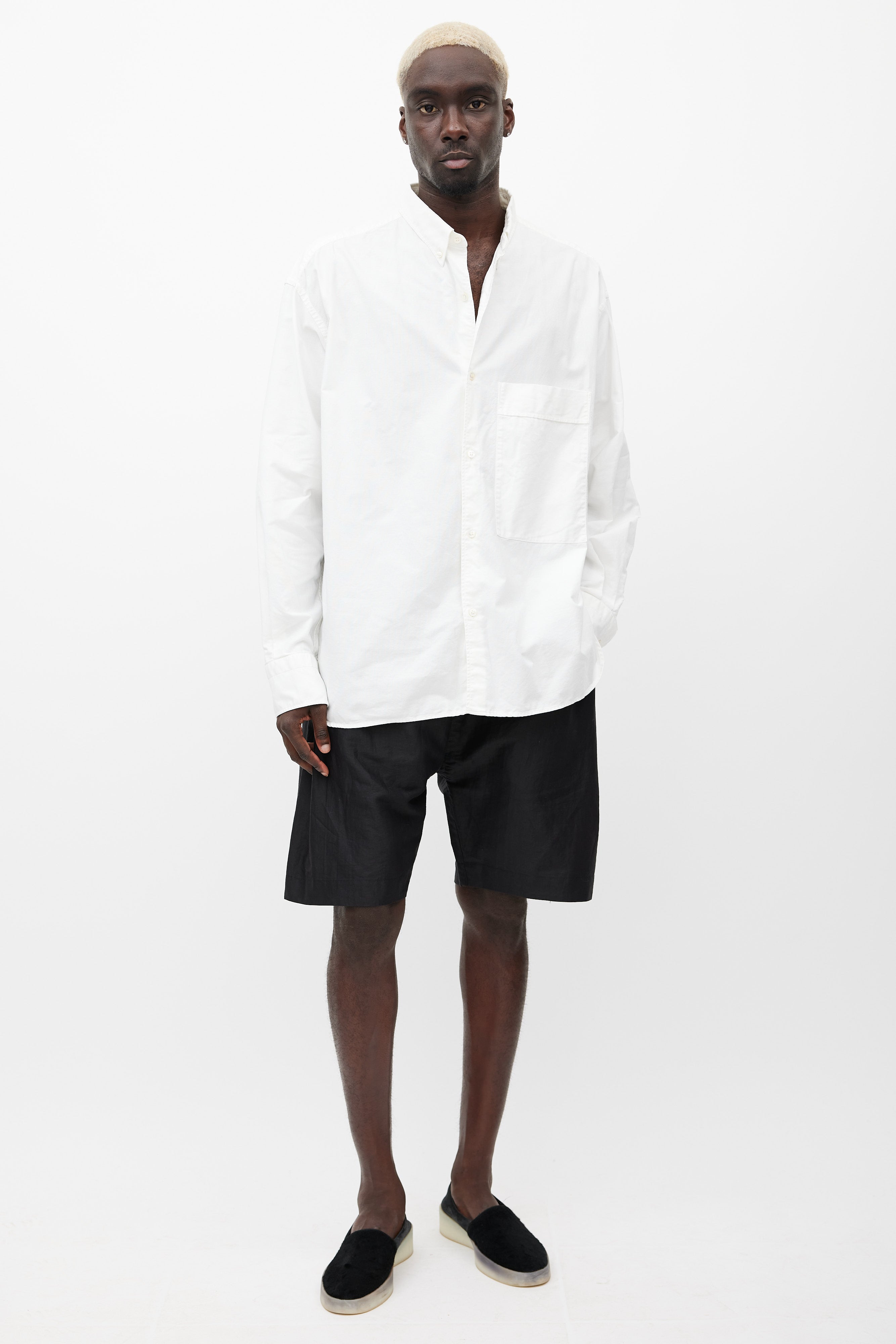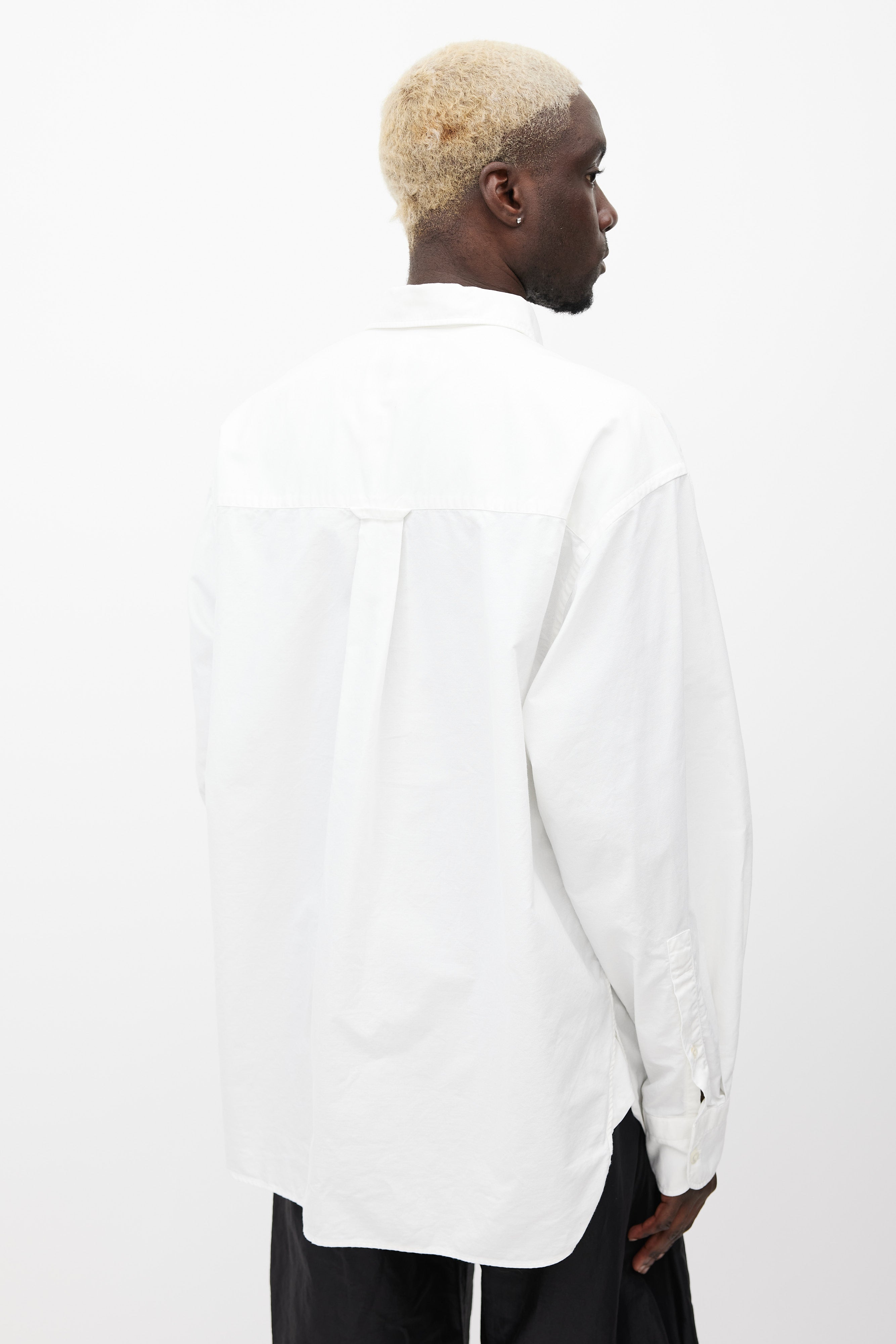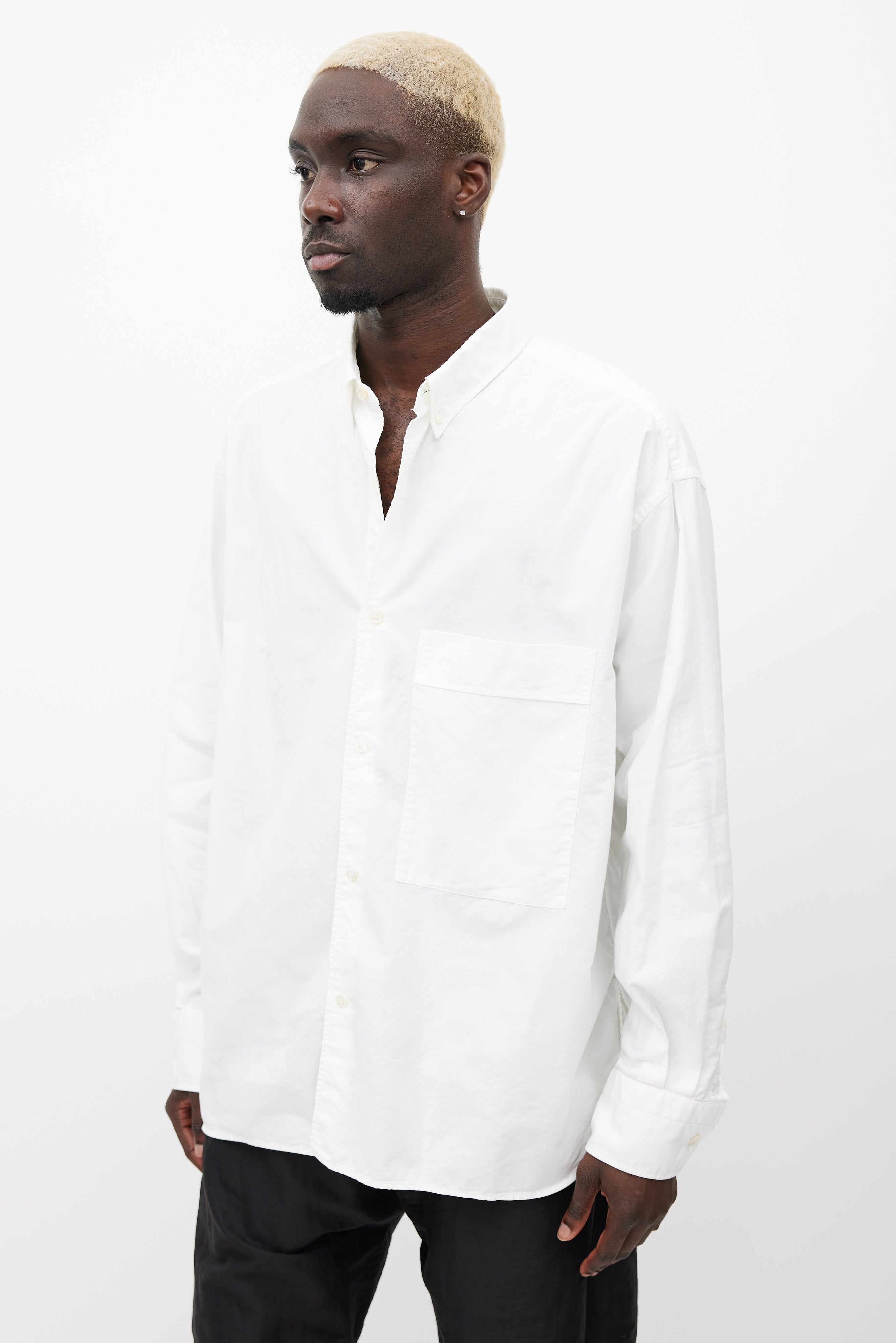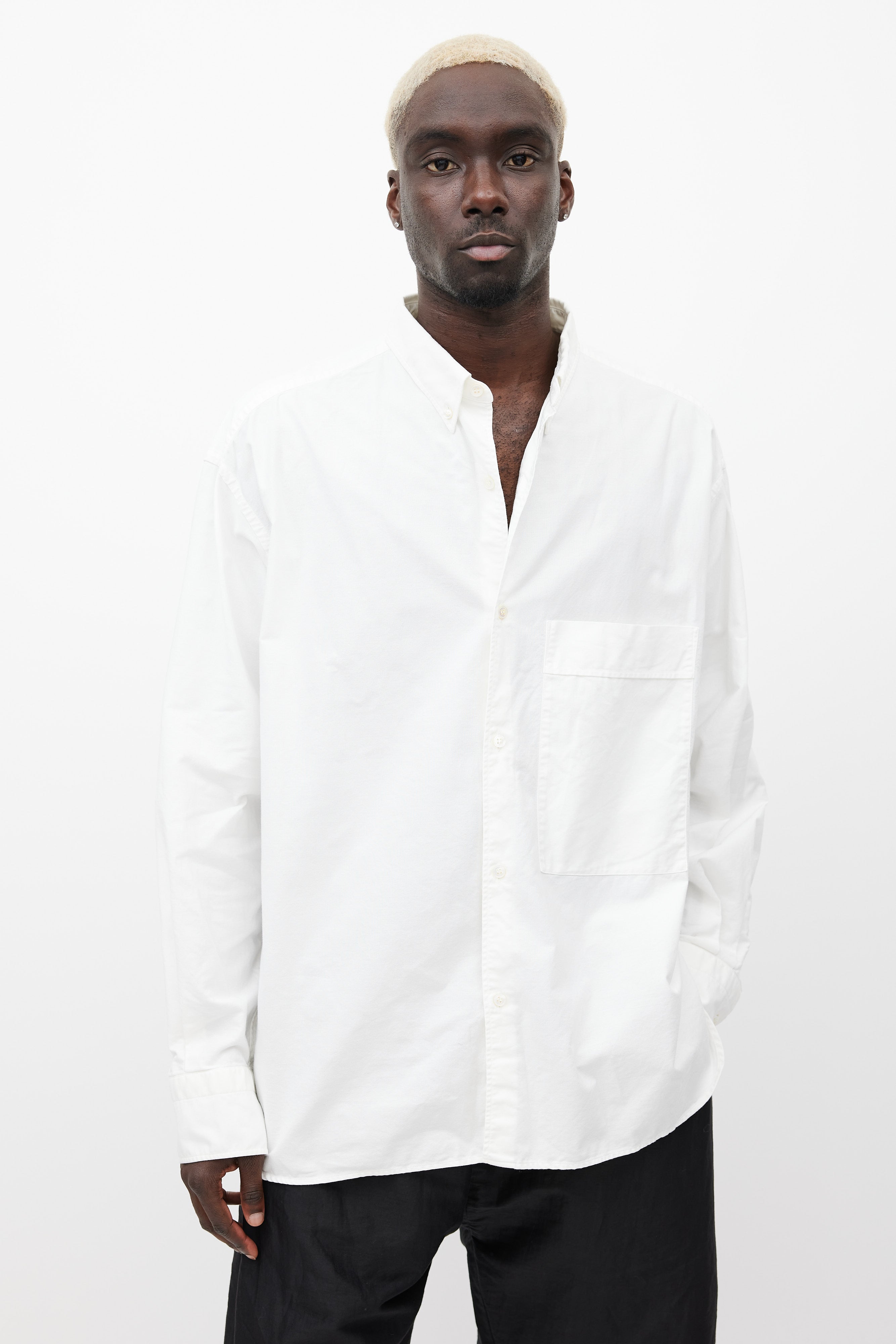 Pre-owned Studio Nicholson white shirt featuring a pointed button down collar, long sleeves, one patch pocket at chest, and button up closure.