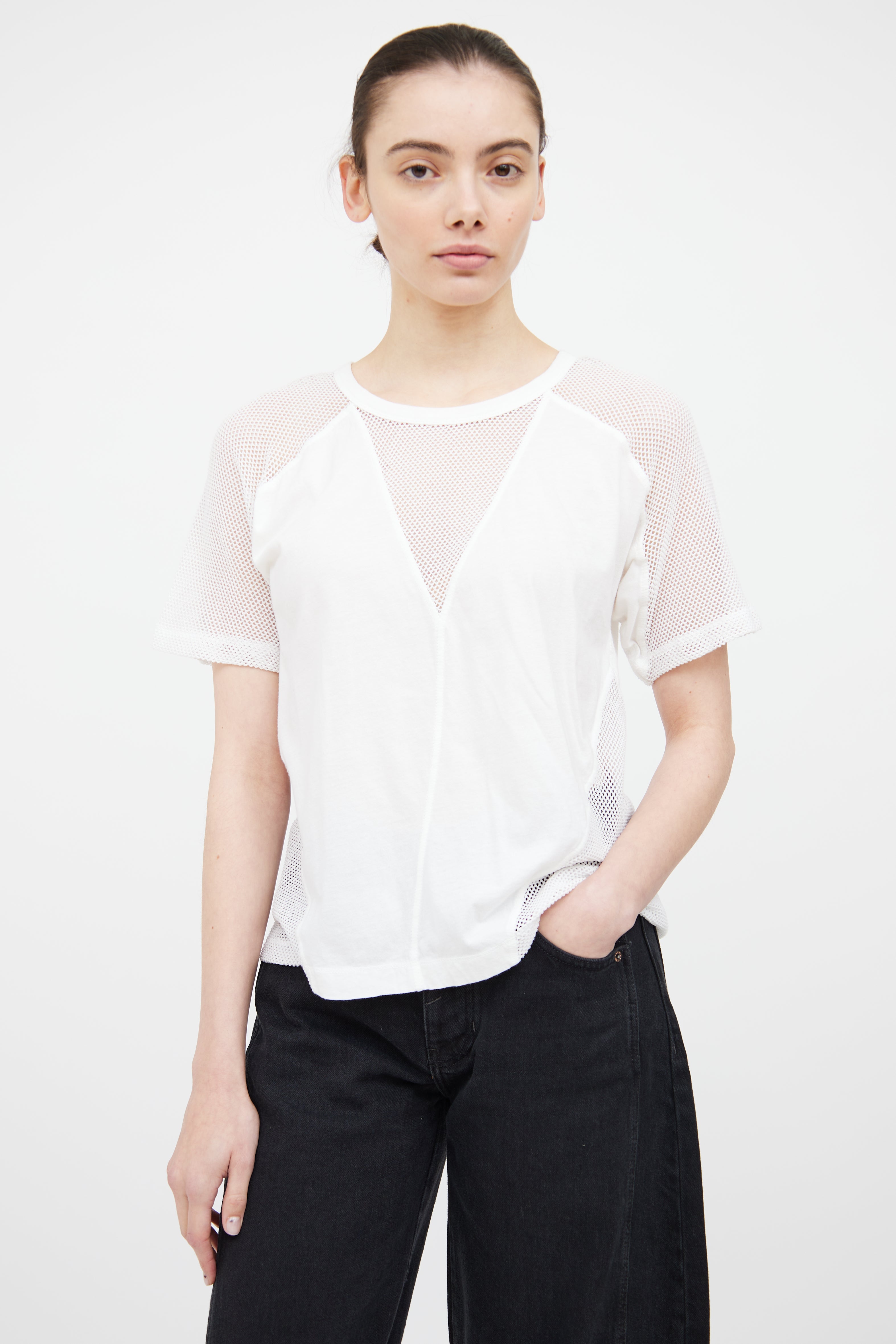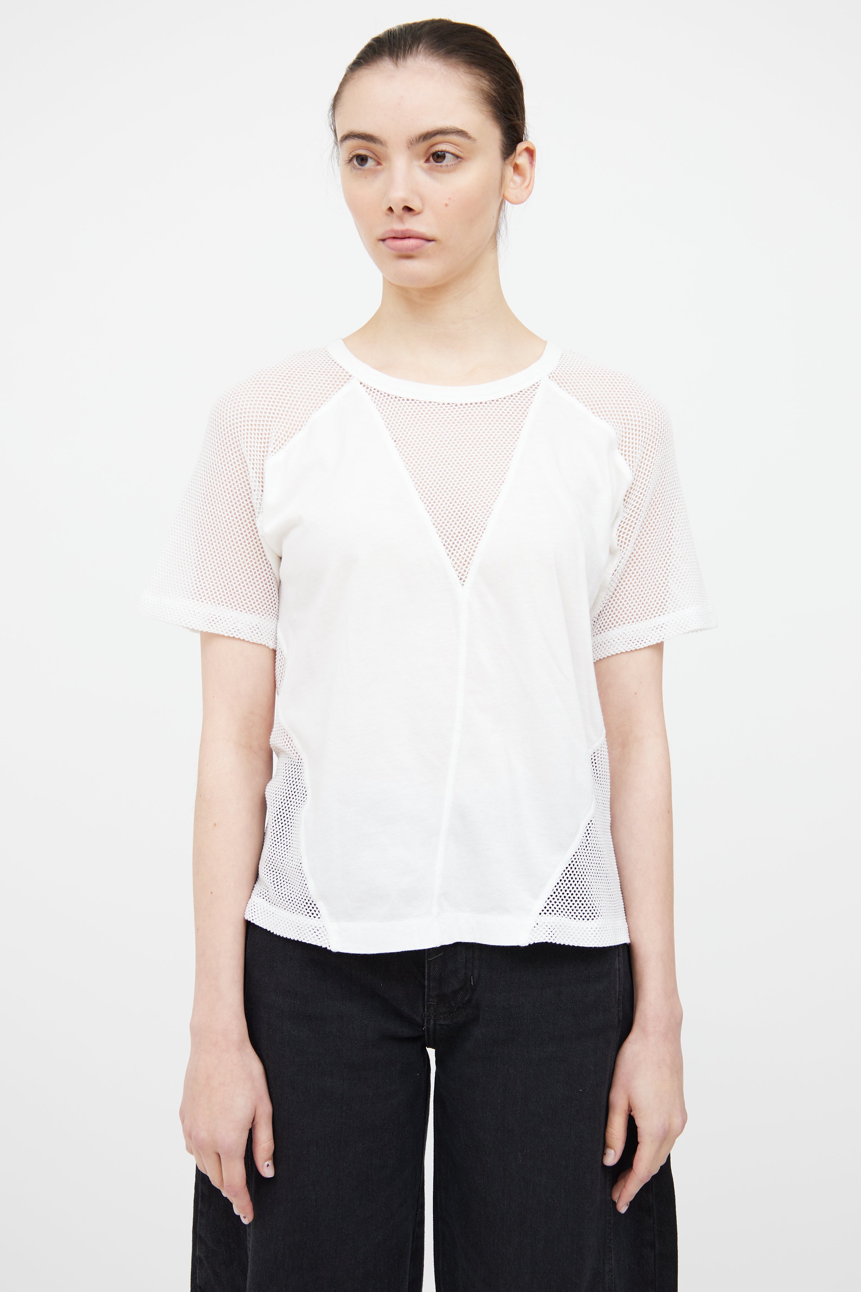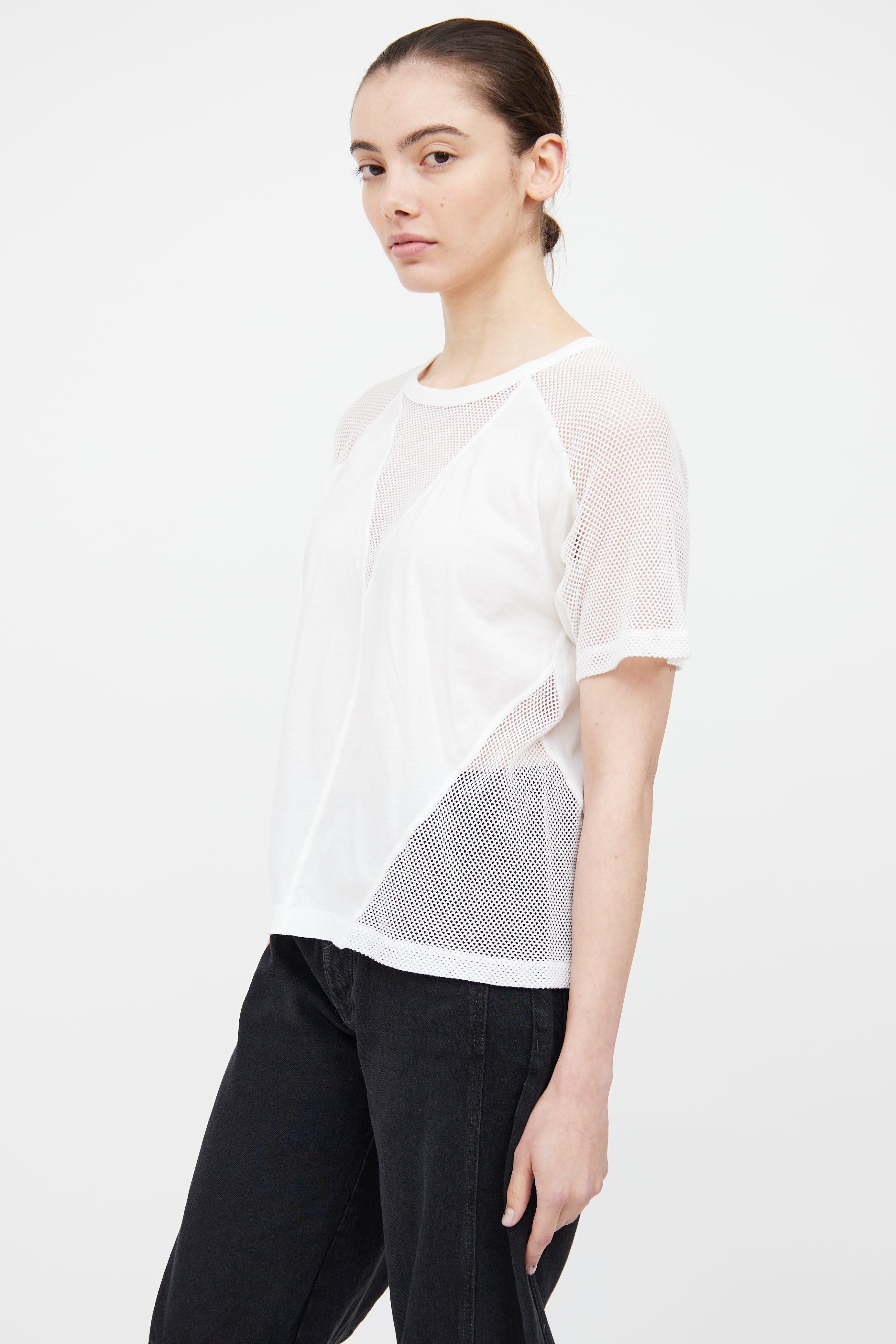 Pre-owned T by Alexander Wang white cotton mesh panel top featuring round neck, short sleeves and white mesh paneling.