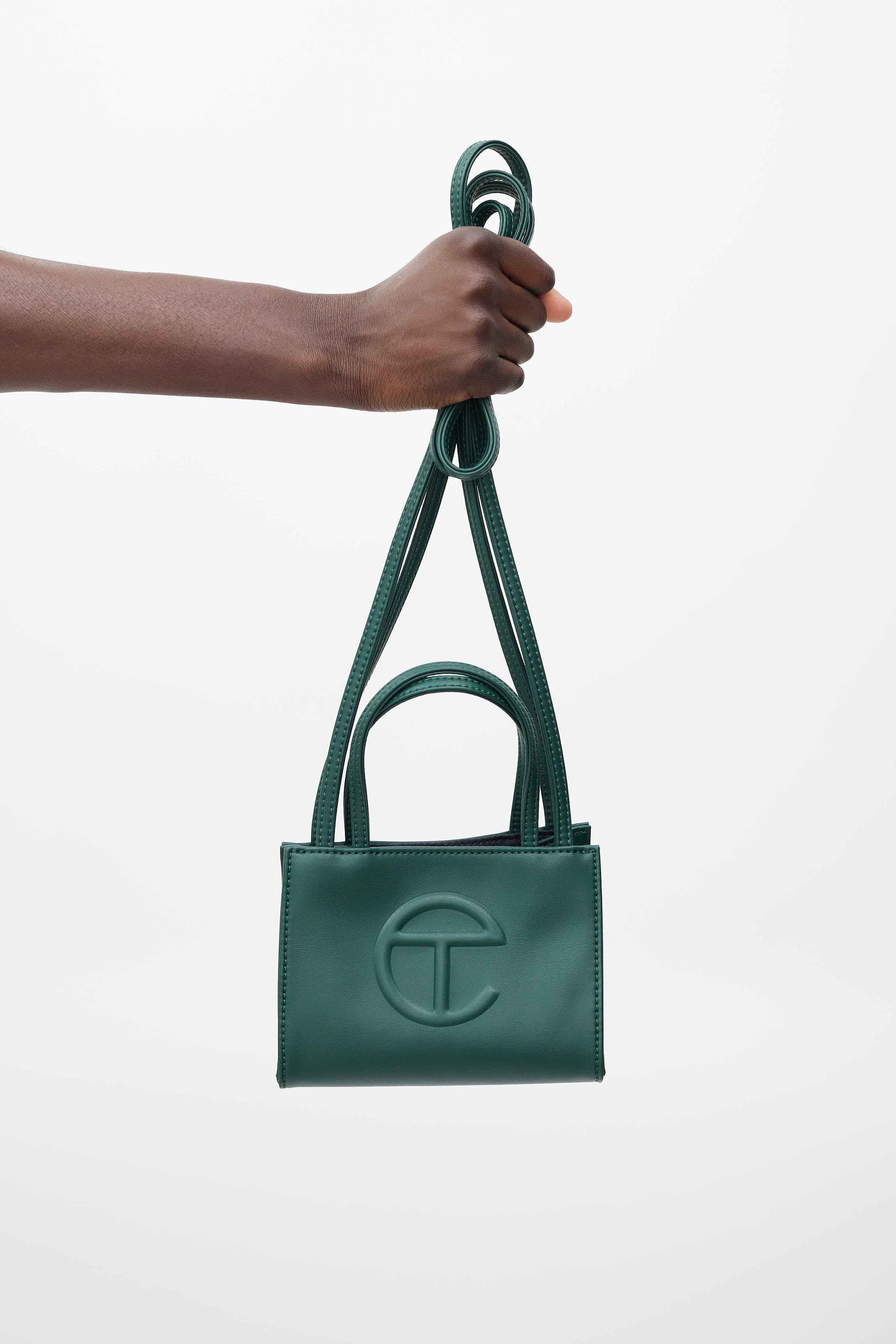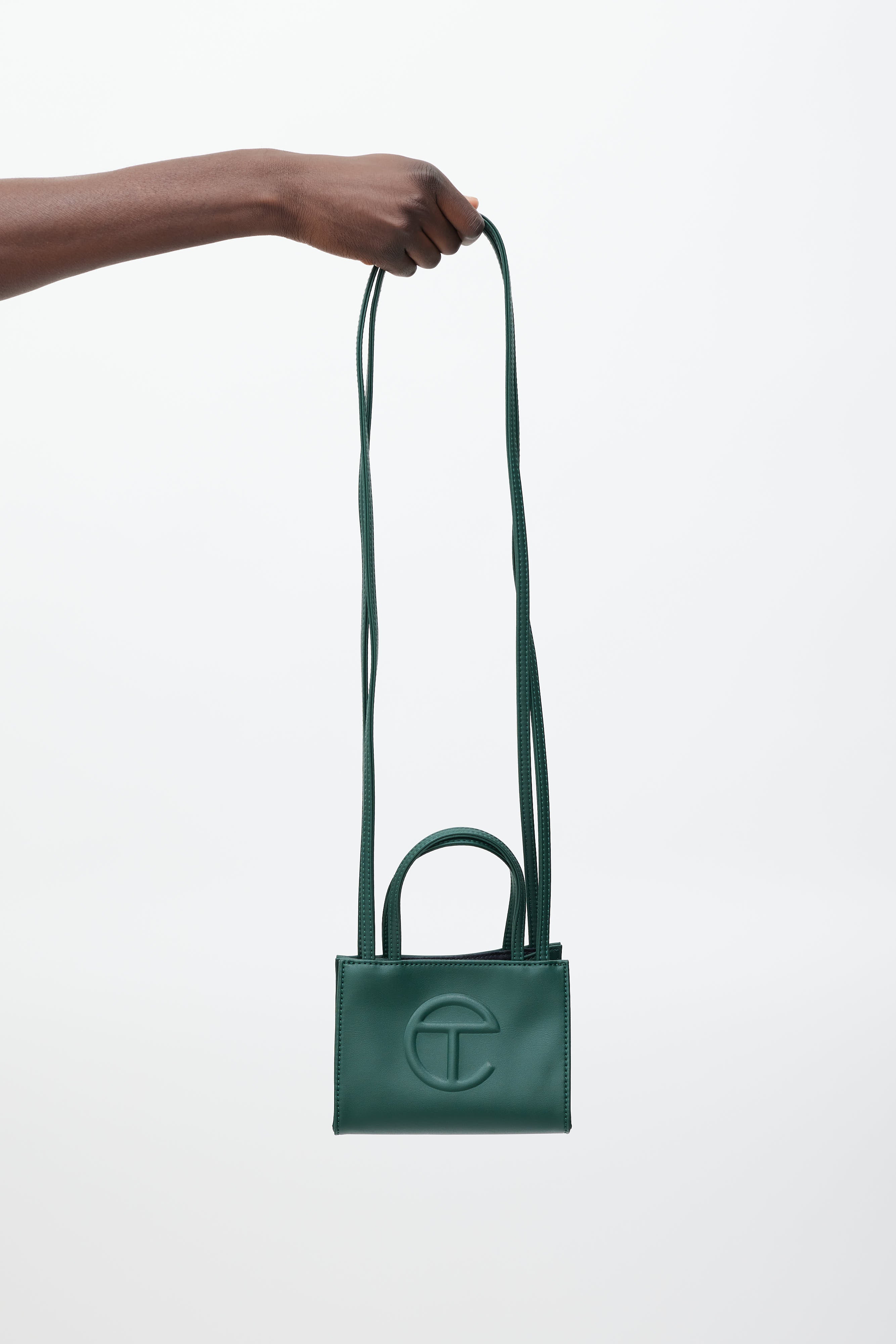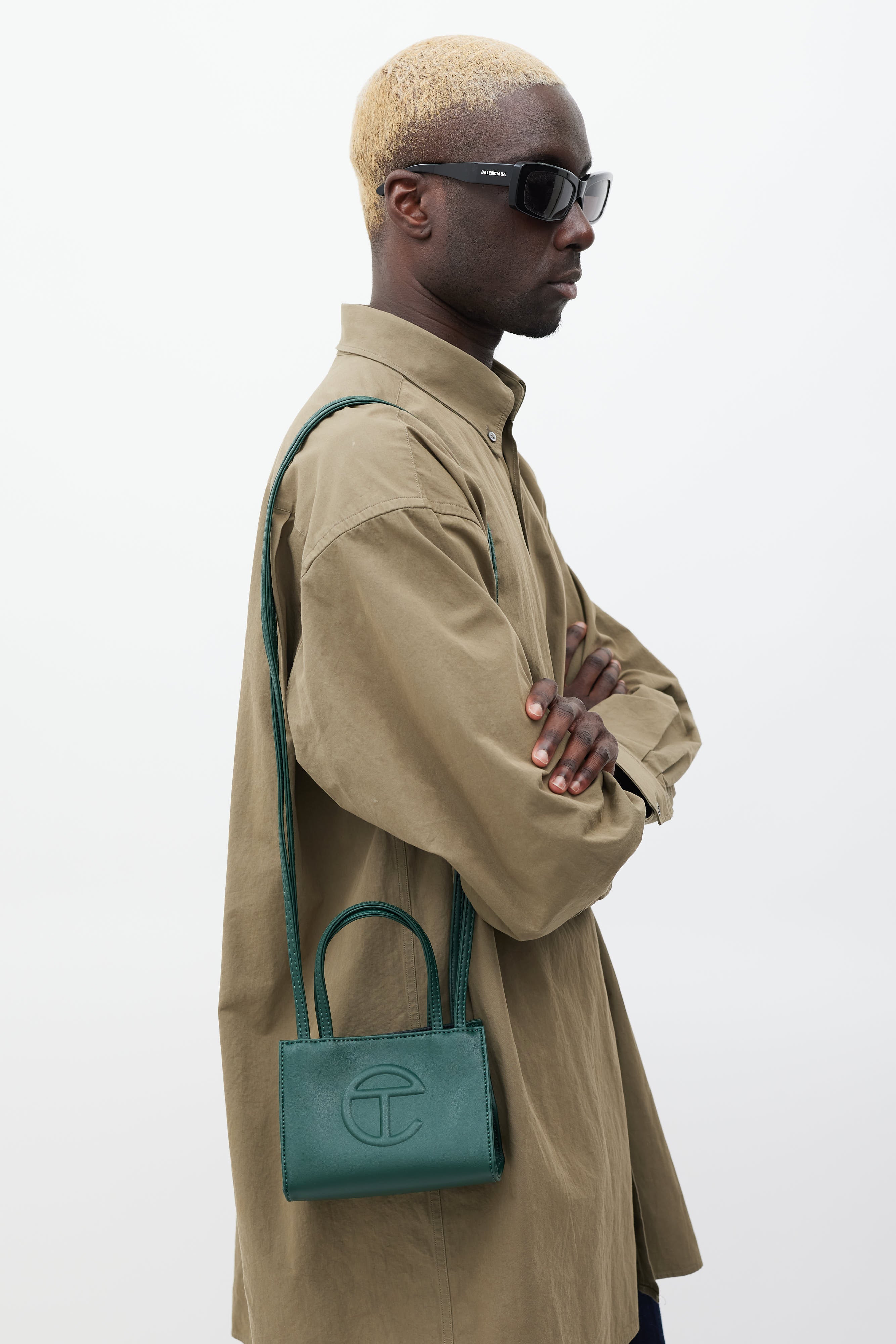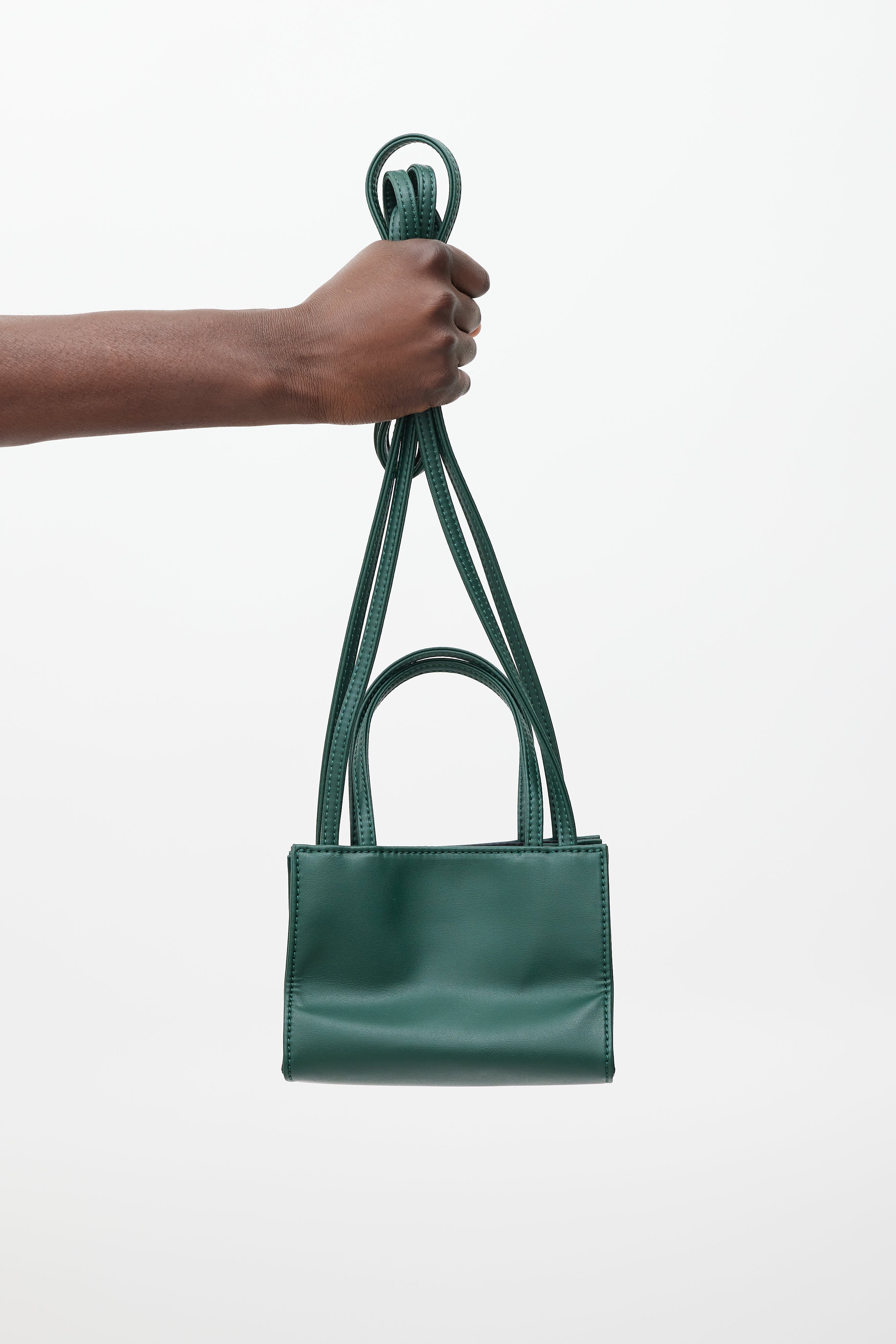 Pre-owned Telfar green Small Shopping Bag featuring two flat top handles, fixed shoulder straps, embossed logo at front, magnetic snap closure, and single lined compartment.