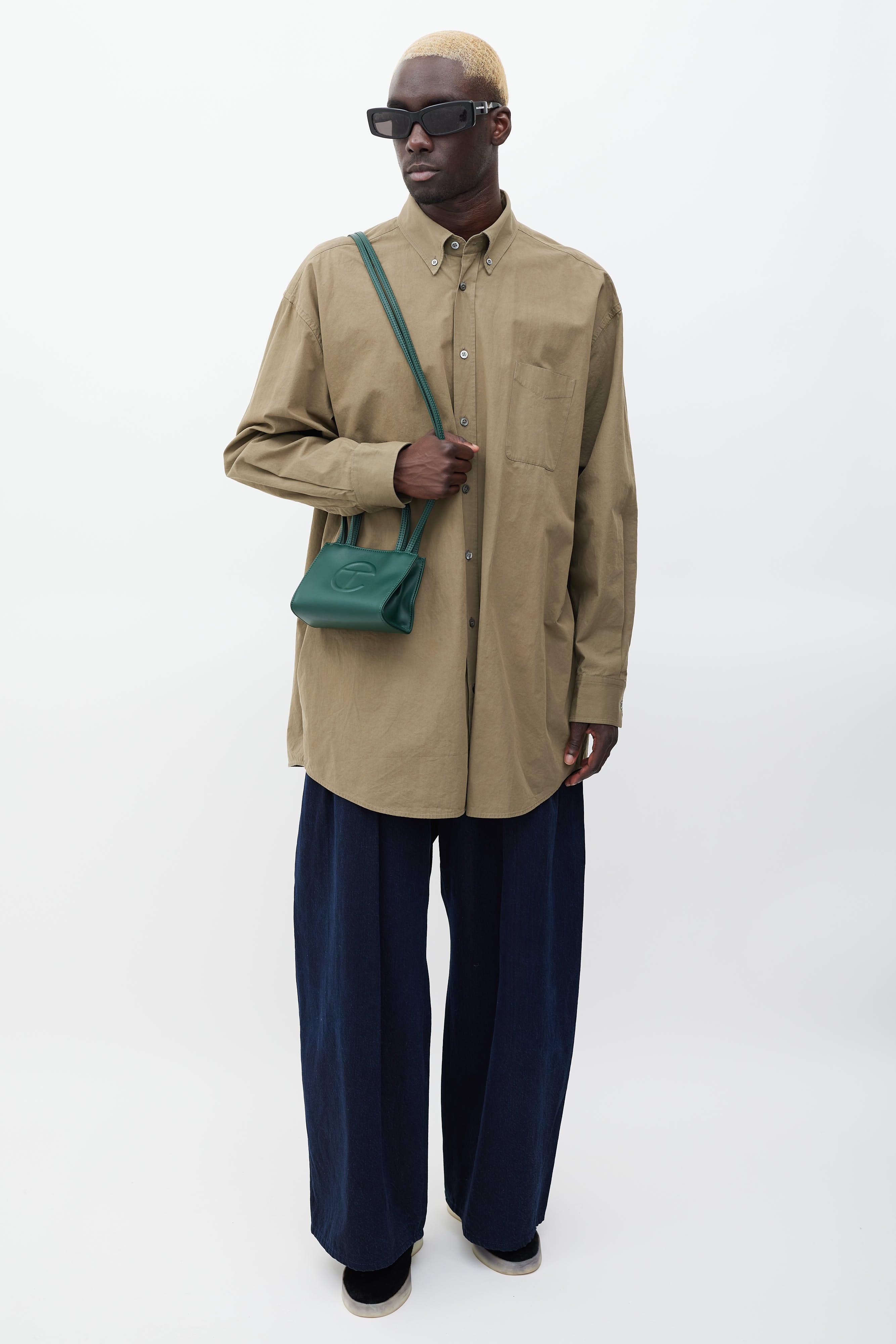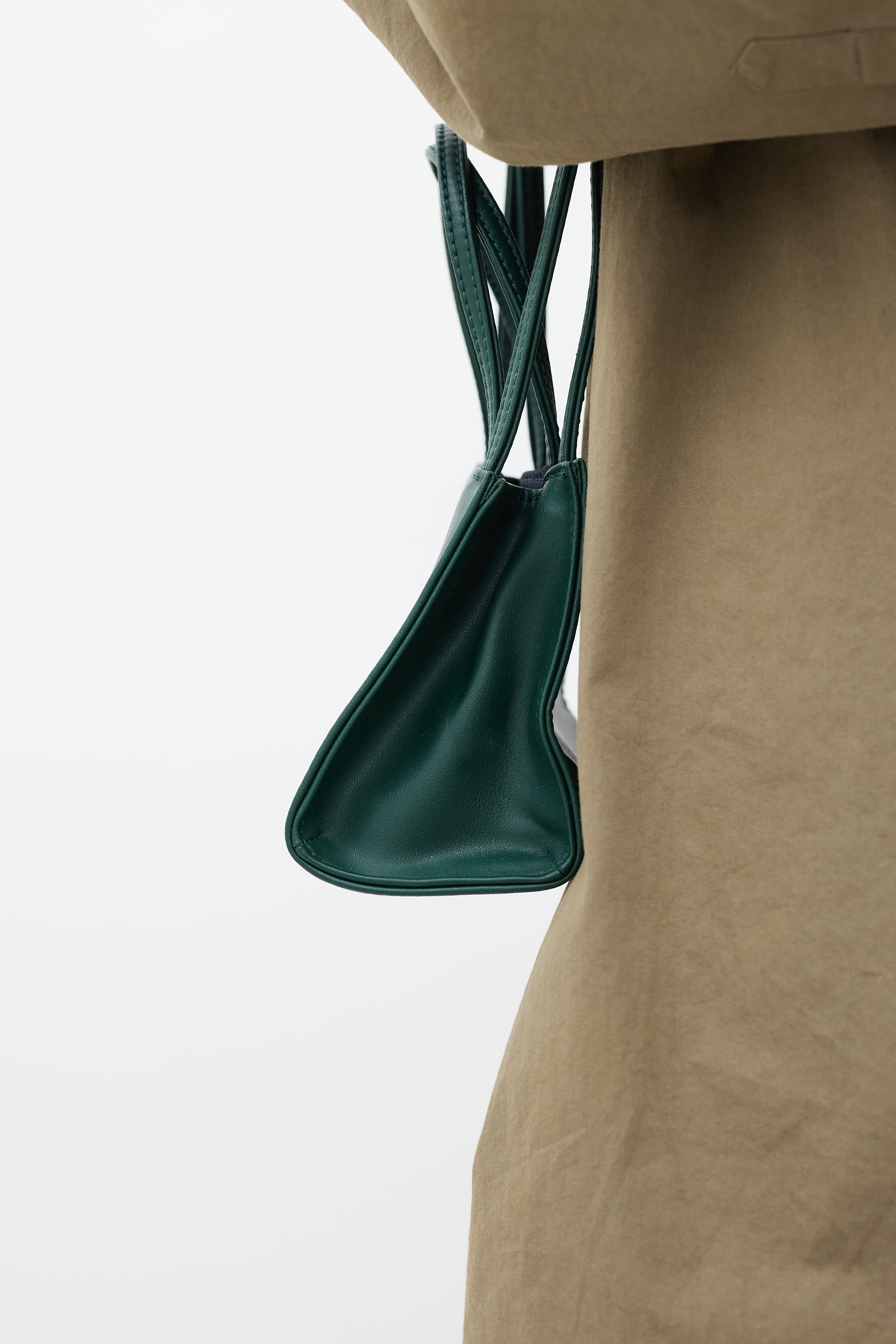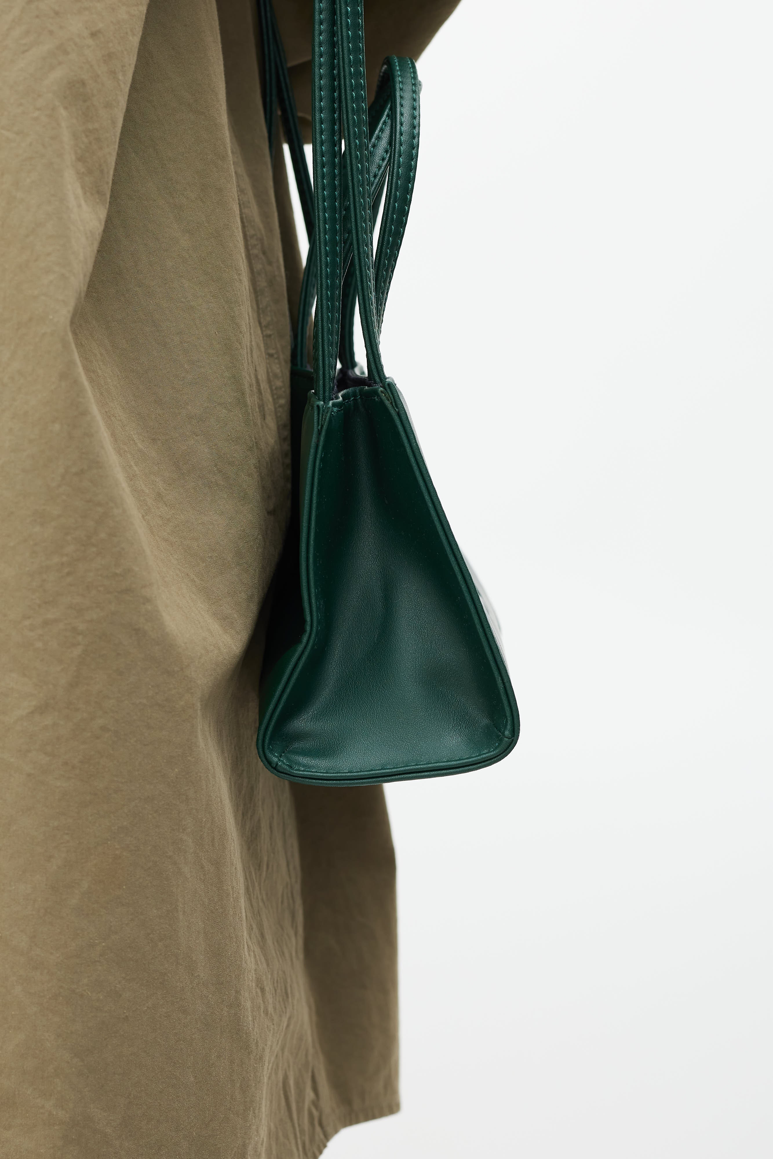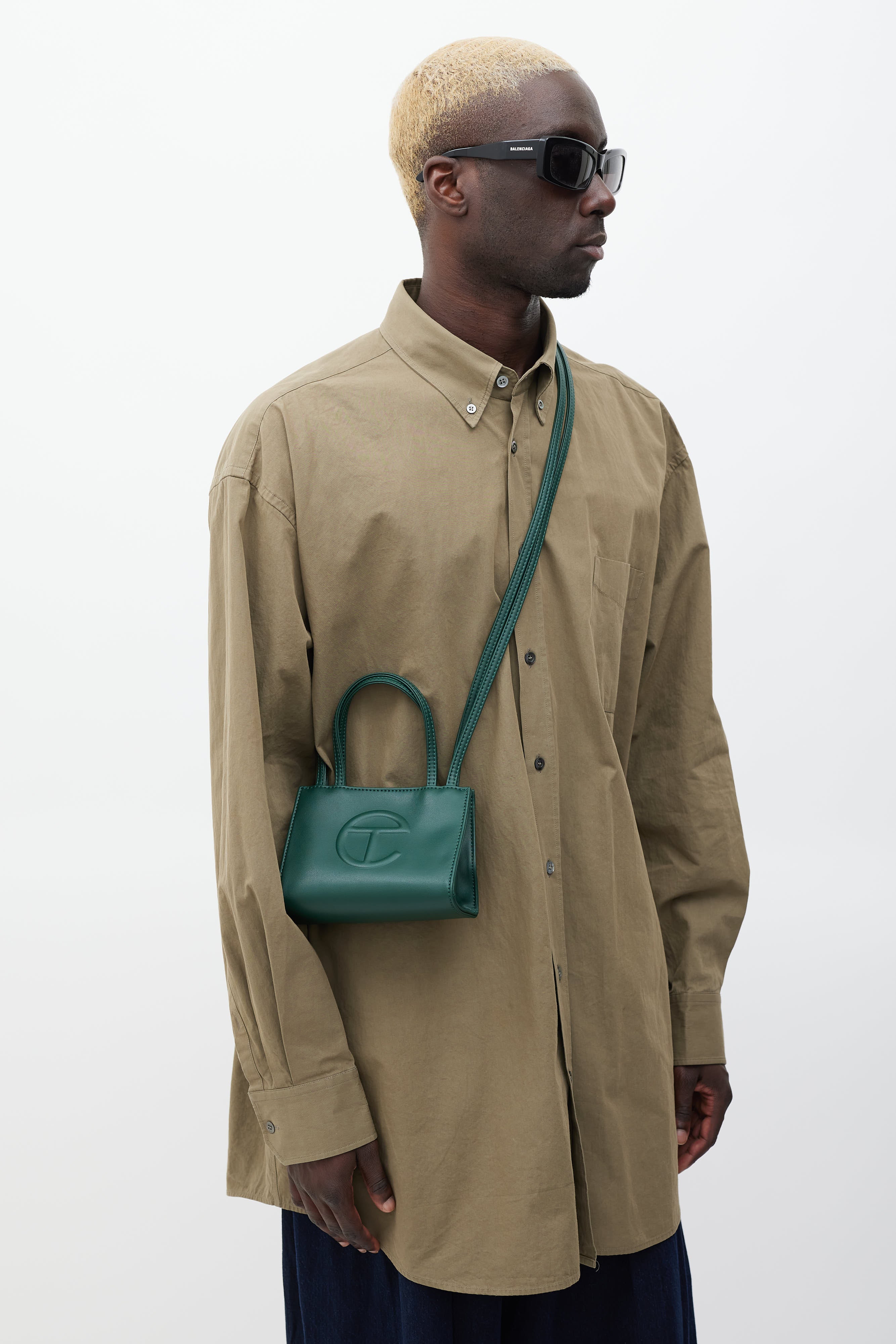 Pre-owned Telfar green Small Shopping Bag featuring two flat top handles, fixed shoulder straps, embossed logo at front, magnetic snap closure, and single lined compartment.