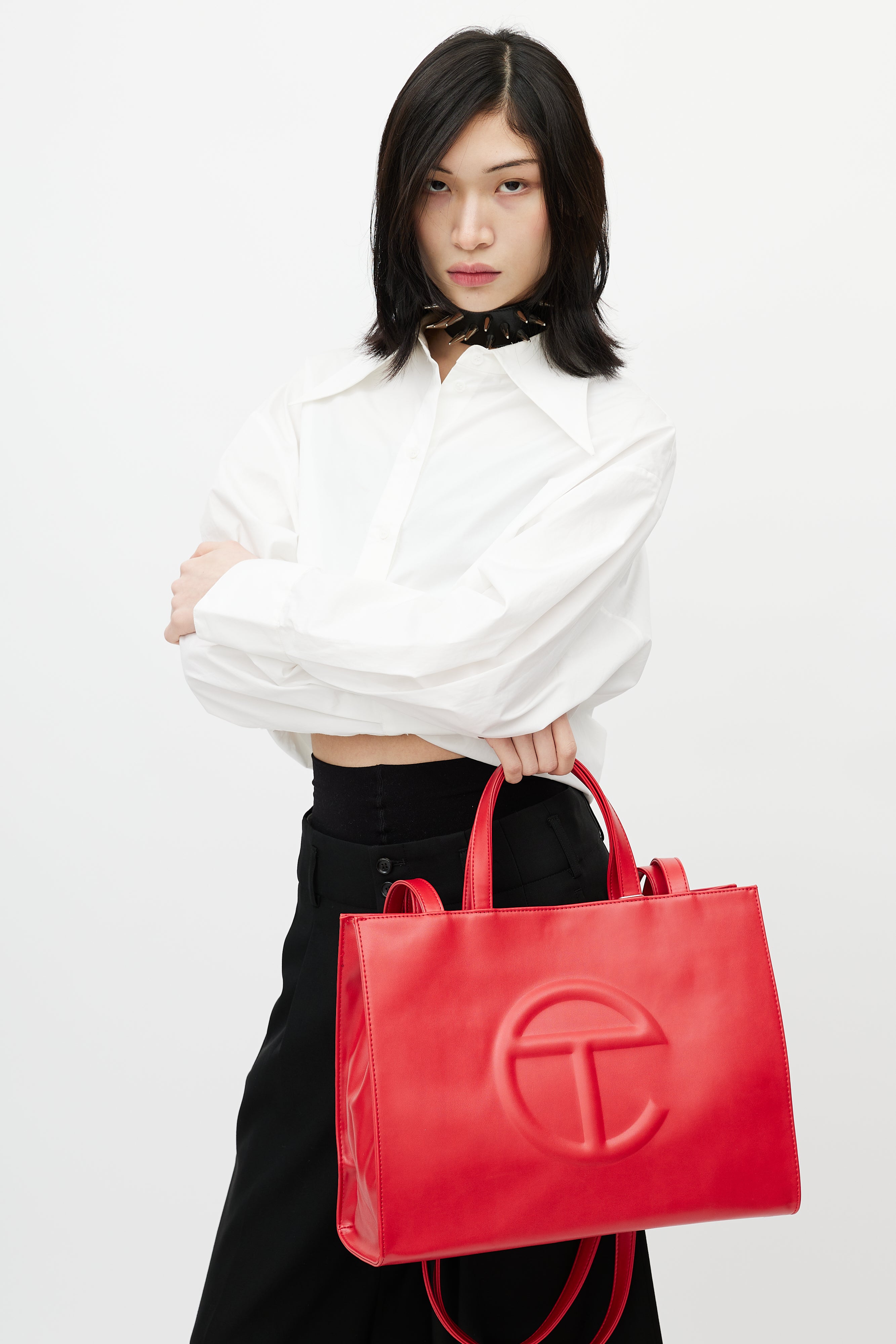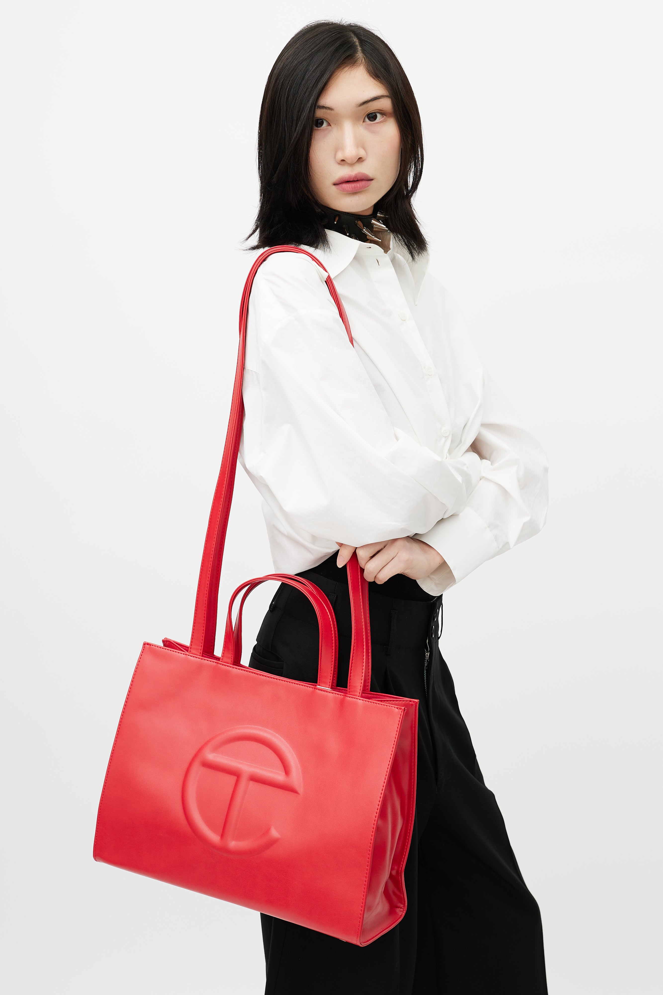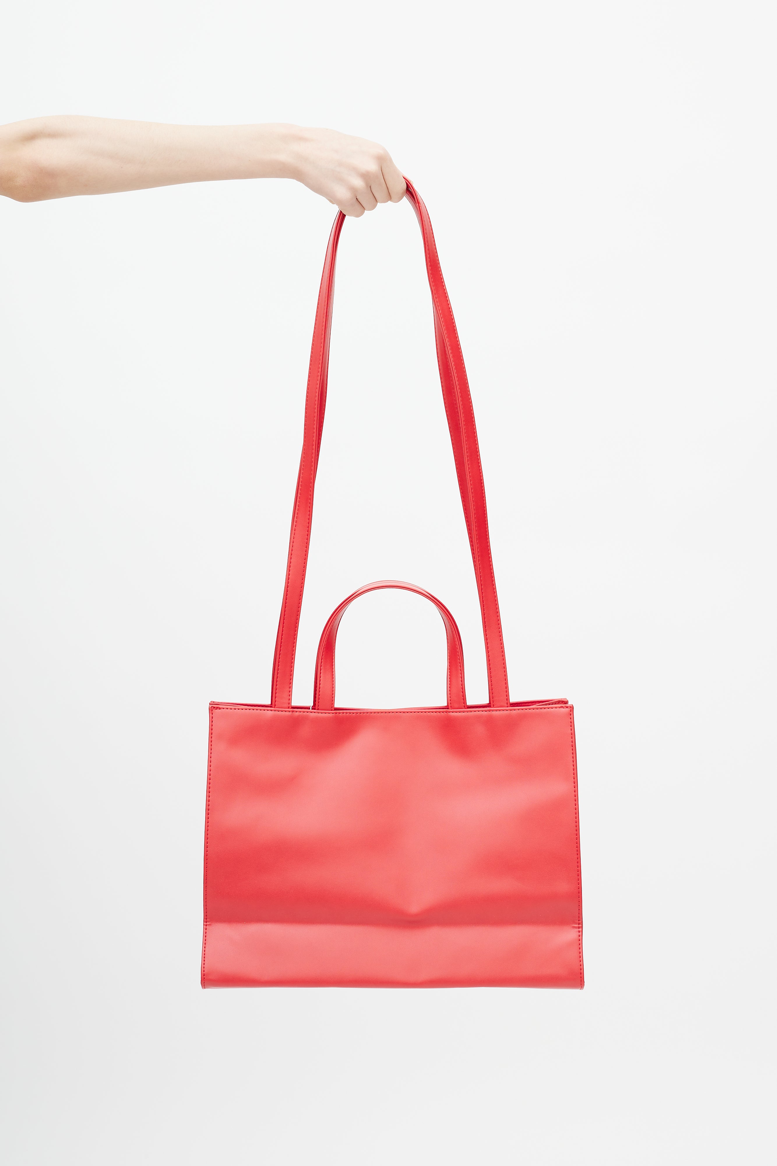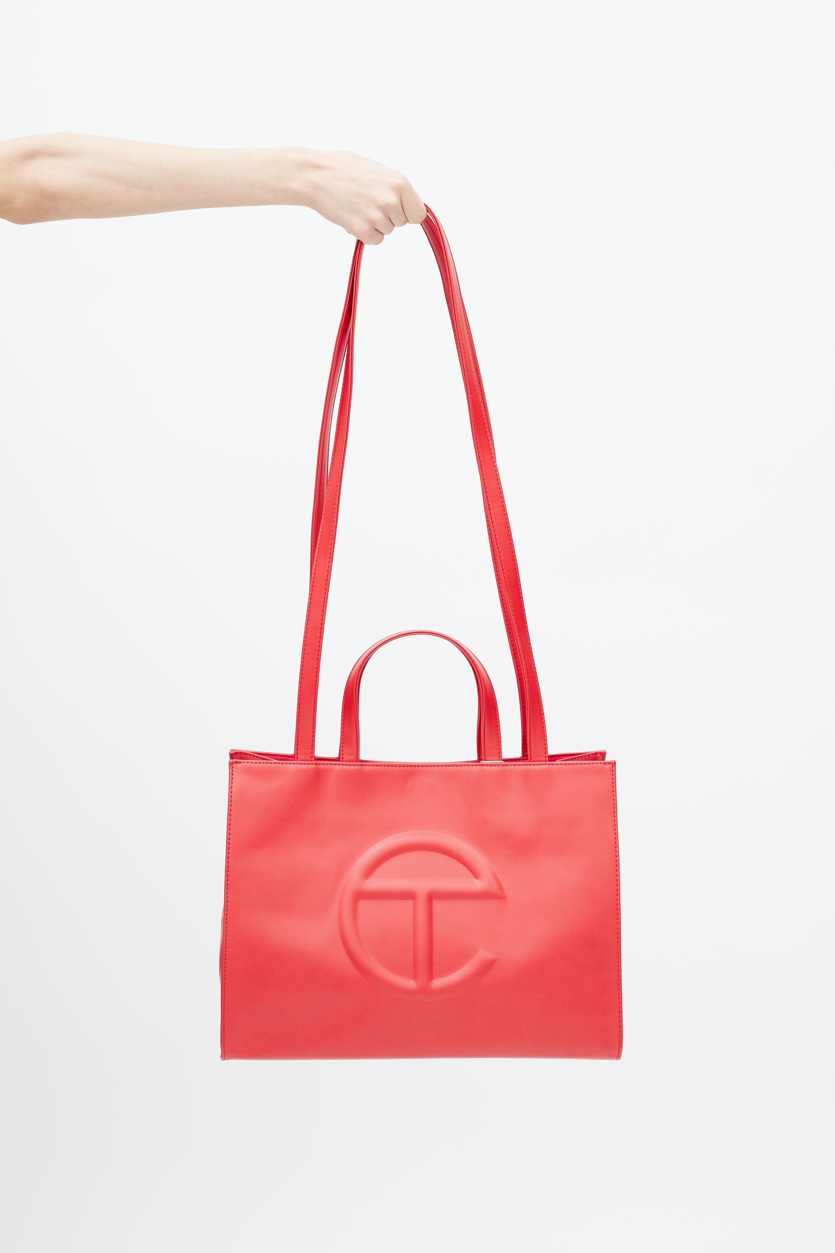 Pre-owned Telfar red medium shopping bag featuring a tonal embossed logo at front, top handles, shoulder strap, one main compartment with one zip pocket, and a magnetic top closure. Comes with original dust bag.