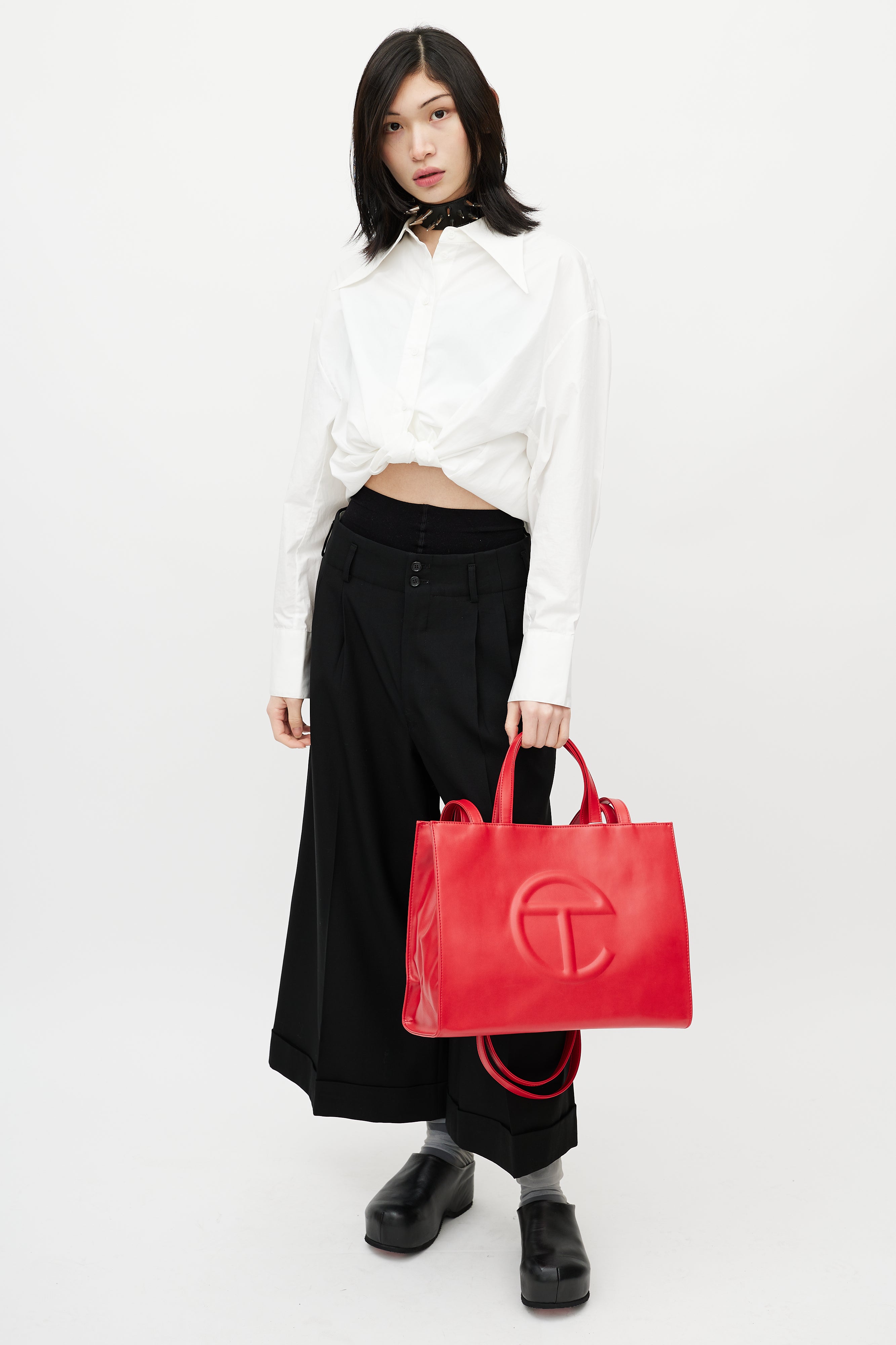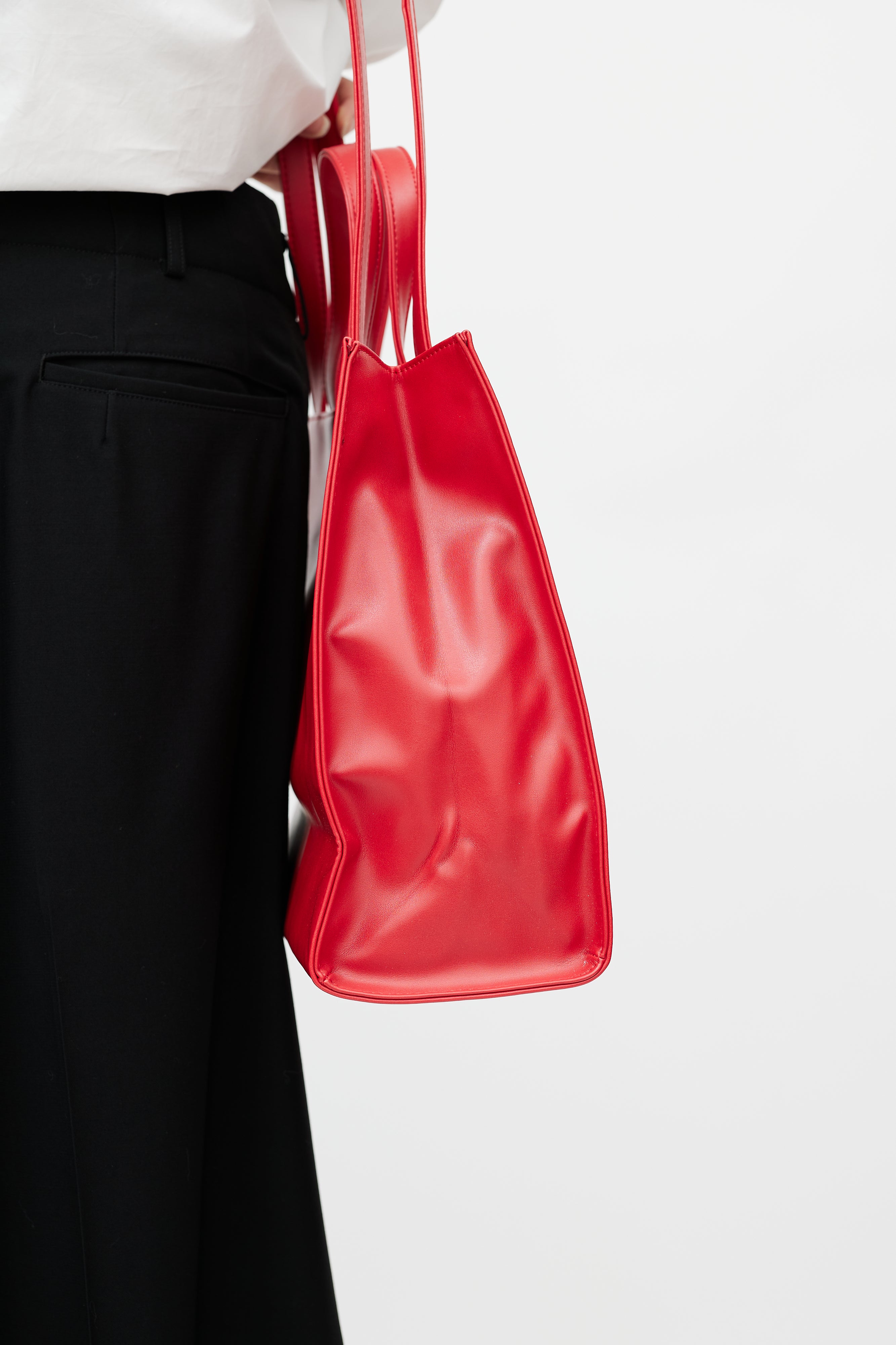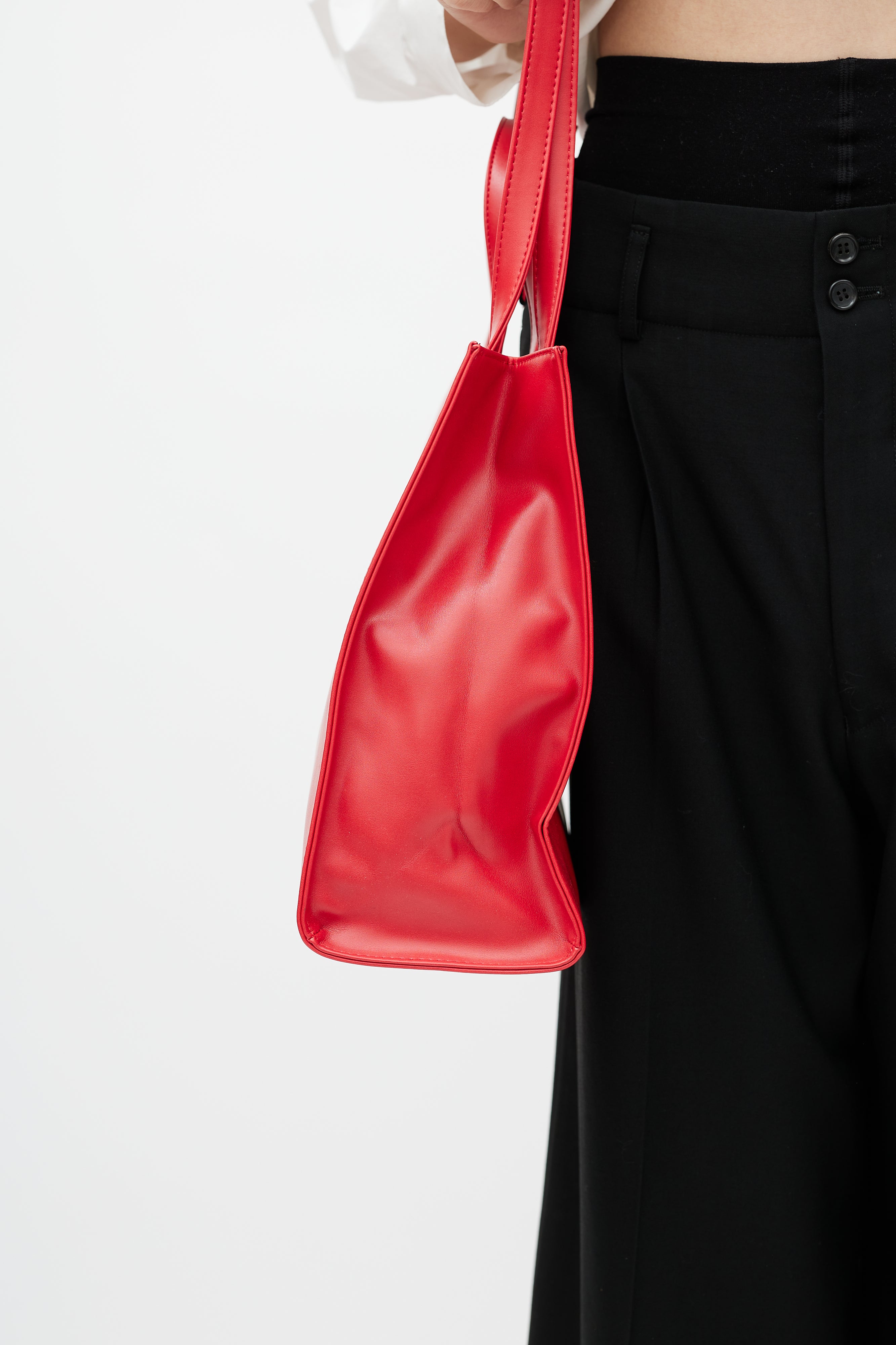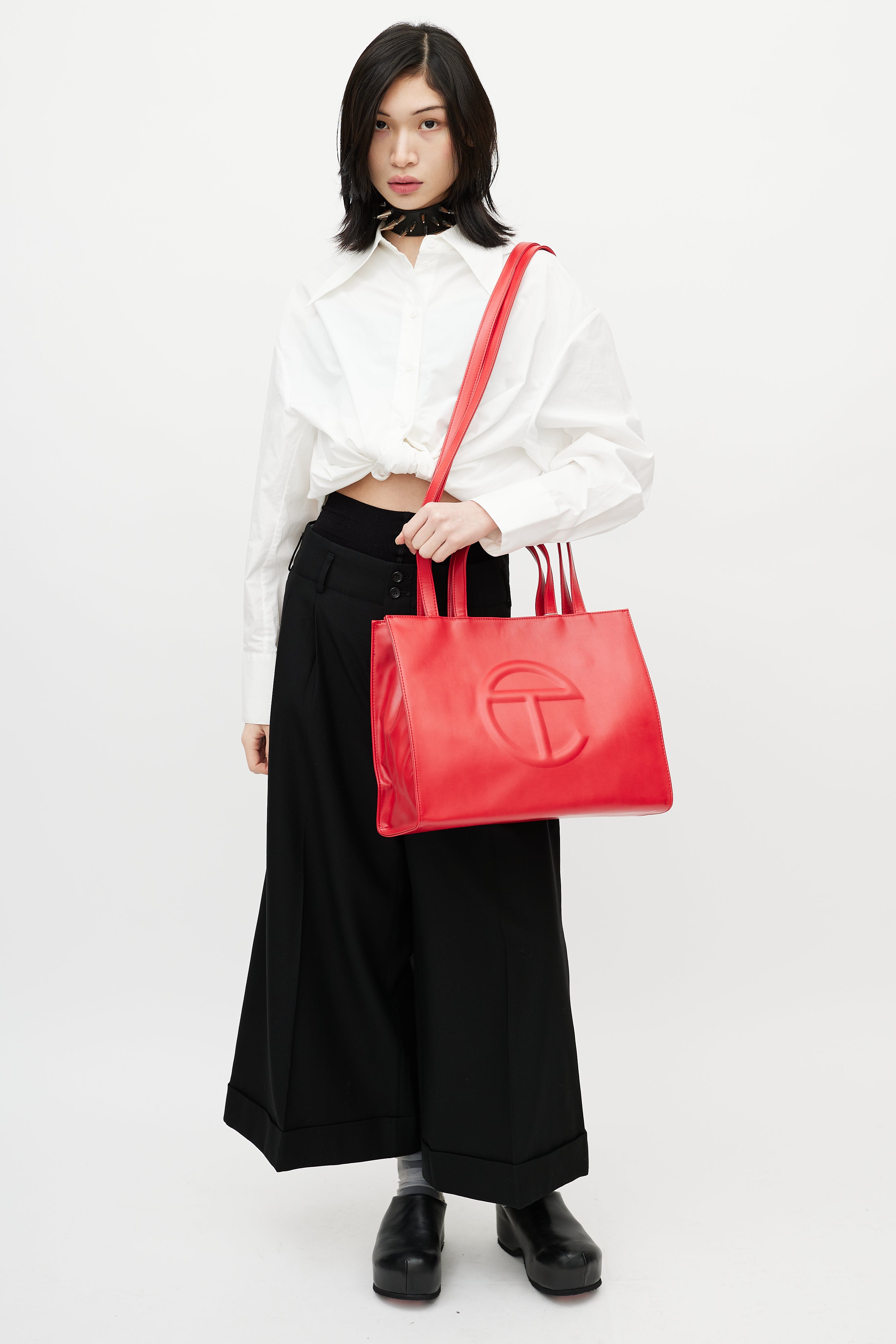 Pre-owned Telfar red medium shopping bag featuring a tonal embossed logo at front, top handles, shoulder strap, one main compartment with one zip pocket, and a magnetic top closure. Comes with original dust bag.