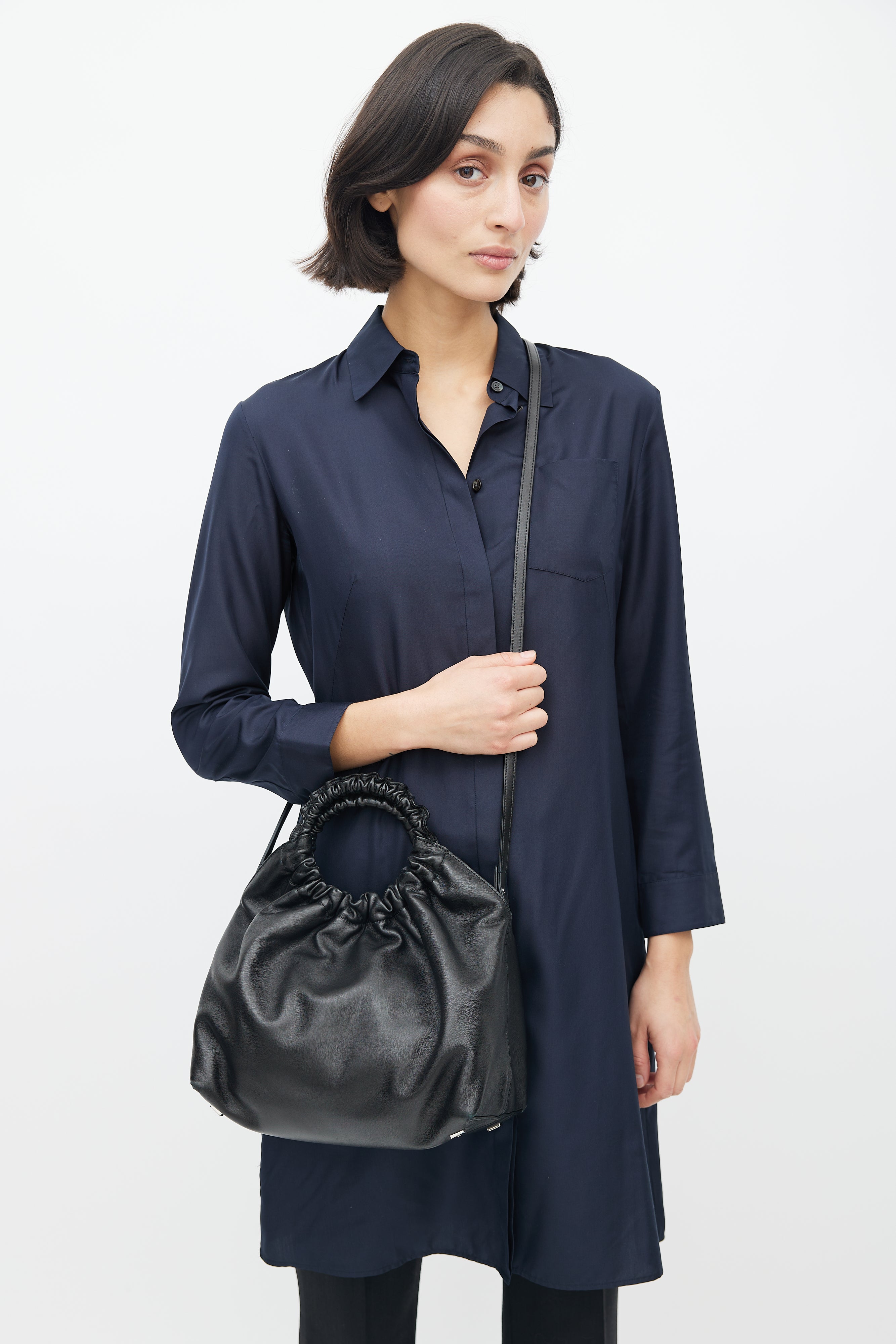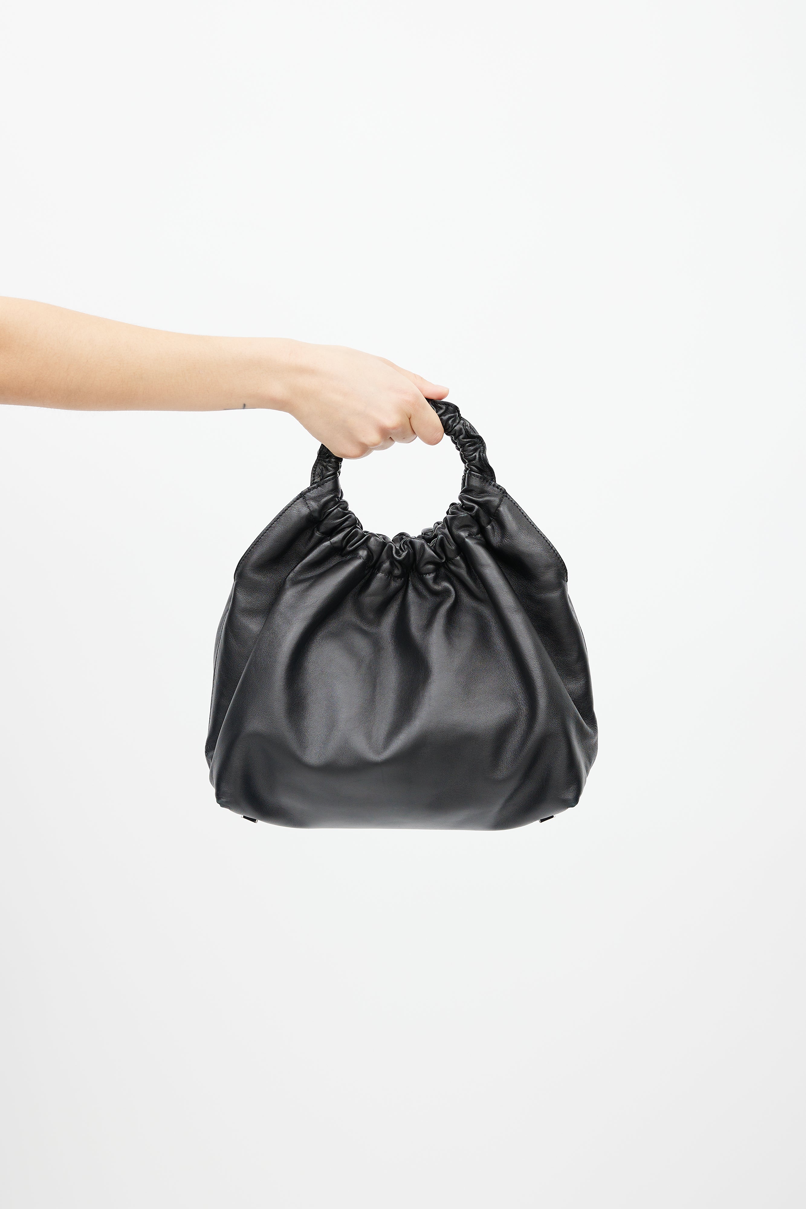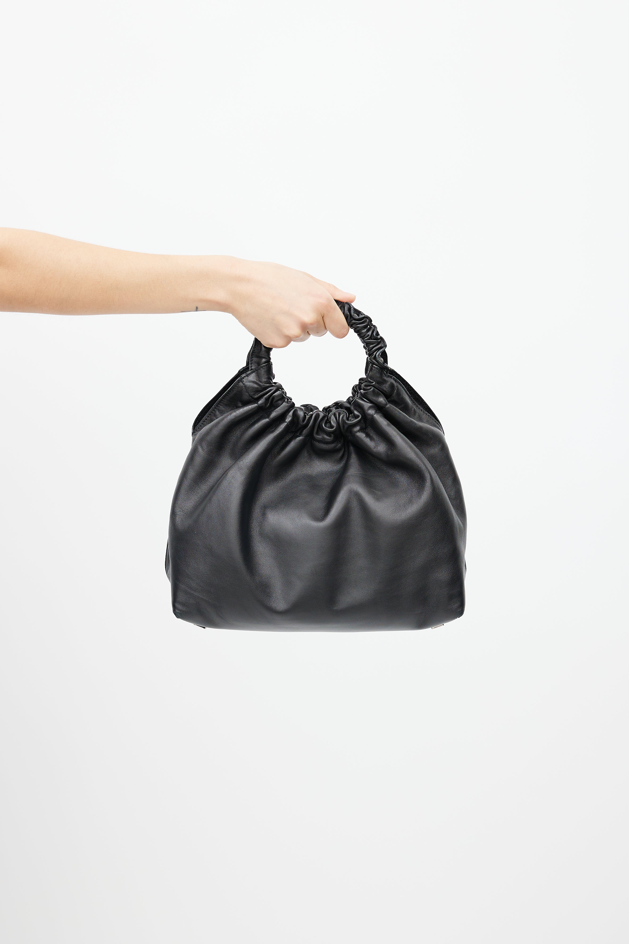 Pre-owned The Row black medium Double Circle bag featuring double ruched top handle, embossed logo at side, metal protective feet, detachable shoulder strap, slight sheen at lining, and zip pocket inside. Comes with original dust bag.