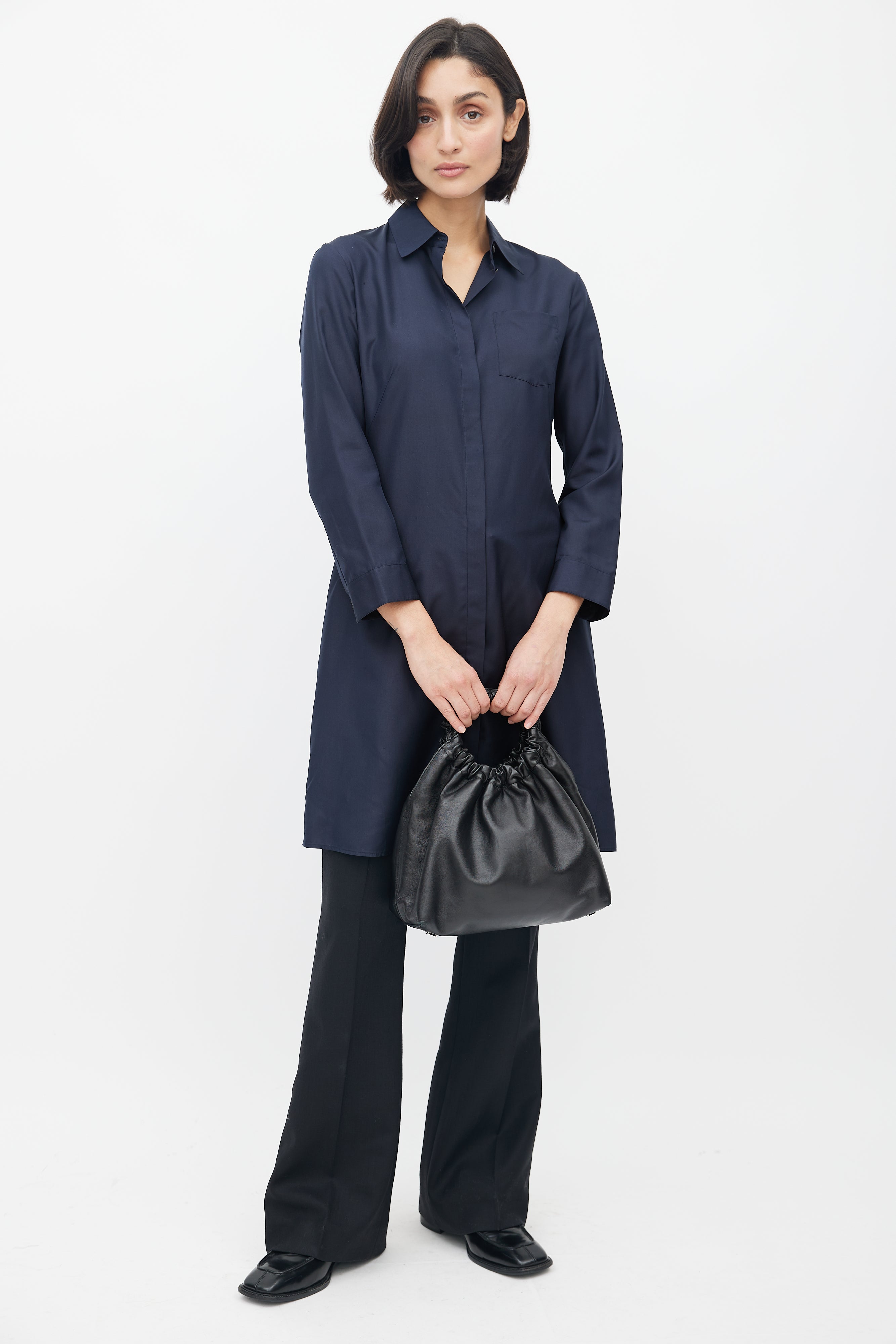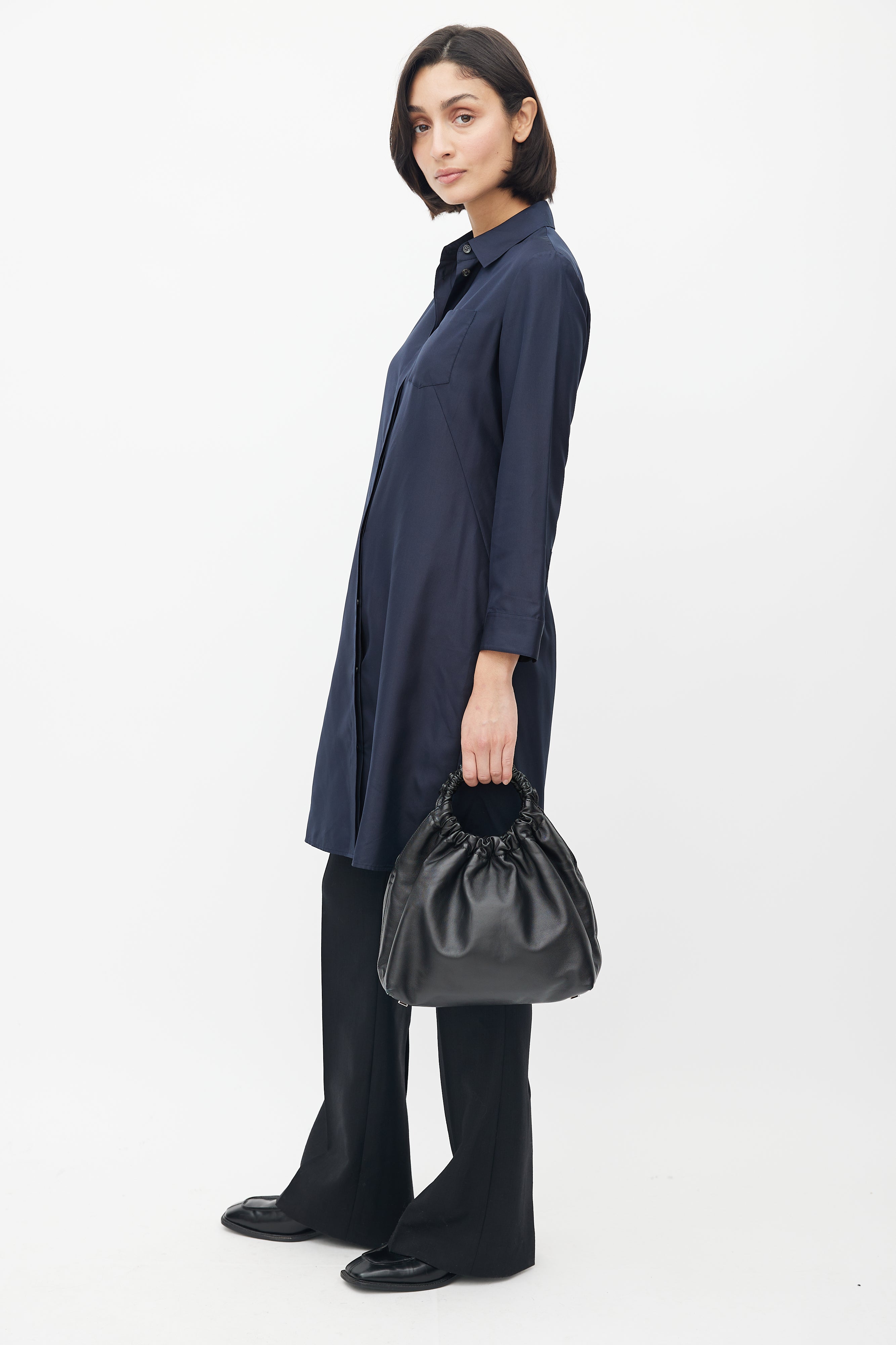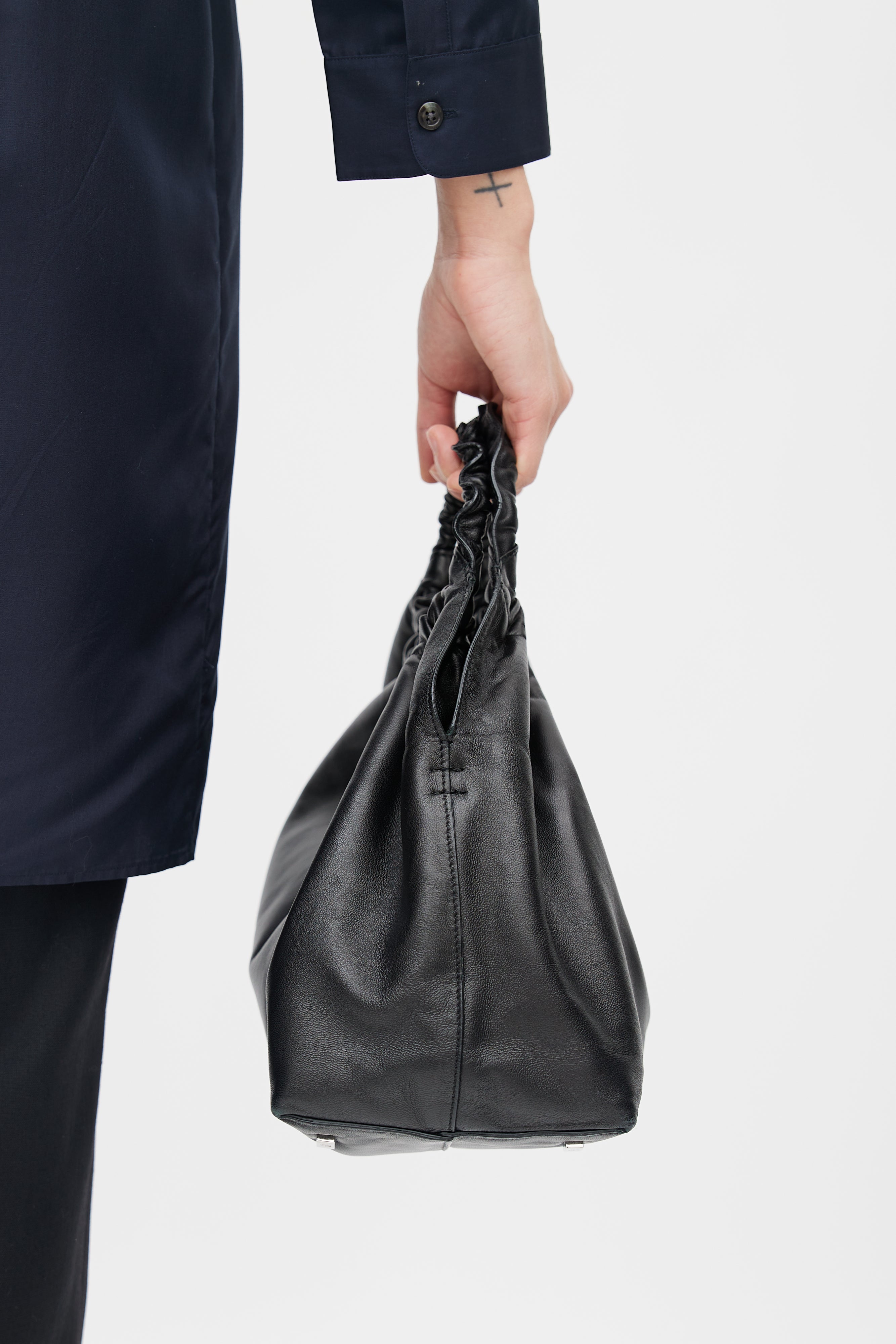 Pre-owned The Row black medium Double Circle bag featuring double ruched top handle, embossed logo at side, metal protective feet, detachable shoulder strap, slight sheen at lining, and zip pocket inside. Comes with original dust bag.
