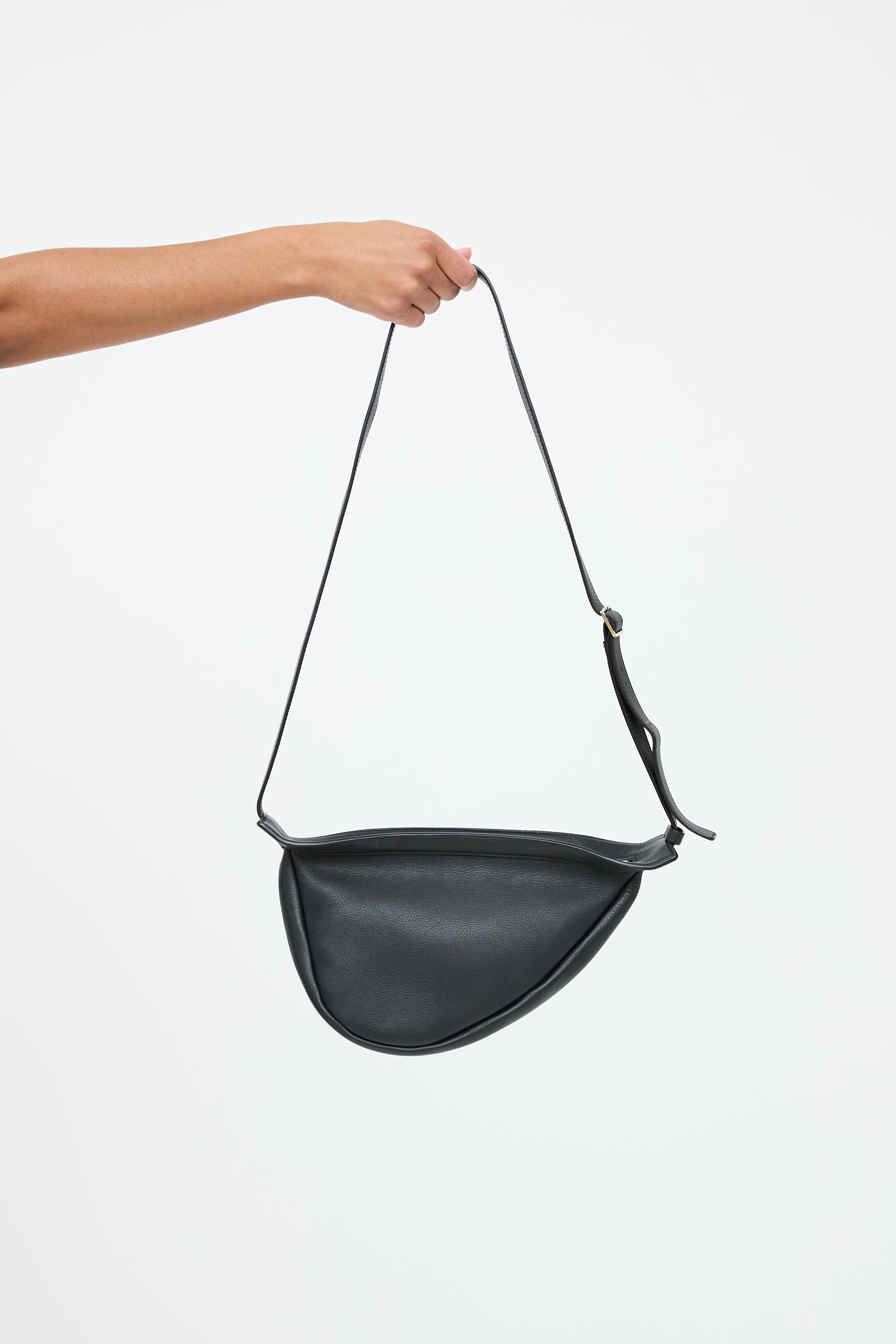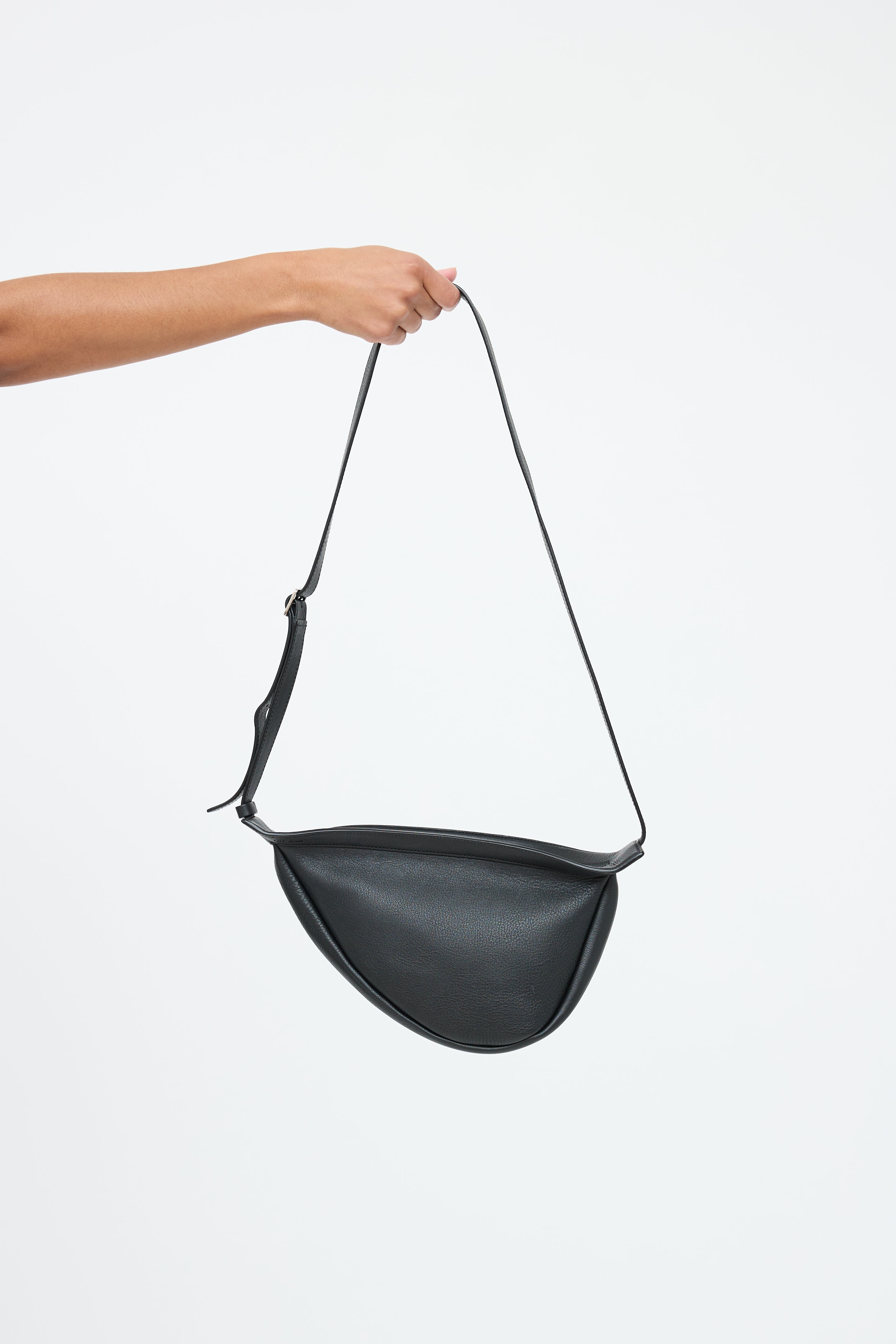 Pre-owned The Row black Slouchy Banana leather bag featuring a debossed logo at front, adjustable shoulder strap, and top zip closure. Includes original dust bag.