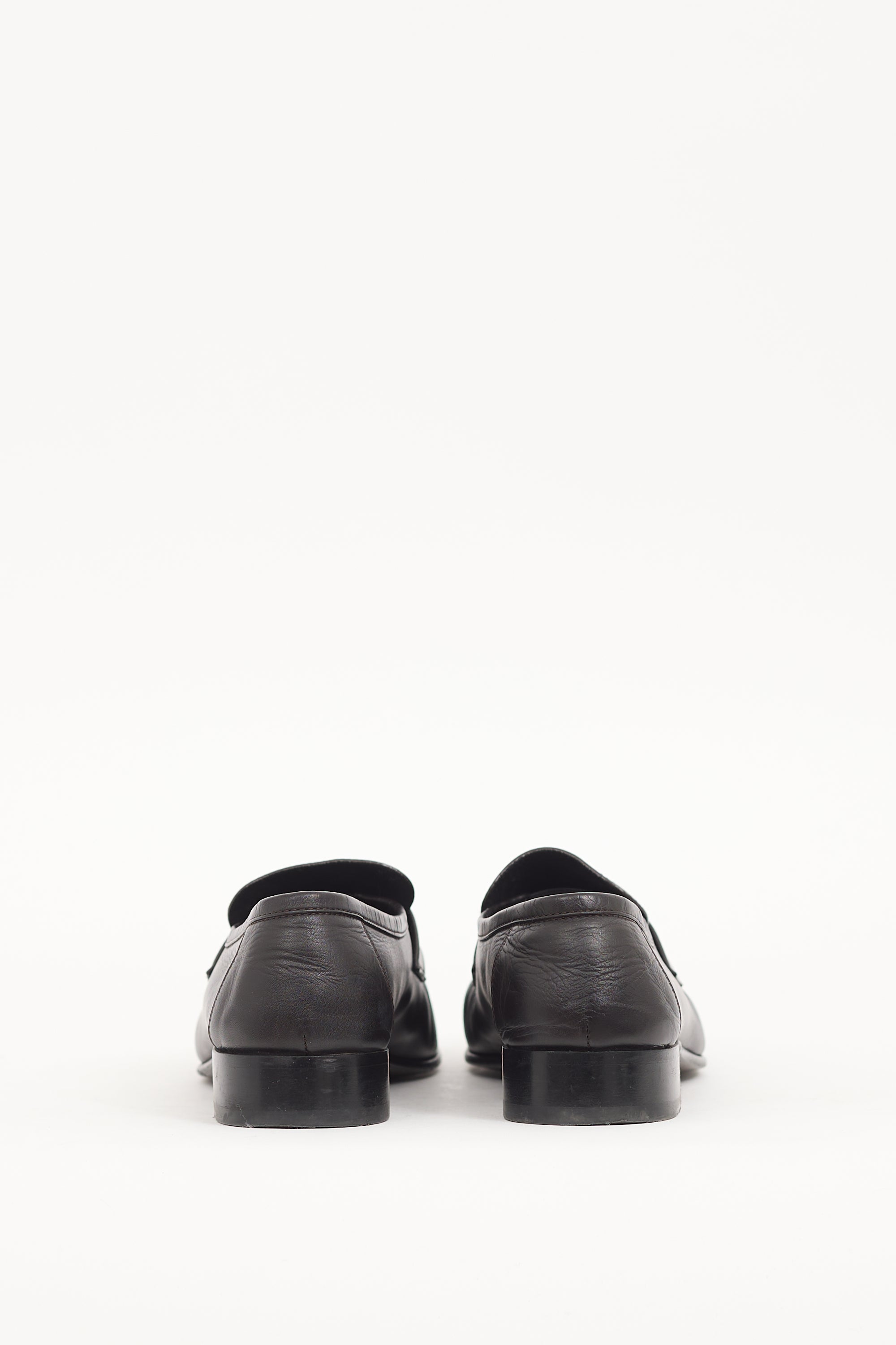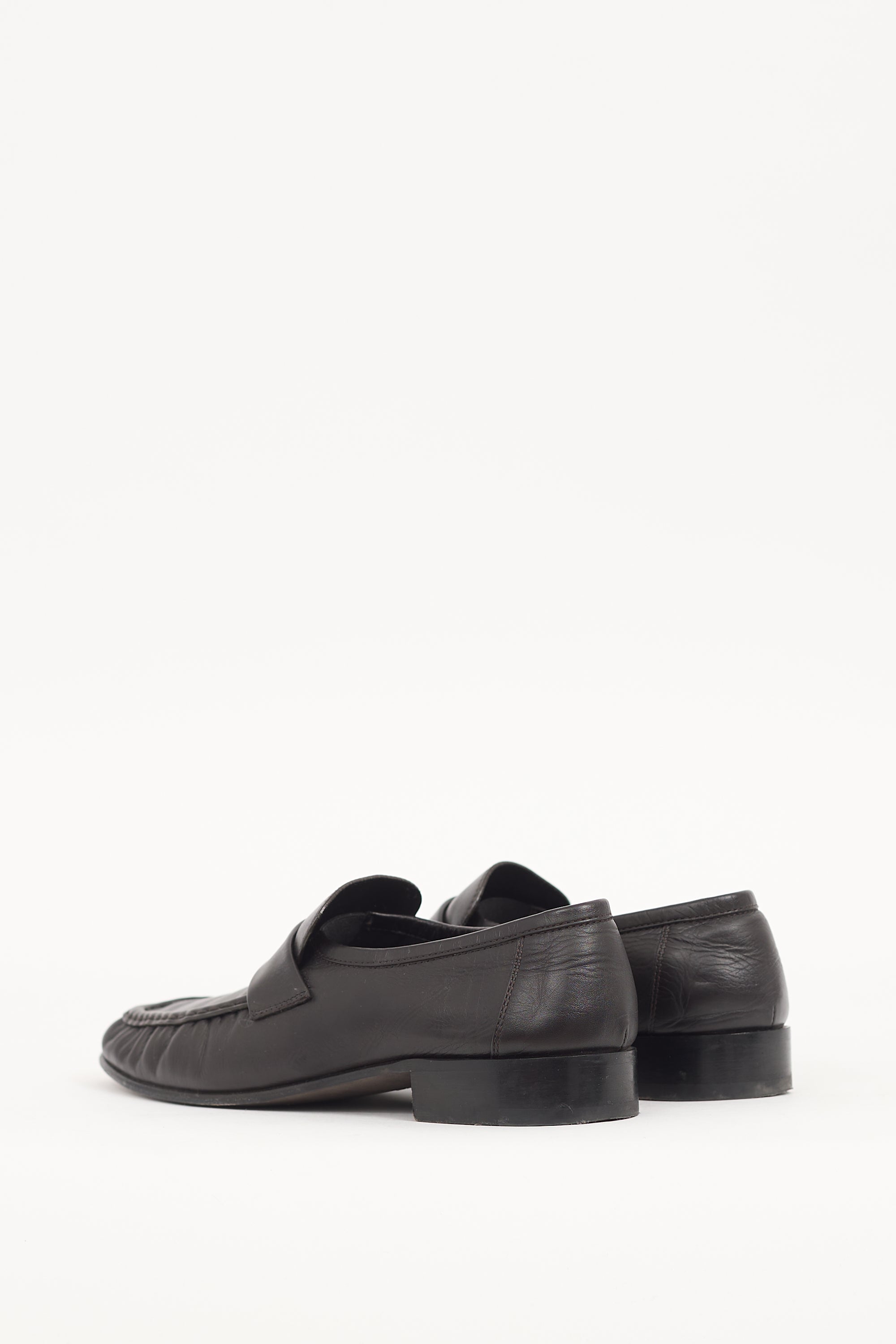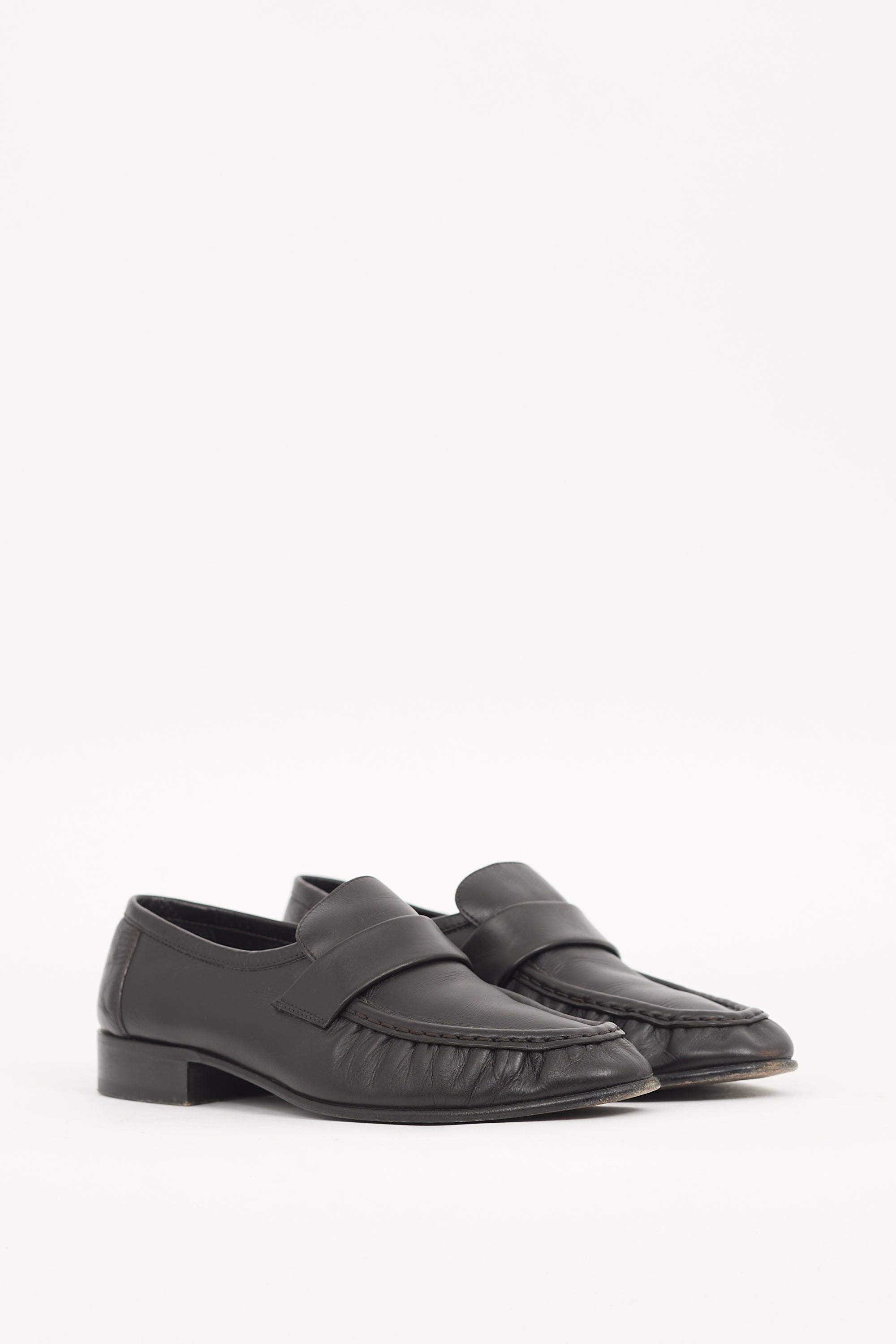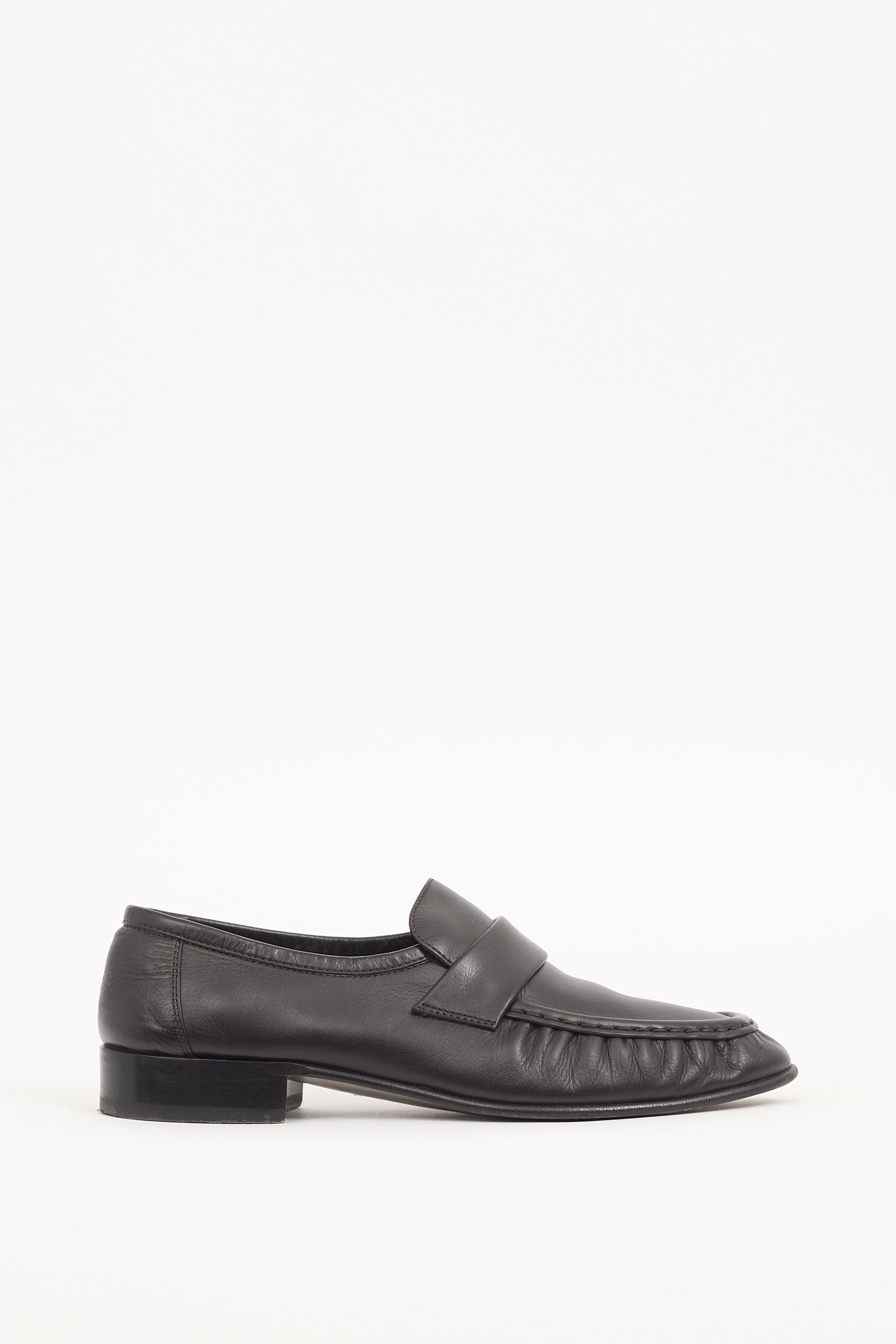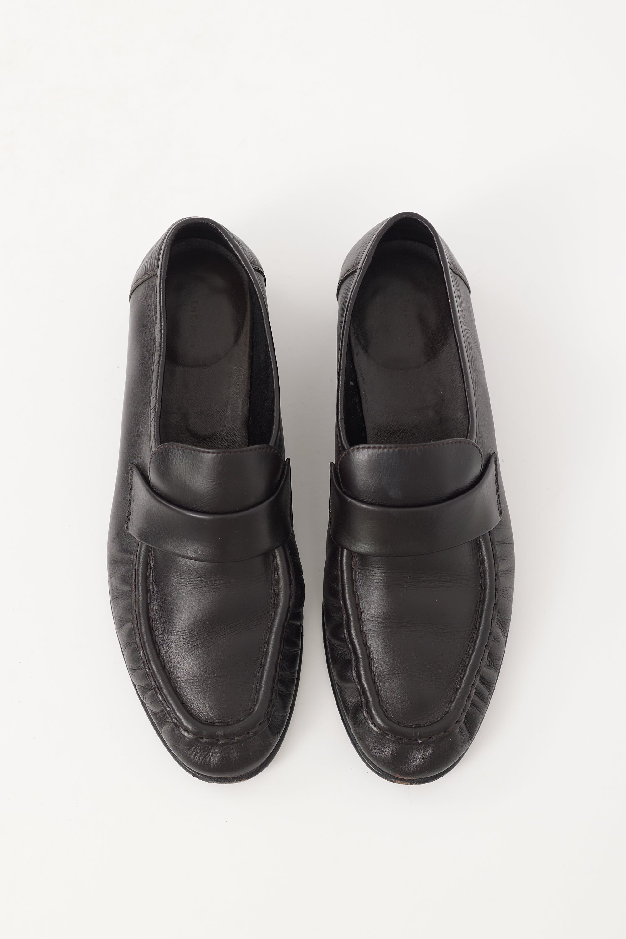 Pre-owned The Row dark brown leather Soft loafers featuring a rounded toe, gathering at toe box, notched topline, strap detail across vamp, and stacked heel. Comes with original dust bag.