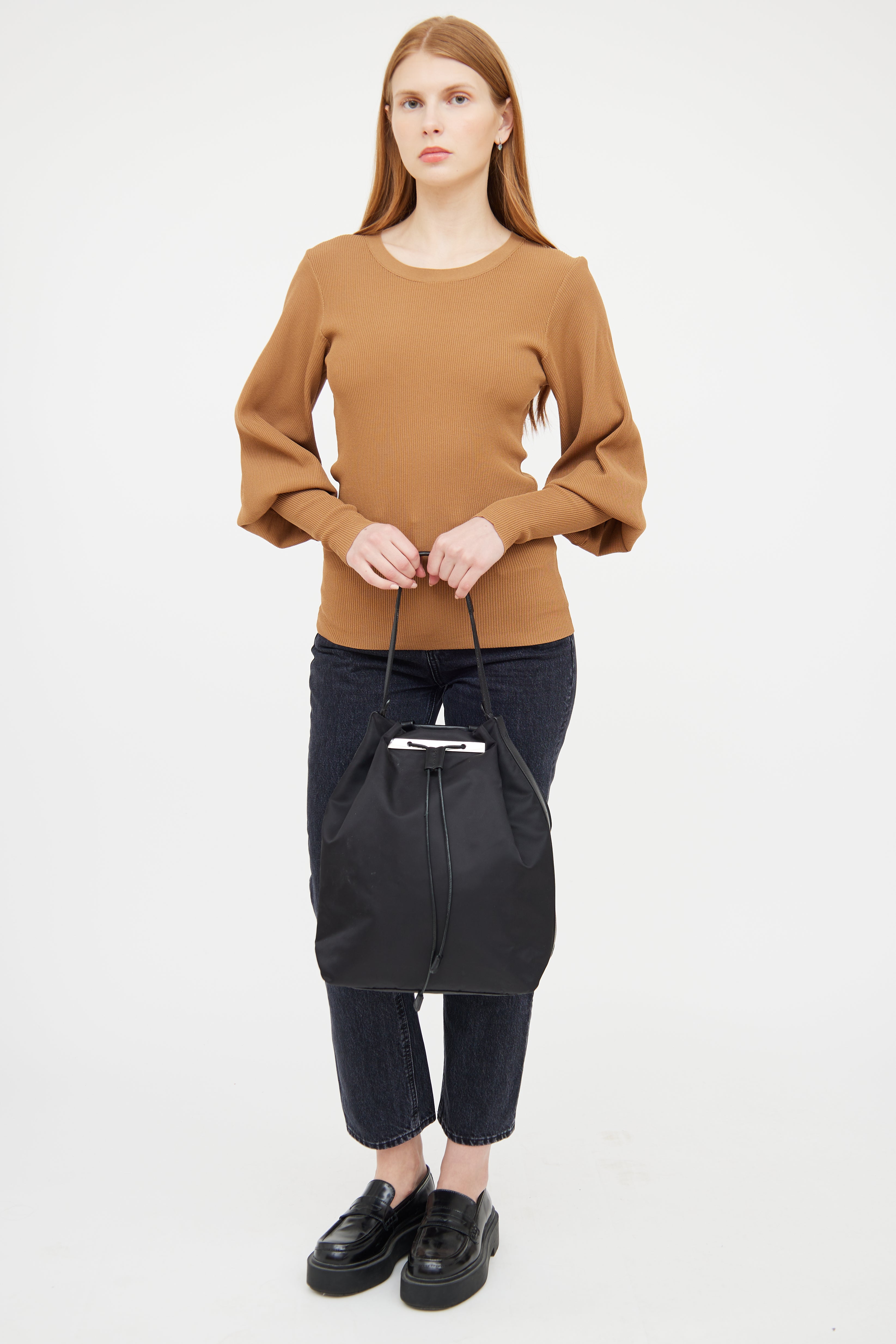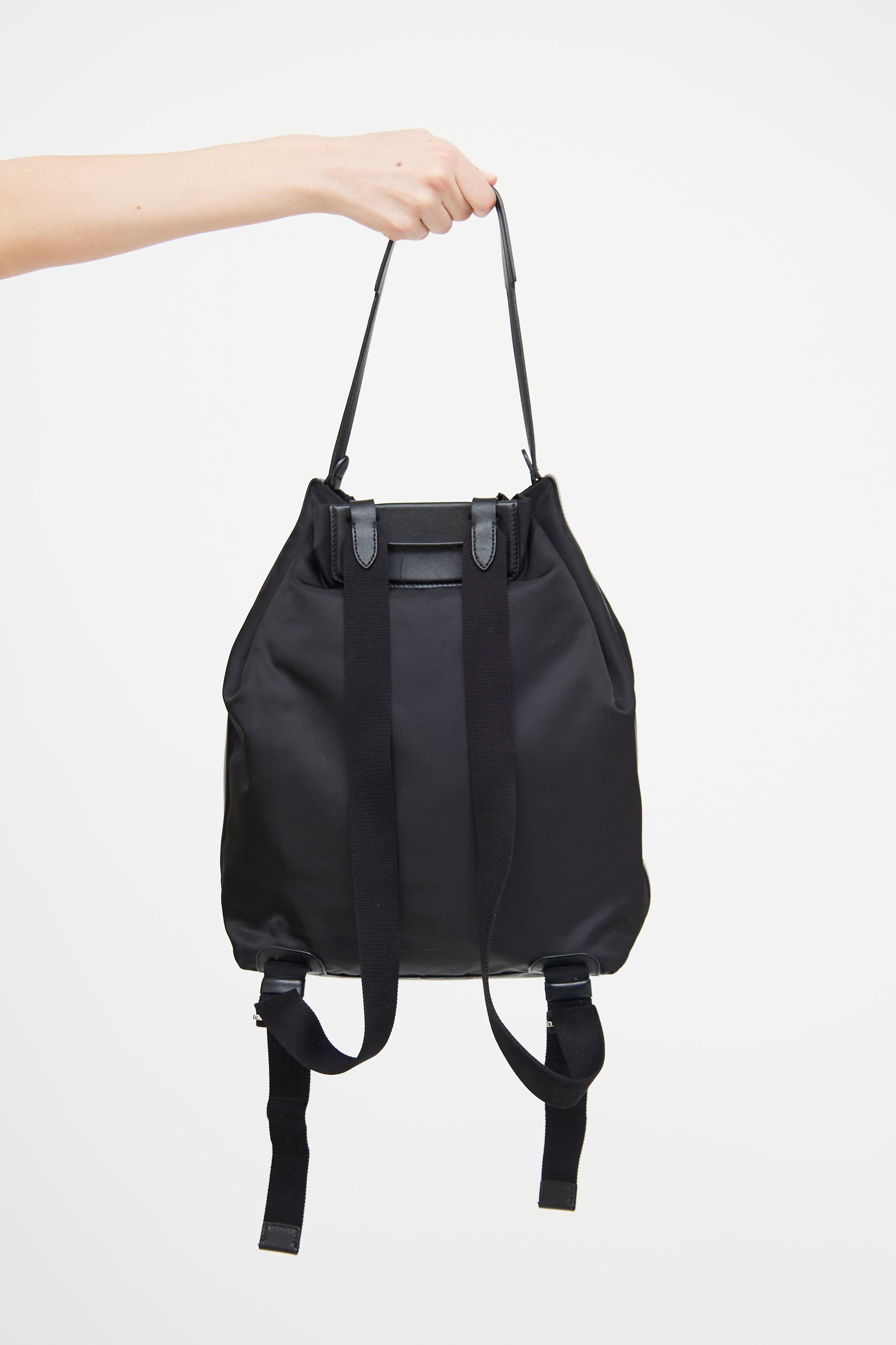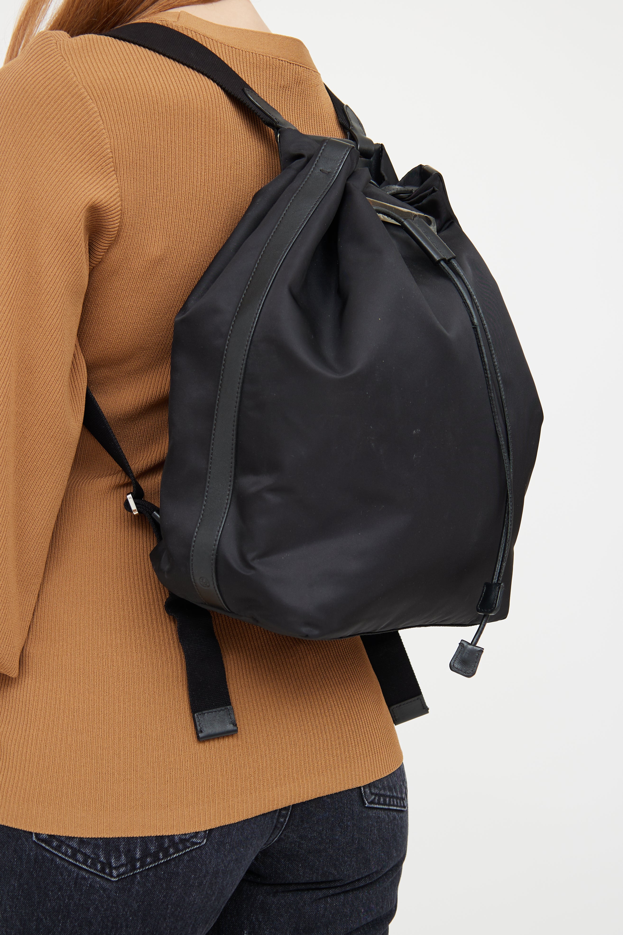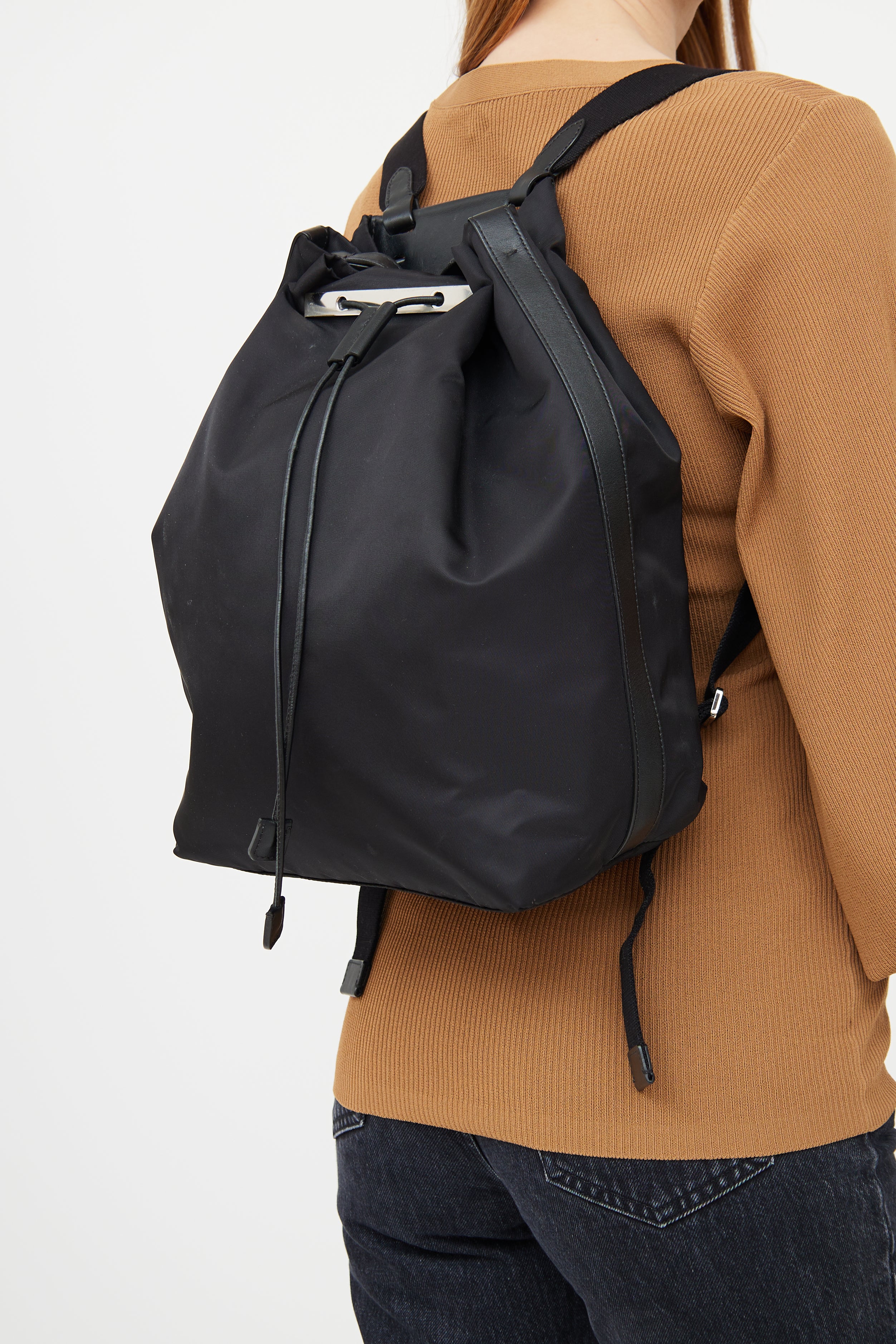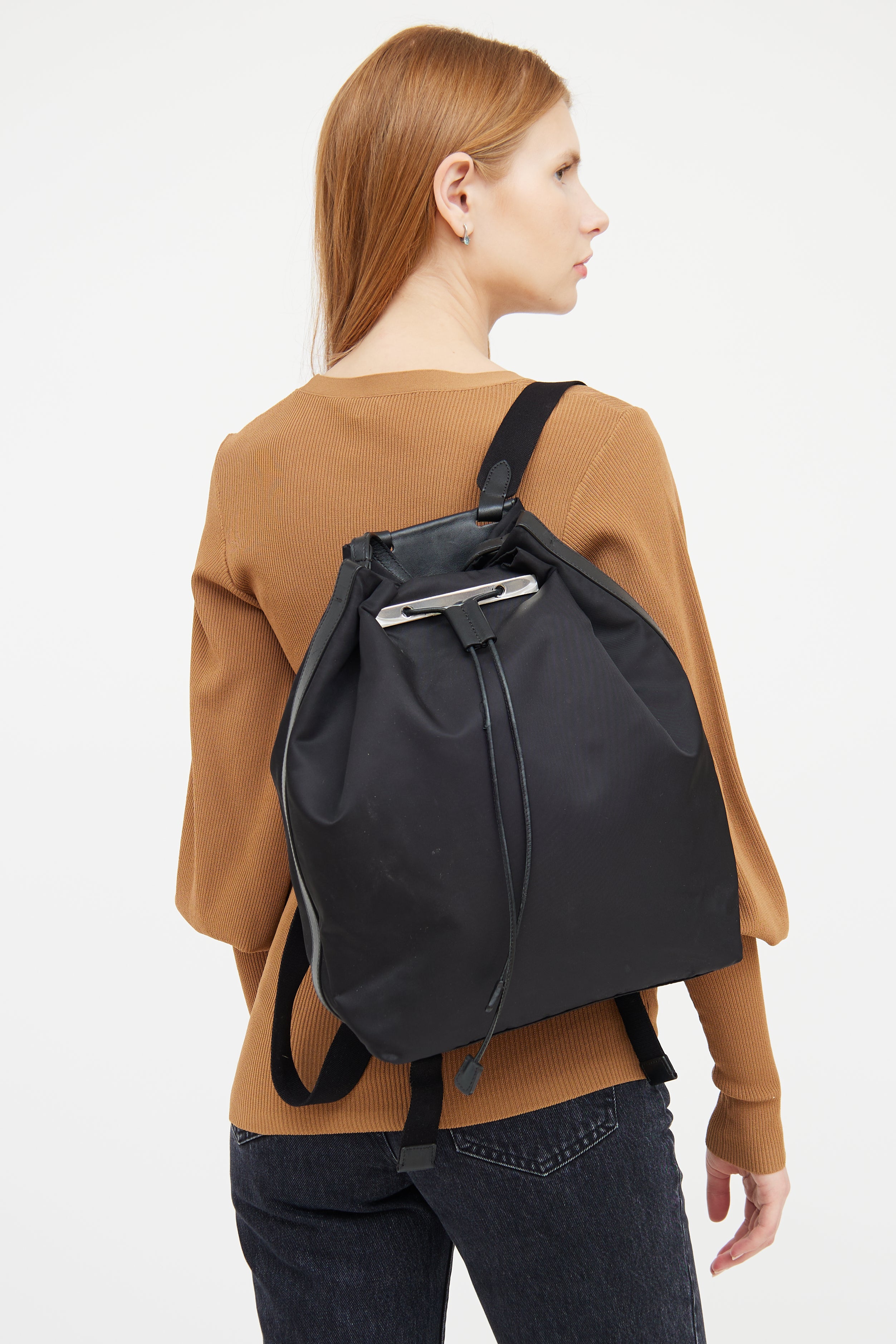 Pre-owned The Row black 11 backpack featuring nylon material, black leather trim, silver tone hardware, drawstring closure, flat leather top handle, two adjustable webbing straps, interior lined in cream textile with two slip pockets and one zipper pocket.