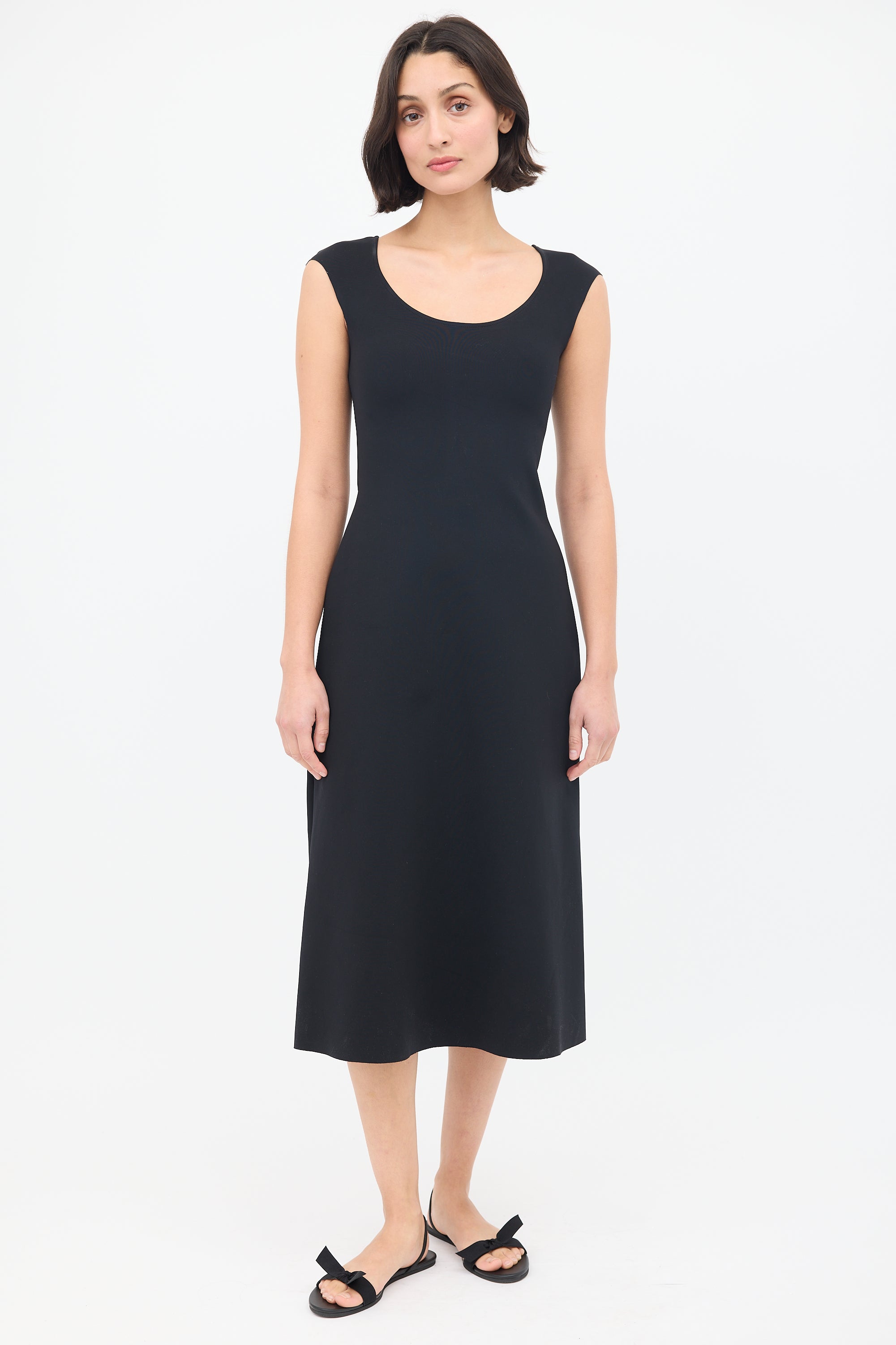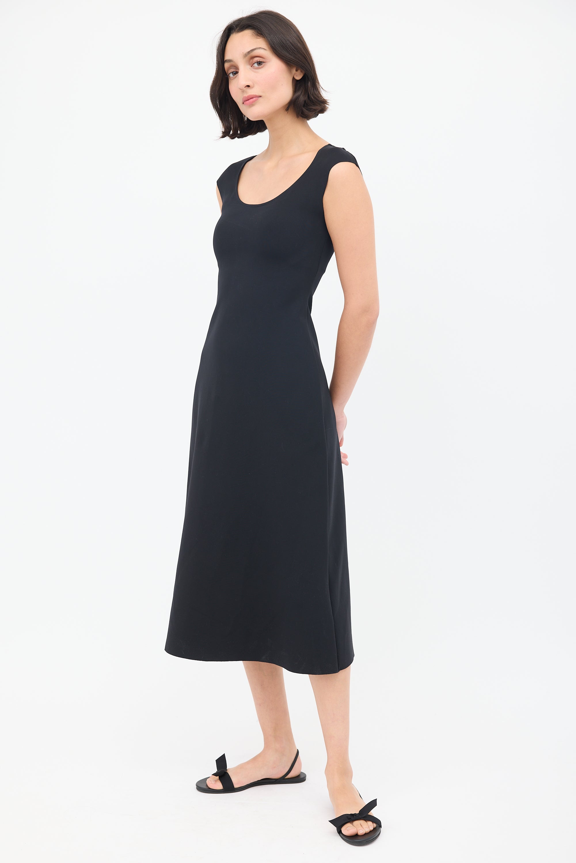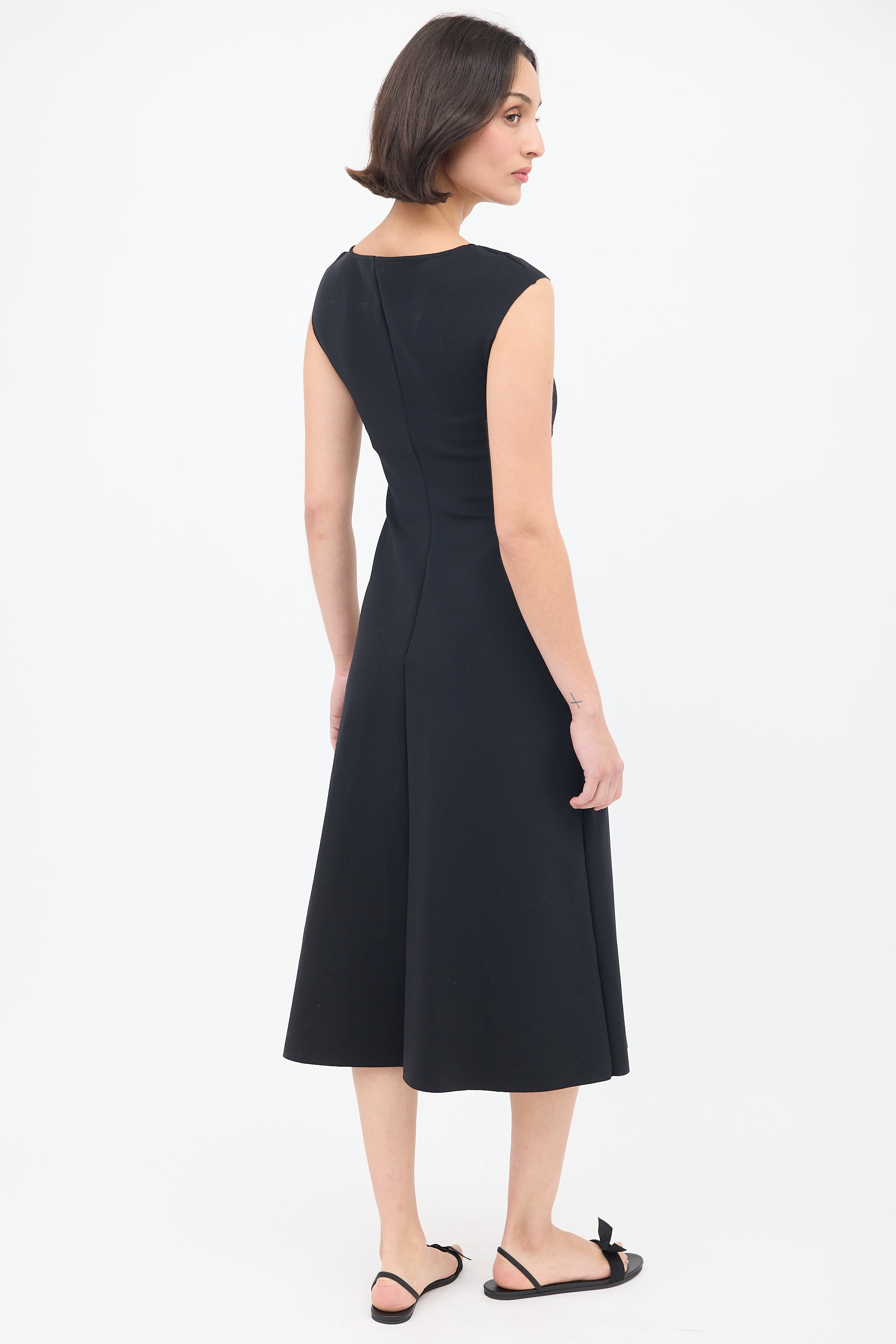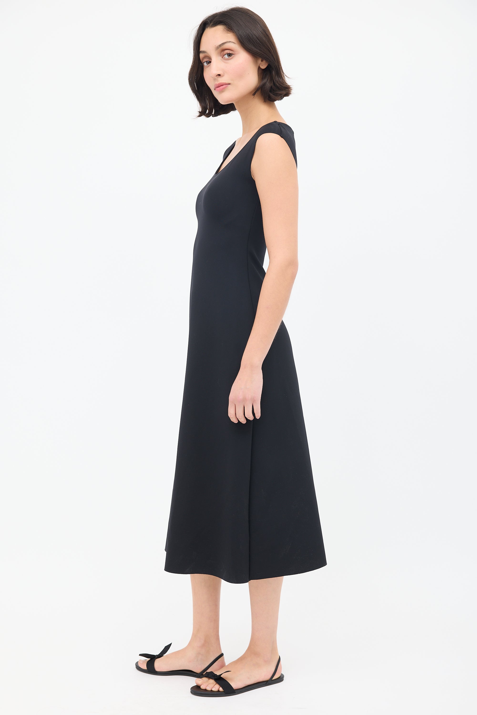 Pre-owned The Row black nylon blend Rhode midi dress featuring a scoop neckline, cap sleeves, A-line design, and raw edges.
