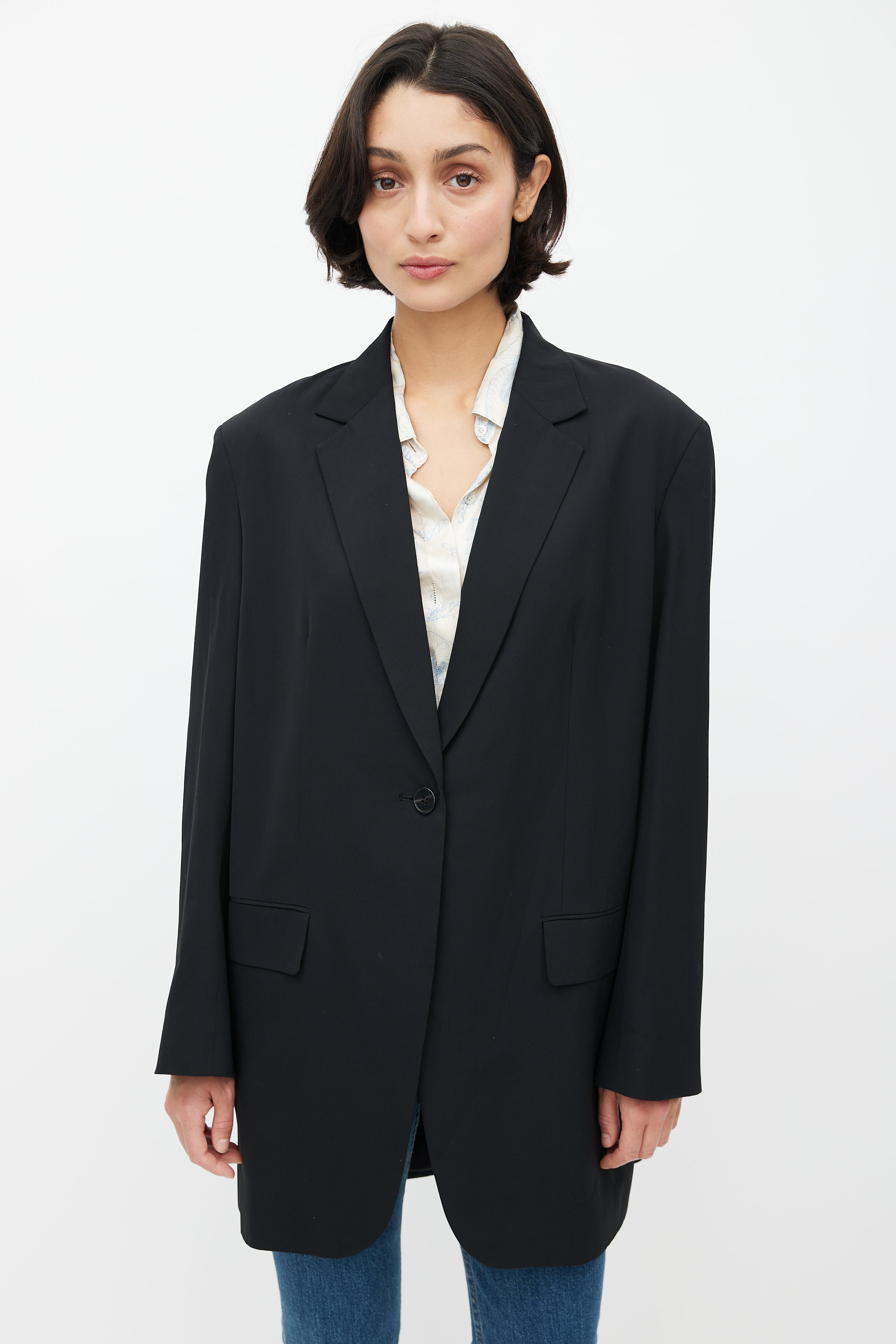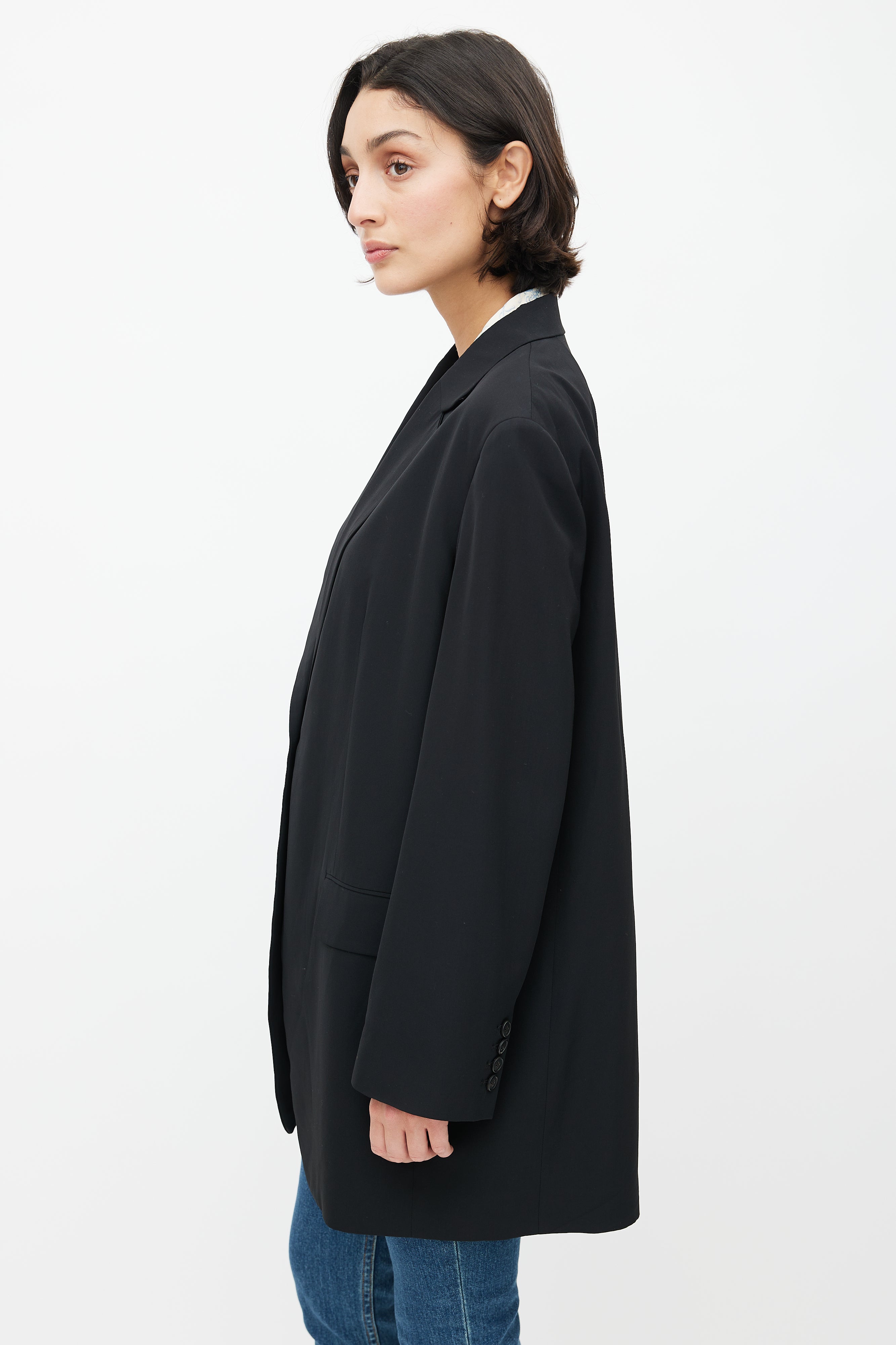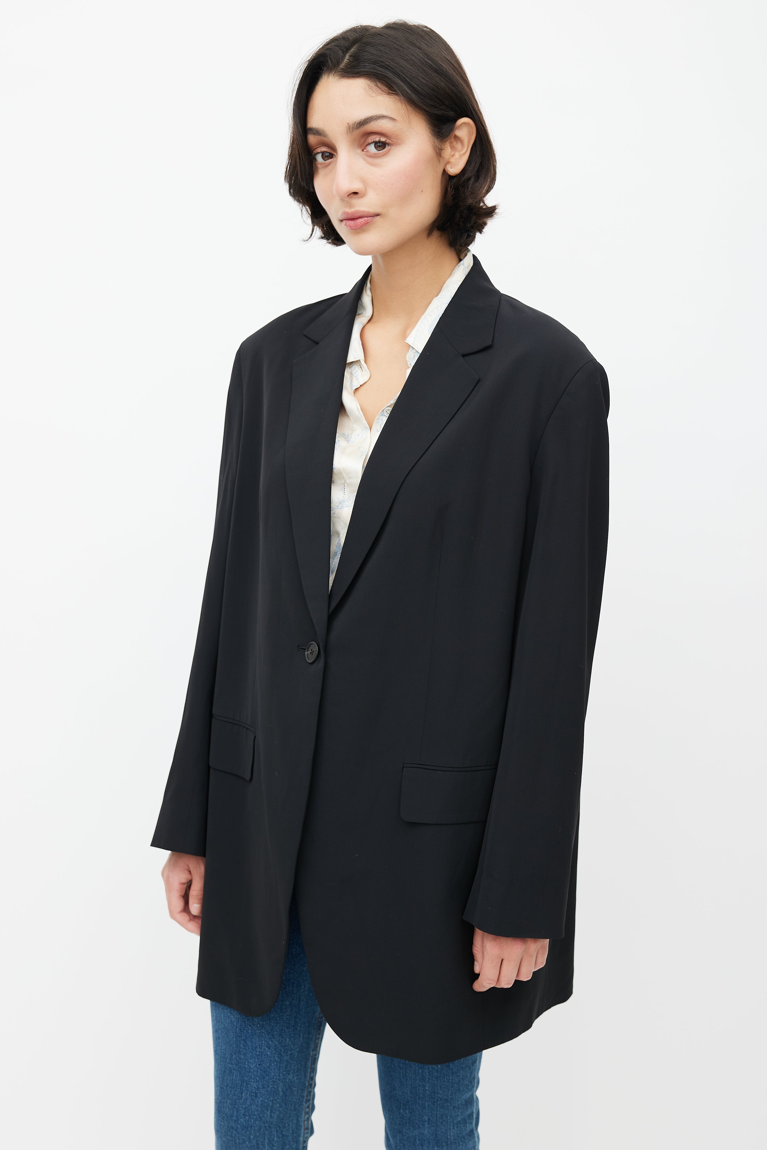 Pre-owned The Row black wool blazer featuring a notched lapel, long sleeves with buttoned cuffs, two flap pockets at hip, and button up front. Lined.