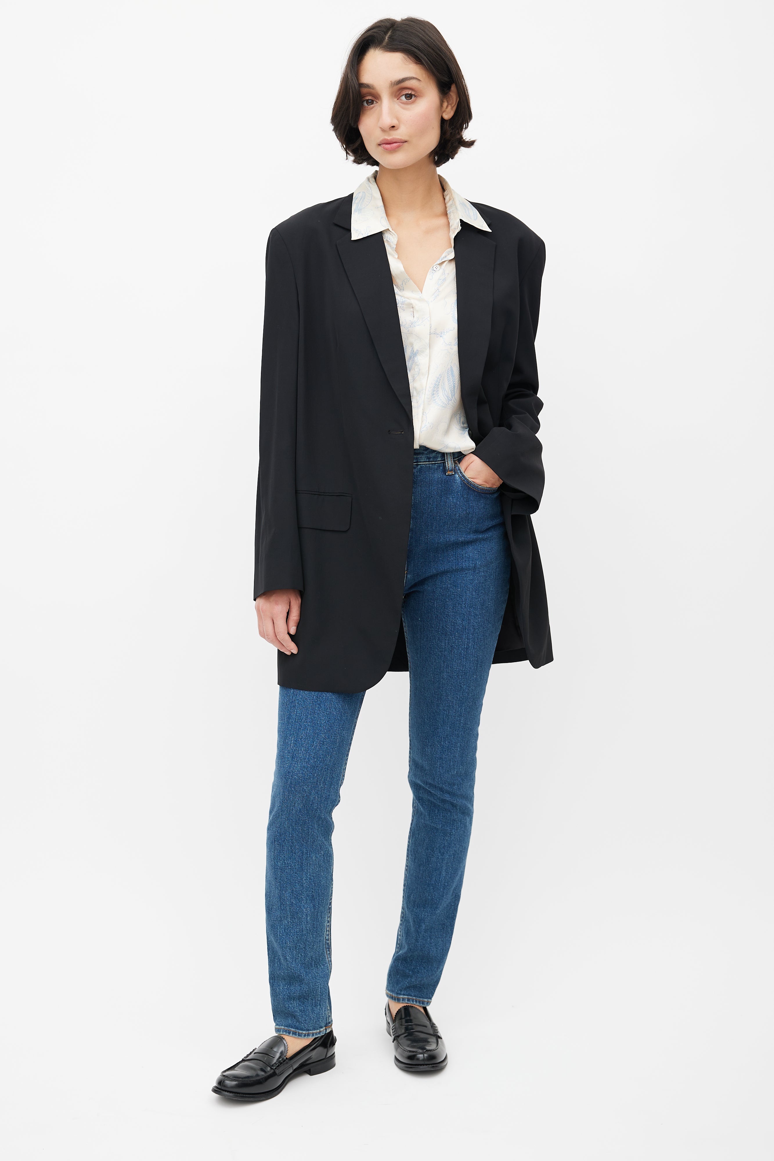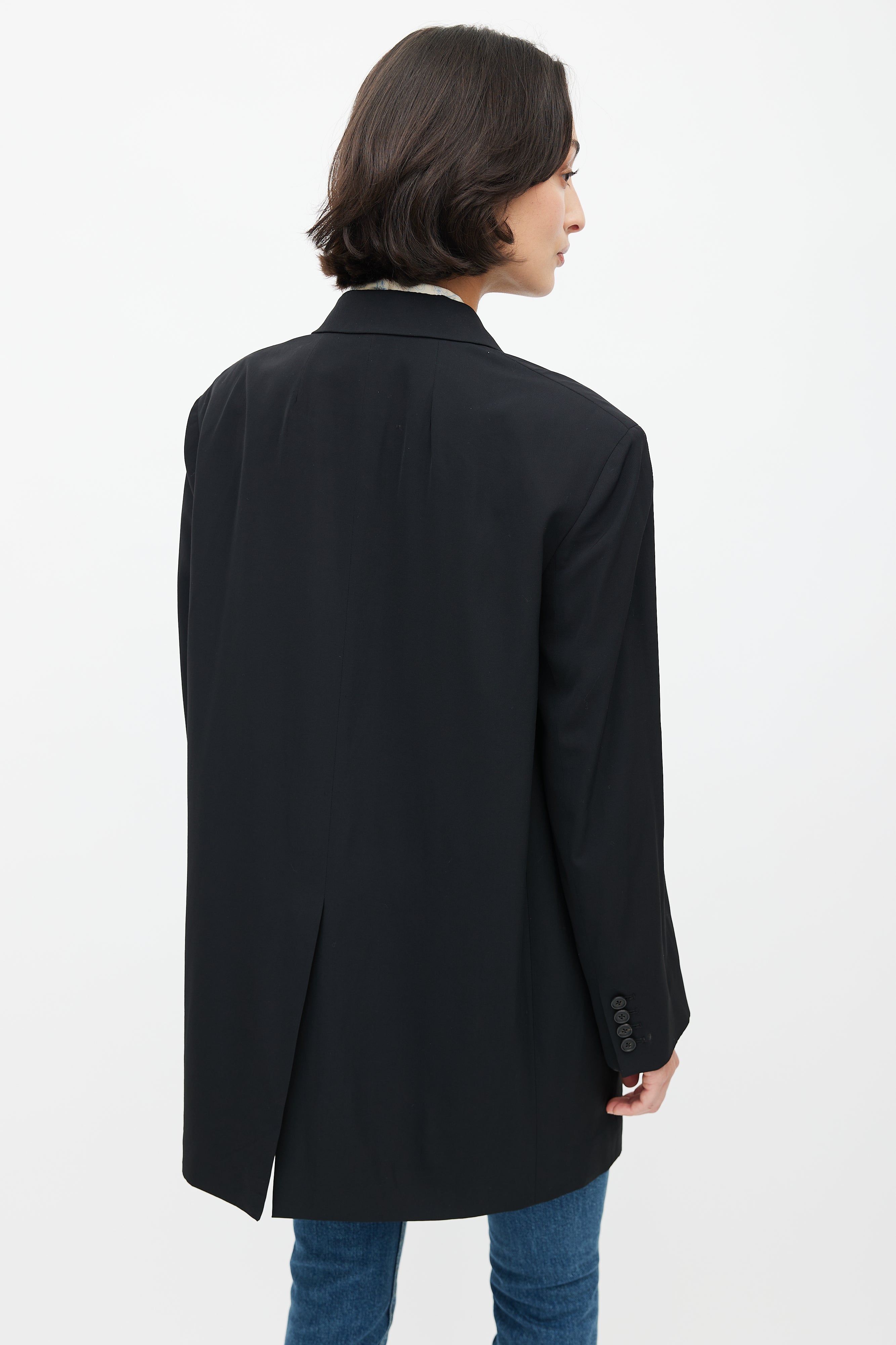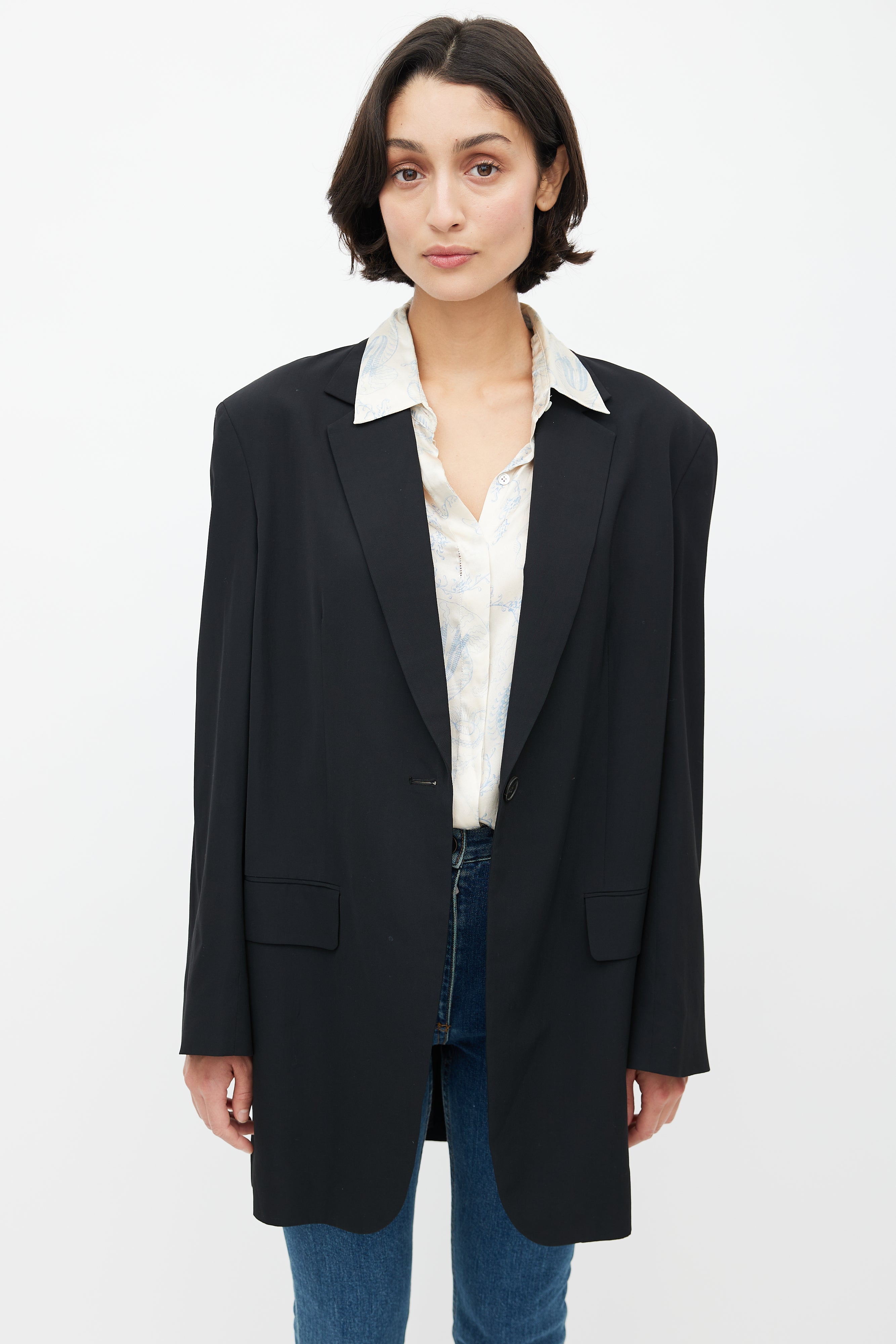 Pre-owned The Row black wool blazer featuring a notched lapel, long sleeves with buttoned cuffs, two flap pockets at hip, and button up front. Lined.