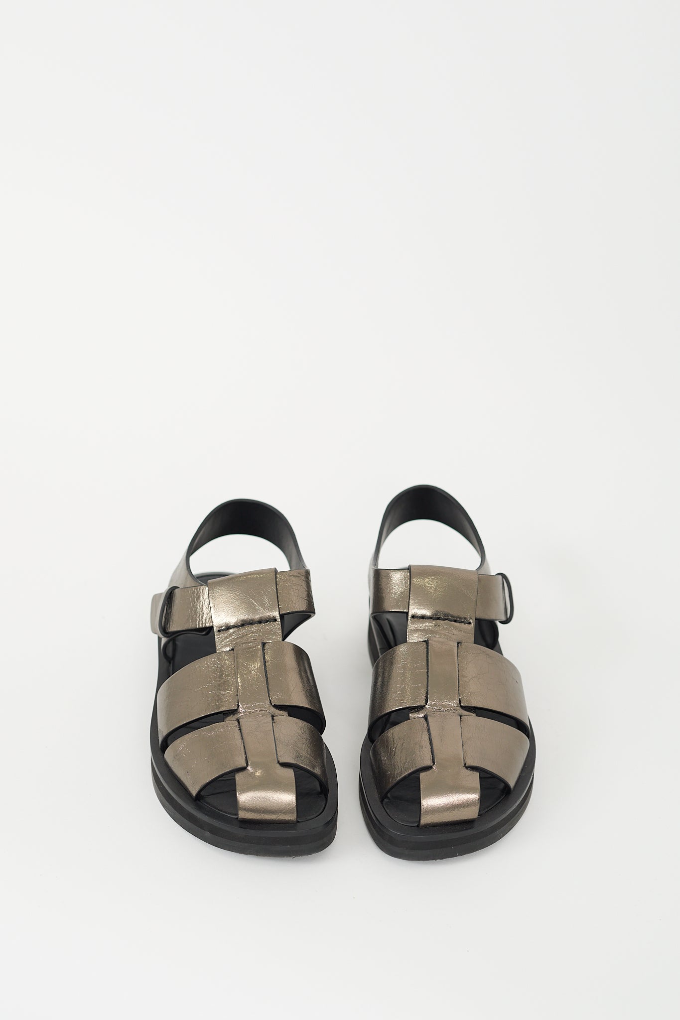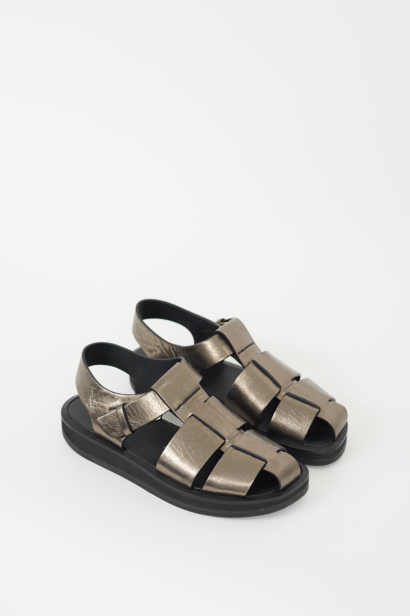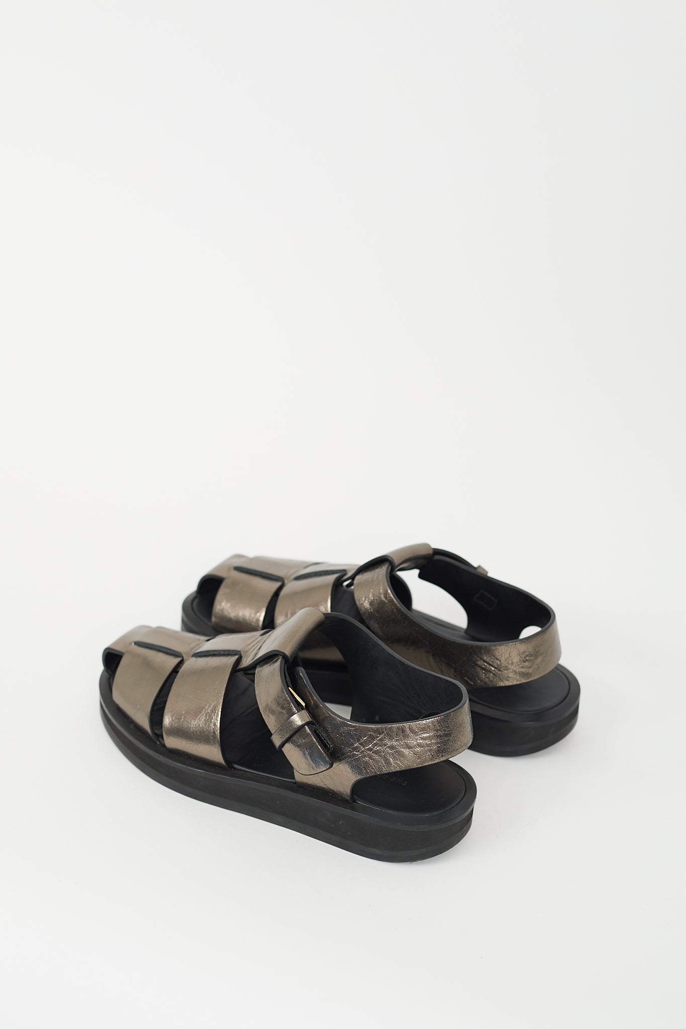 Pre-owned The Row bronze metallic leather Fisherman sandals featuring rounded toe, multi strap detail at front, adjustable strap at ankle, gold tone buckle closure and rubber platform outsole.