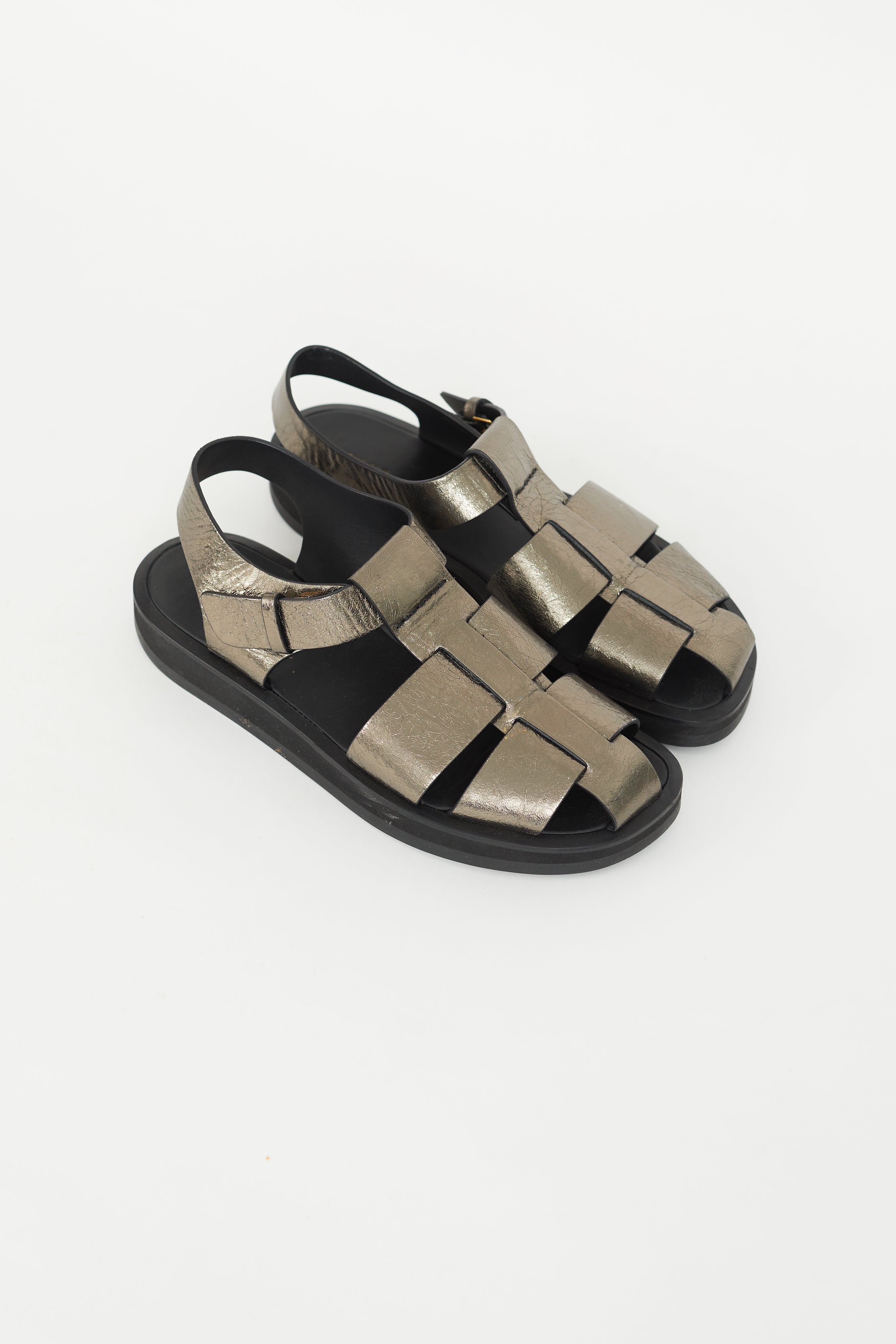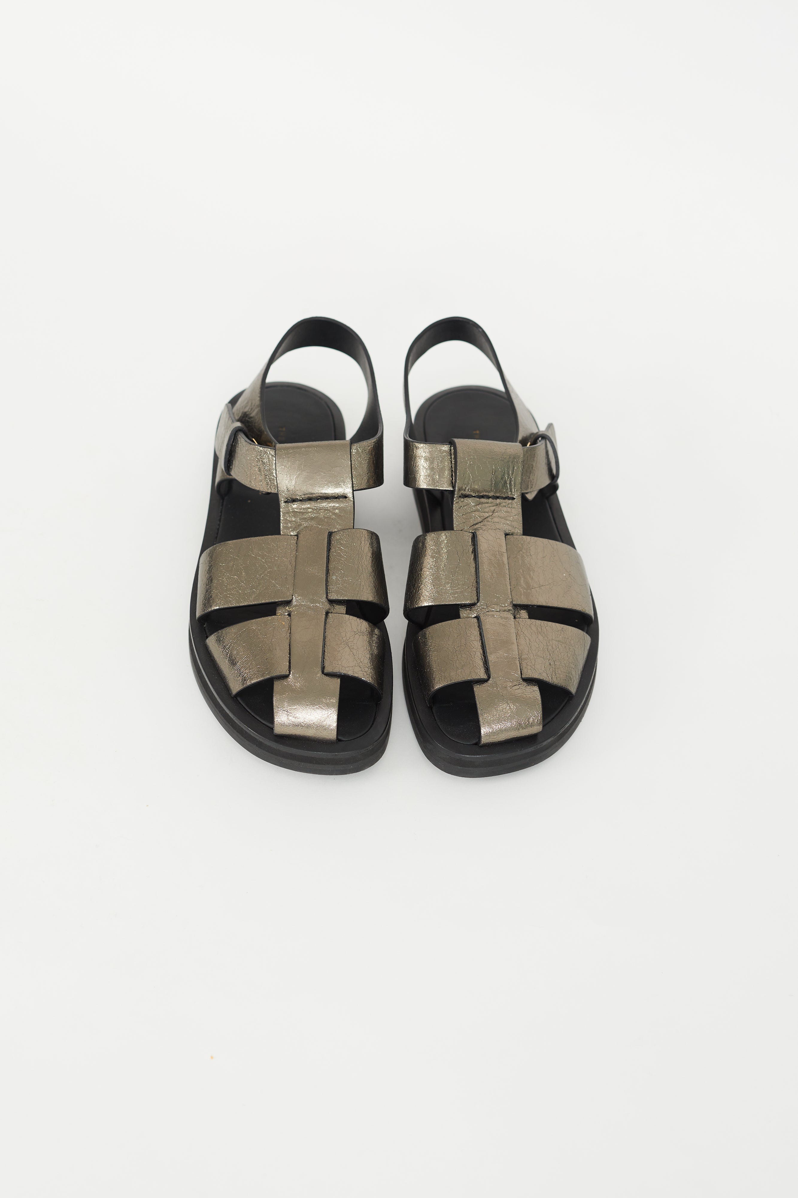Pre-owned The Row bronze fisherman sandals featuring rounded toe, strap detail at face, and ankle strap with concealed buckle fastening.