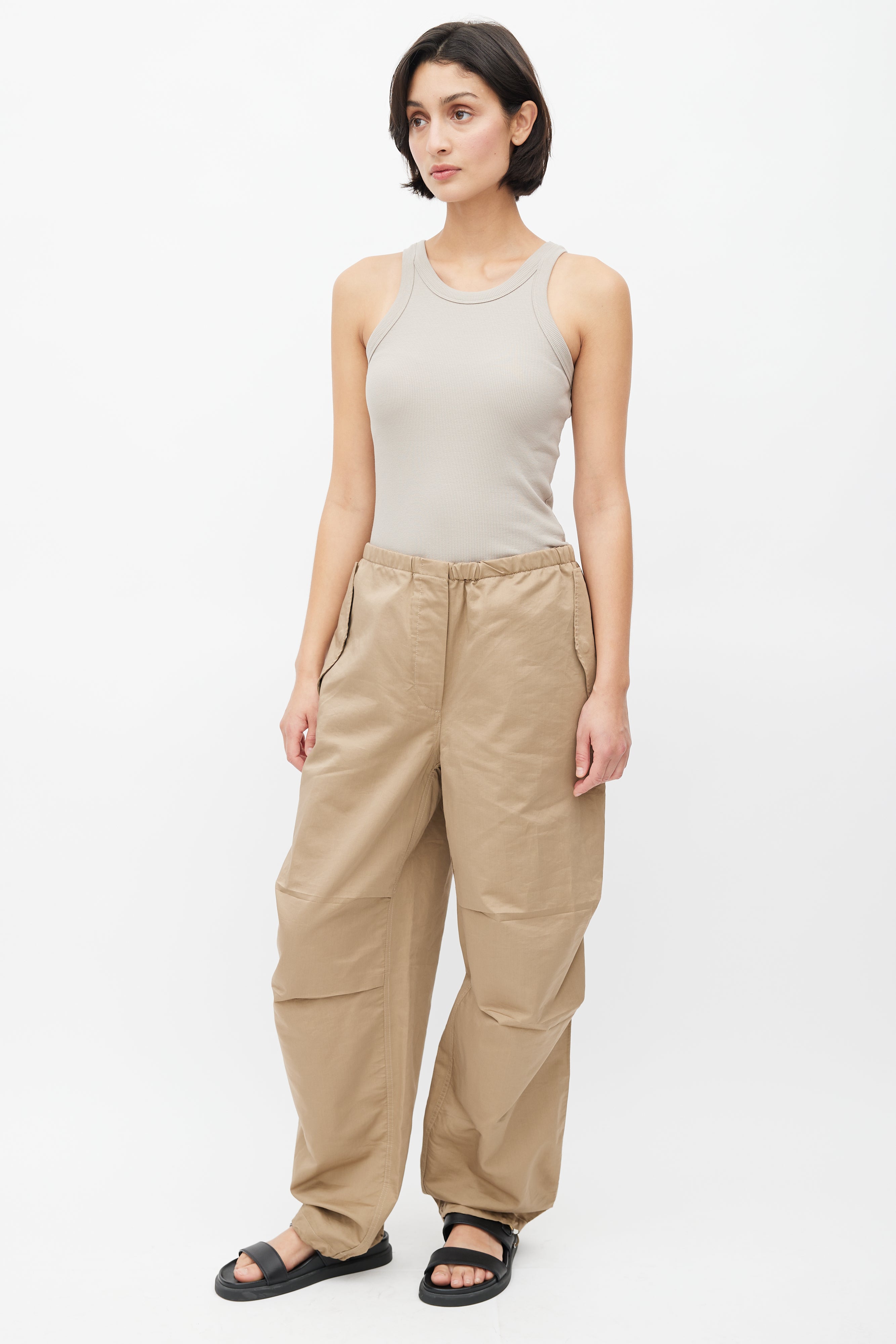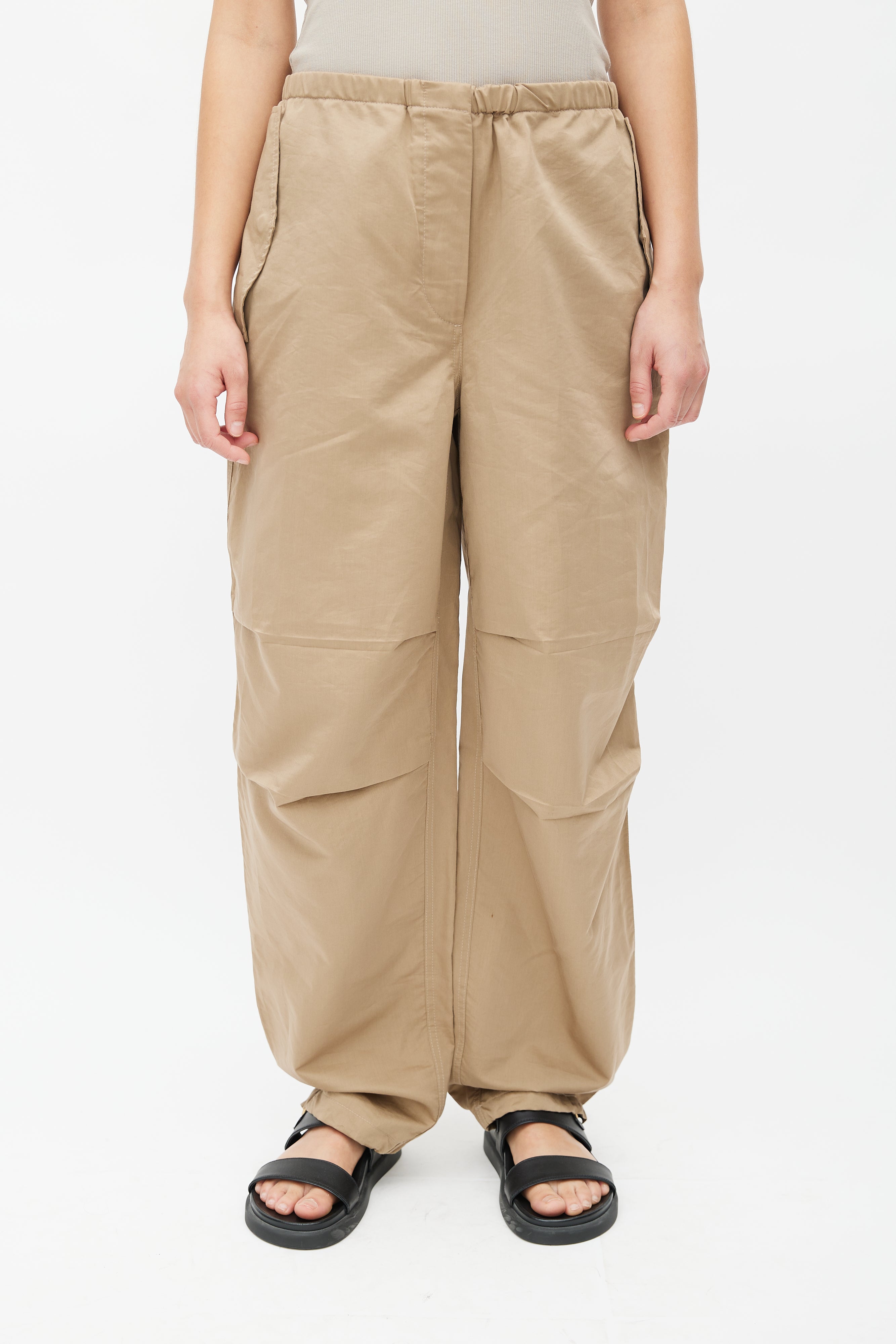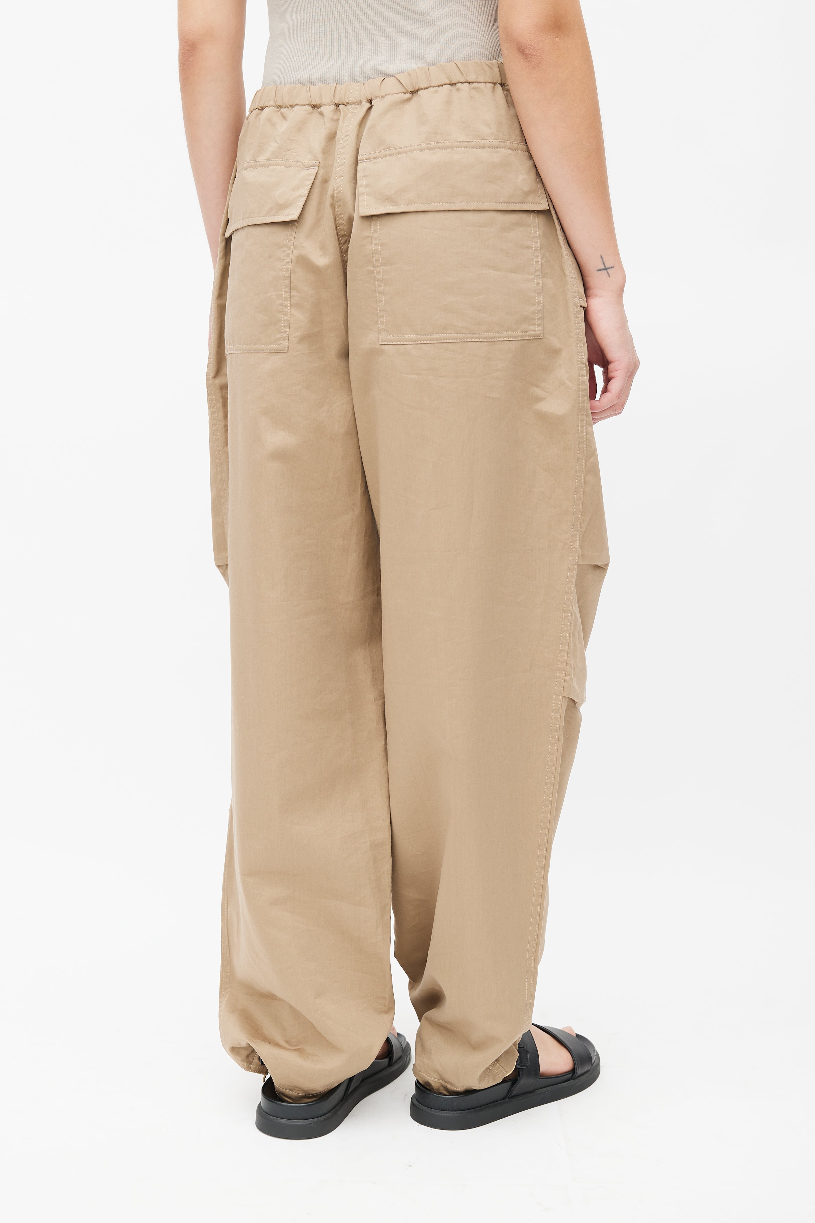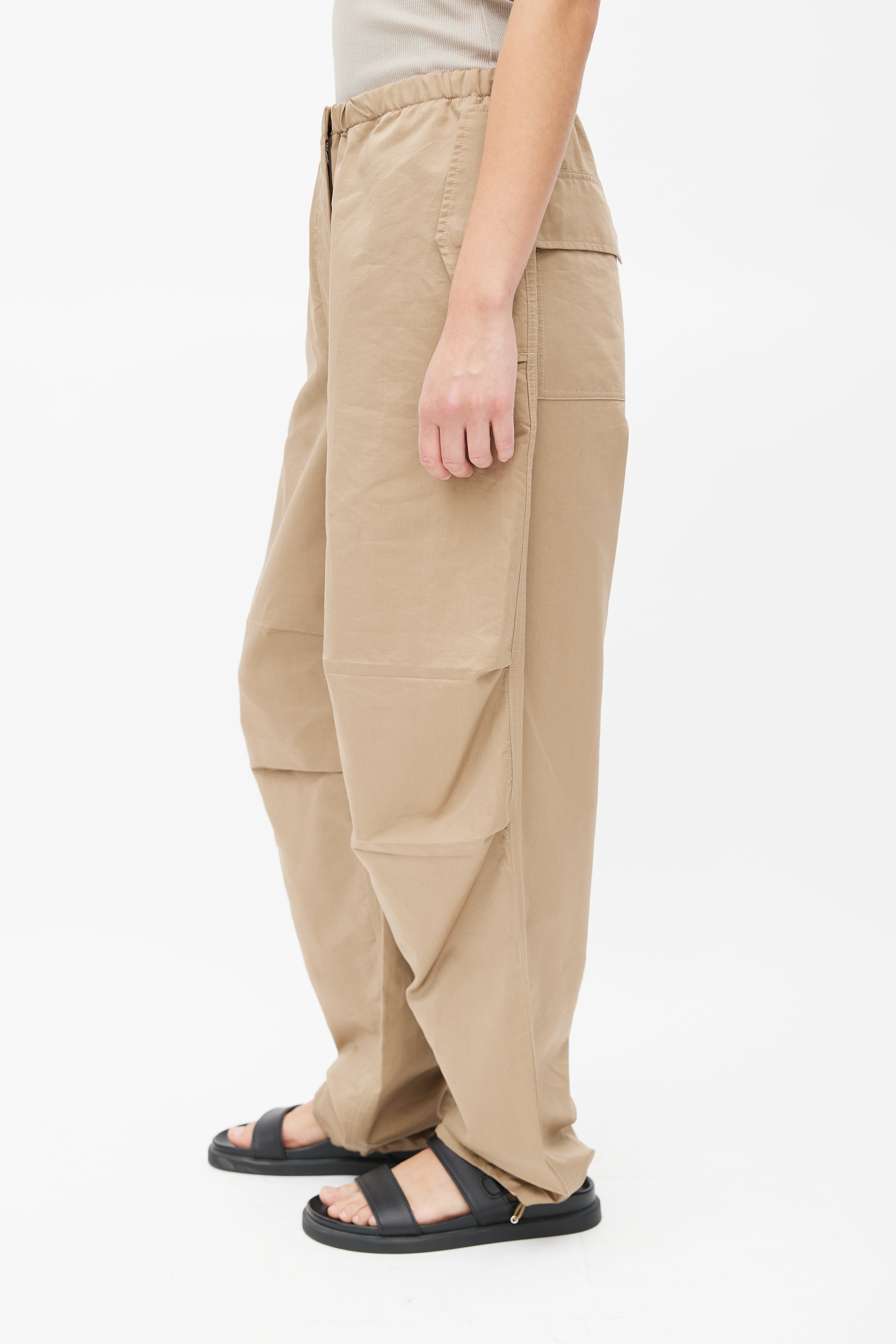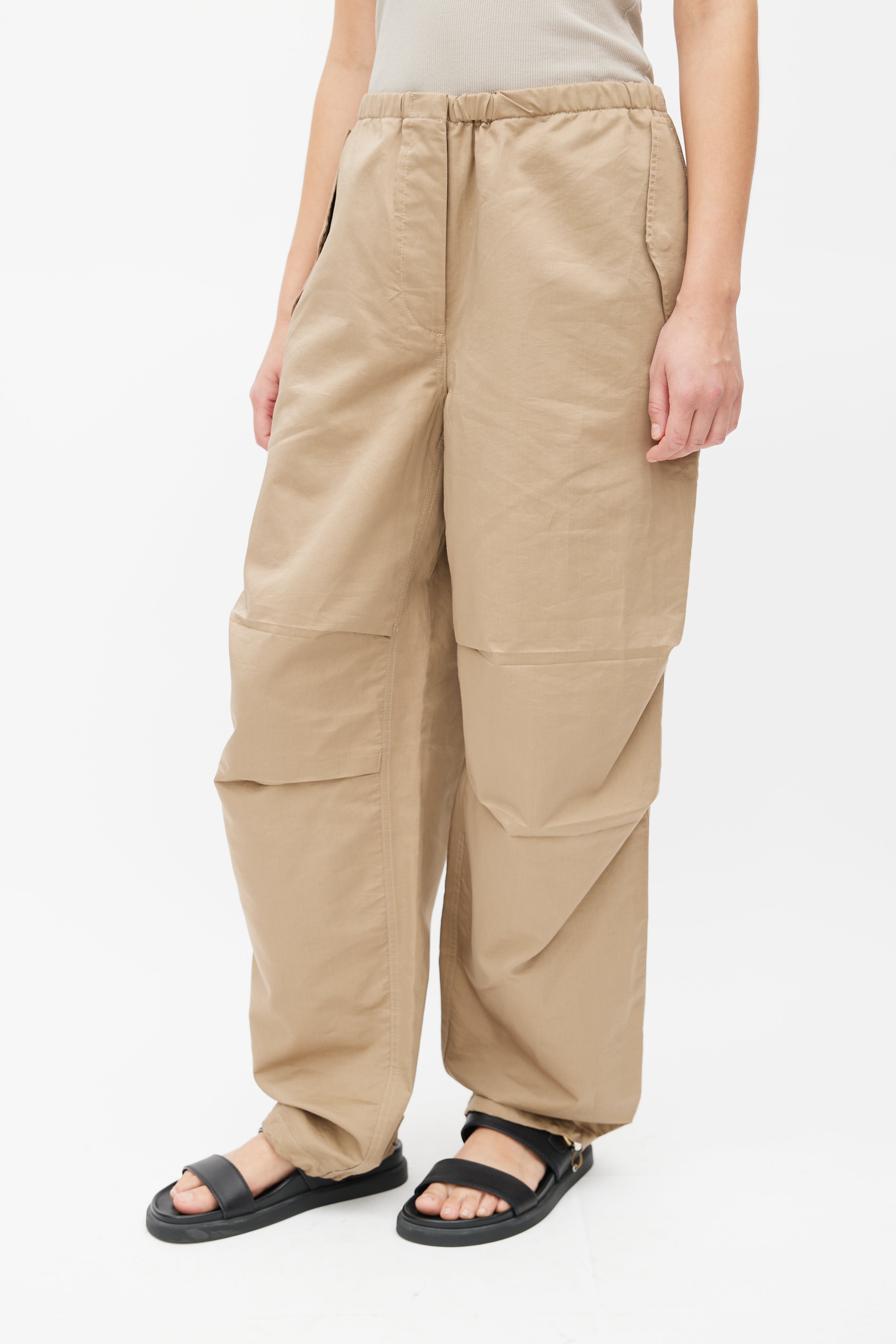 Pre-owned The Row brown trousers featuring an elasticized waist, two flap pockets at hip, darted knee, drawstring hem, and zip fly with button closure.