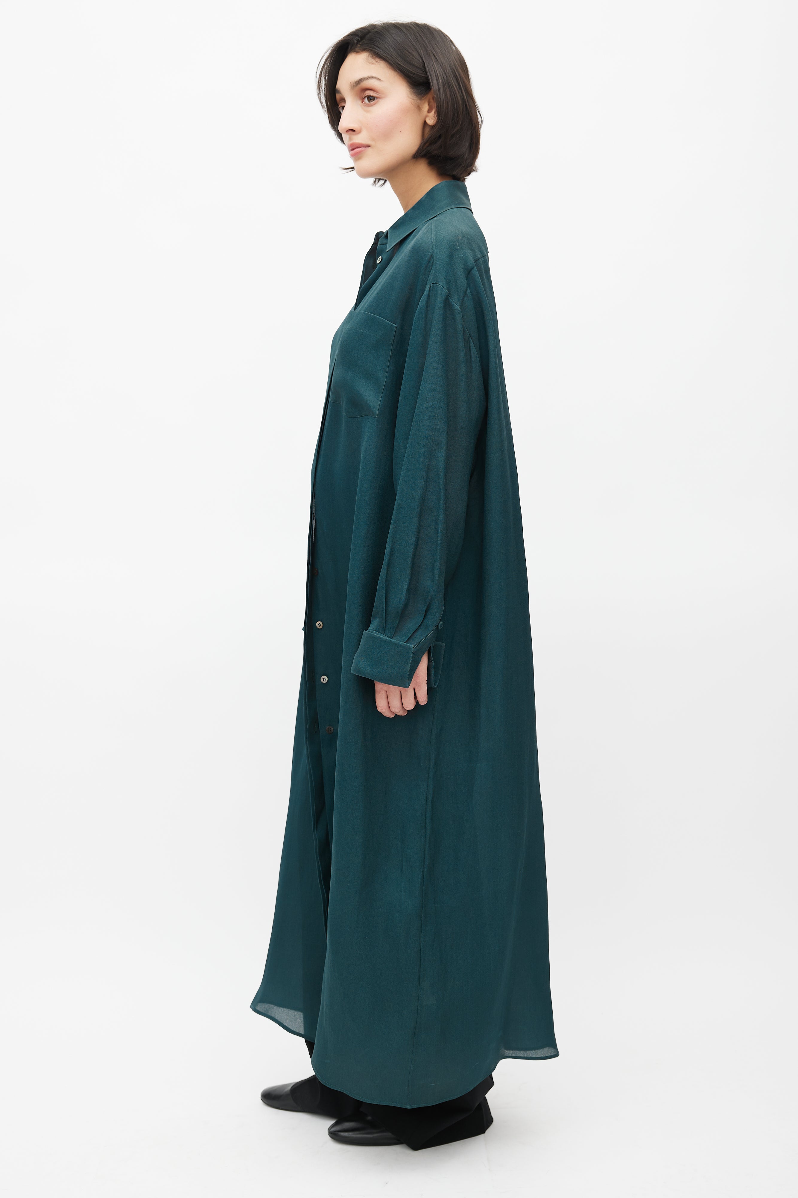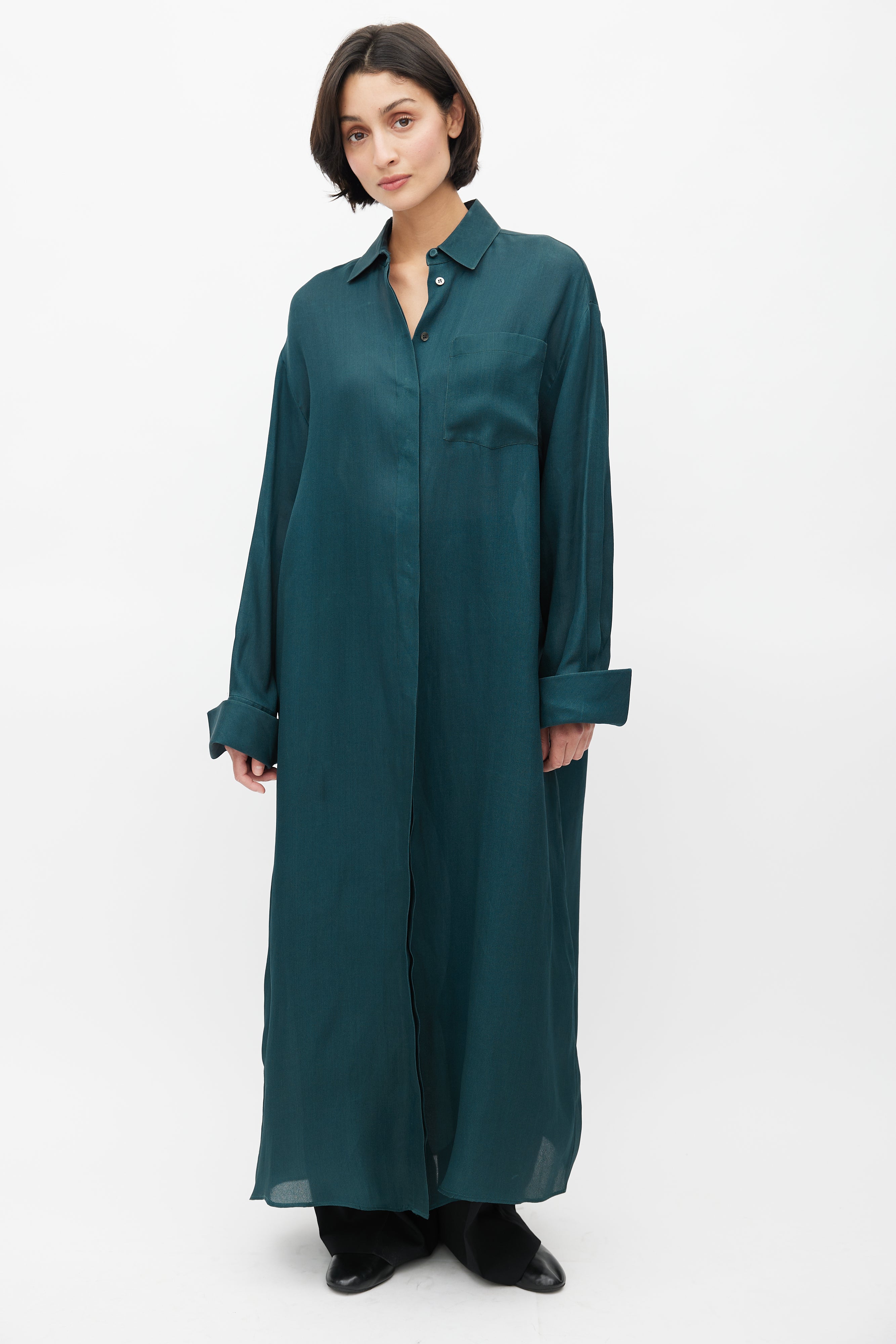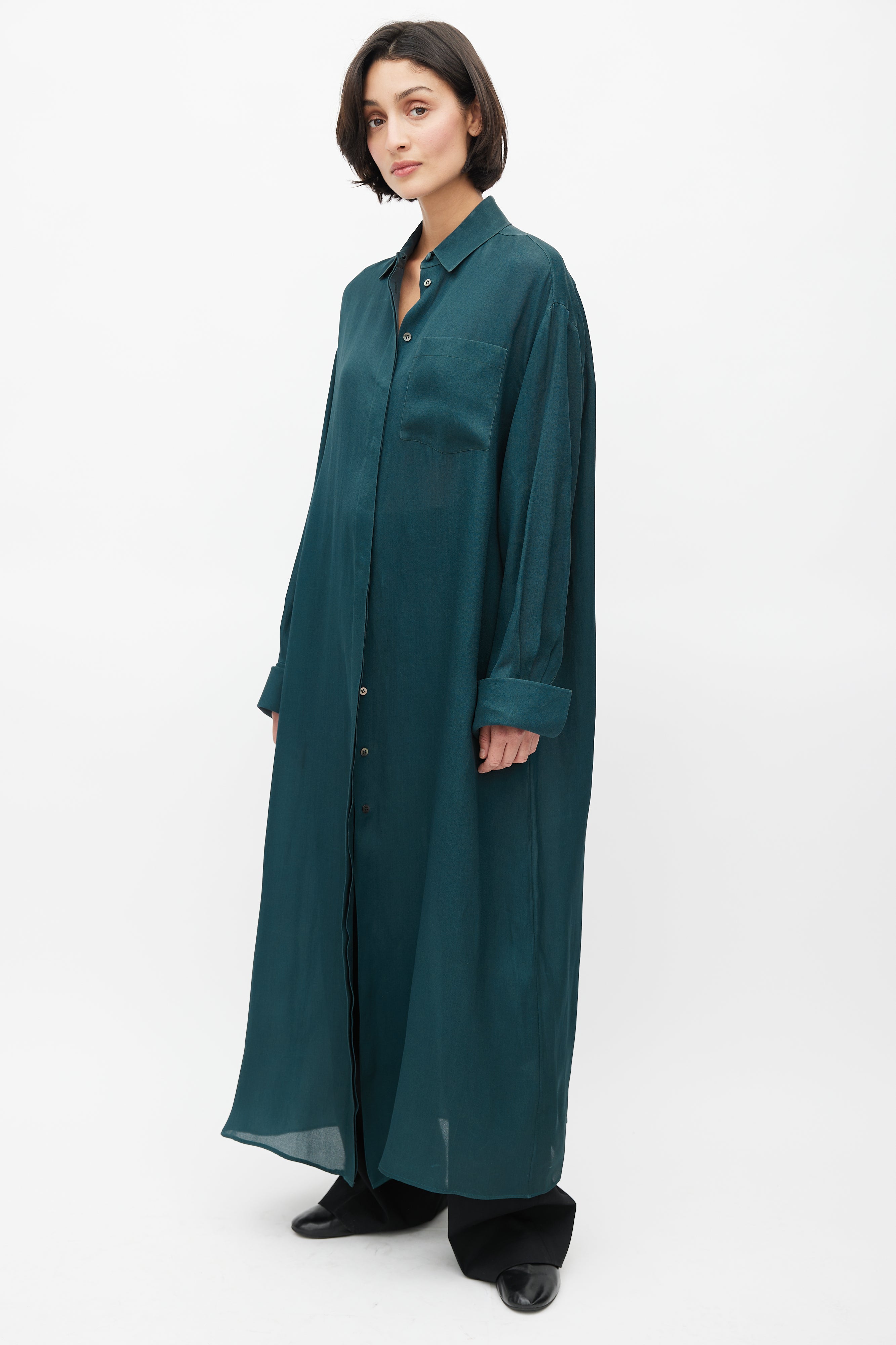 Pre-owned The Row green maxi silk shirt dress featuring a pointed collar, long sleeves with french cuffs, one patch pocket at chest, and button up front.