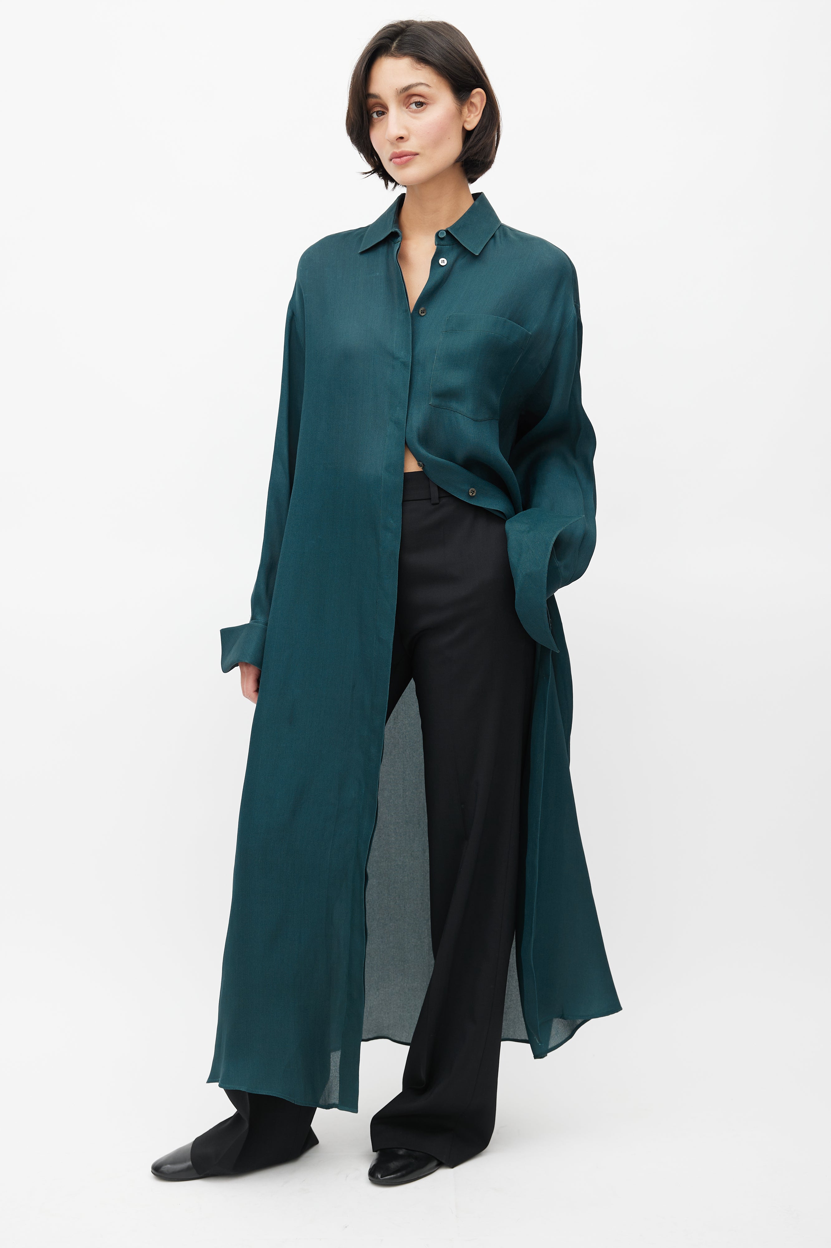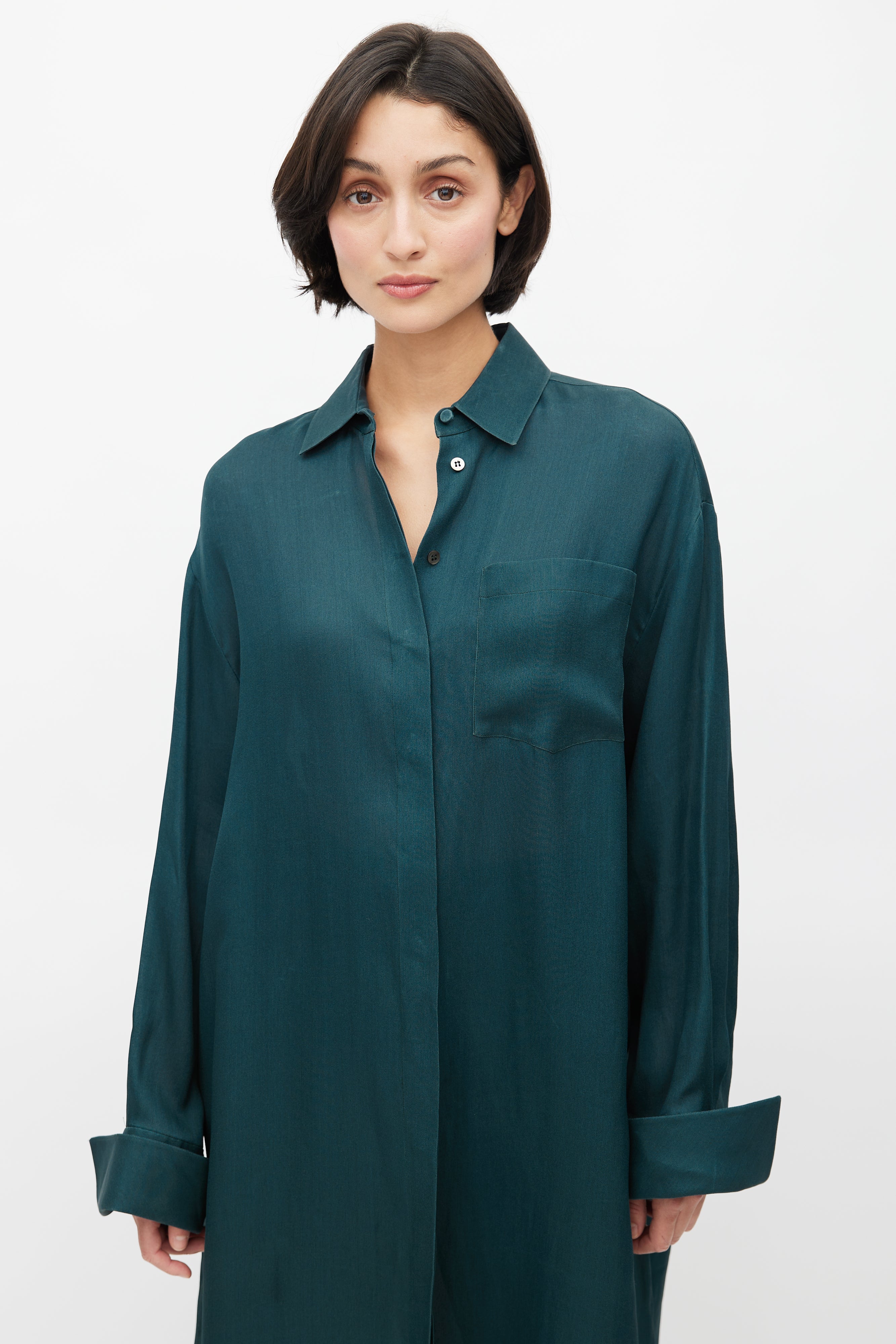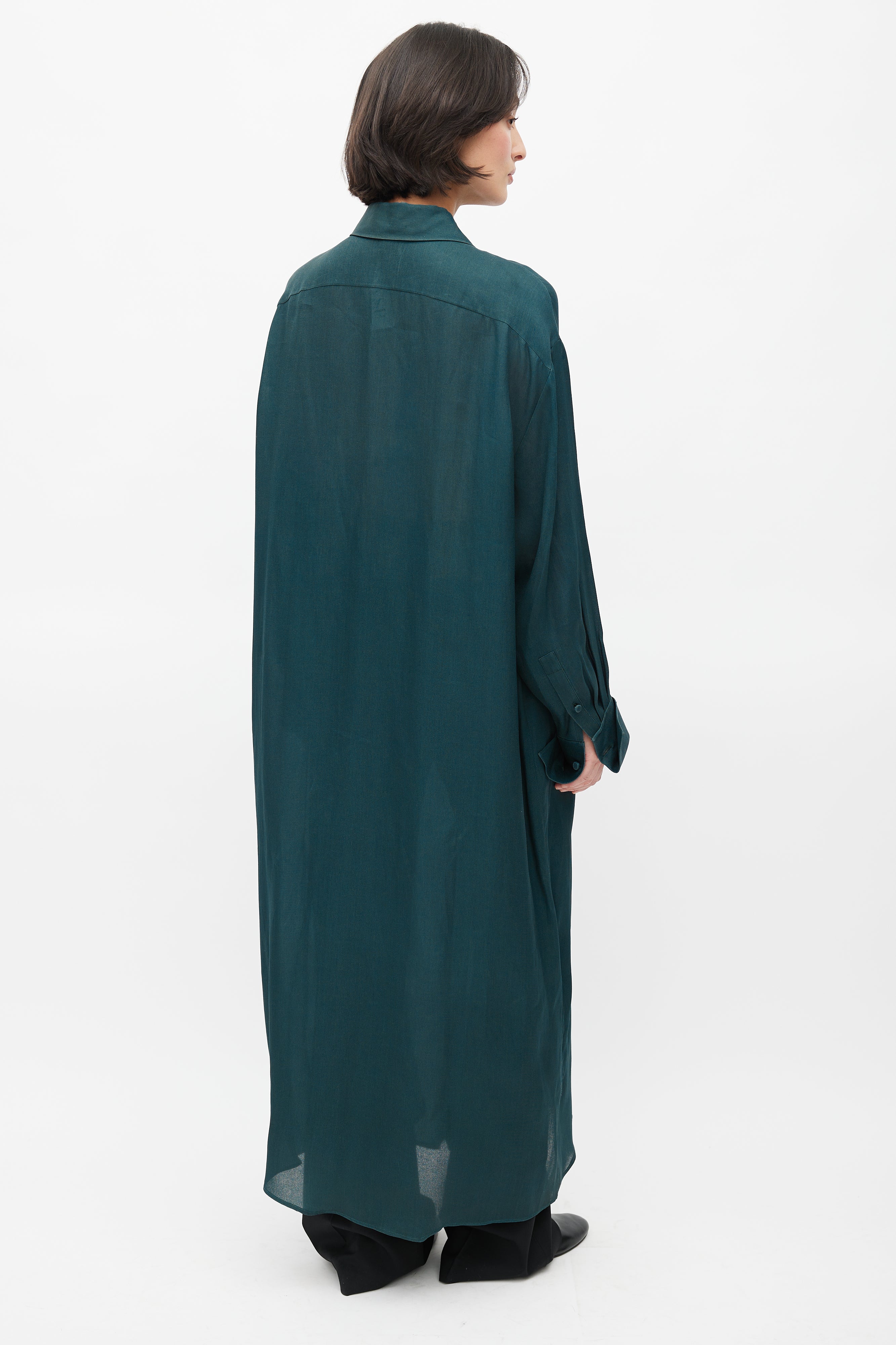 Pre-owned The Row green maxi silk shirt dress featuring a pointed collar, long sleeves with french cuffs, one patch pocket at chest, and button up front.