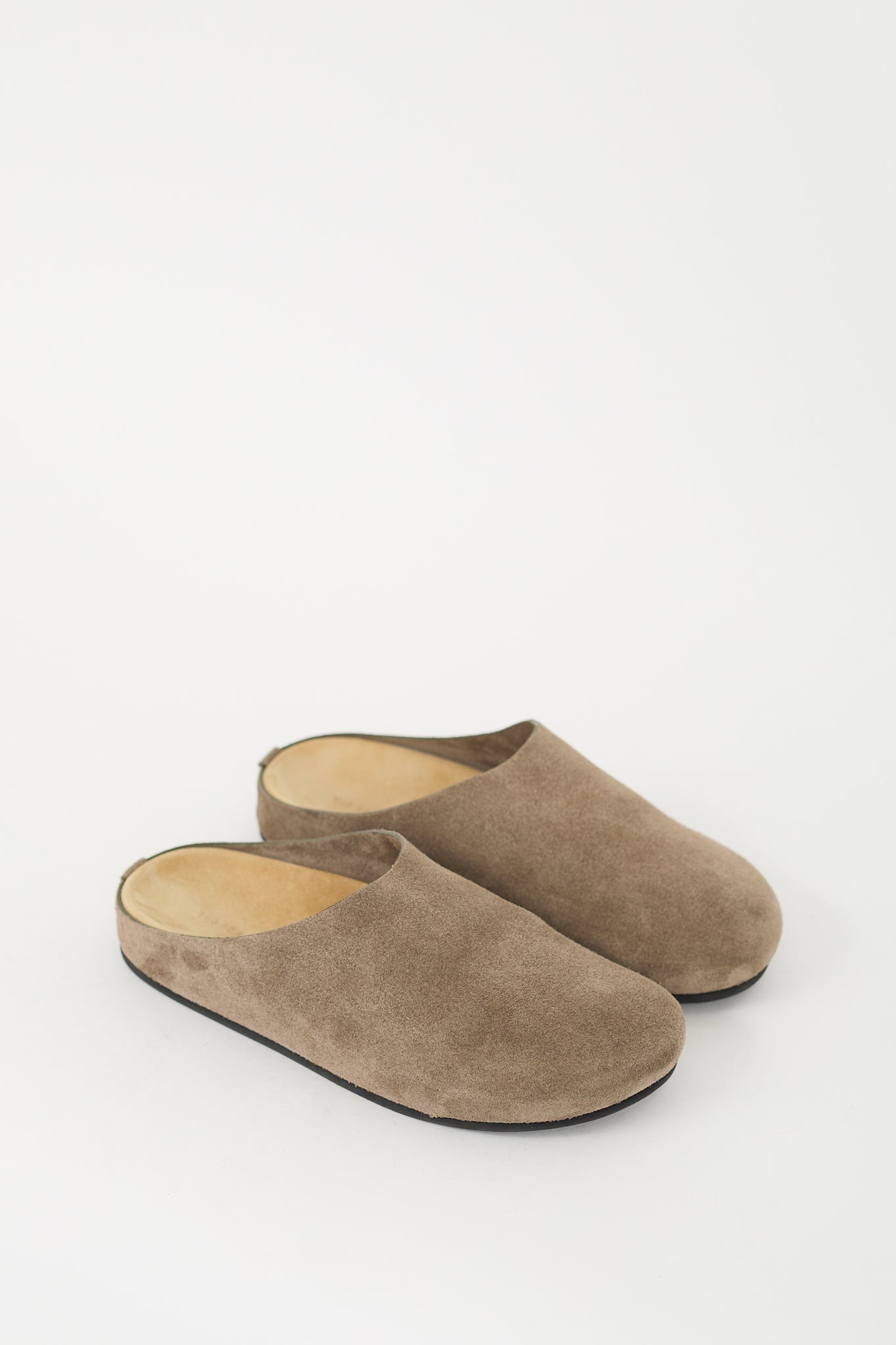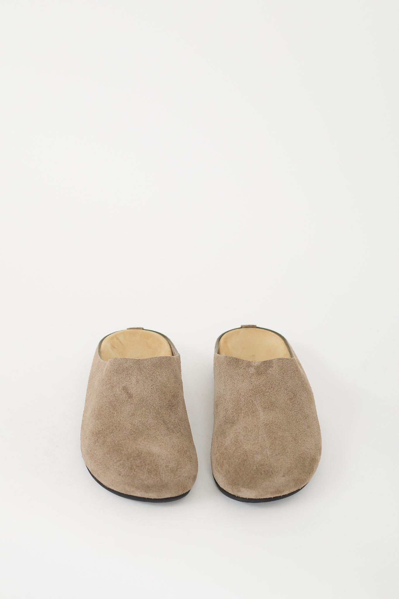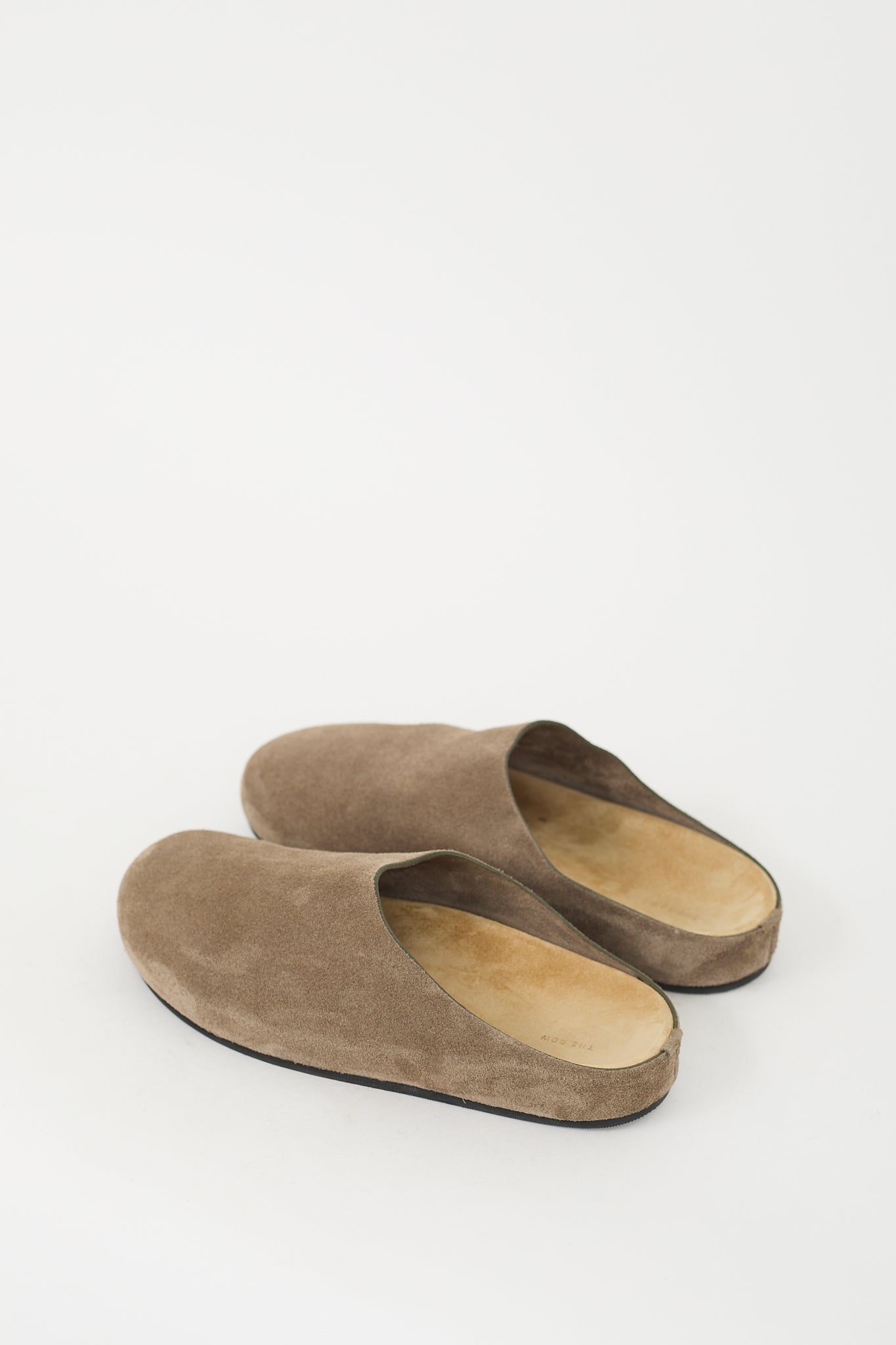 Pre-owned The Row taupe suede mules featuring rounded toe, suede upper, rubber outsole and slip on entry.