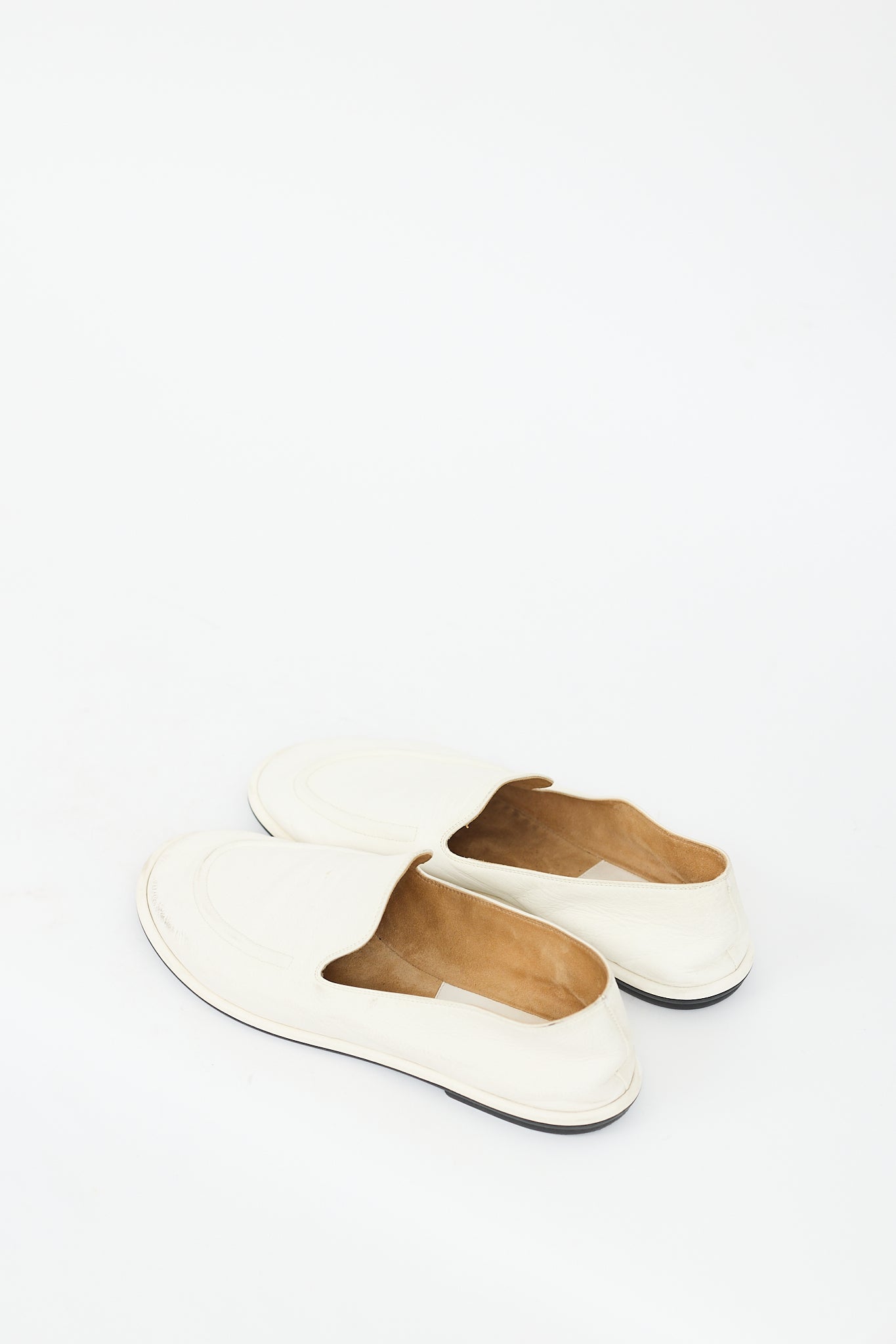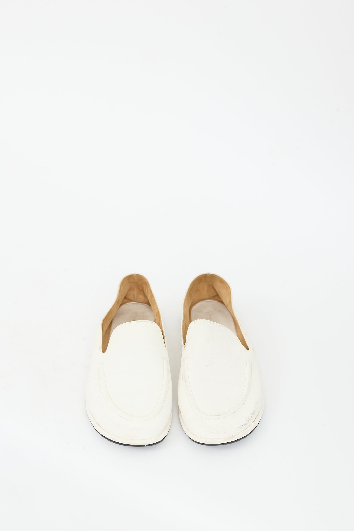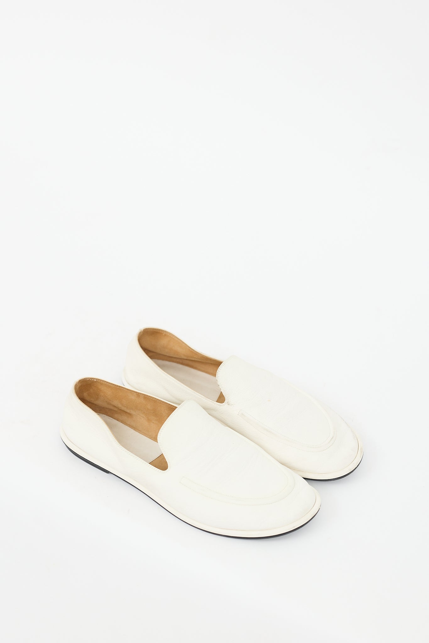 Pre-owned The Row white leather Canal loafers featuring rounded toe, piping at front, slip on entry, and suede lining.
