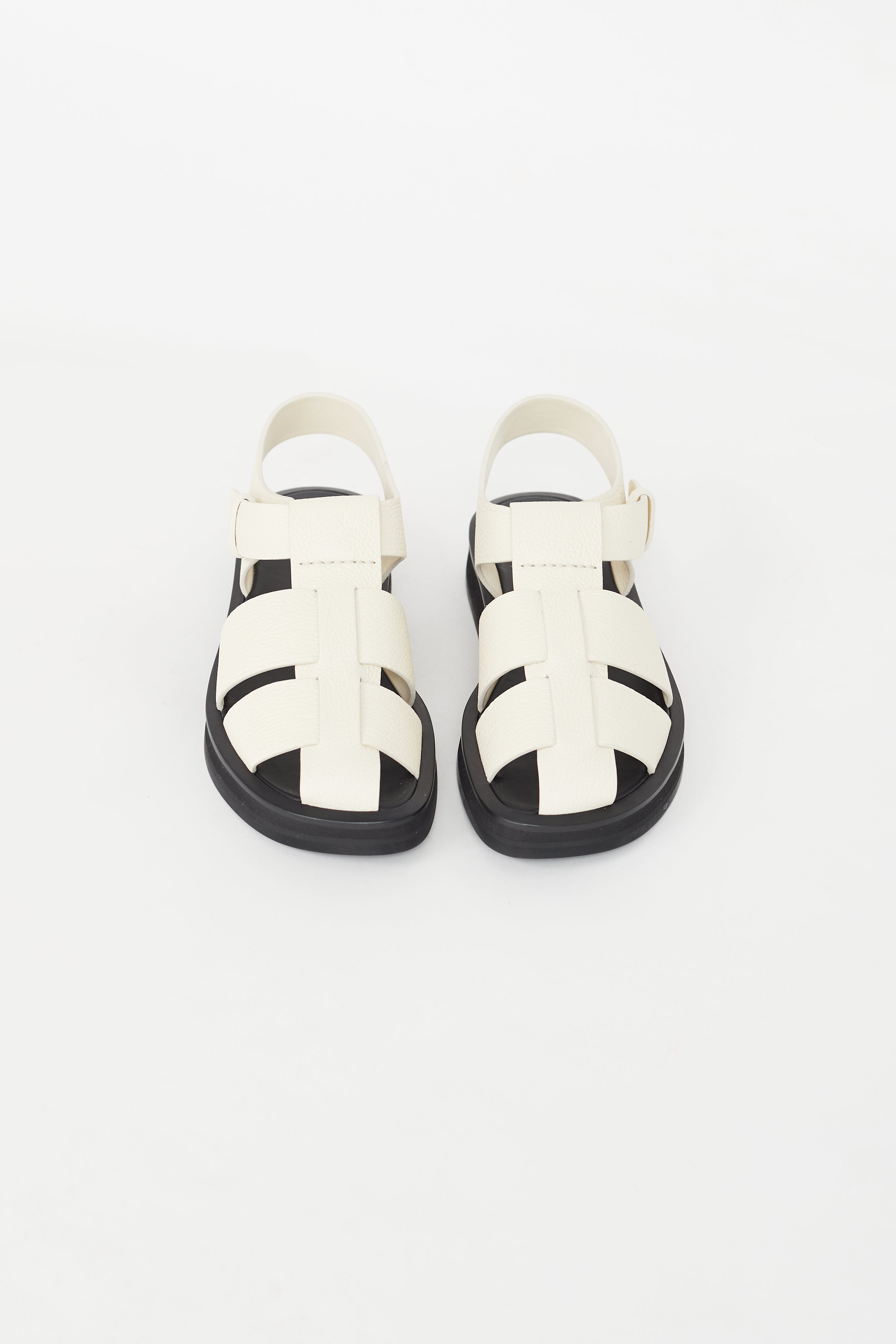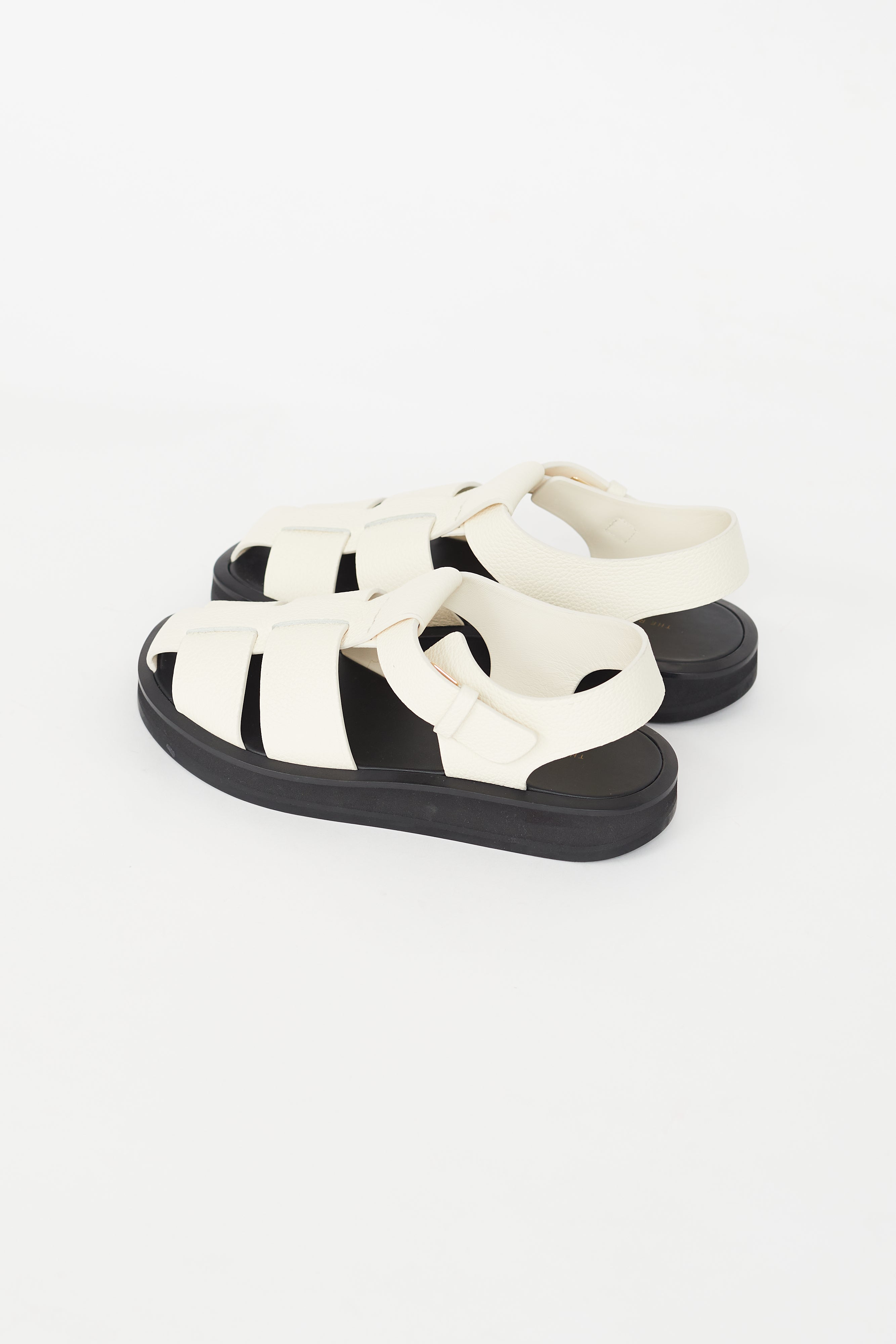 Pre-owned The Row white Fisherman sandals featuring rounded toe, caged strap detail and ankle strap with concealed buckle fastening. Comes with original dust bag and box.