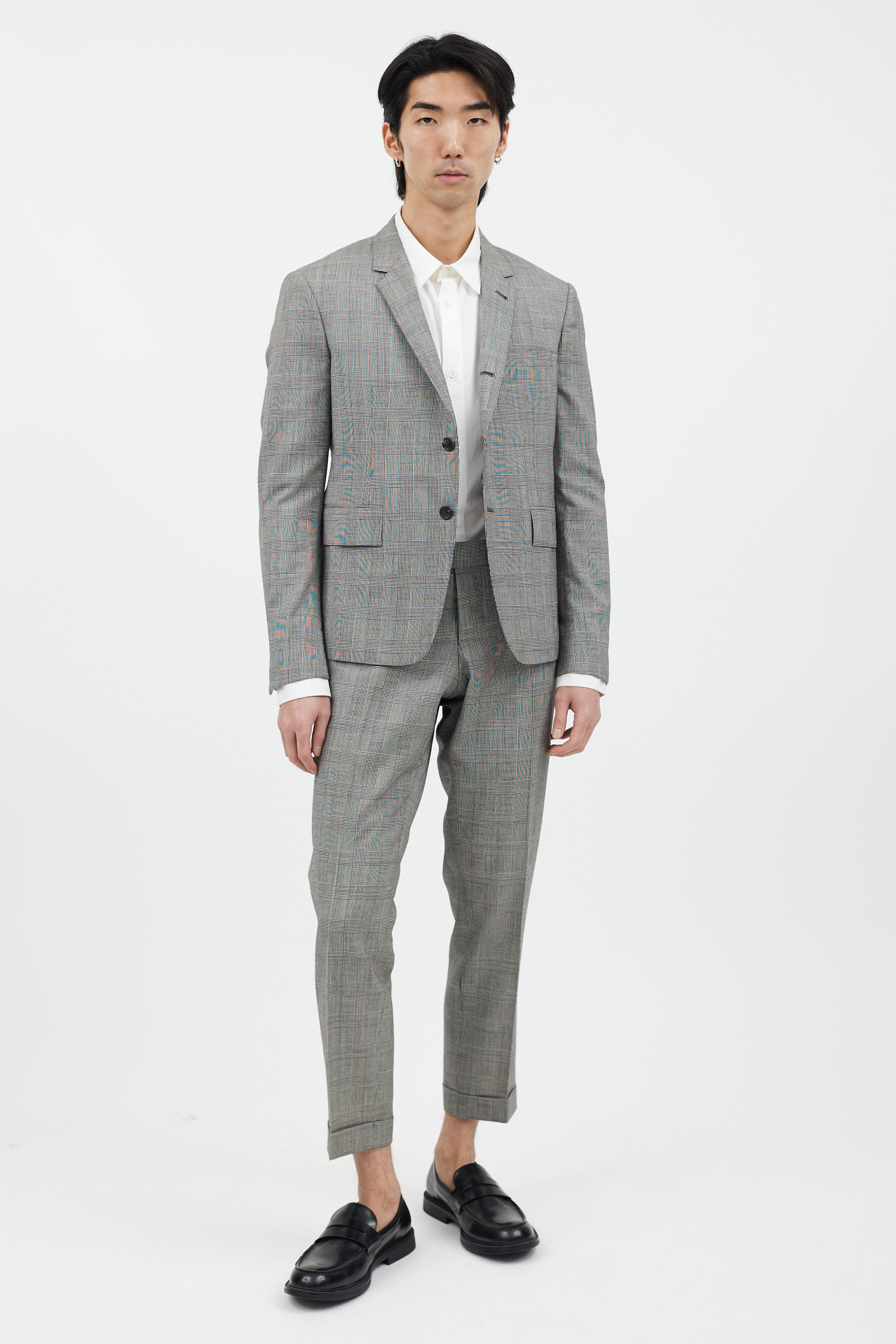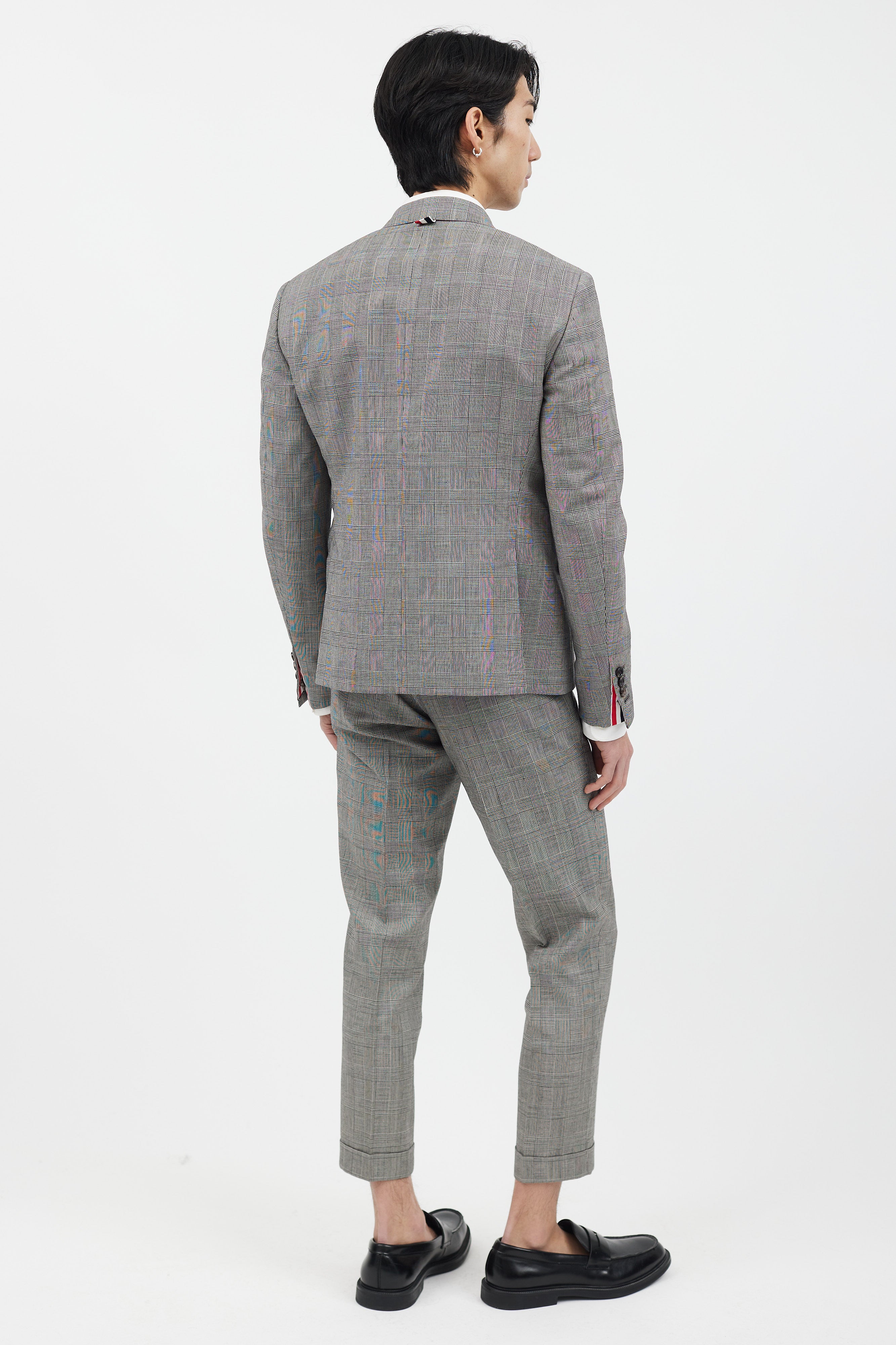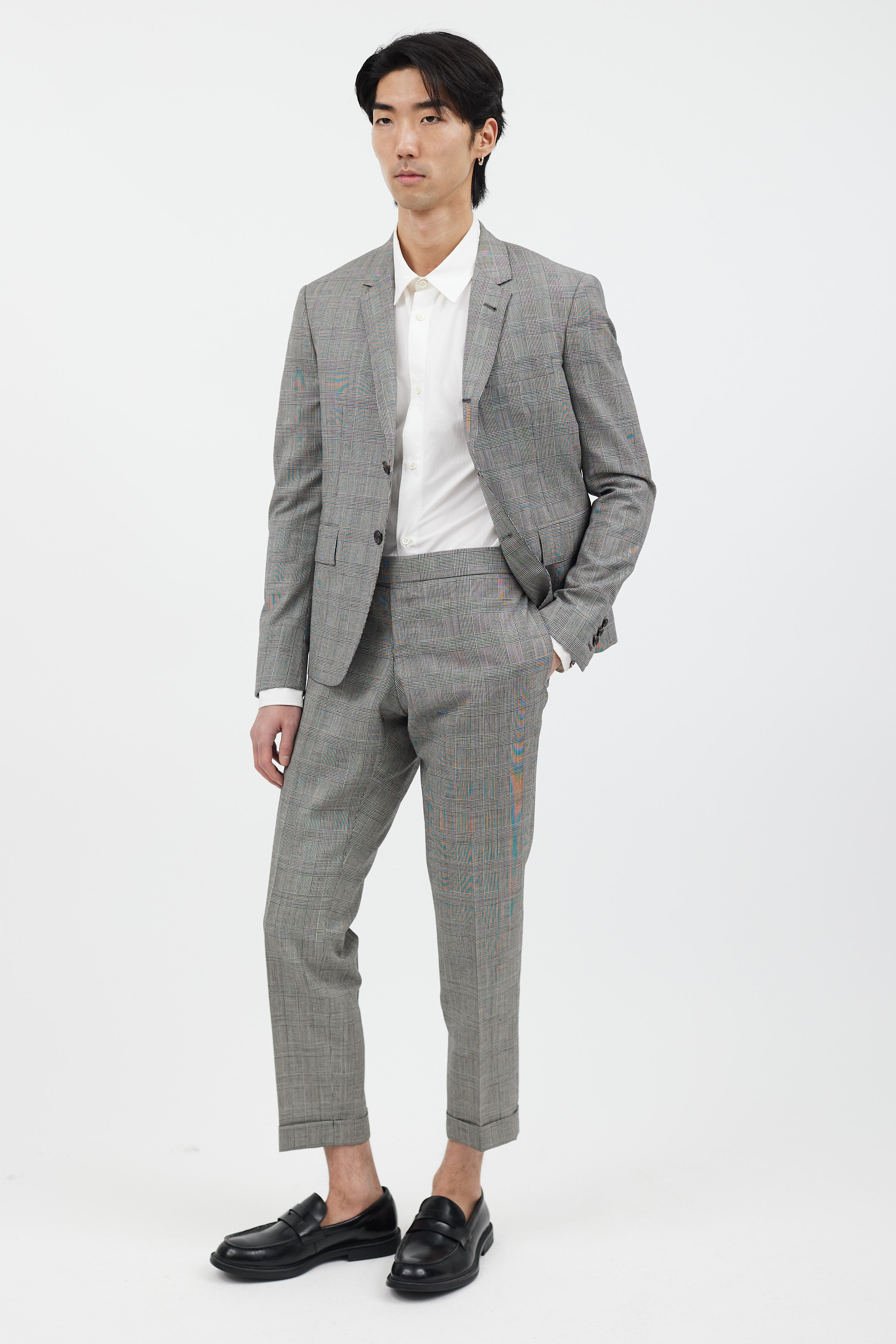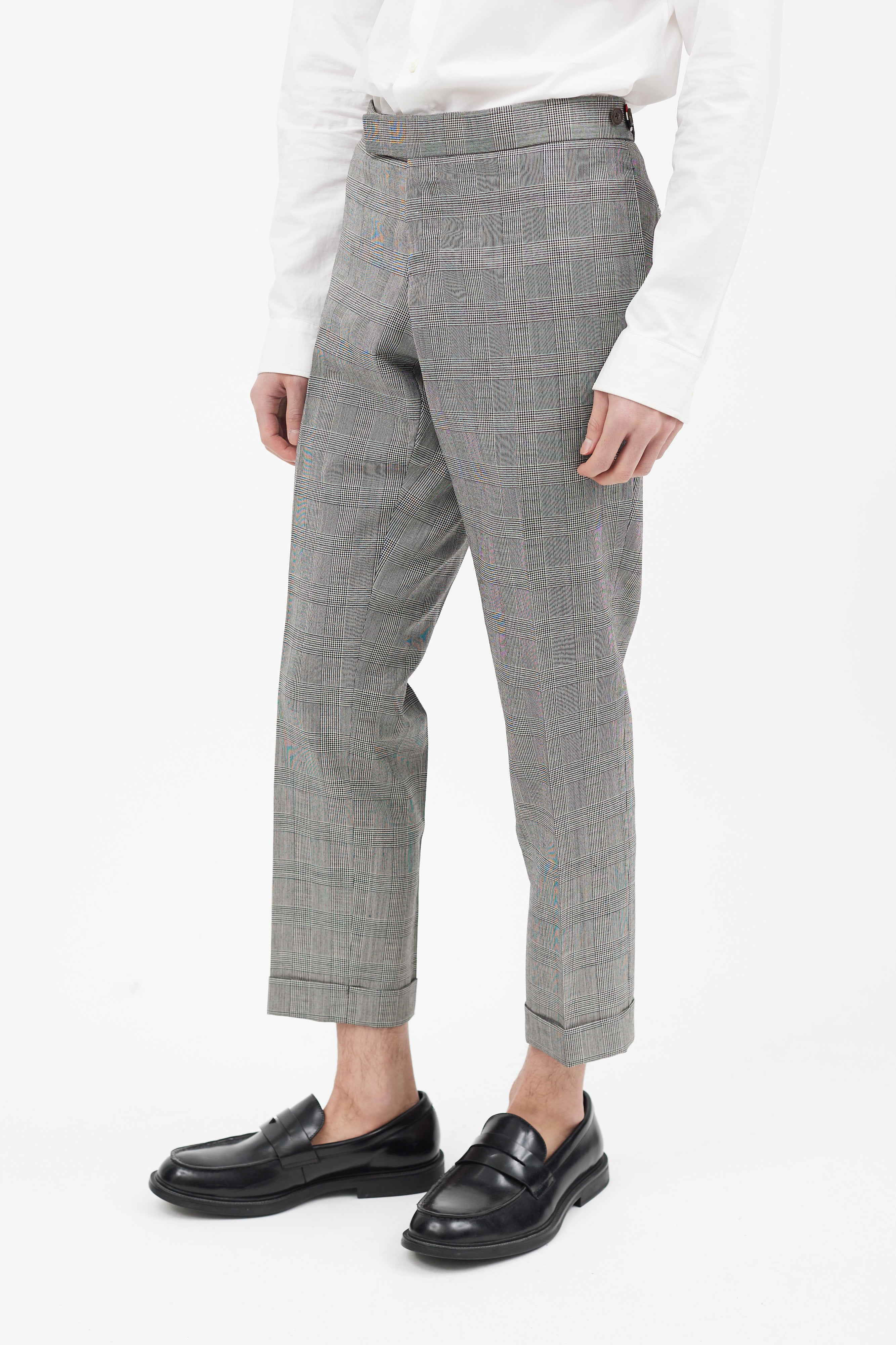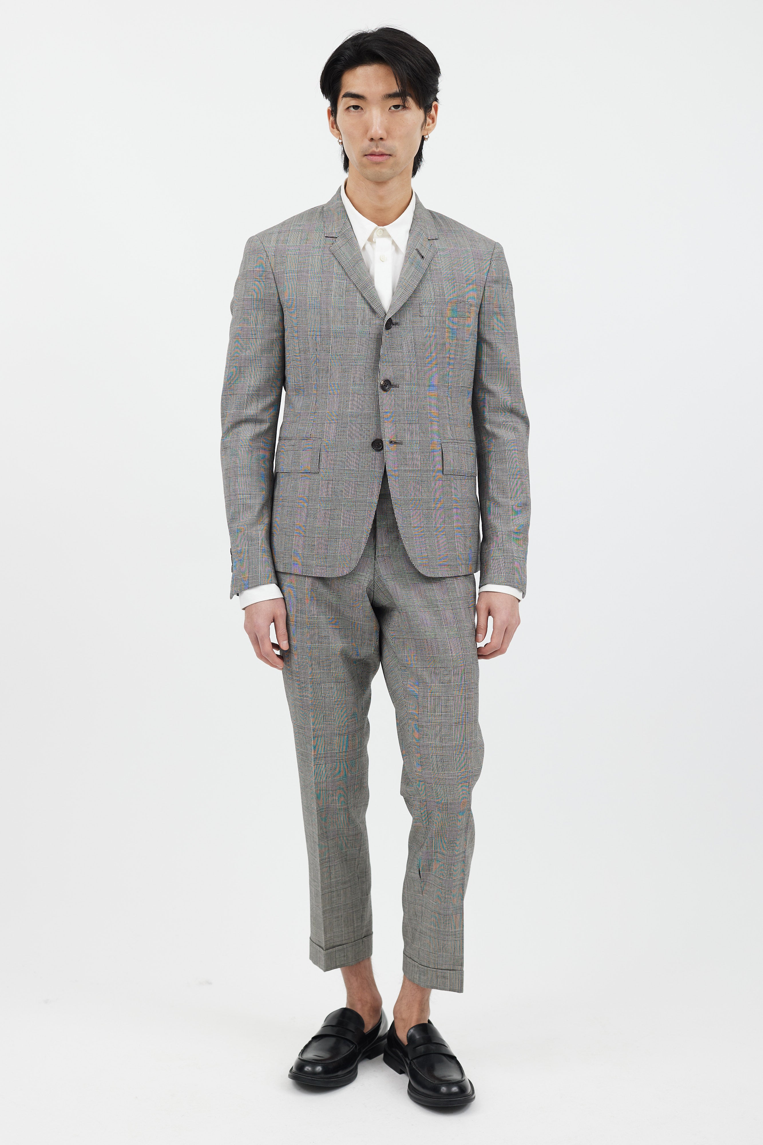 Pre-owned Thom Browne two piece featuring black and white check blazer with two patch pockets at hip, button closure at front, and buttons at cuff, and matching cropped length trouser with cuffed hem, button up fly, and two slip pockets at hip. Clipped to fit model.