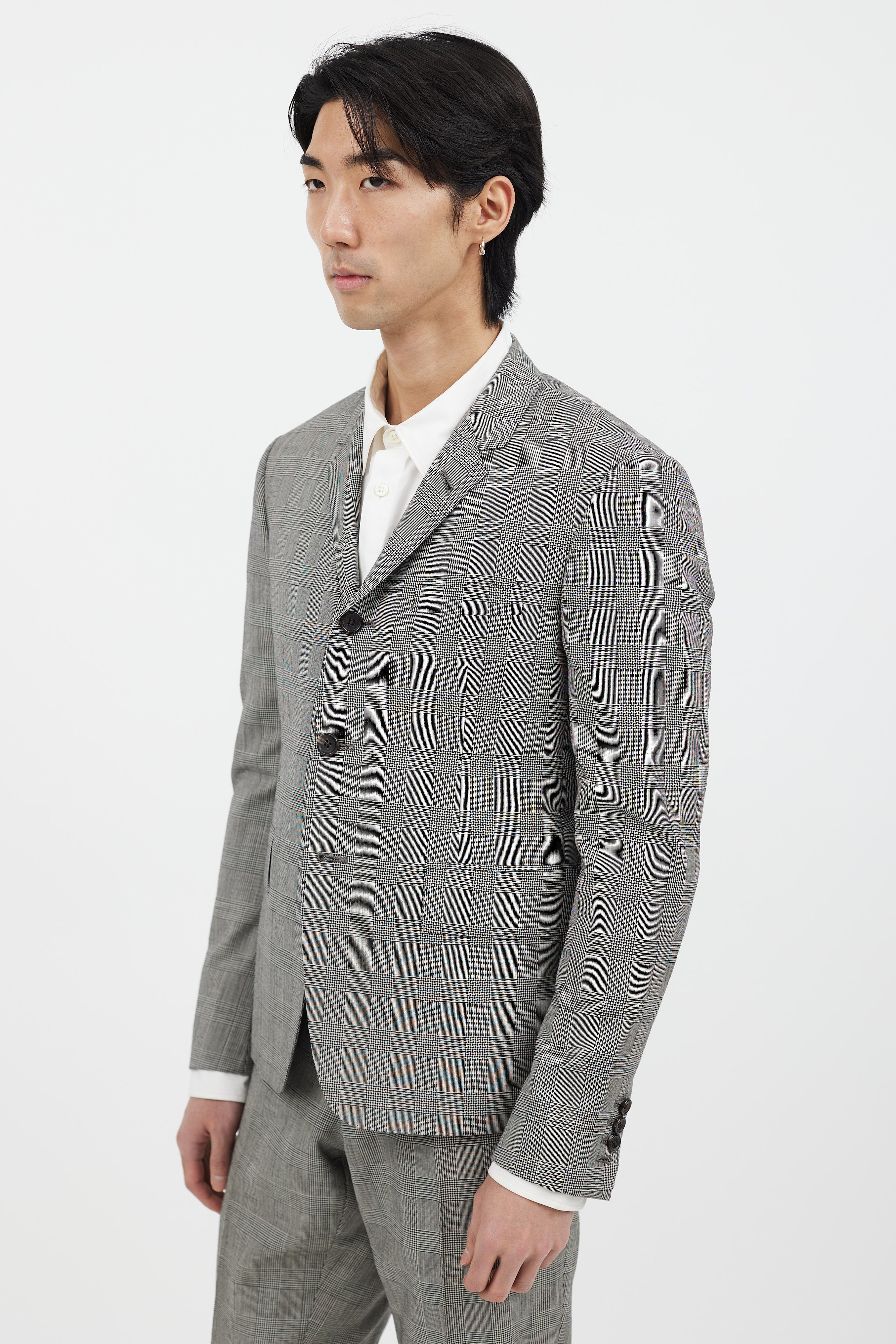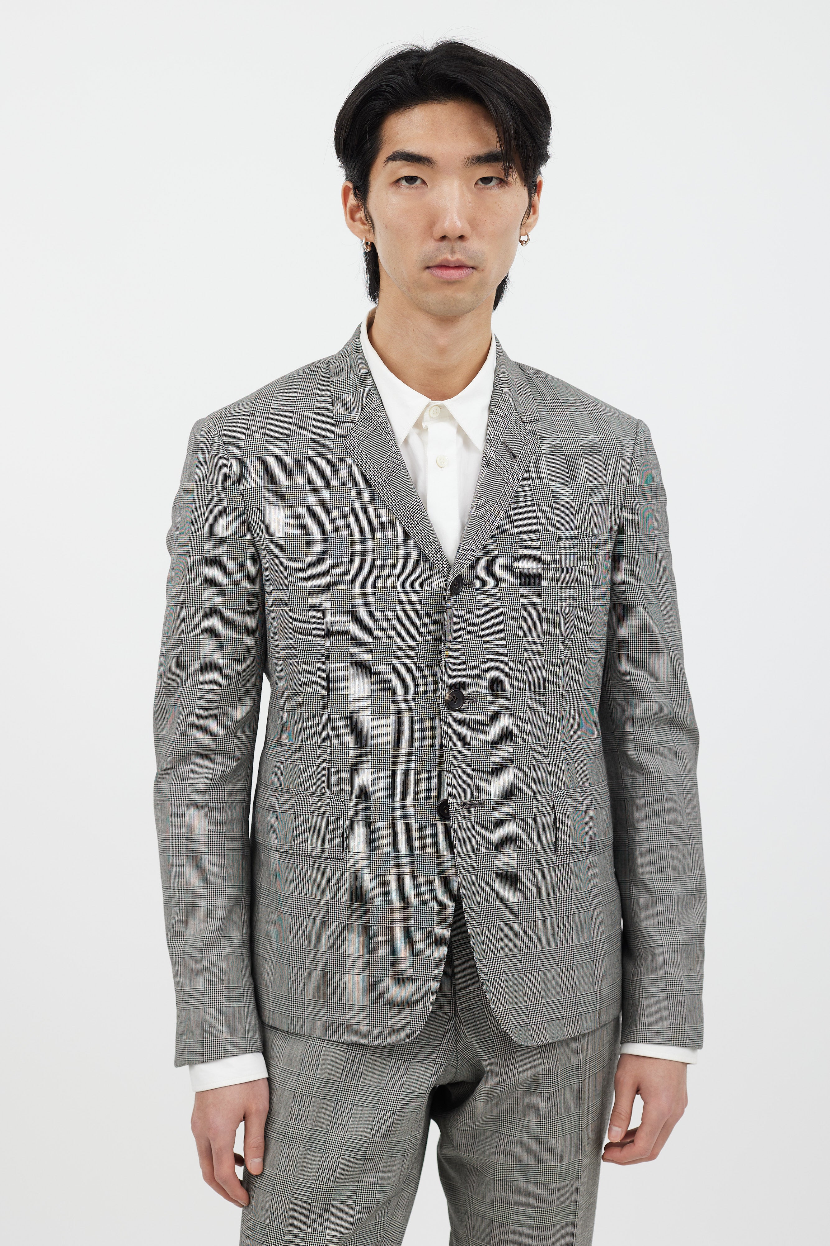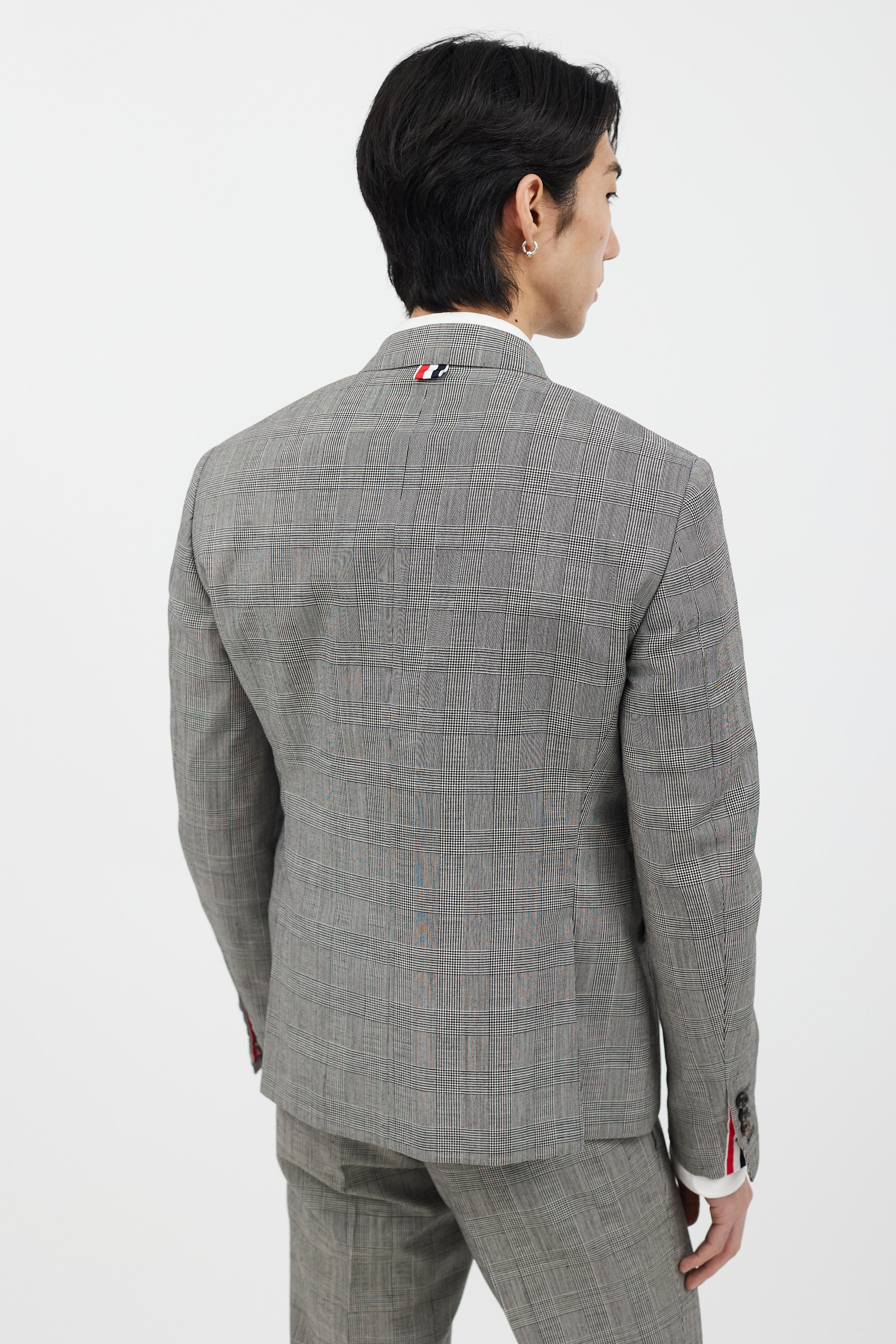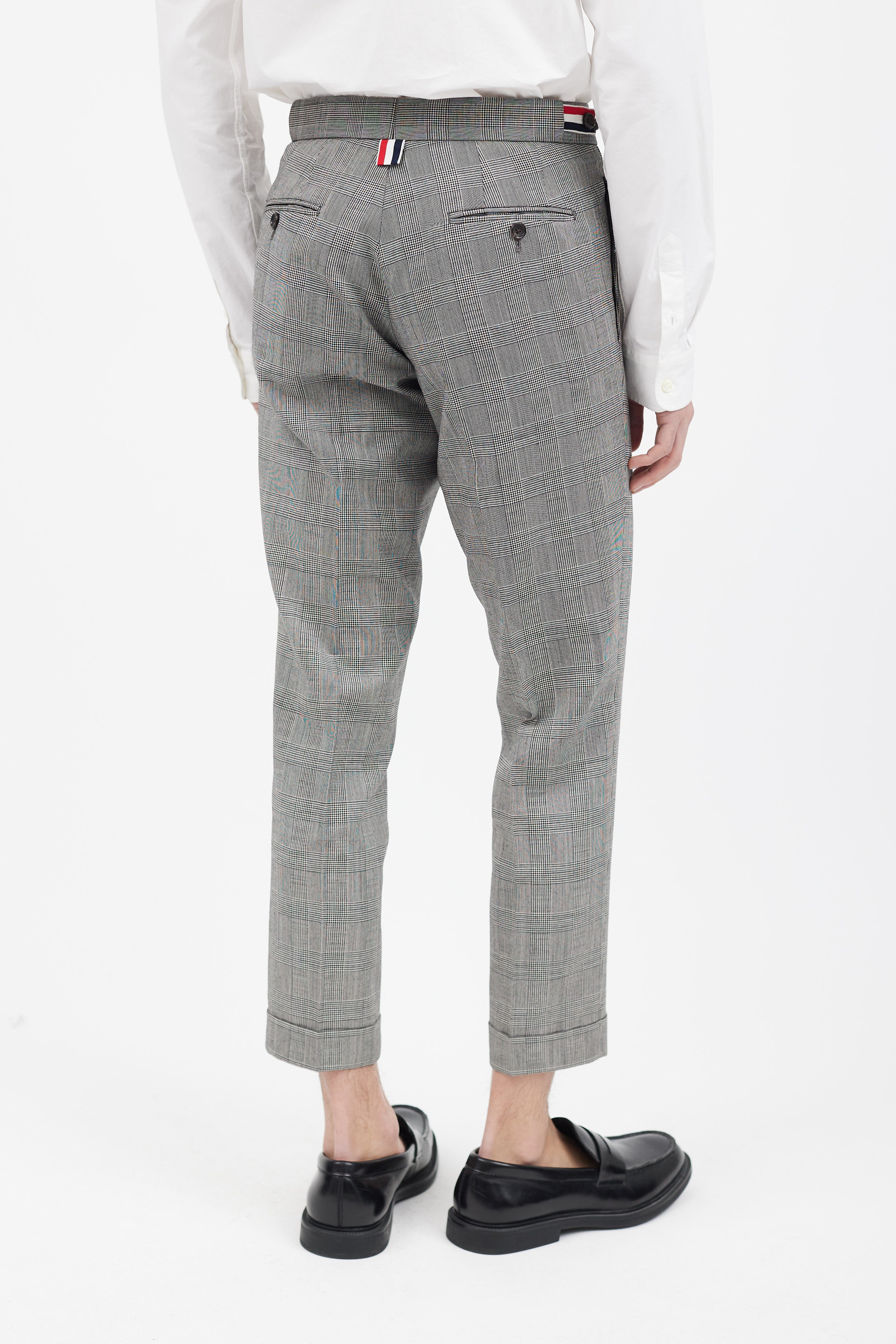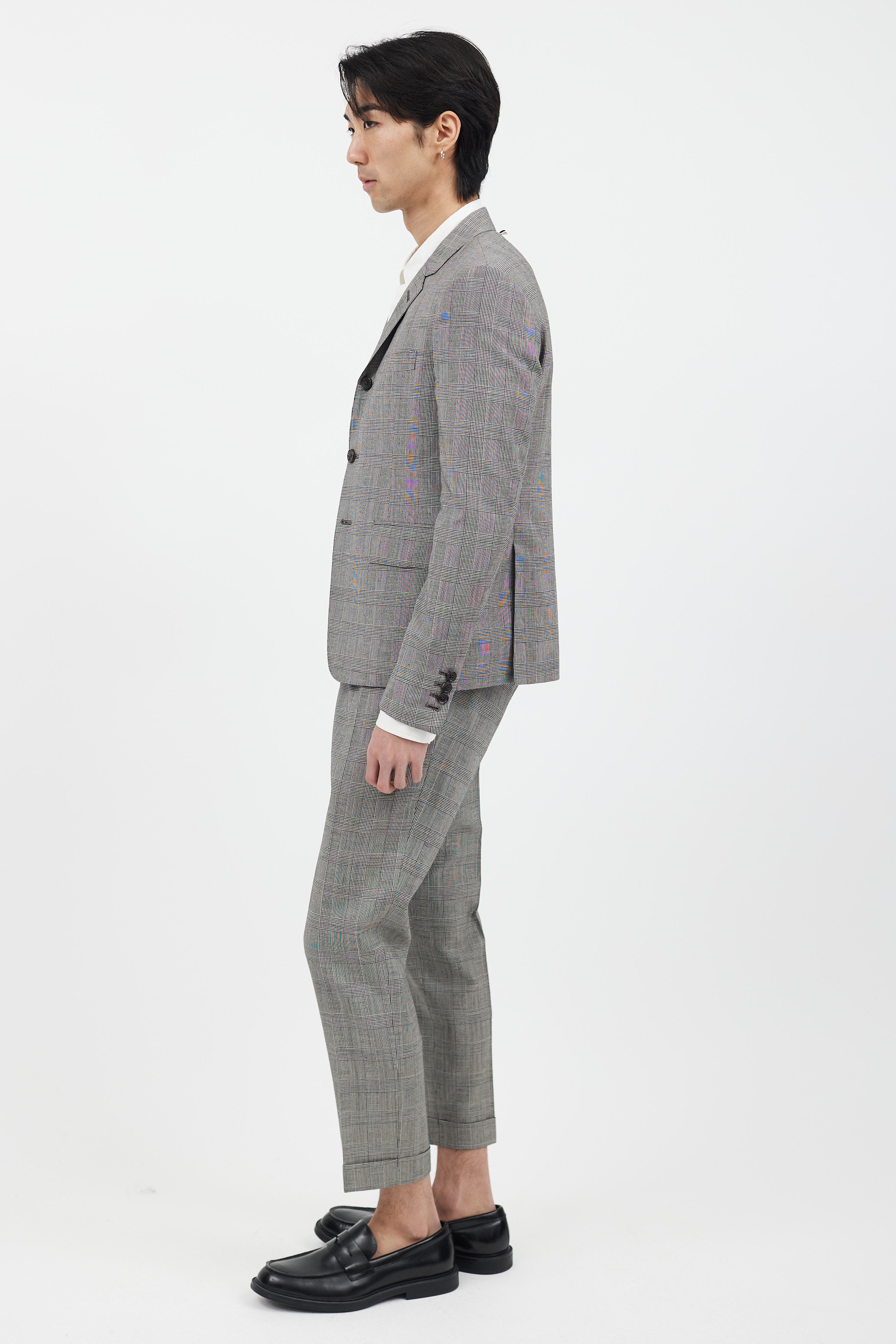 Pre-owned Thom Browne two piece featuring black and white check blazer with two patch pockets at hip, button closure at front, and buttons at cuff, and matching cropped length trouser with cuffed hem, button up fly, and two slip pockets at hip. Clipped to fit model.