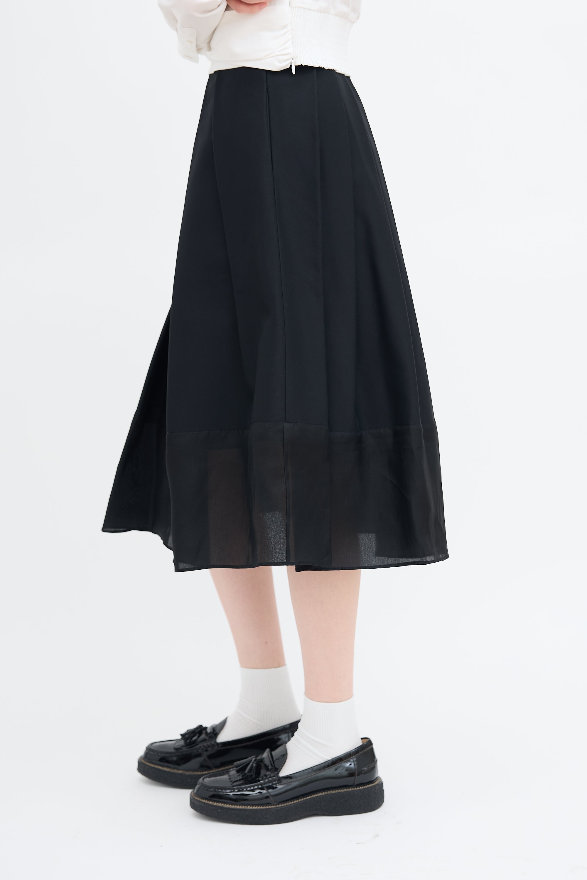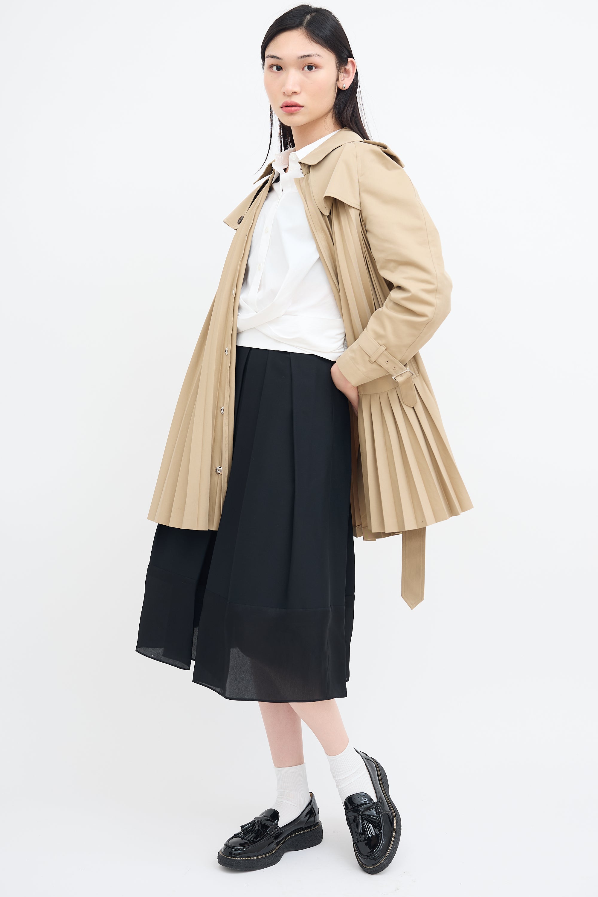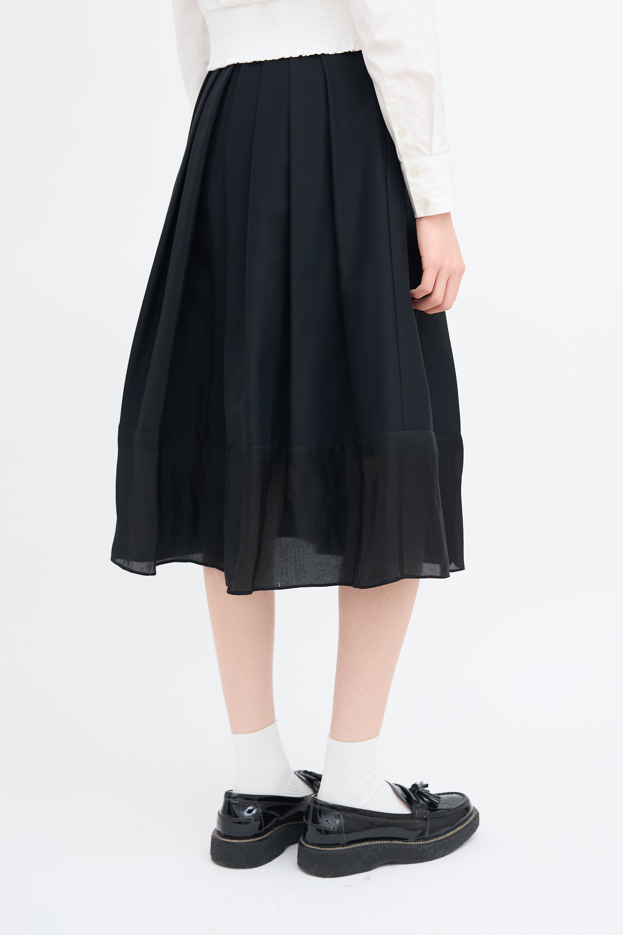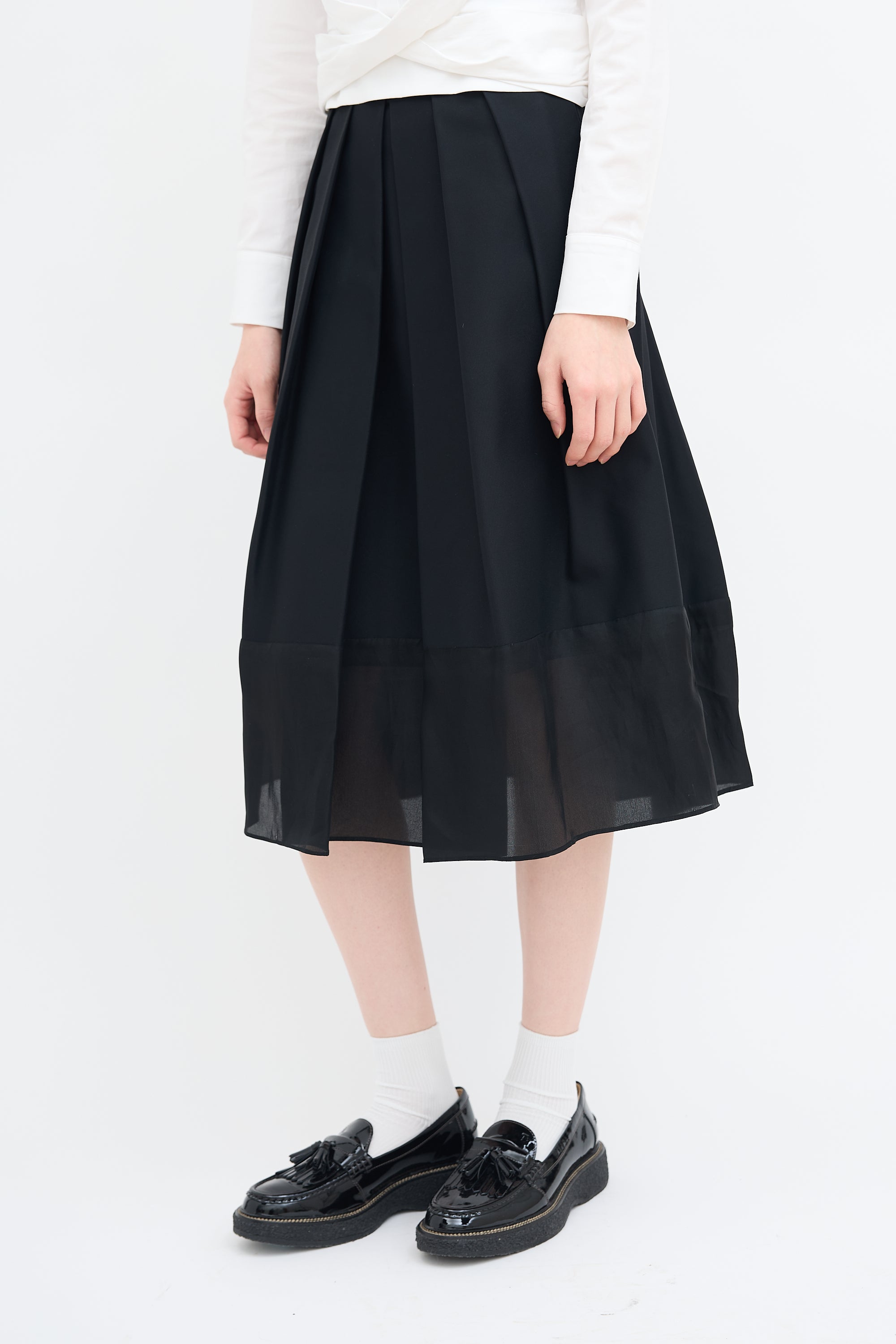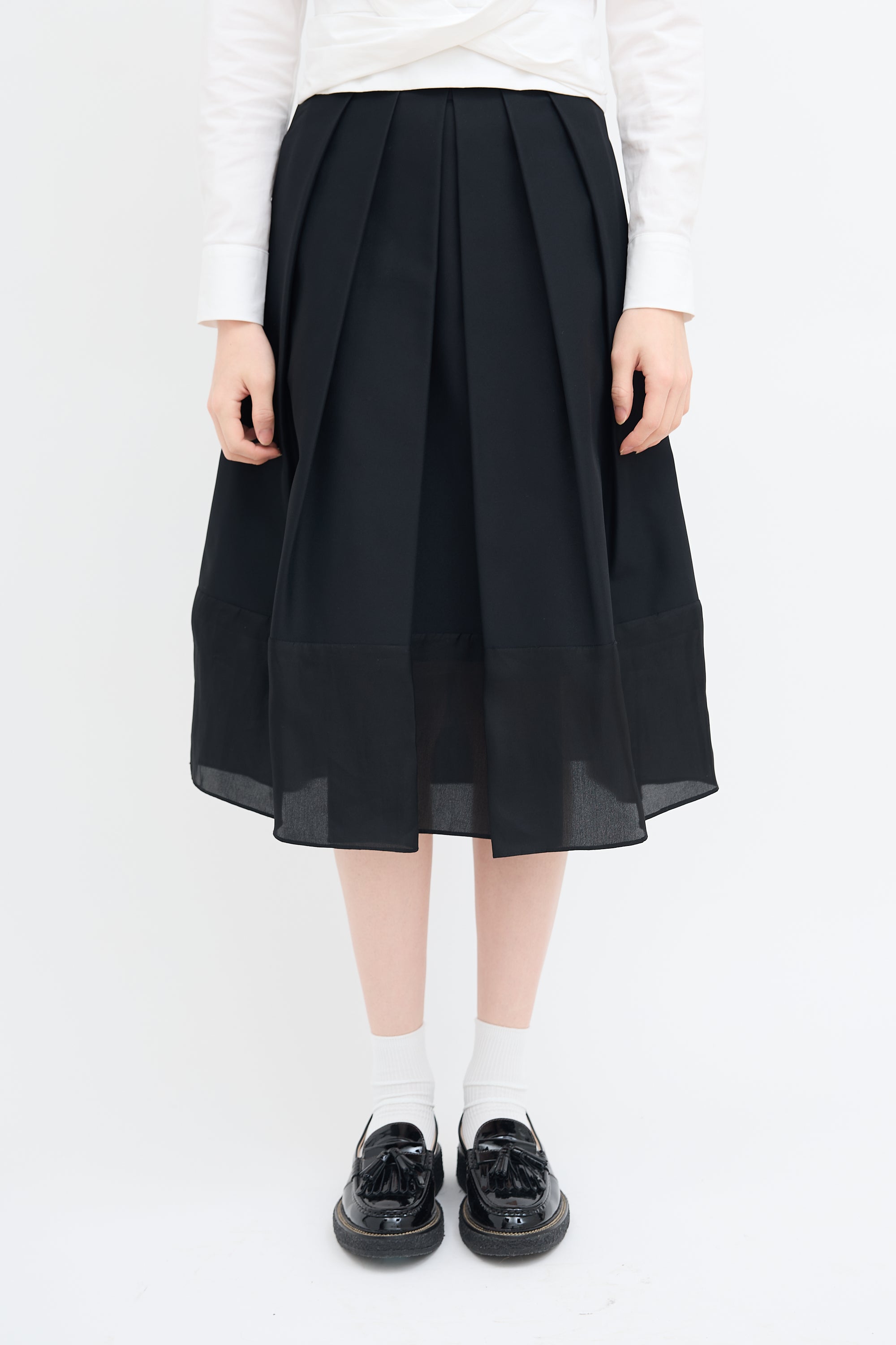 Pre-owned Tibi black pleated midi skirt featuring back zip closure with hook and eye fastening, two inseam pockets at hips, and sheer silk hem.