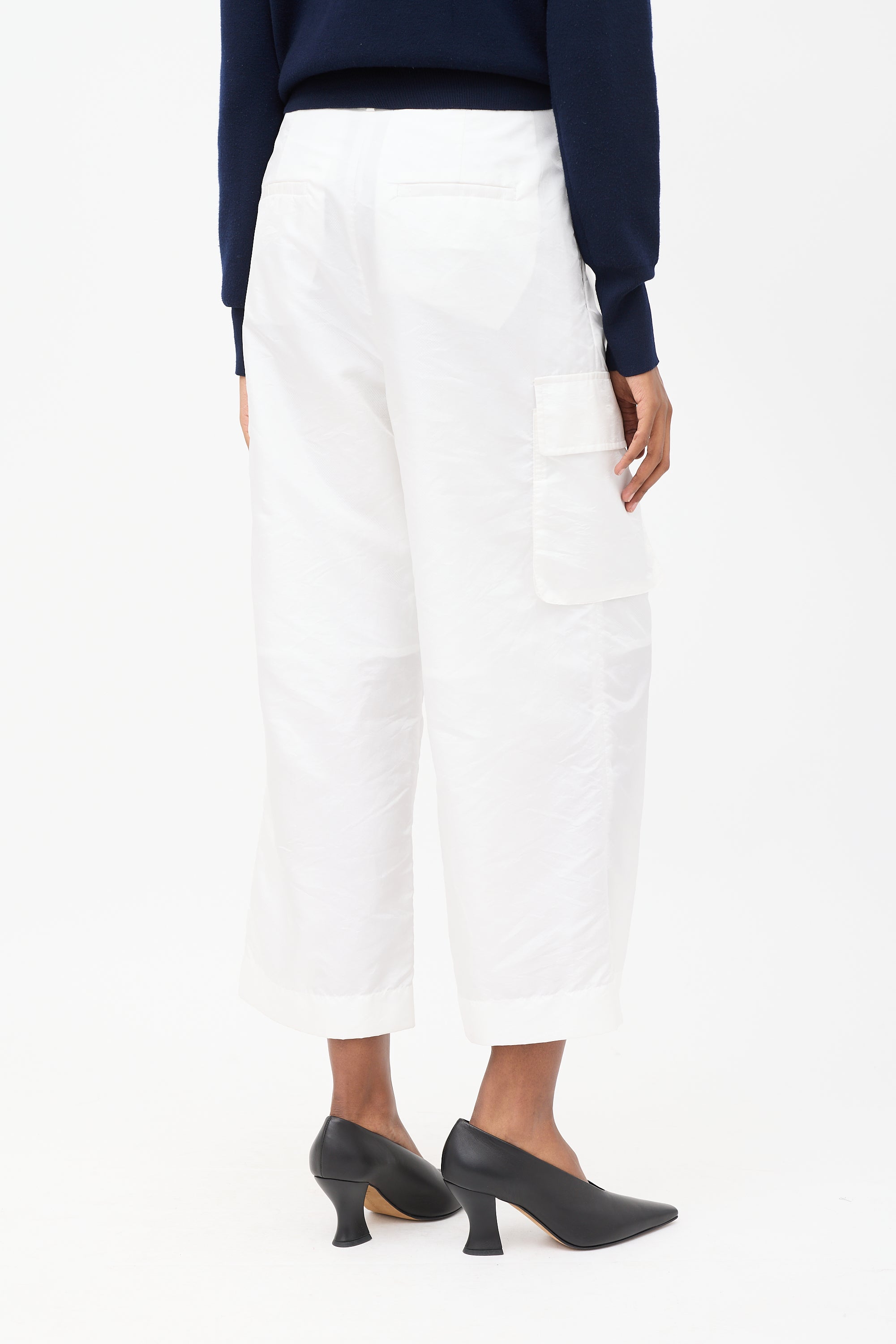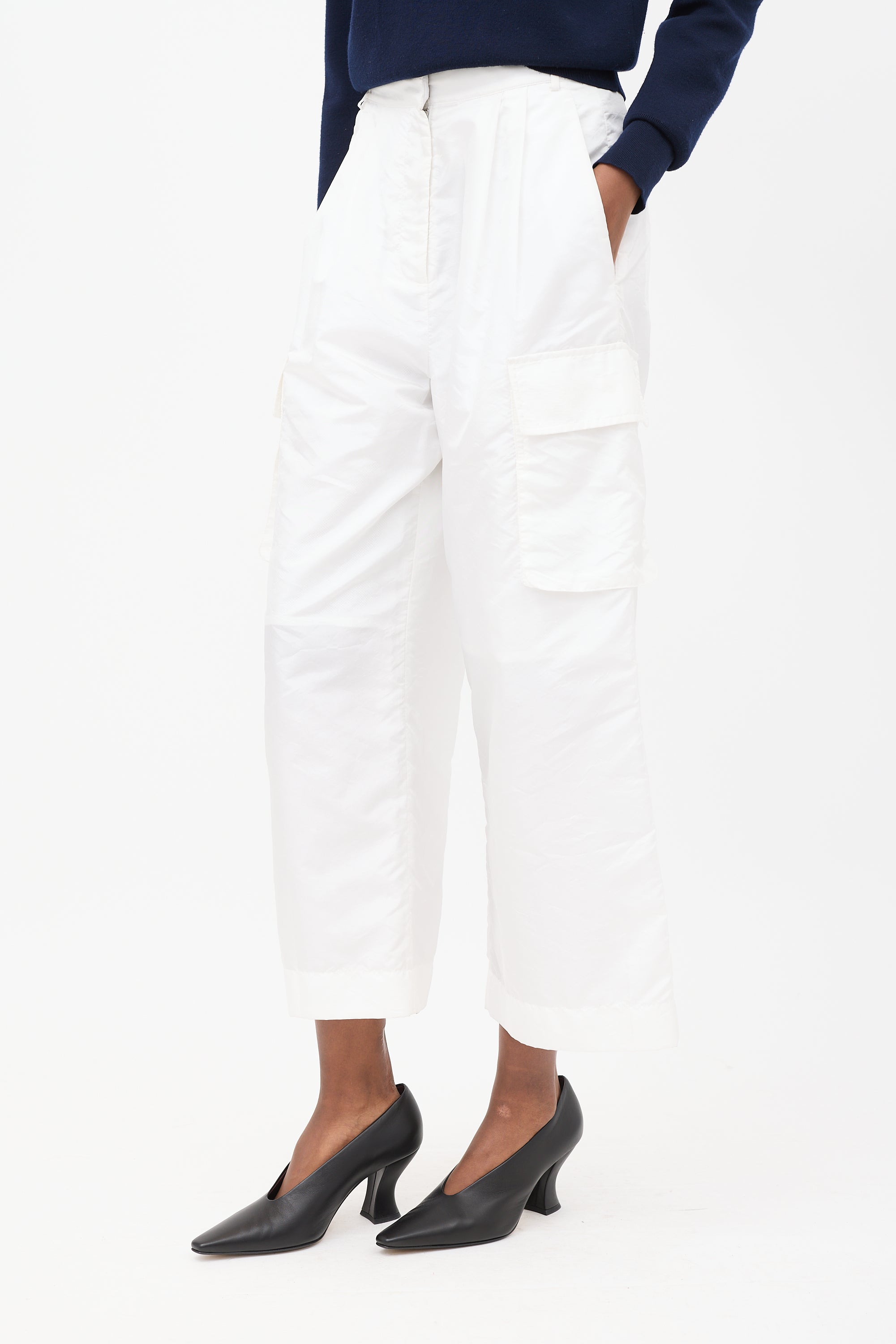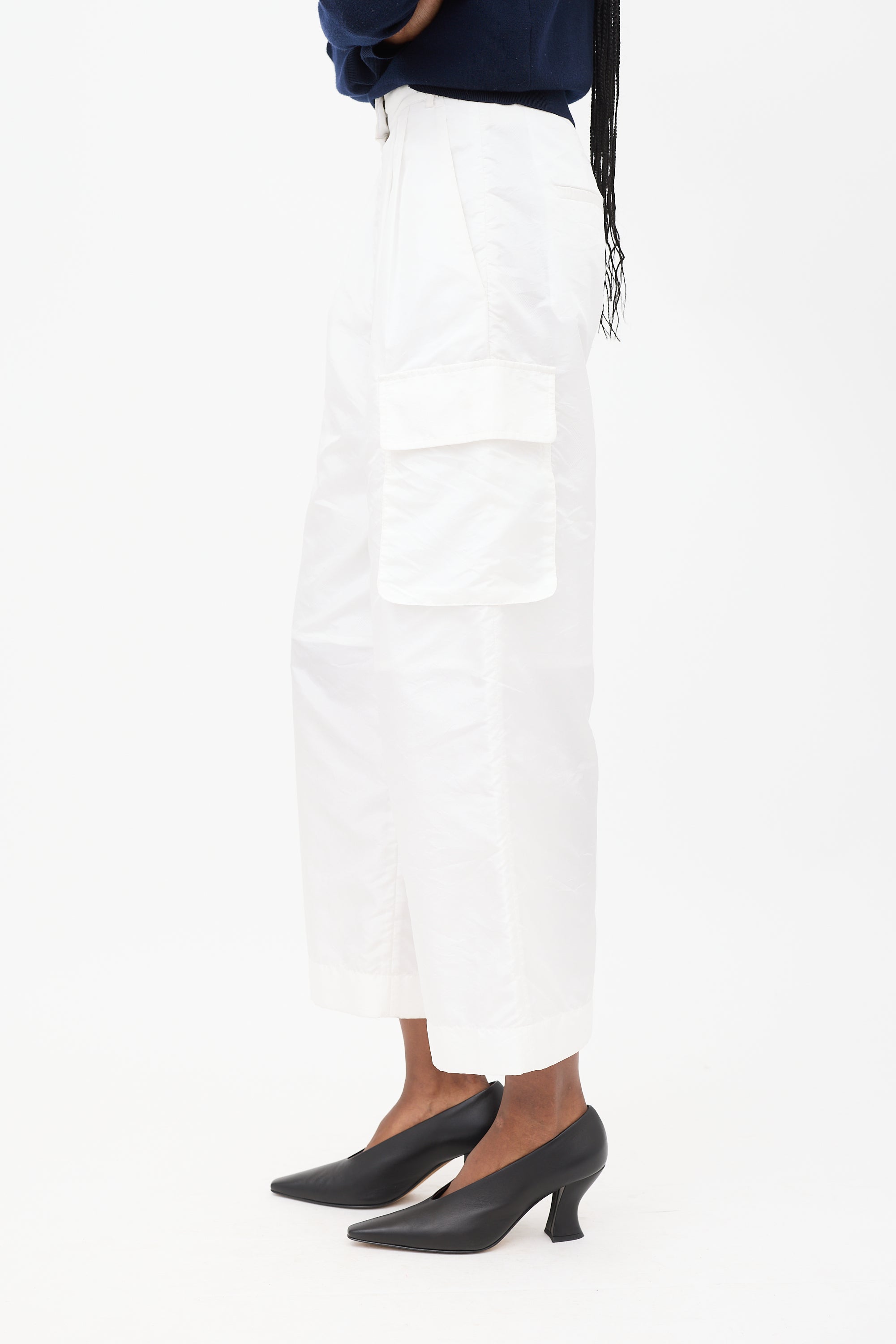 Pre-owned Tibi white nylon blend cargo pants featuring a high pleated waist, dropped seat, wide leg, four pocket waist styling, two cargo pockets at outseam, and zip fly. Lined.