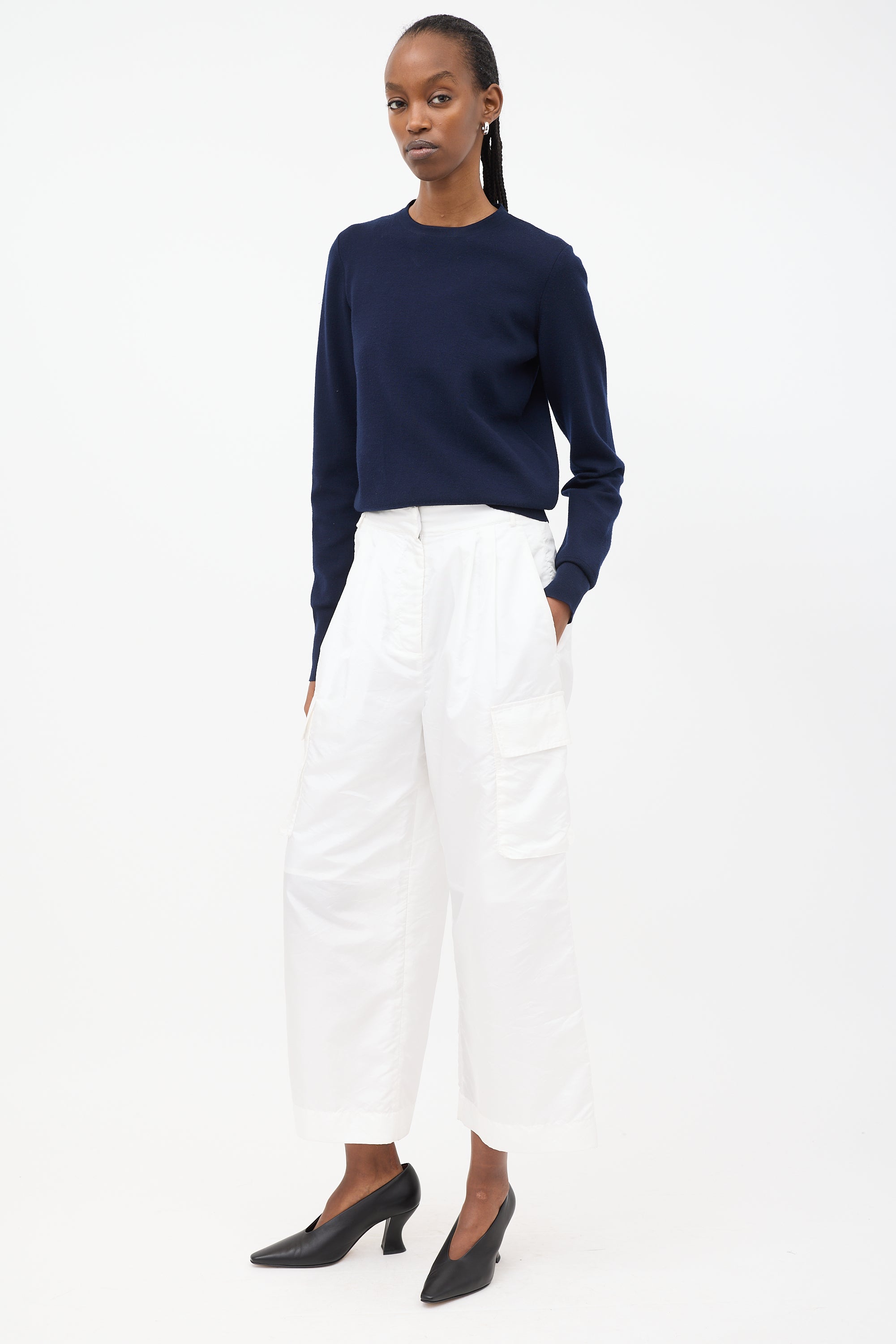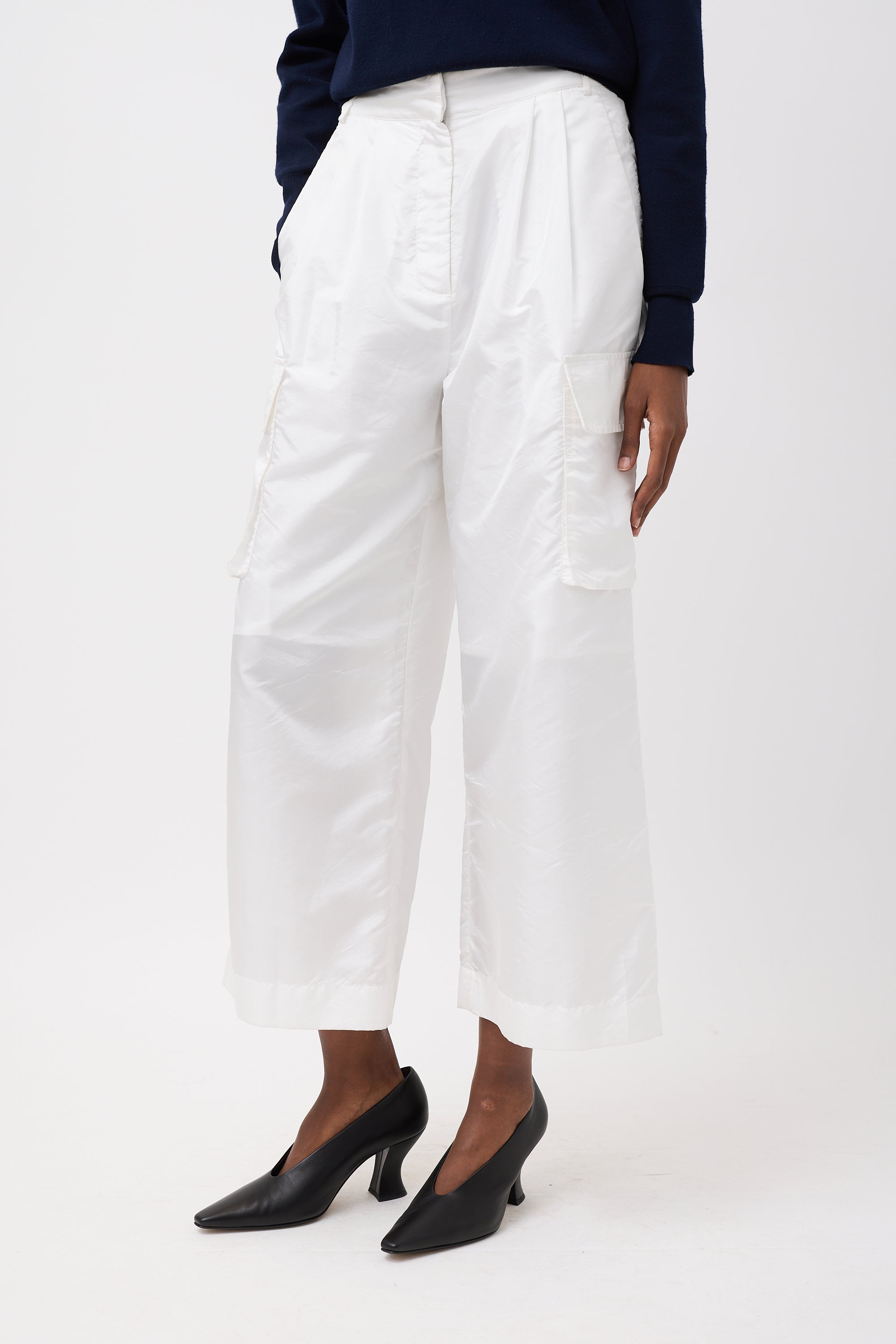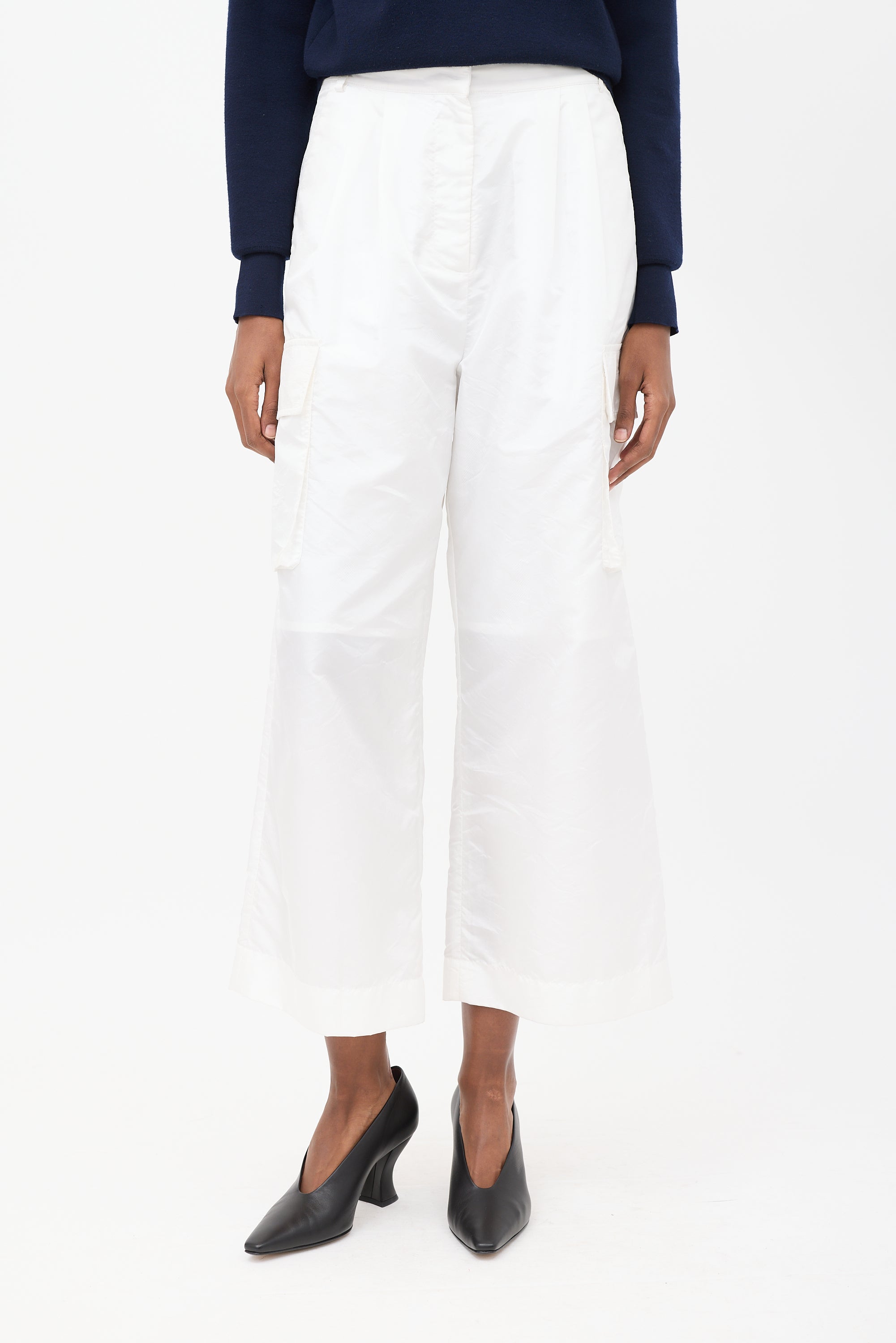 Pre-owned Tibi white nylon blend cargo pants featuring a high pleated waist, dropped seat, wide leg, four pocket waist styling, two cargo pockets at outseam, and zip fly. Lined.