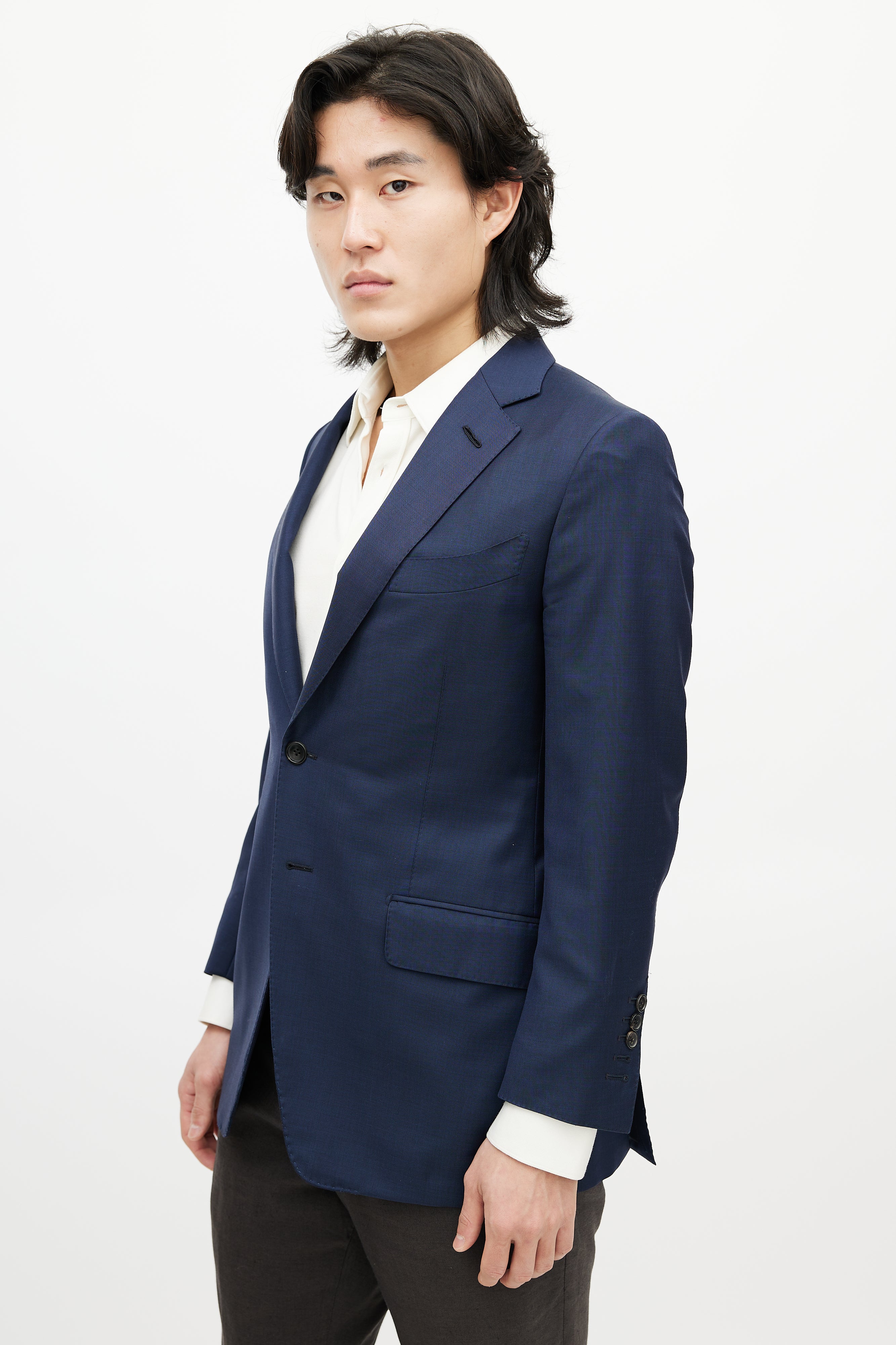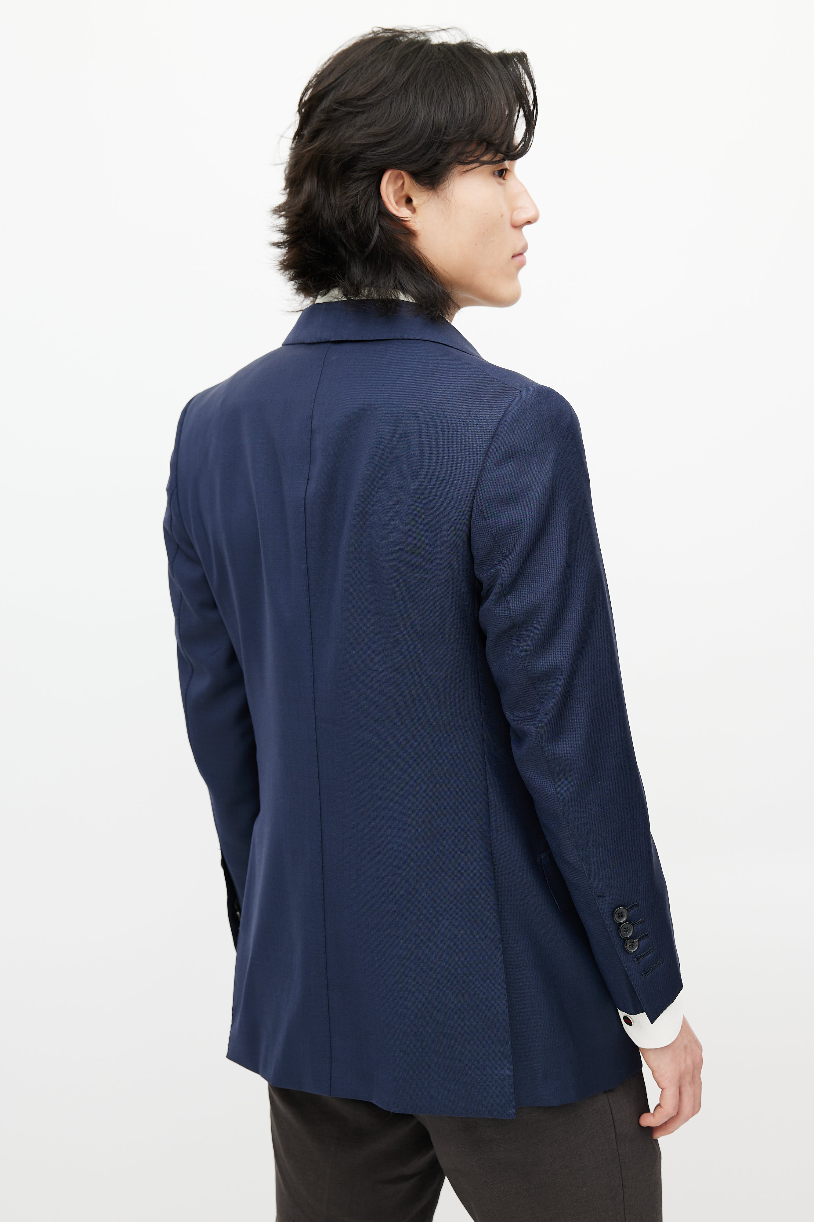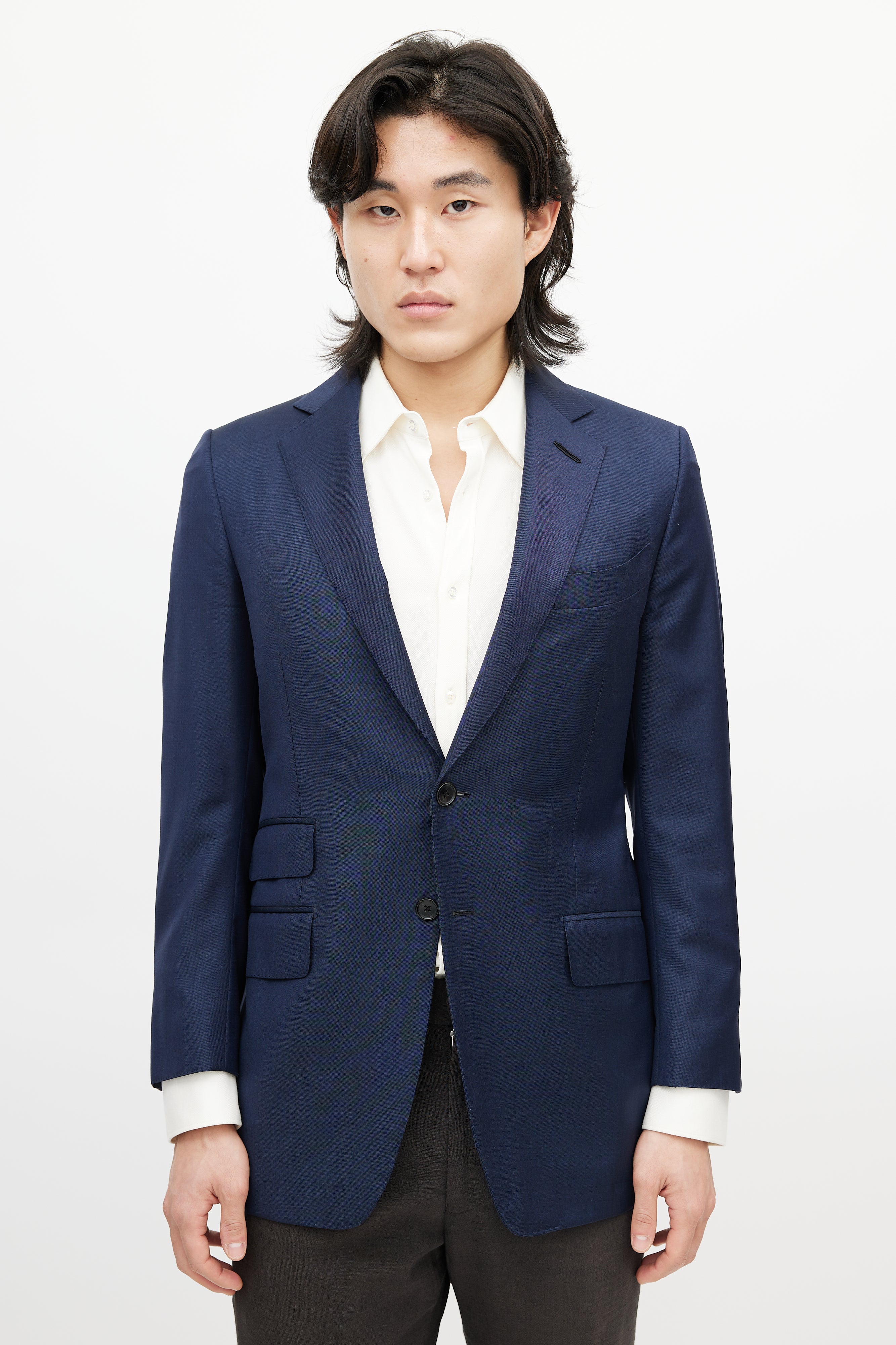 Pre-owned Tom Ford navy wool blazer featuring a notched lapel, long sleeves with buttoned cuffs, one welt pocket at chest, three flap pockets at hip, and button up closure. Lined.