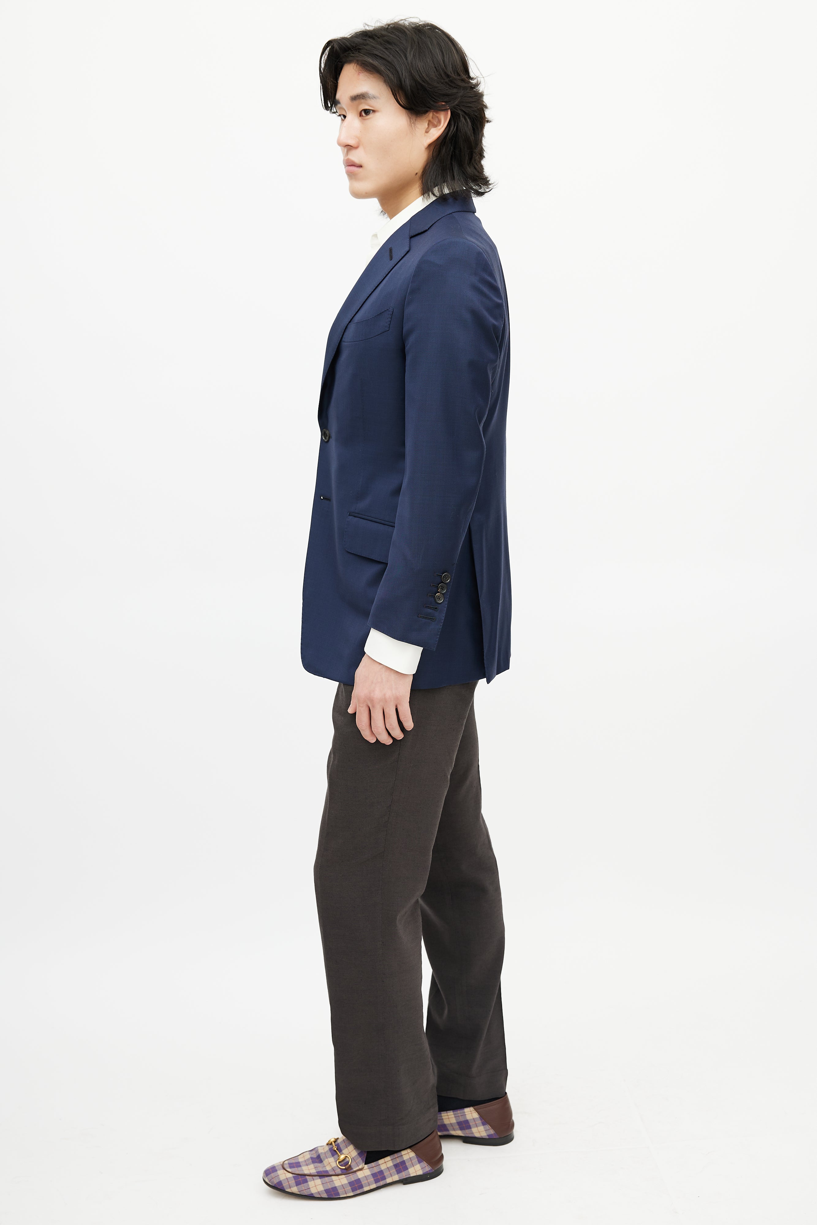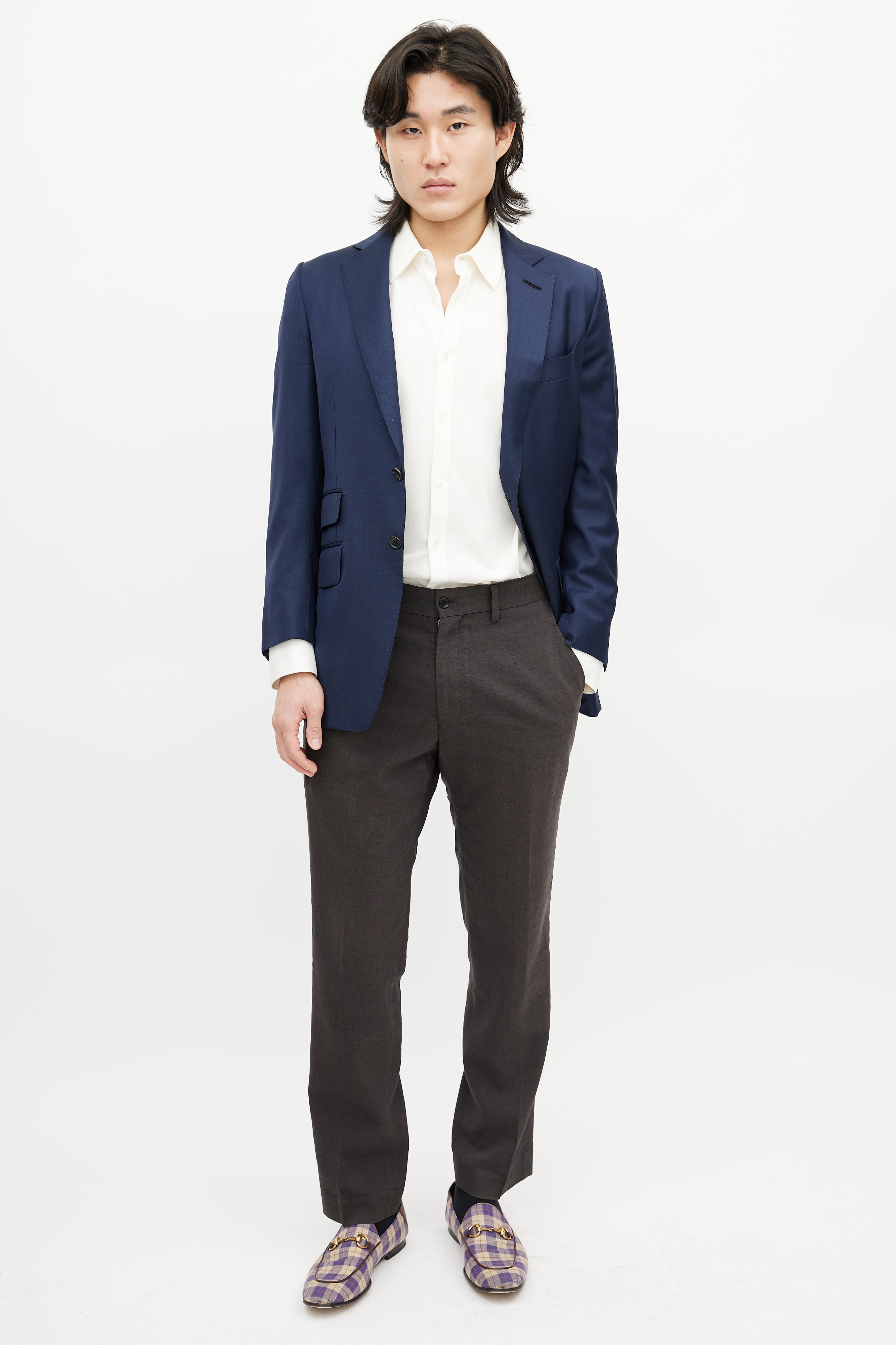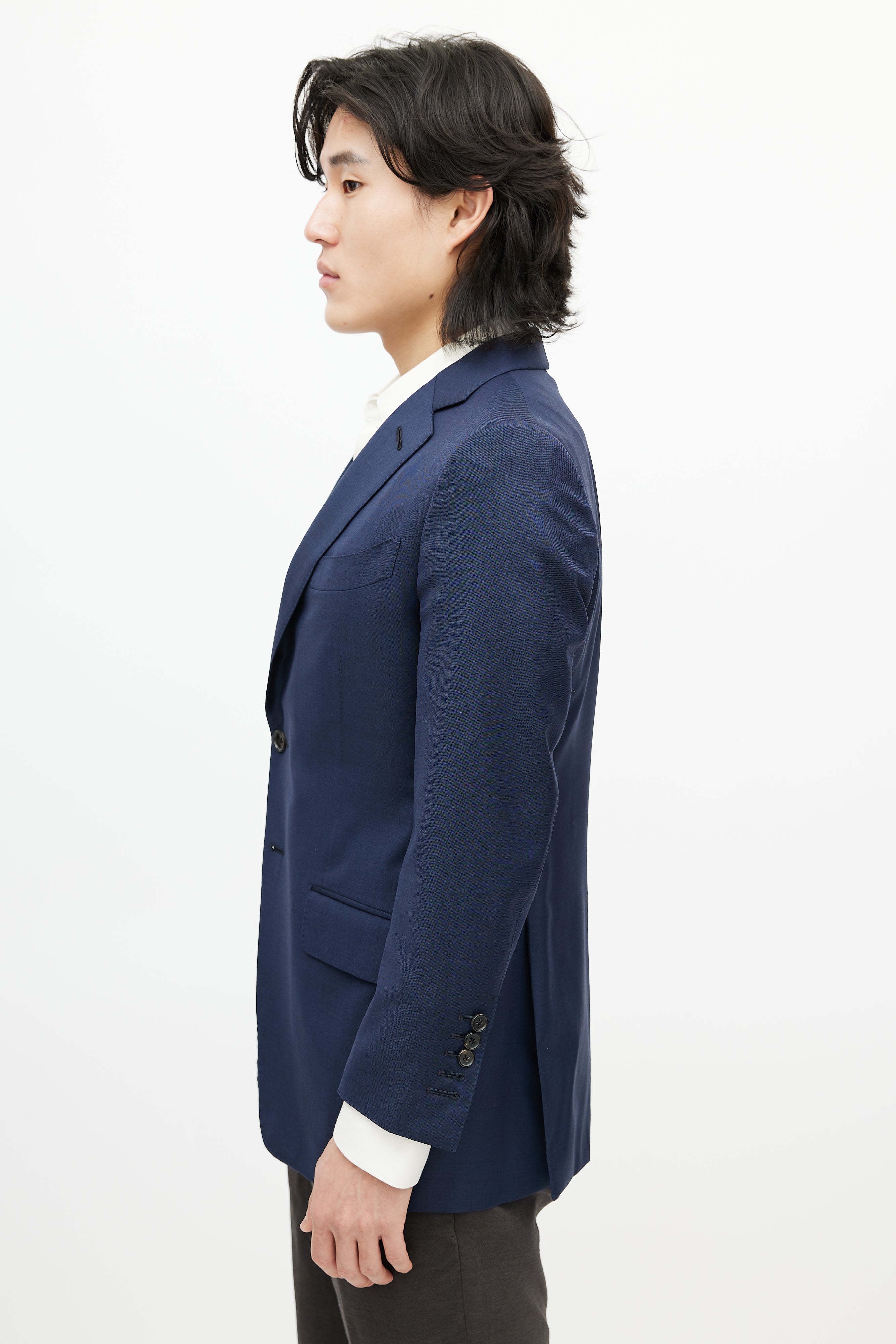 Pre-owned Tom Ford navy wool blazer featuring a notched lapel, long sleeves with buttoned cuffs, one welt pocket at chest, three flap pockets at hip, and button up closure. Lined.