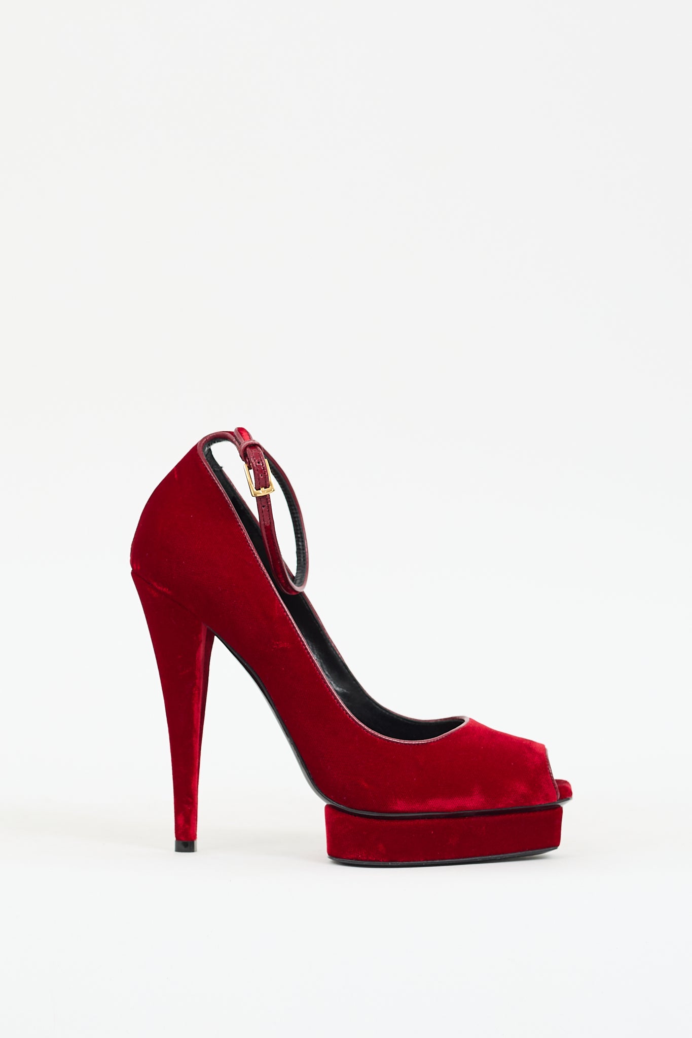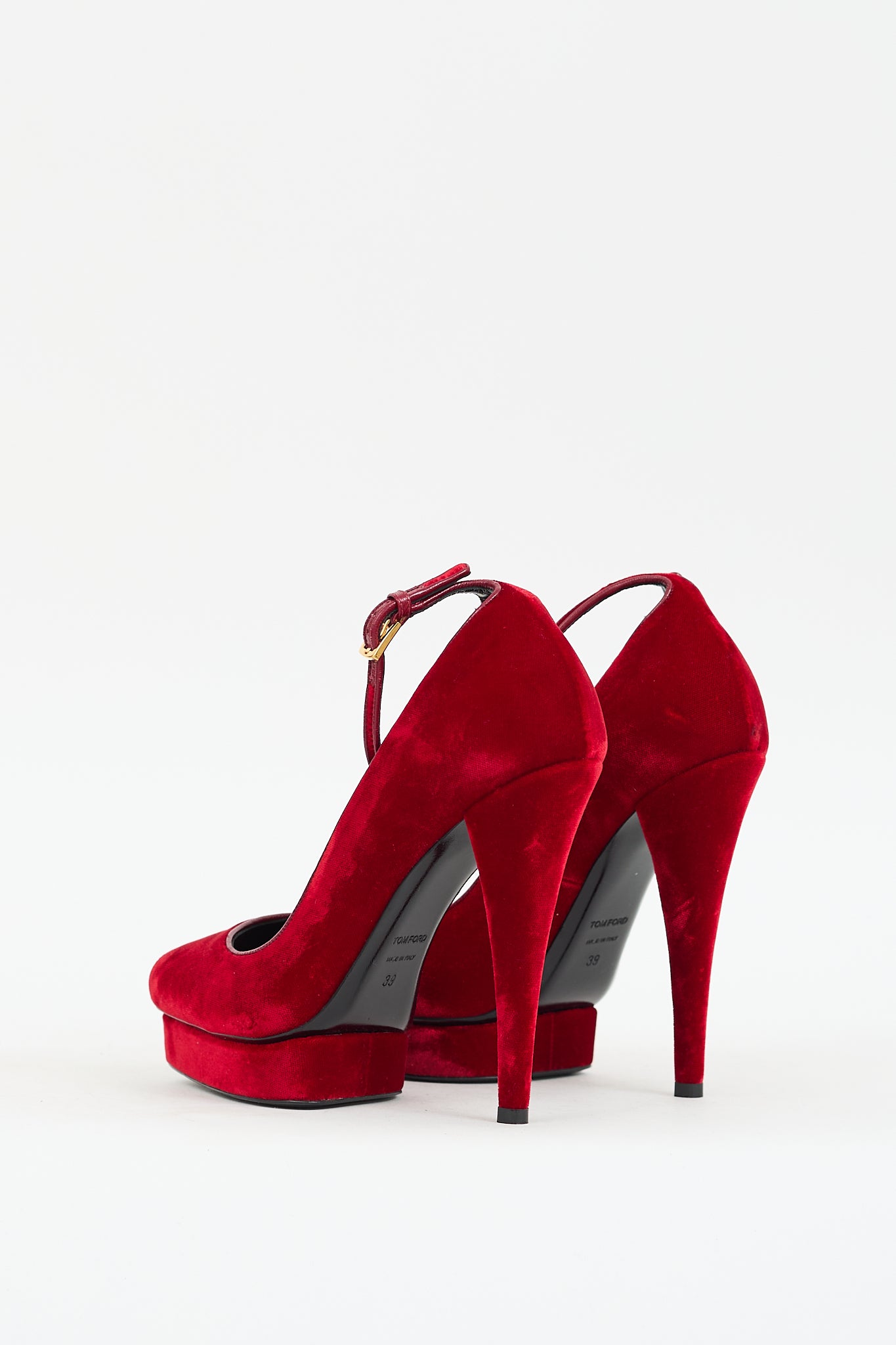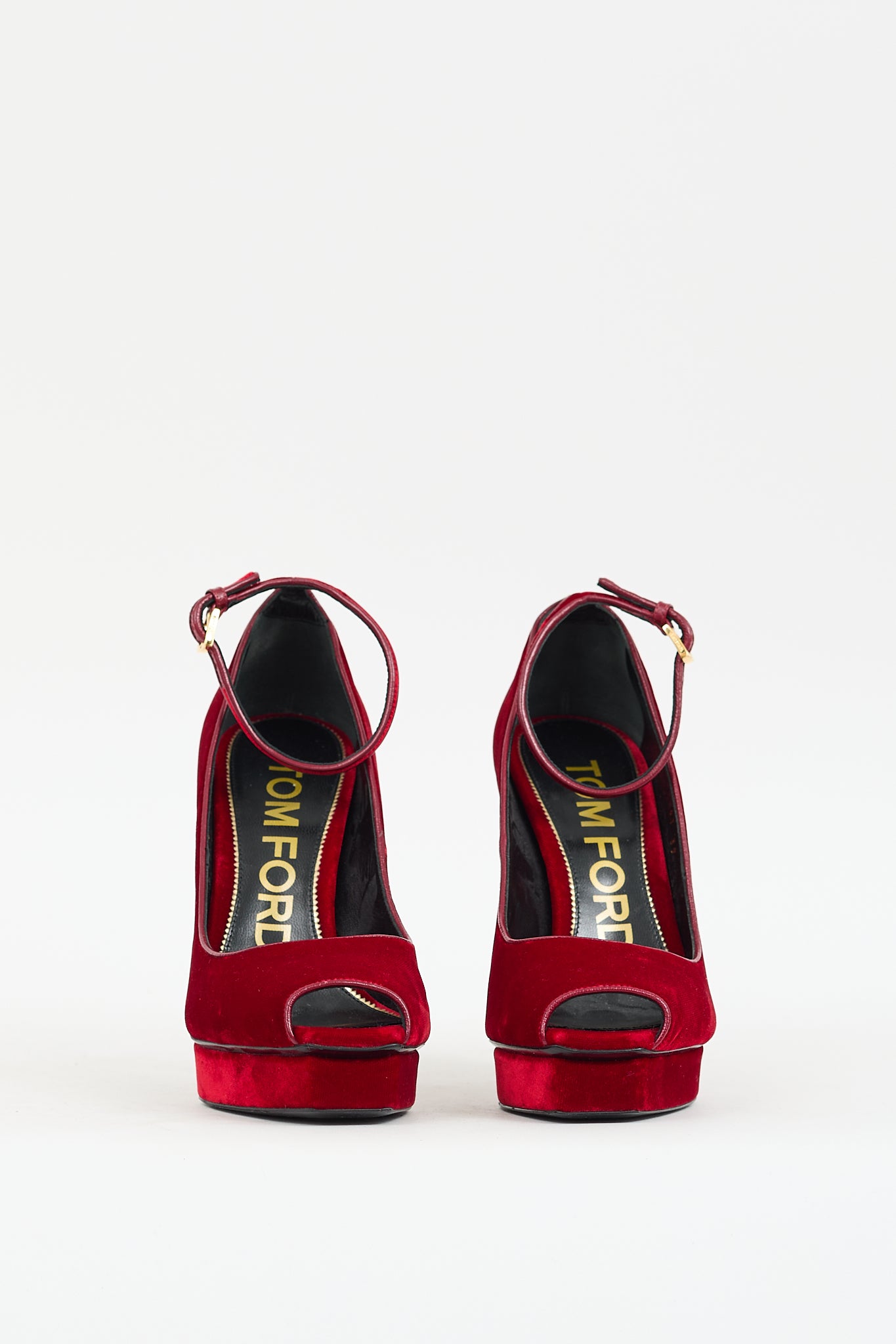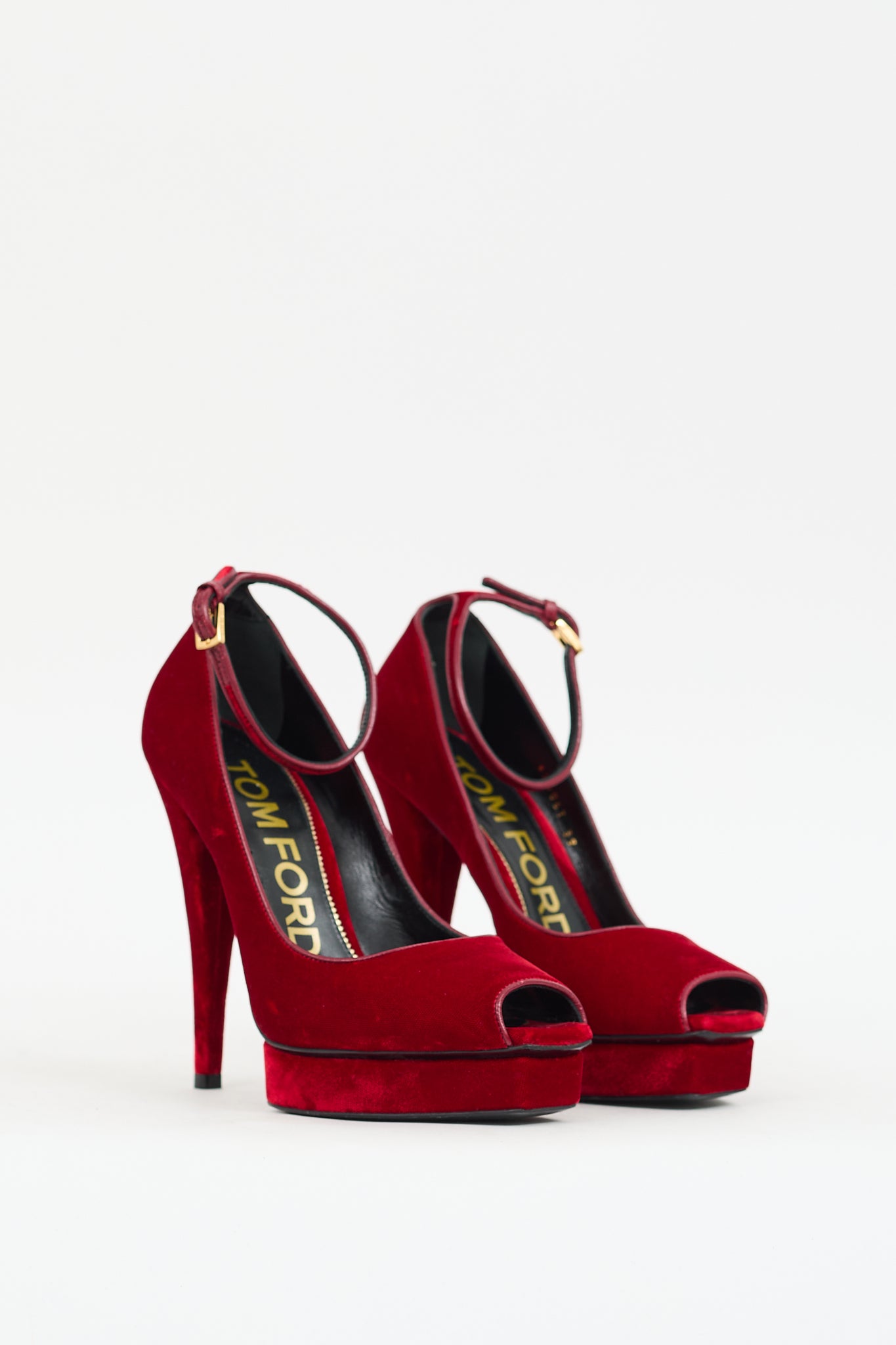 Pre-owned Tom Ford red heels featuring a square peep toe, velvet upper, adjustable ankle strap, short covered platform, covered stiletto heel, and leather insole and outsole.