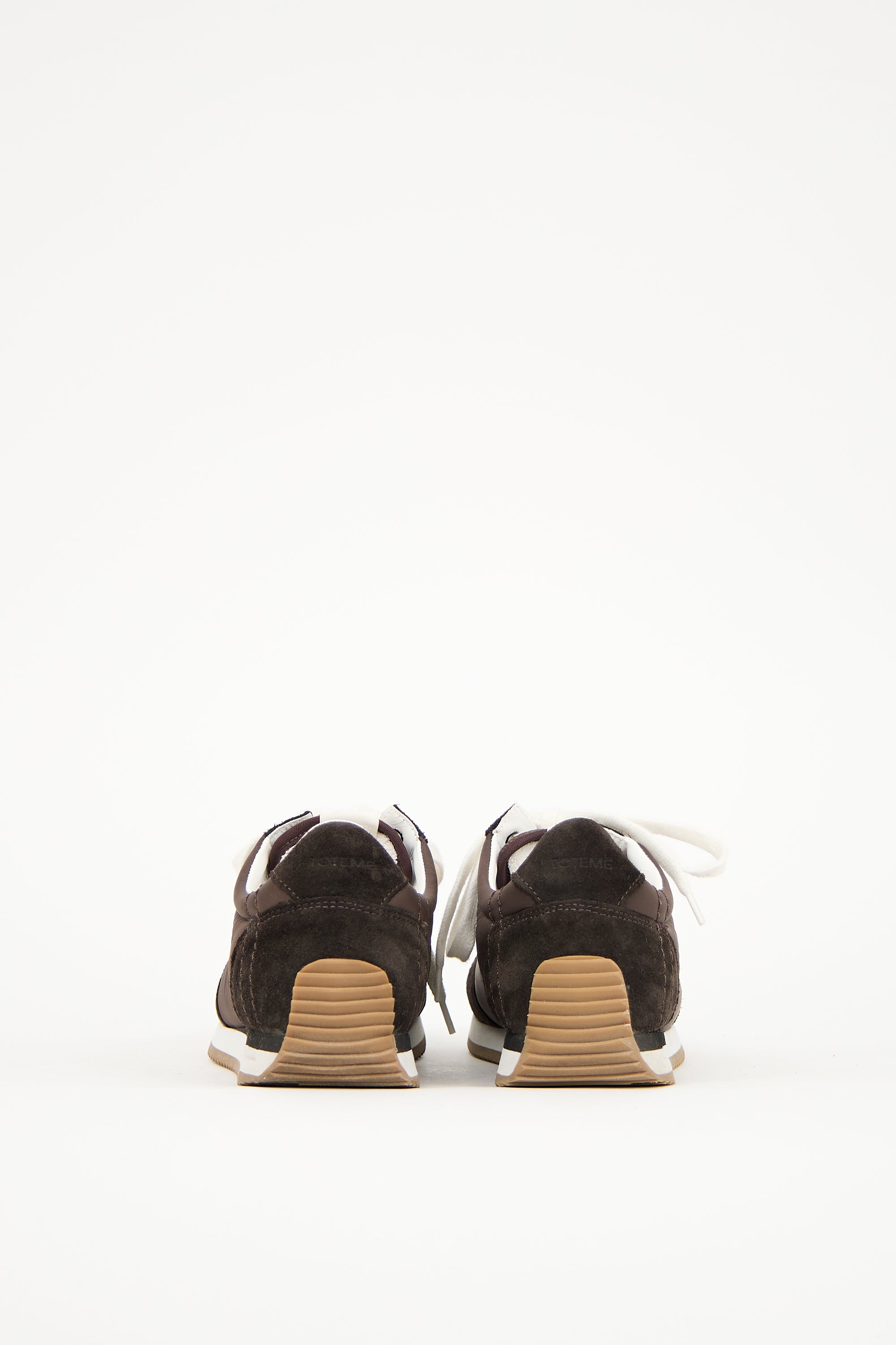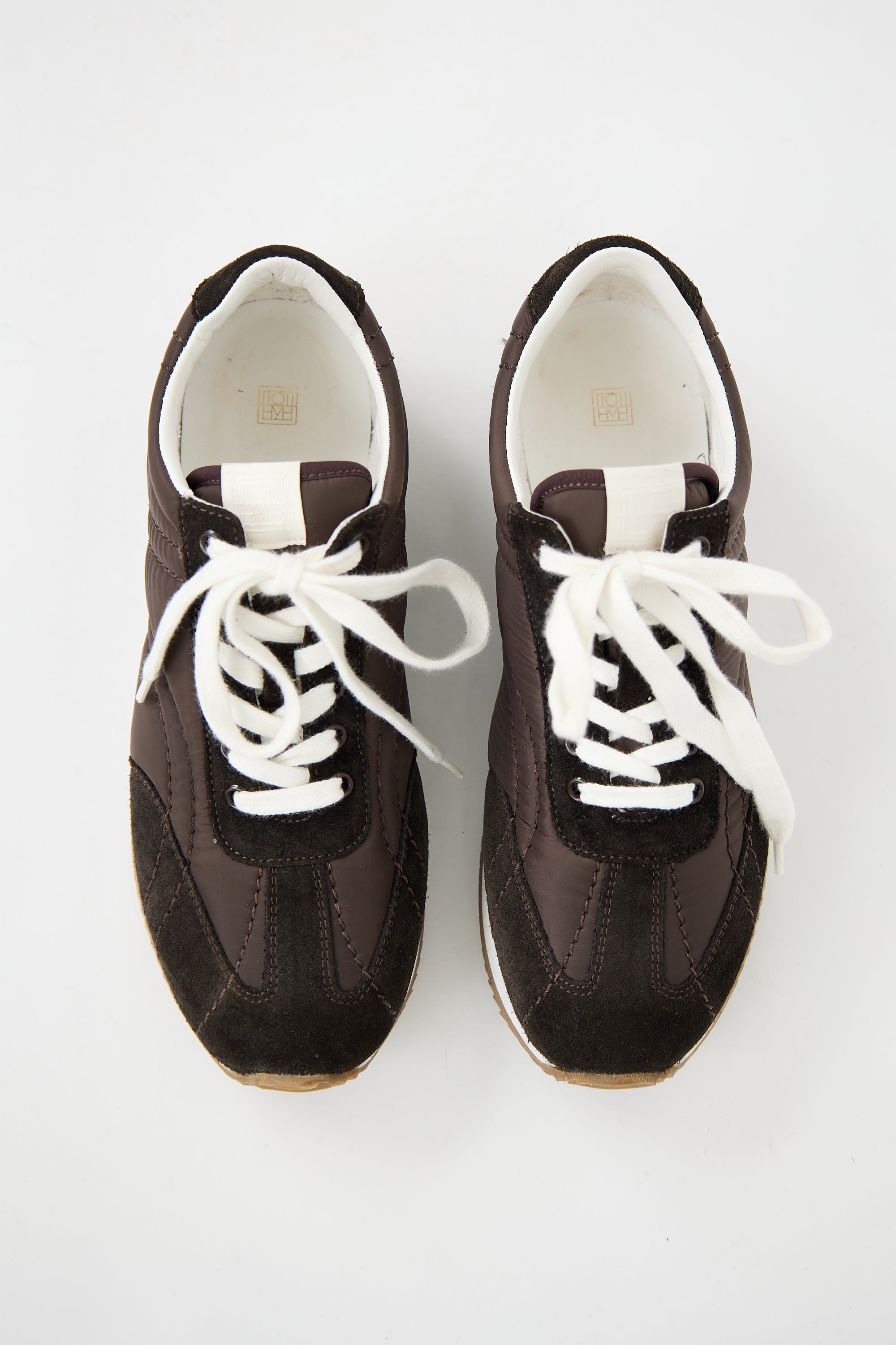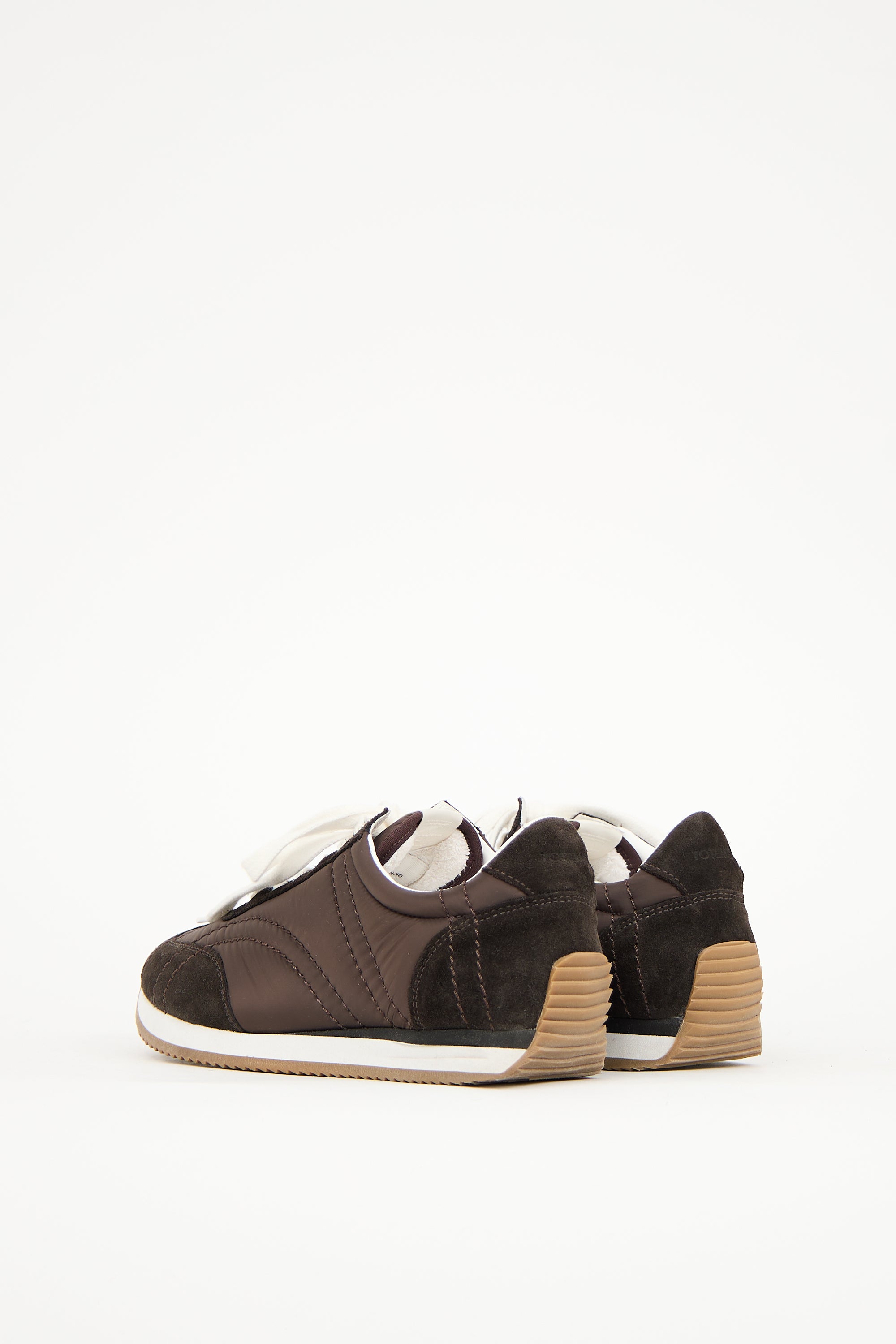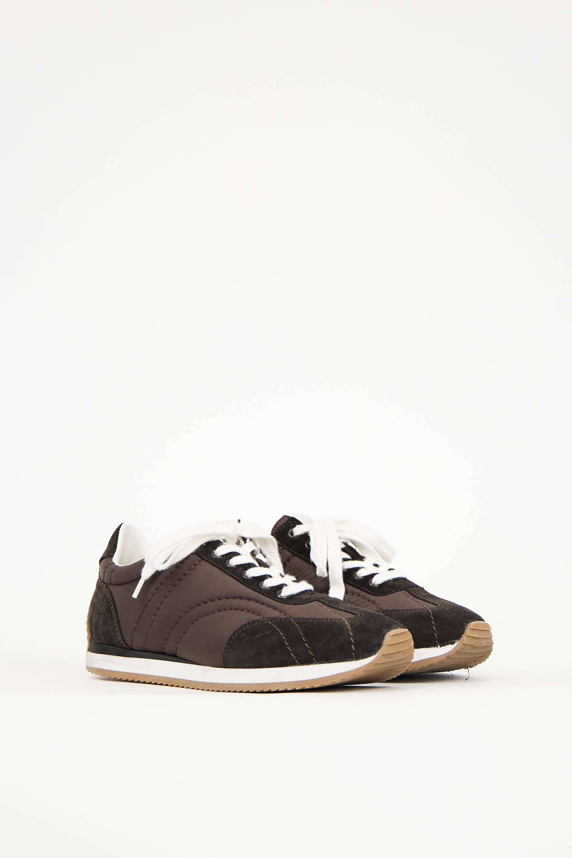 Pre-owned Toteme brown suede and nylon Sport sneakers featuring rounded toe, lace up front, logo patch at tongue, leather insole, and rubber outsole.