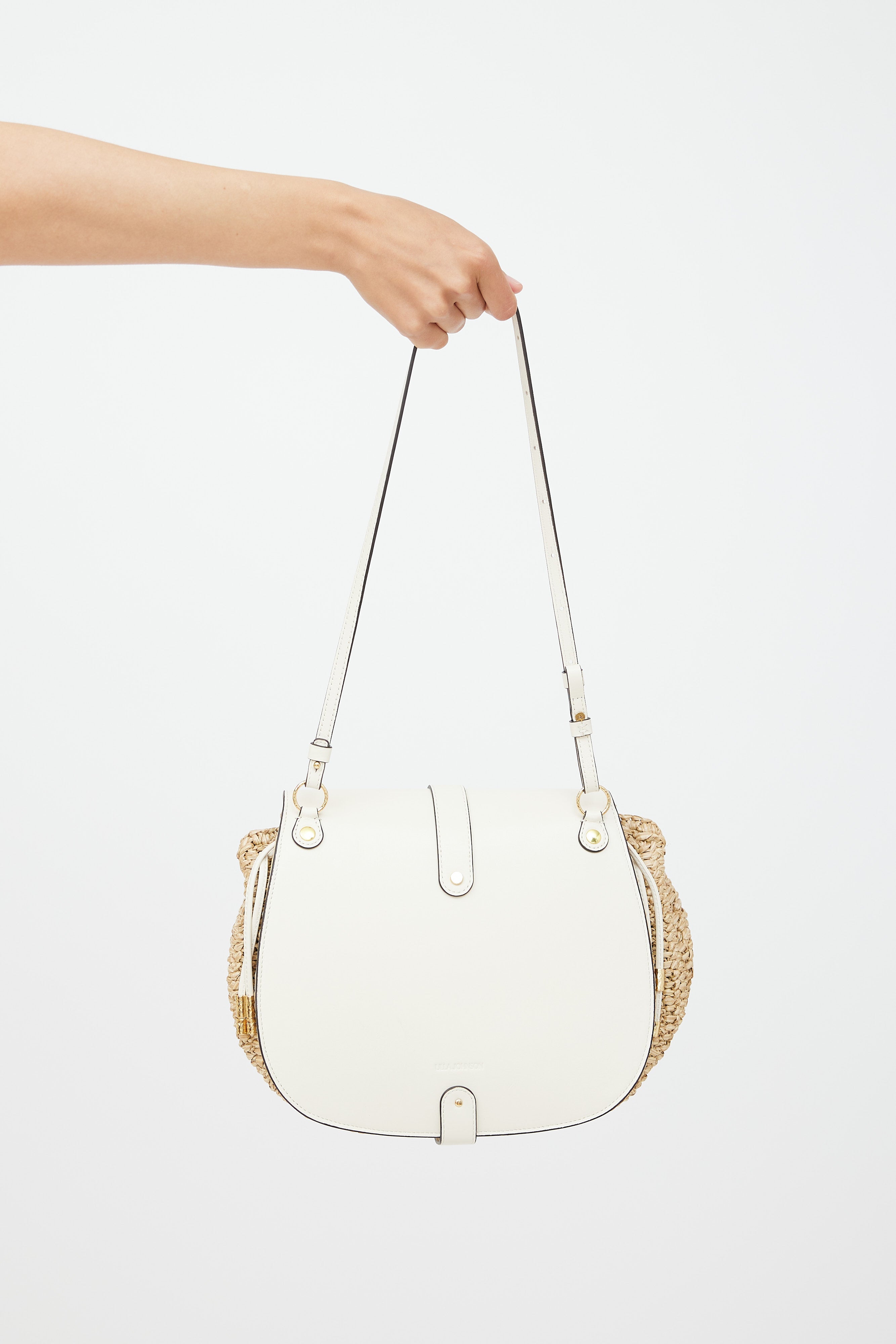 Pre-owned Ulla Johnson beige Paloma Ruched raffia woven bag featuring a cream leather top flap, one main compartment with one slip pocket, removable top handle and shoulder strap, top cinch detail, embossed logo at back, and magnetic snap buckle closure.