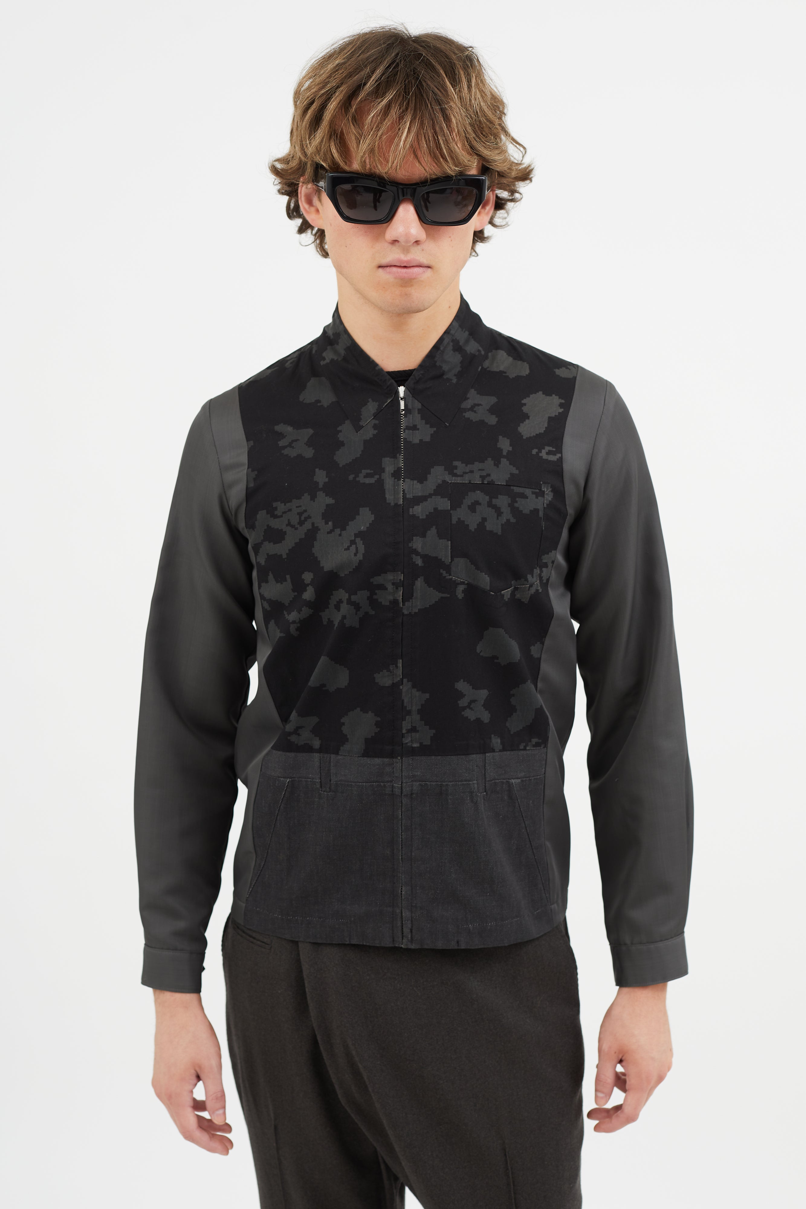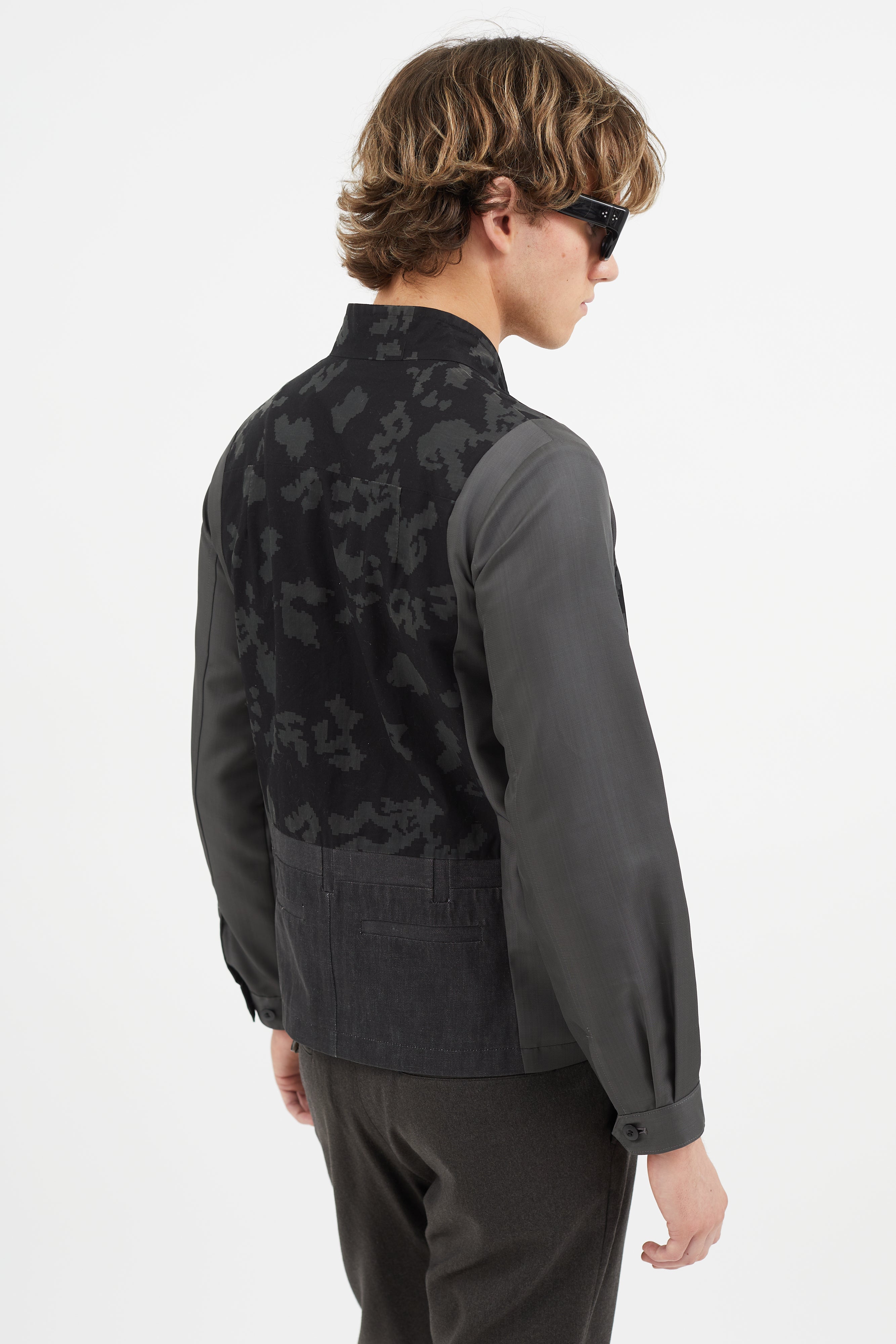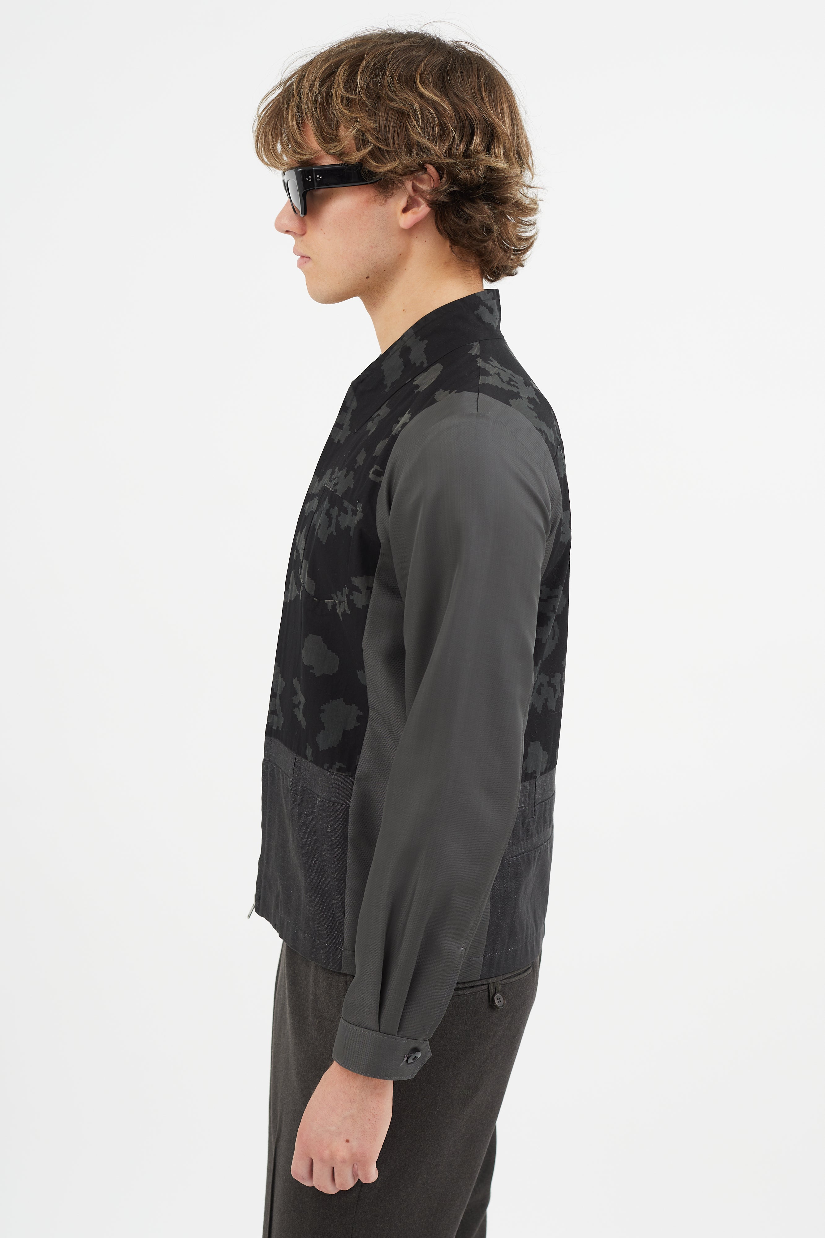 Pre-owned Undercover Spring 2001 Chaotic Discord grey jacket featuring a black digital camo print at front and back, shawl collar, long sleeves with buttoned cuffs, and a zip up front. Lined.