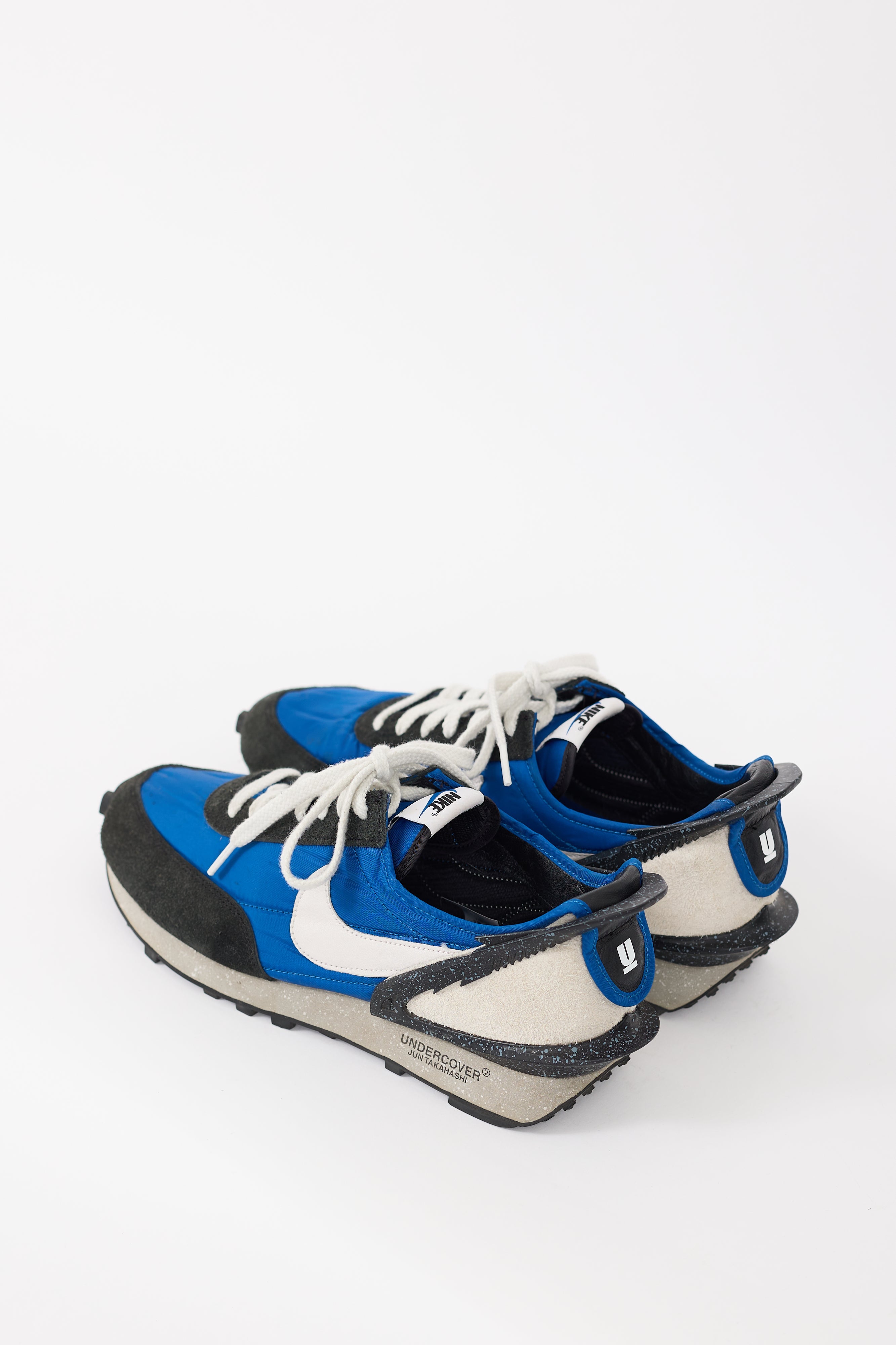 Pre-owned Undercover x Nike blue and black Daybreaker sneakers featuring rounded toe, black suede paneling, blue nylon upper, lace up front, signature Swoosh at side, black rubber structured detail at heel, and speckled midsole with stamped logo at side.