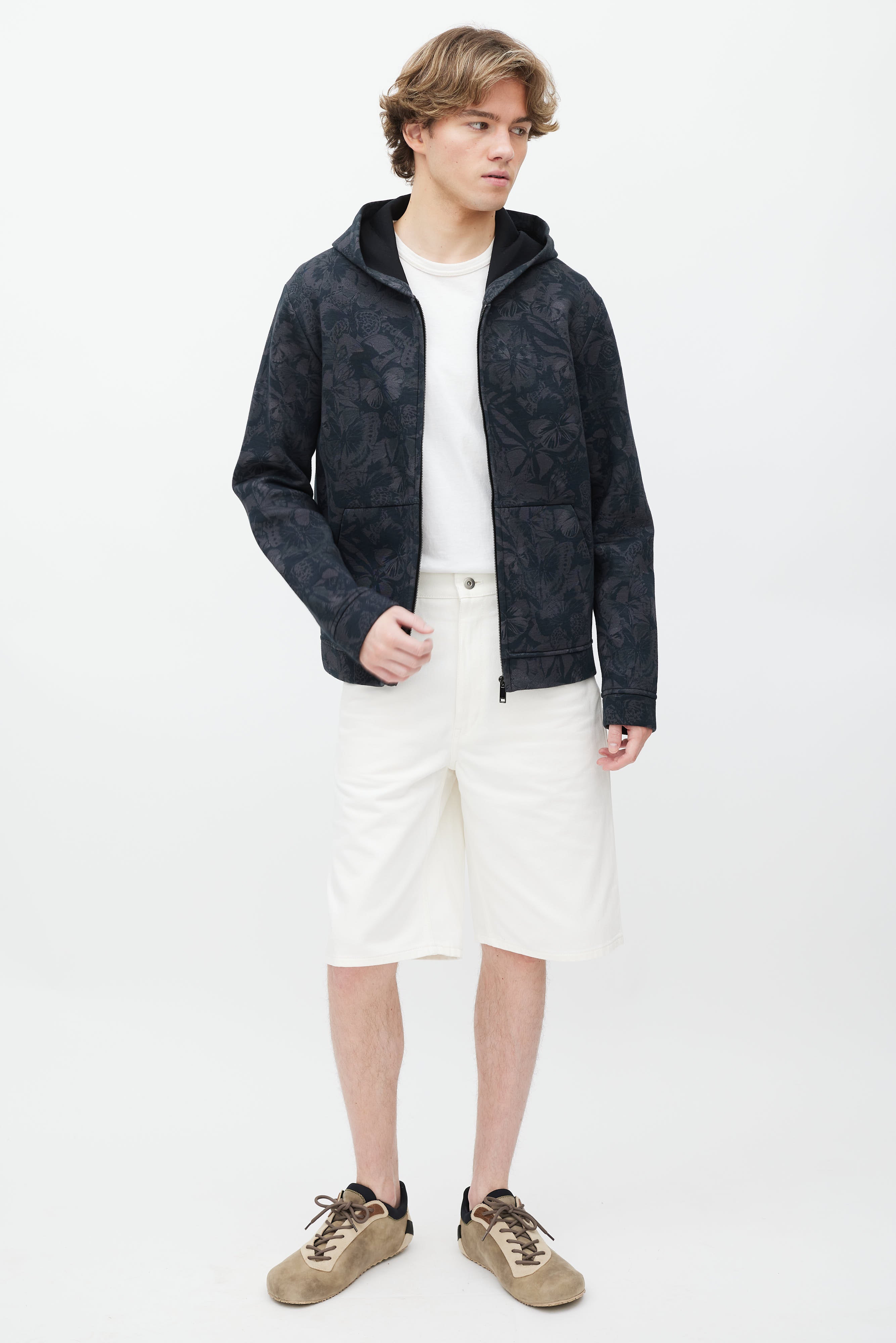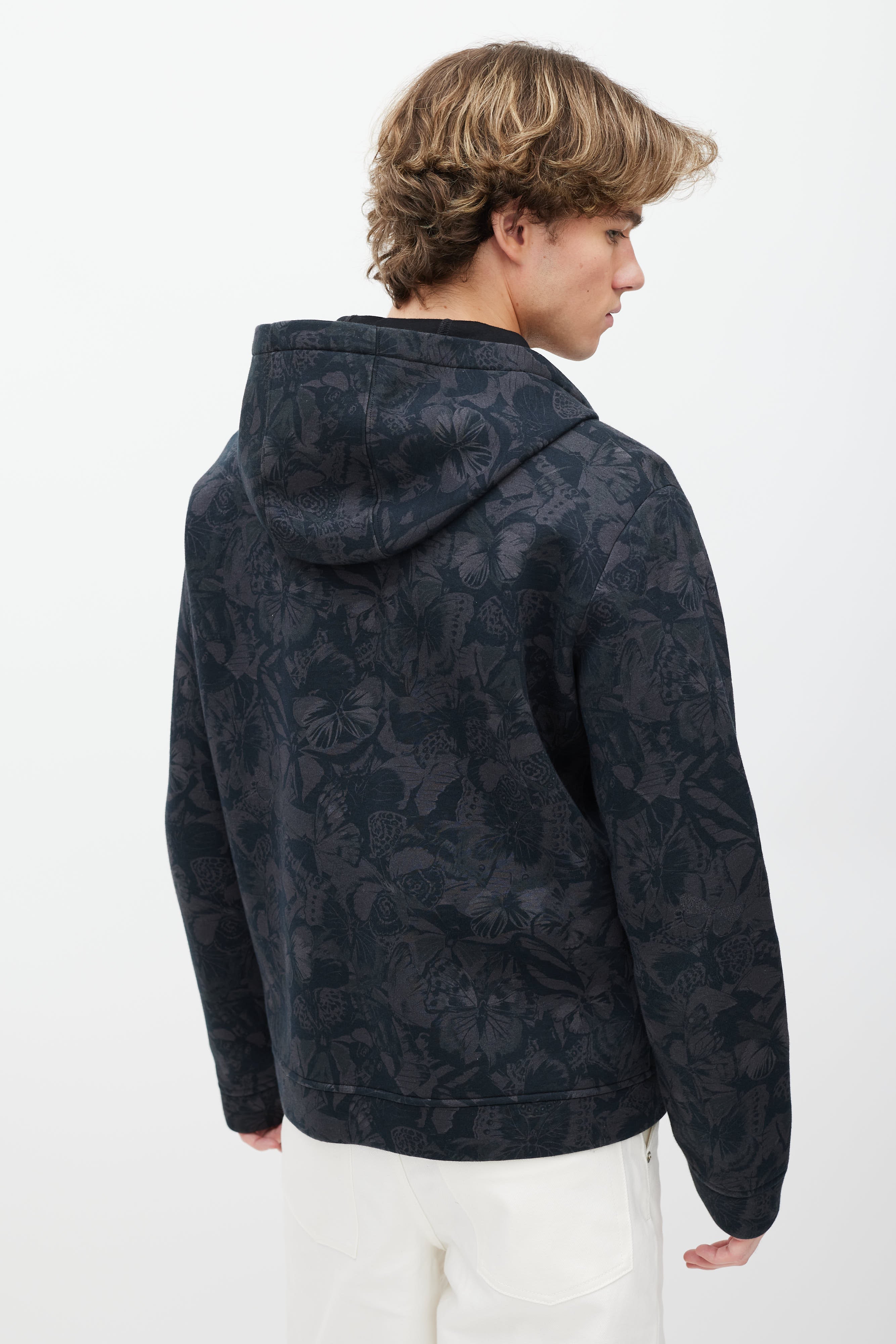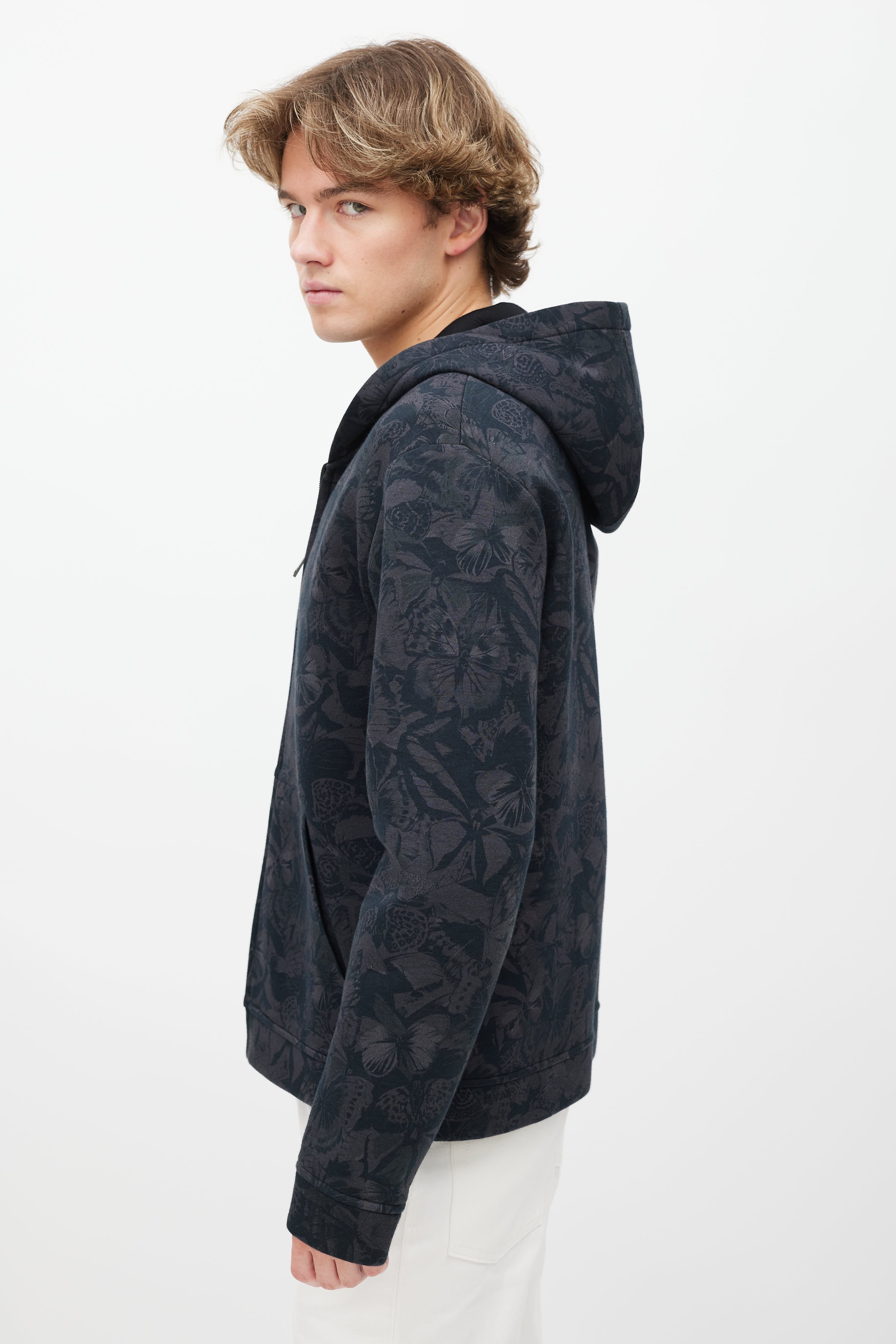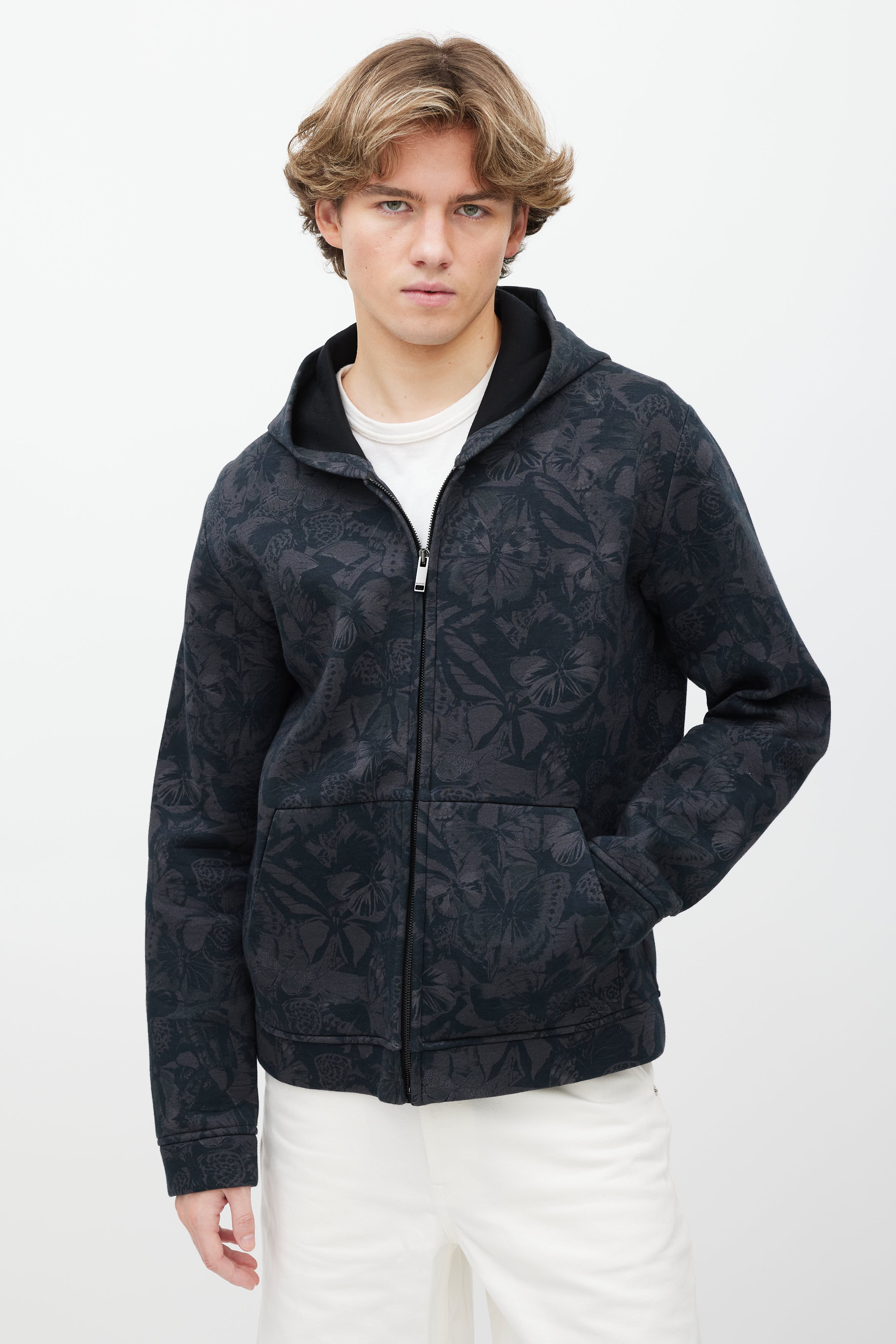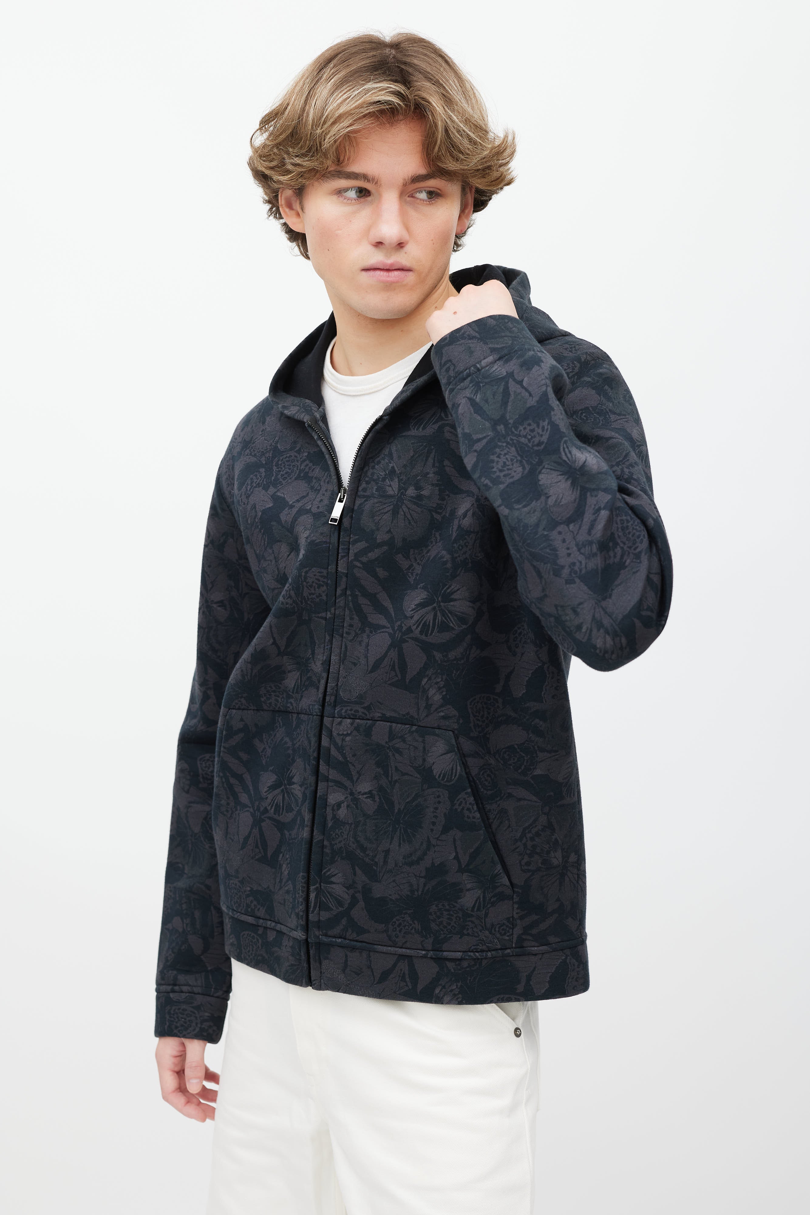 Pre-owned Valentino black and grey hoodie featuring all over butterfly print, zipper at front, kangaroo pockets, stud detail at back.