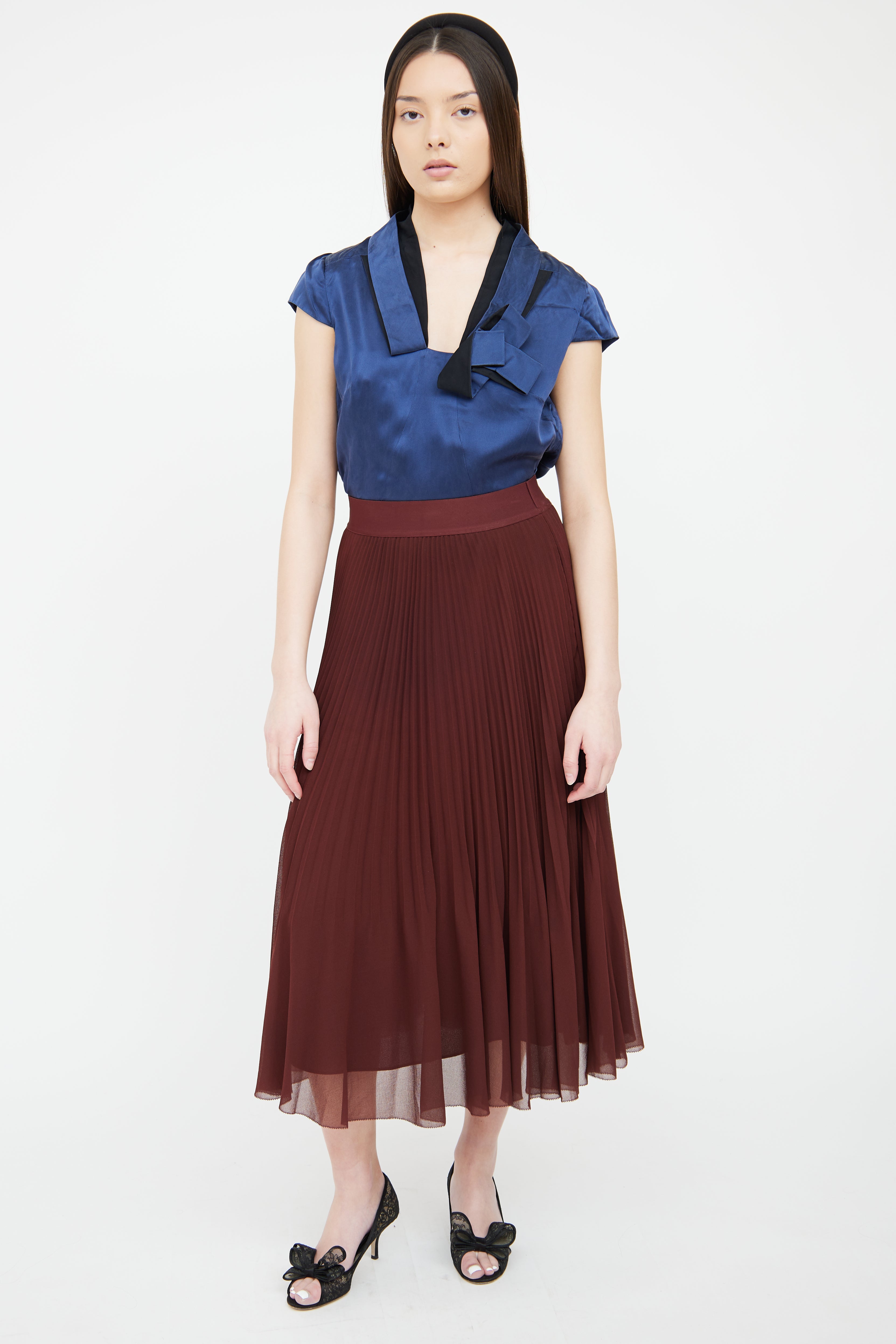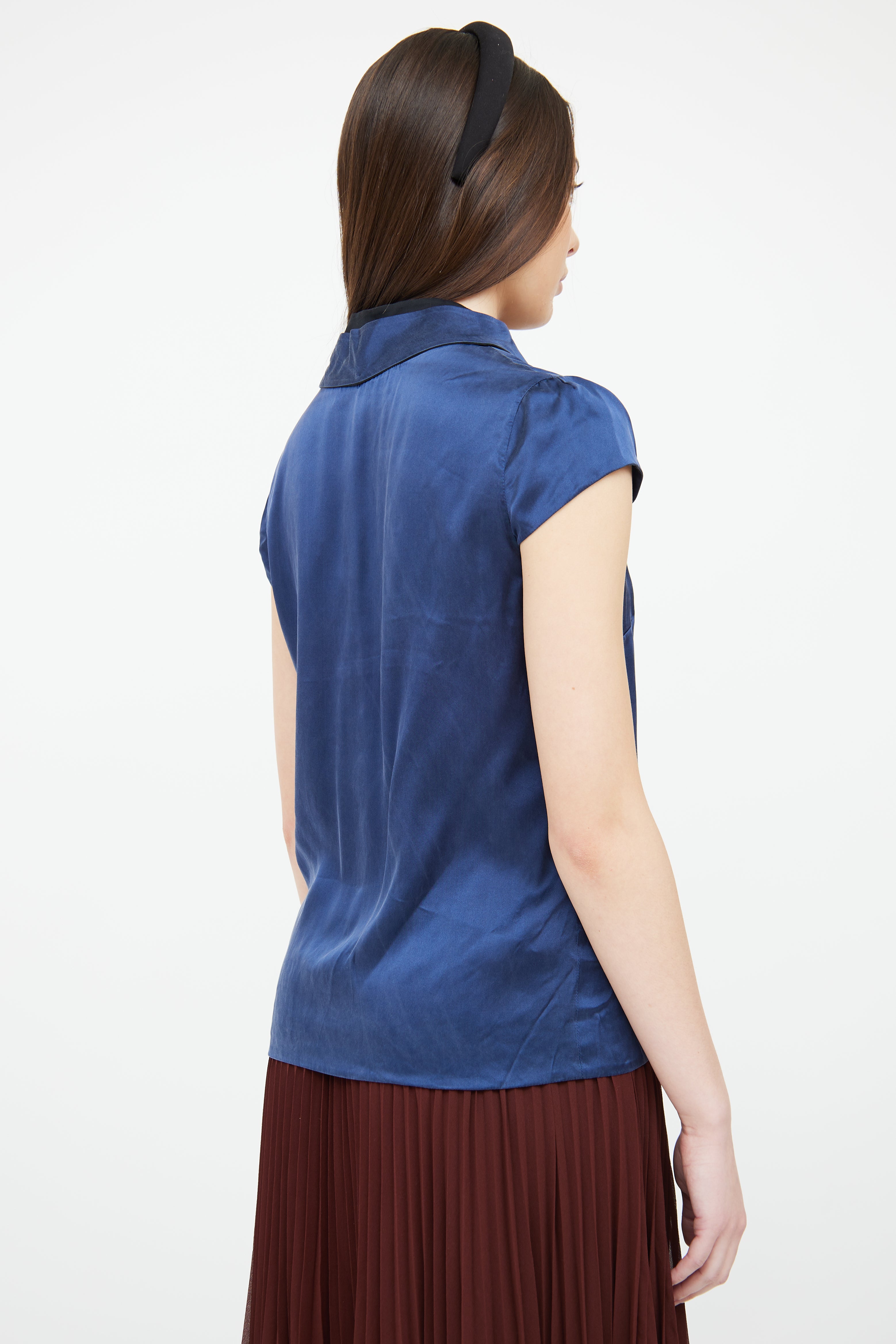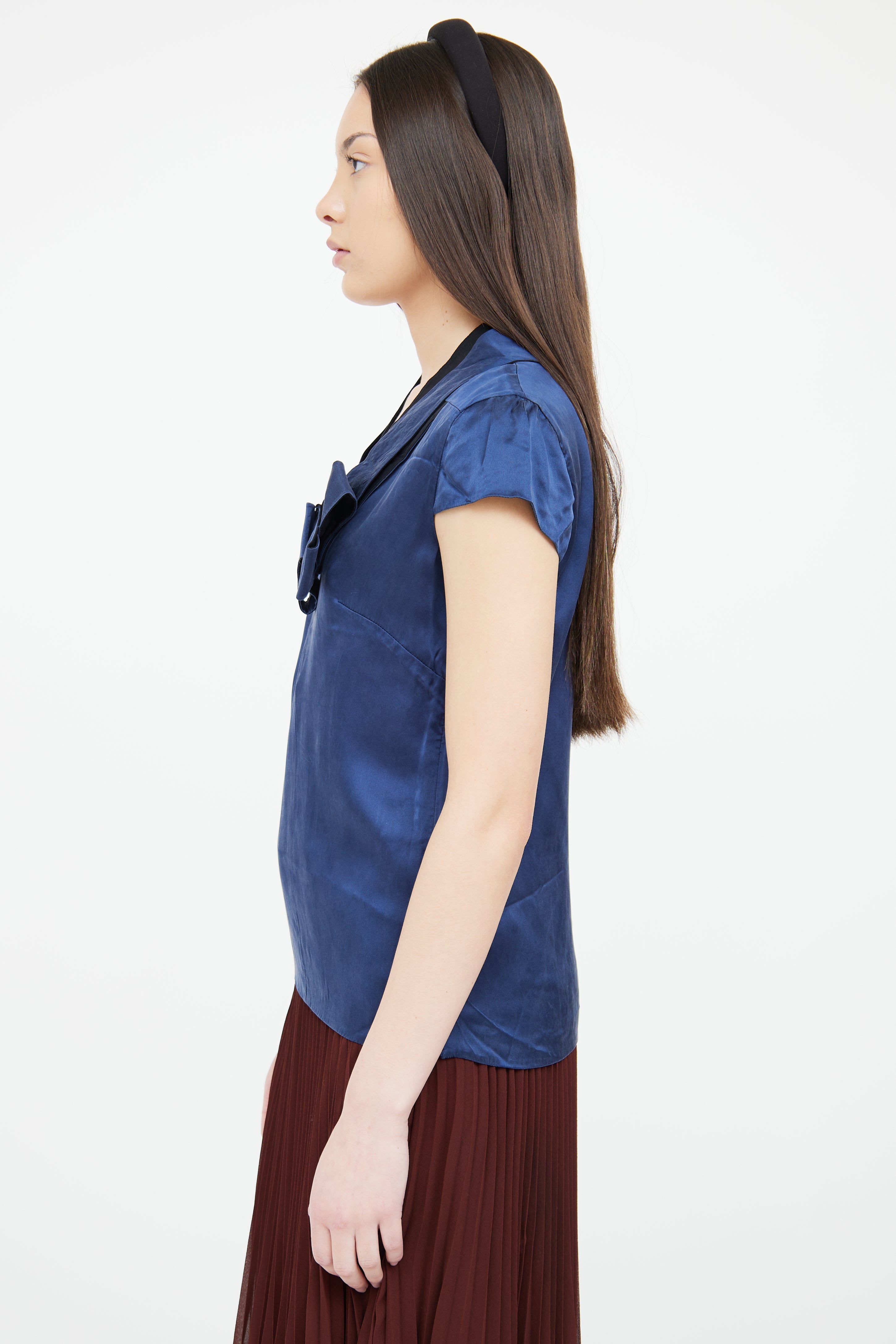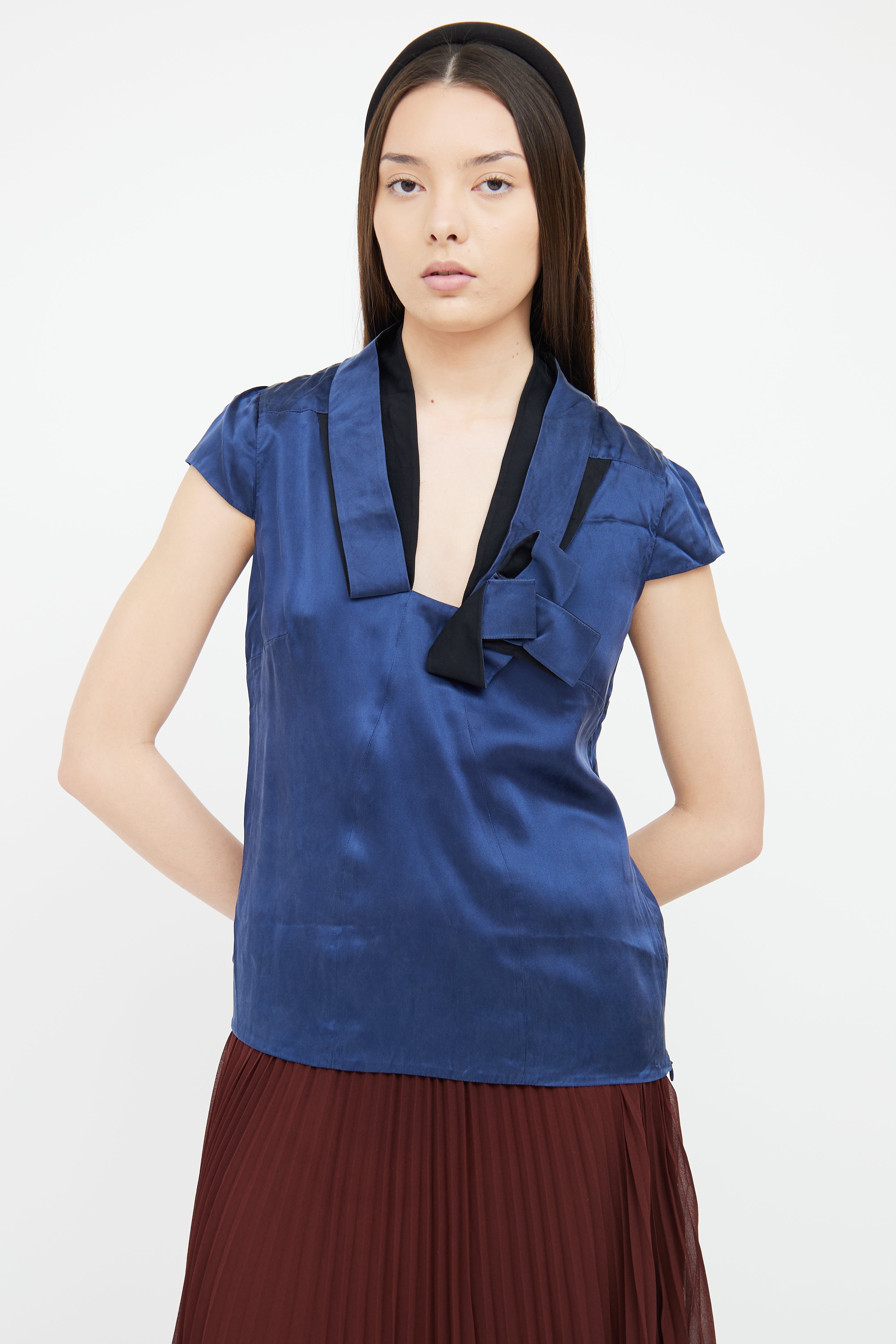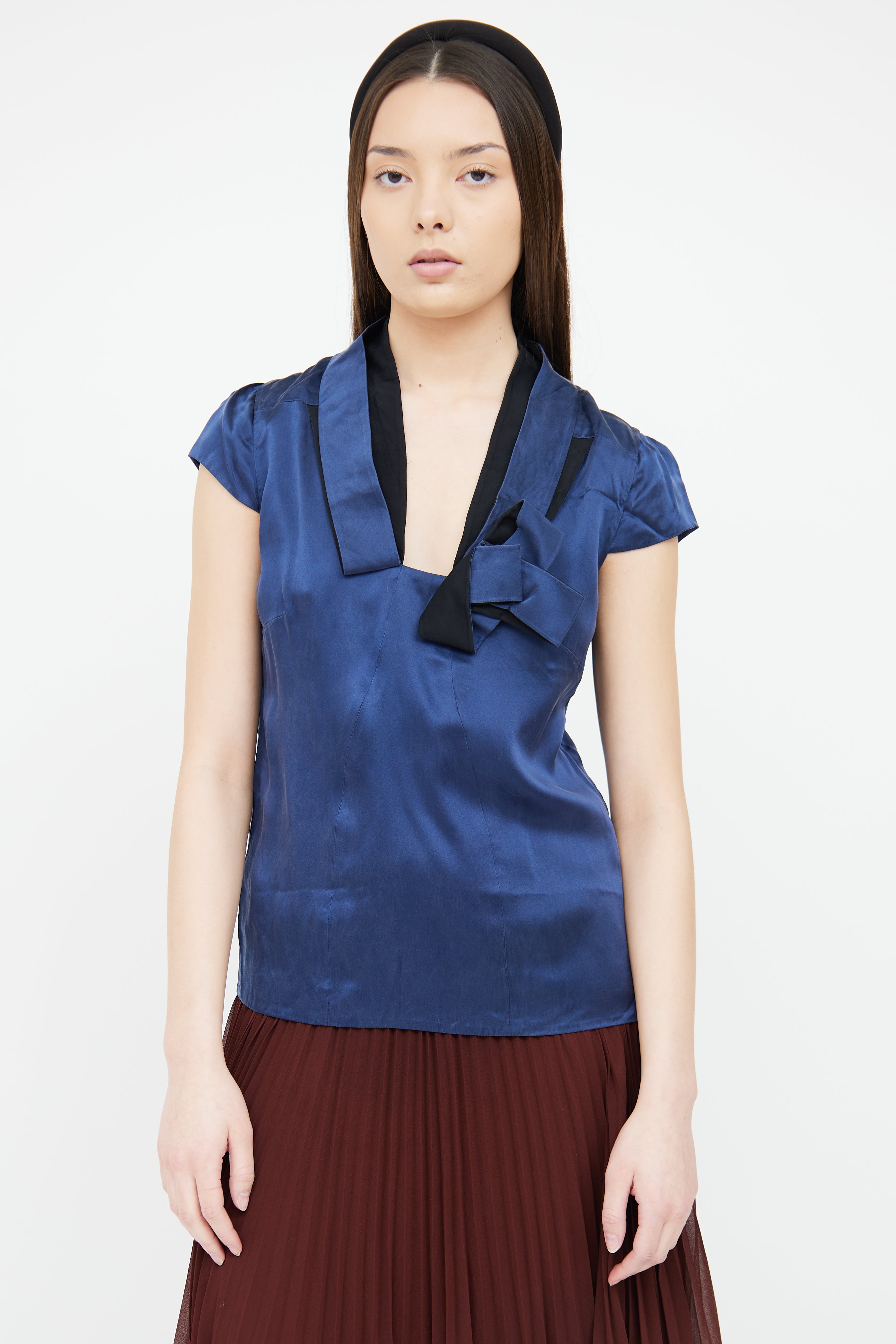Pre-owned Valentino navy silk blouse featuring cap sleeve detailing, asymmetrical neckline with black accents, bow detail and concealed side zip closure.
