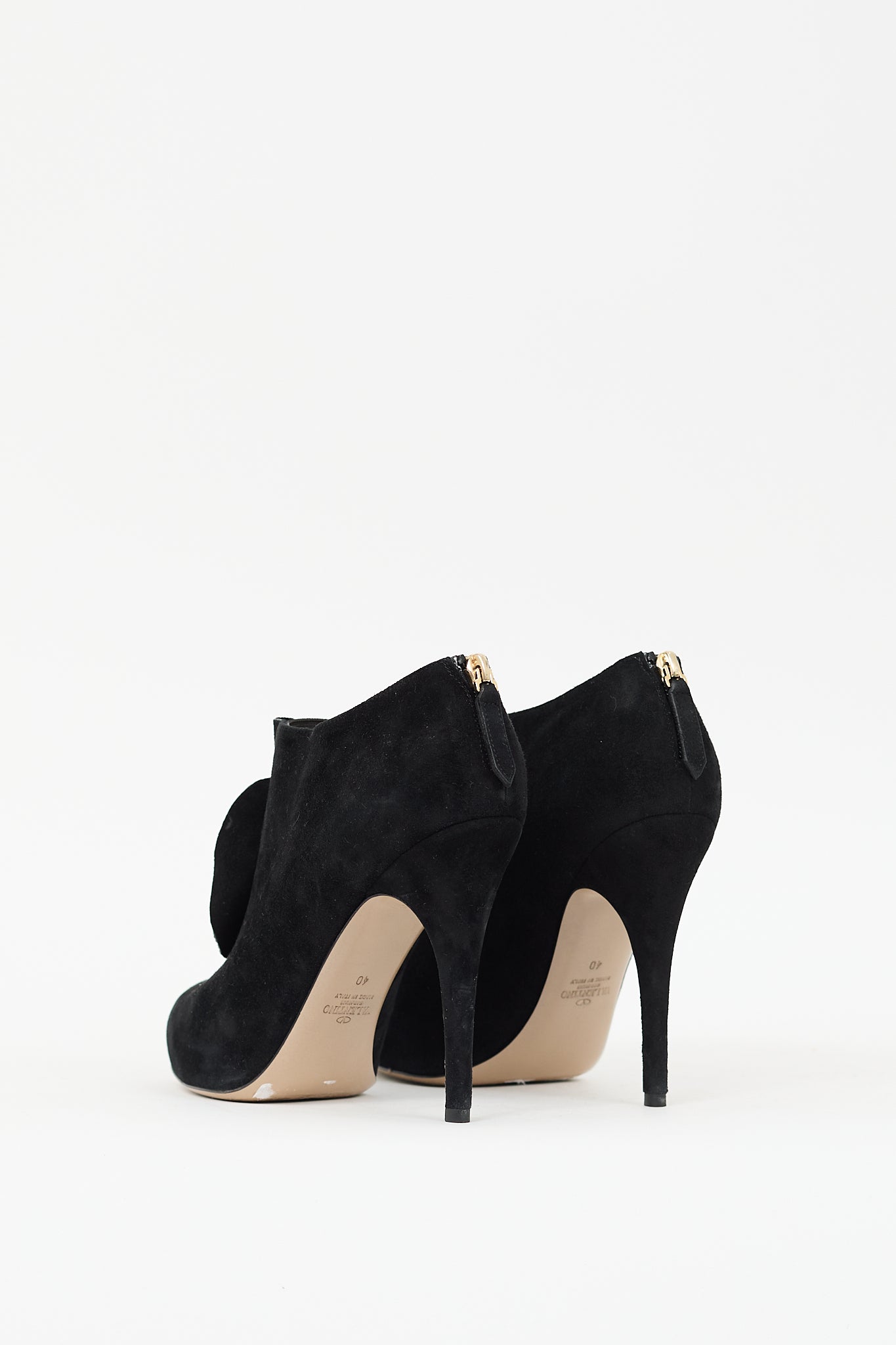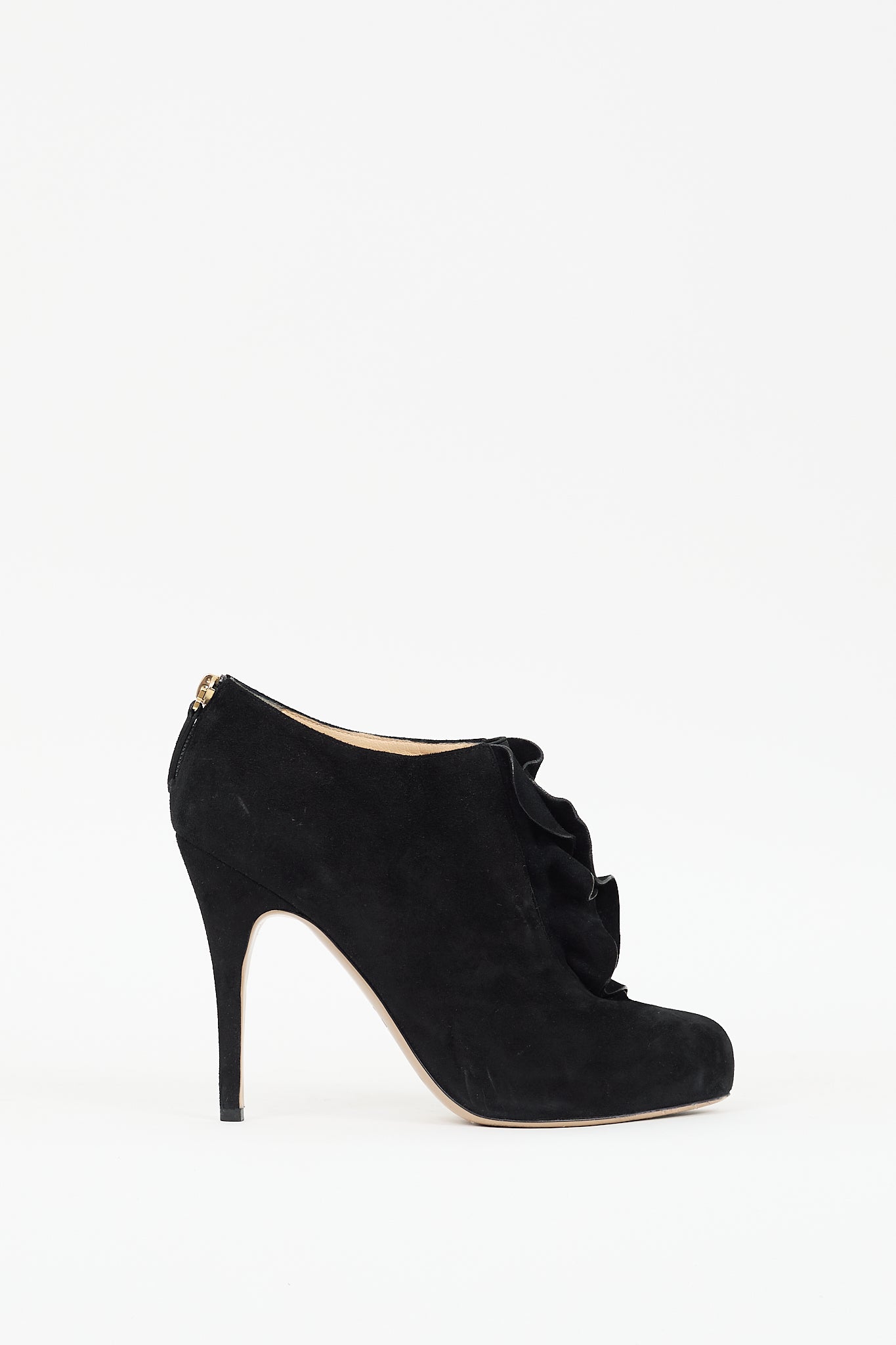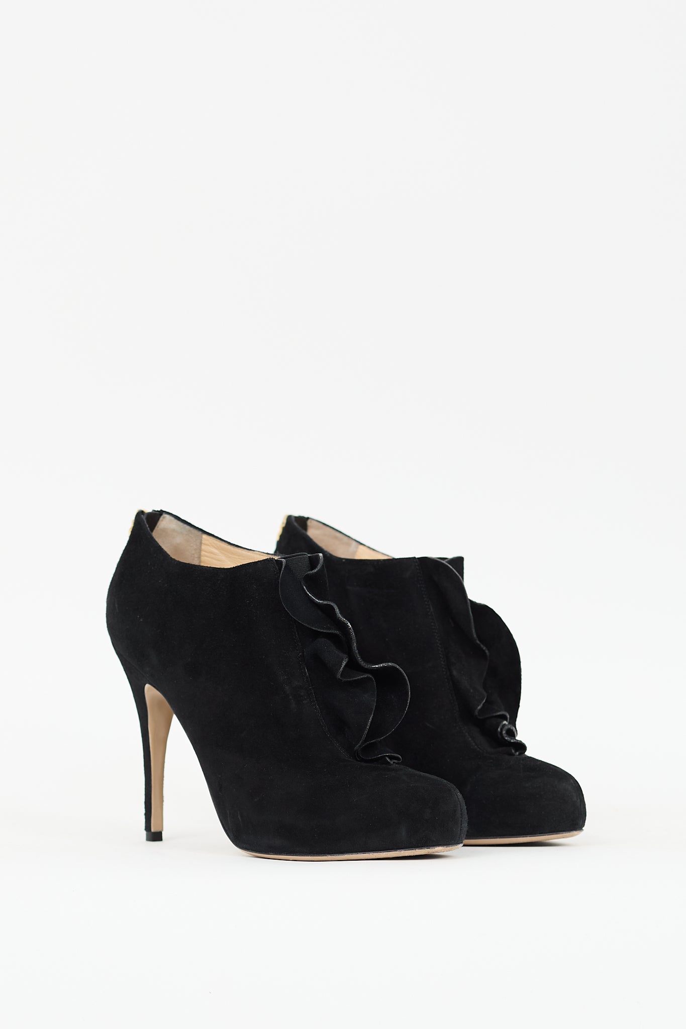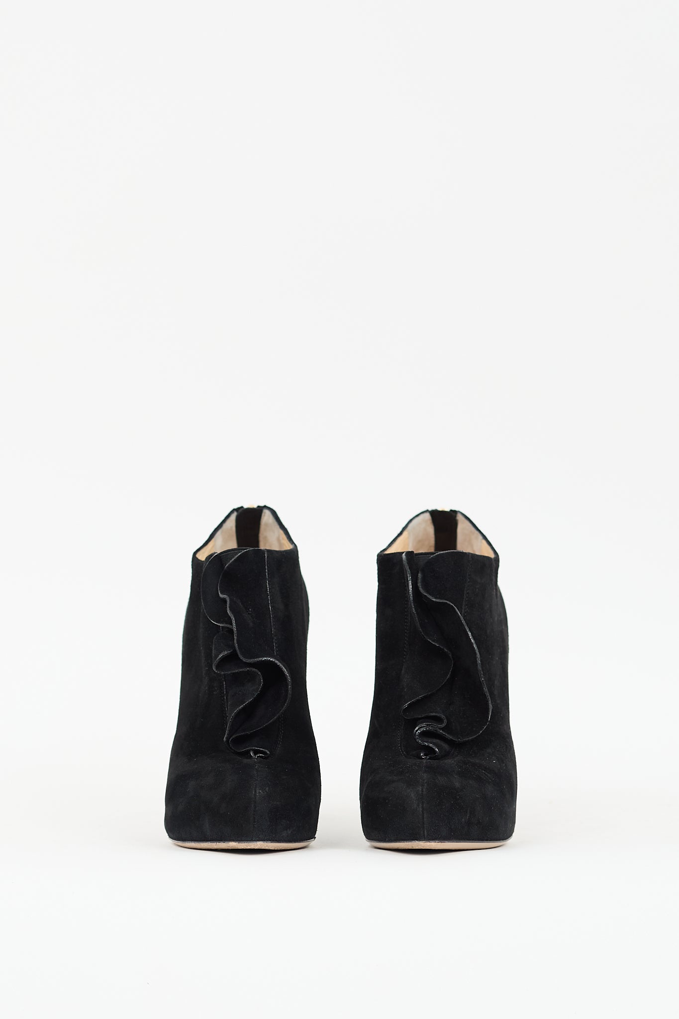 Pre-owned Valentino black suede ankle boots featuring almond toe, ruffle front, gold tone zip at counter, covered stiletto heel, and leather insole and outsole.