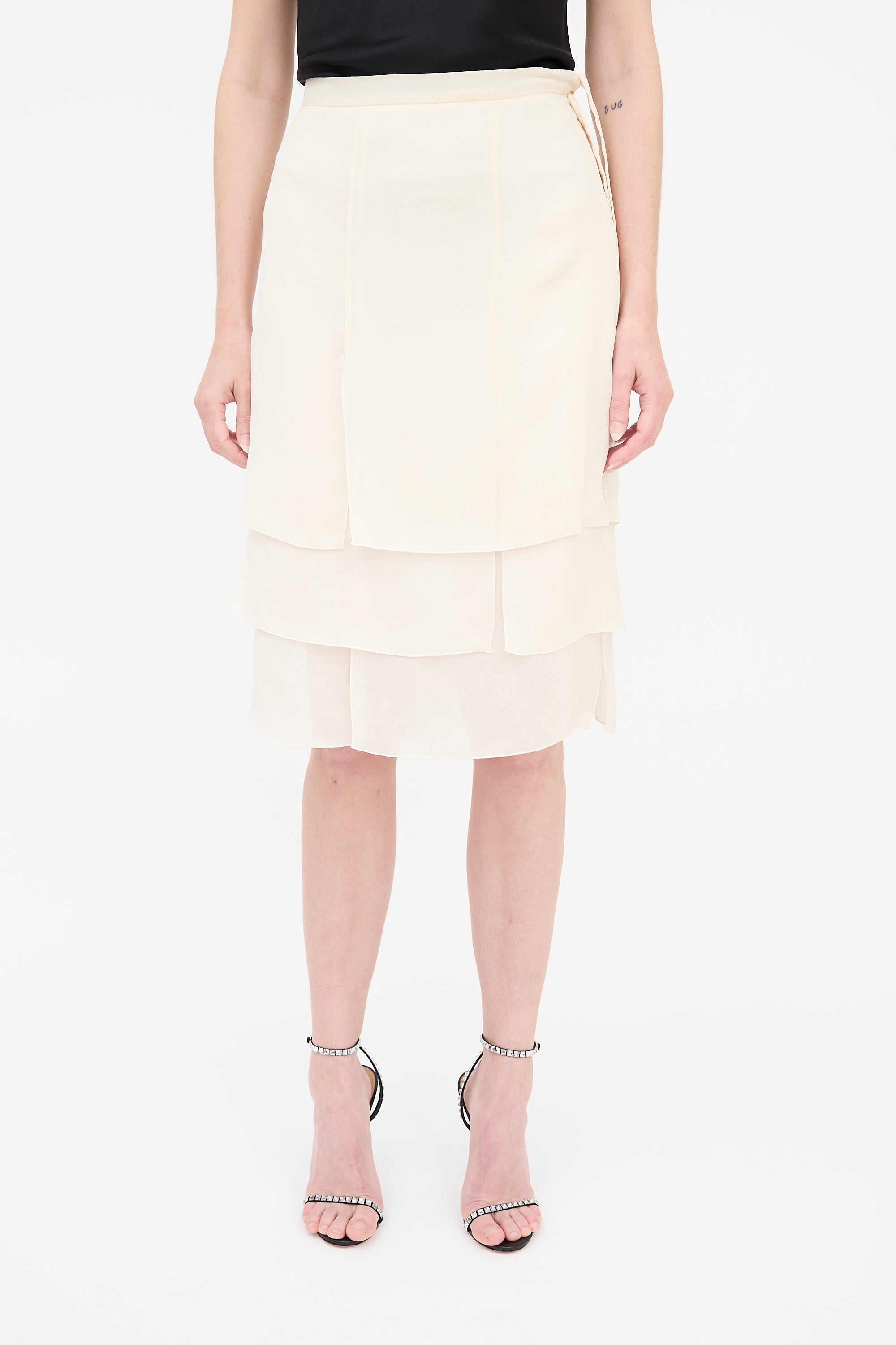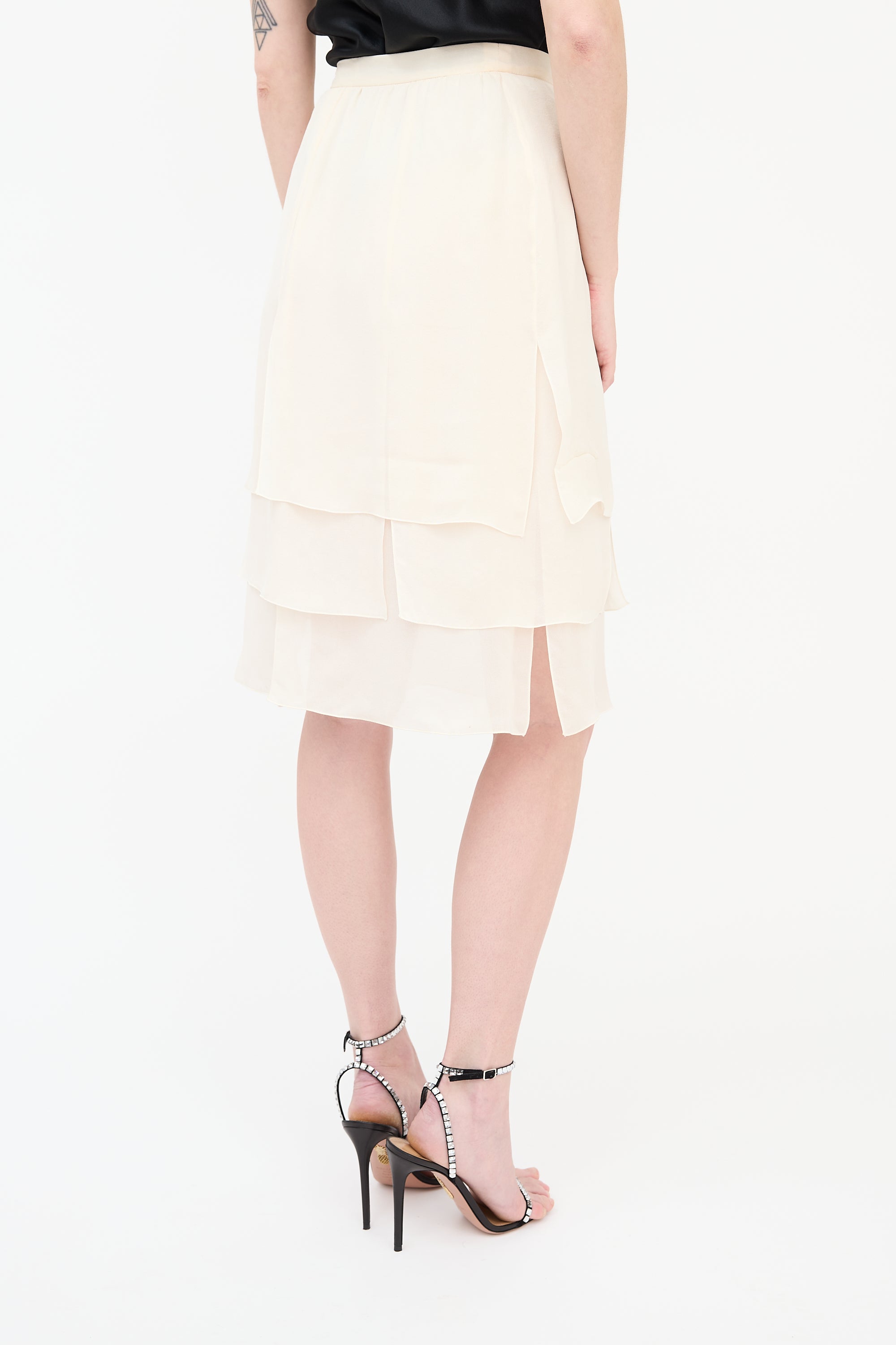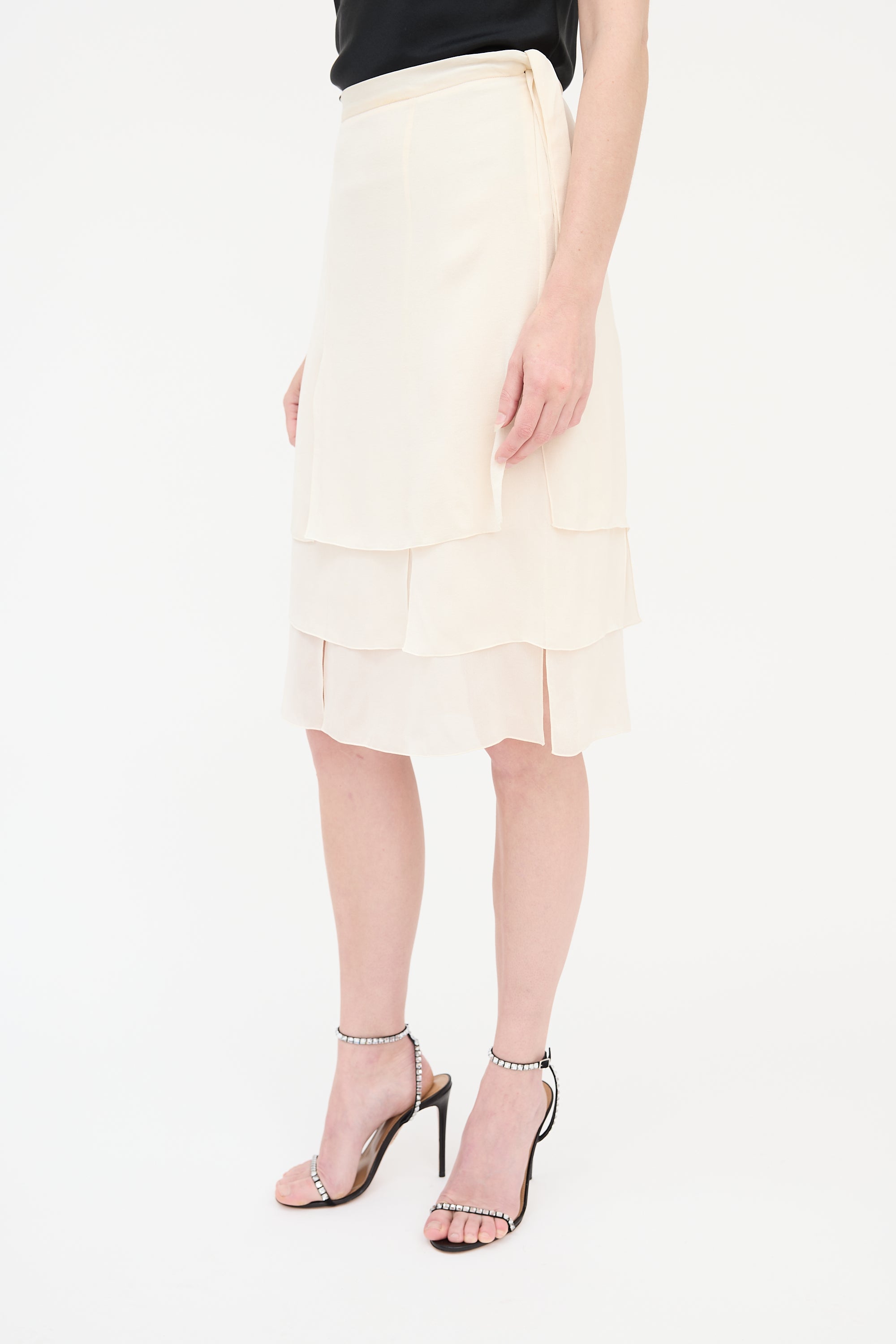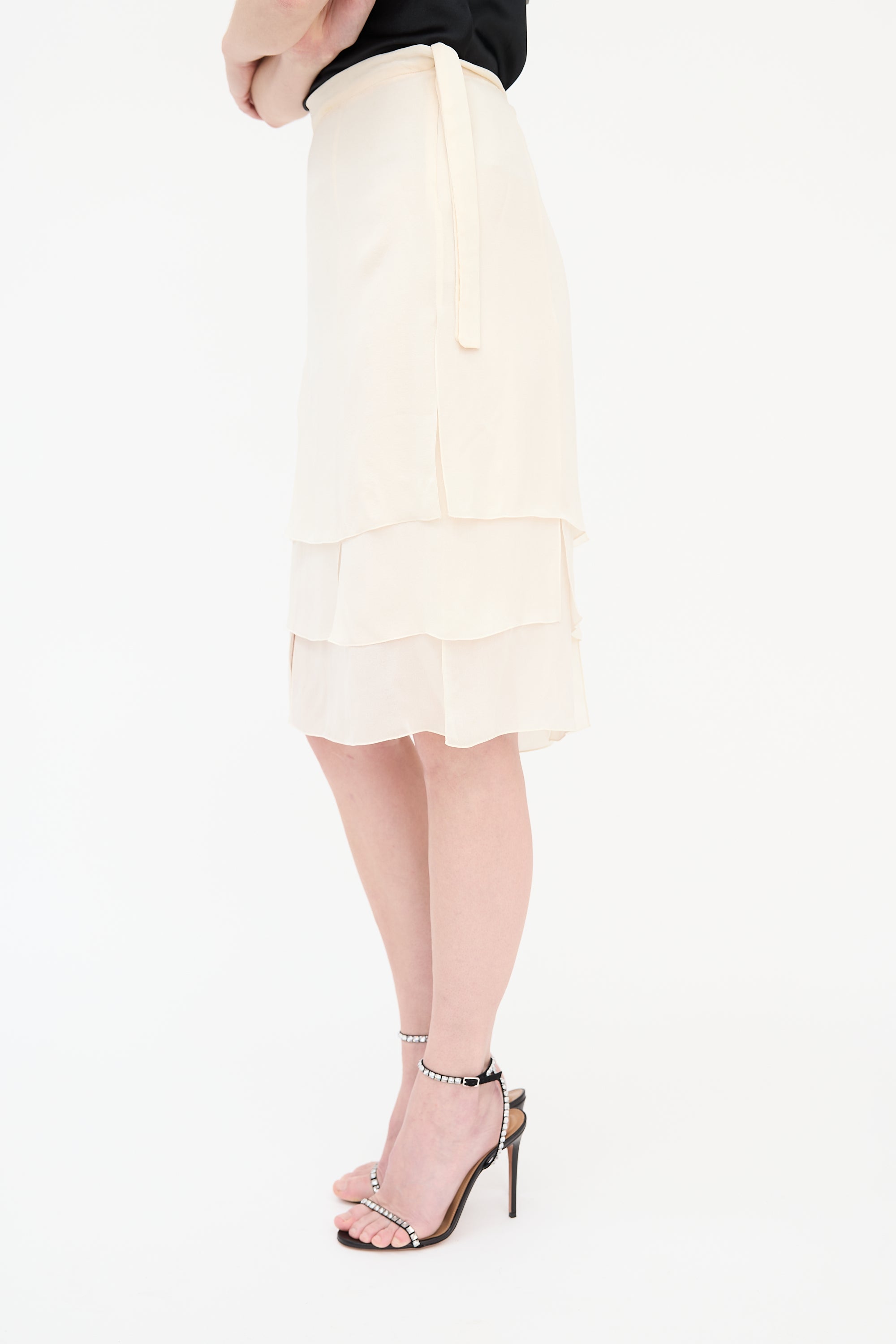 Pre-owned Valentino cream silk skirt featuring a side zip closure, tie detail at left waist, and a layered hem with vents throughout. Clipped to fit model.
