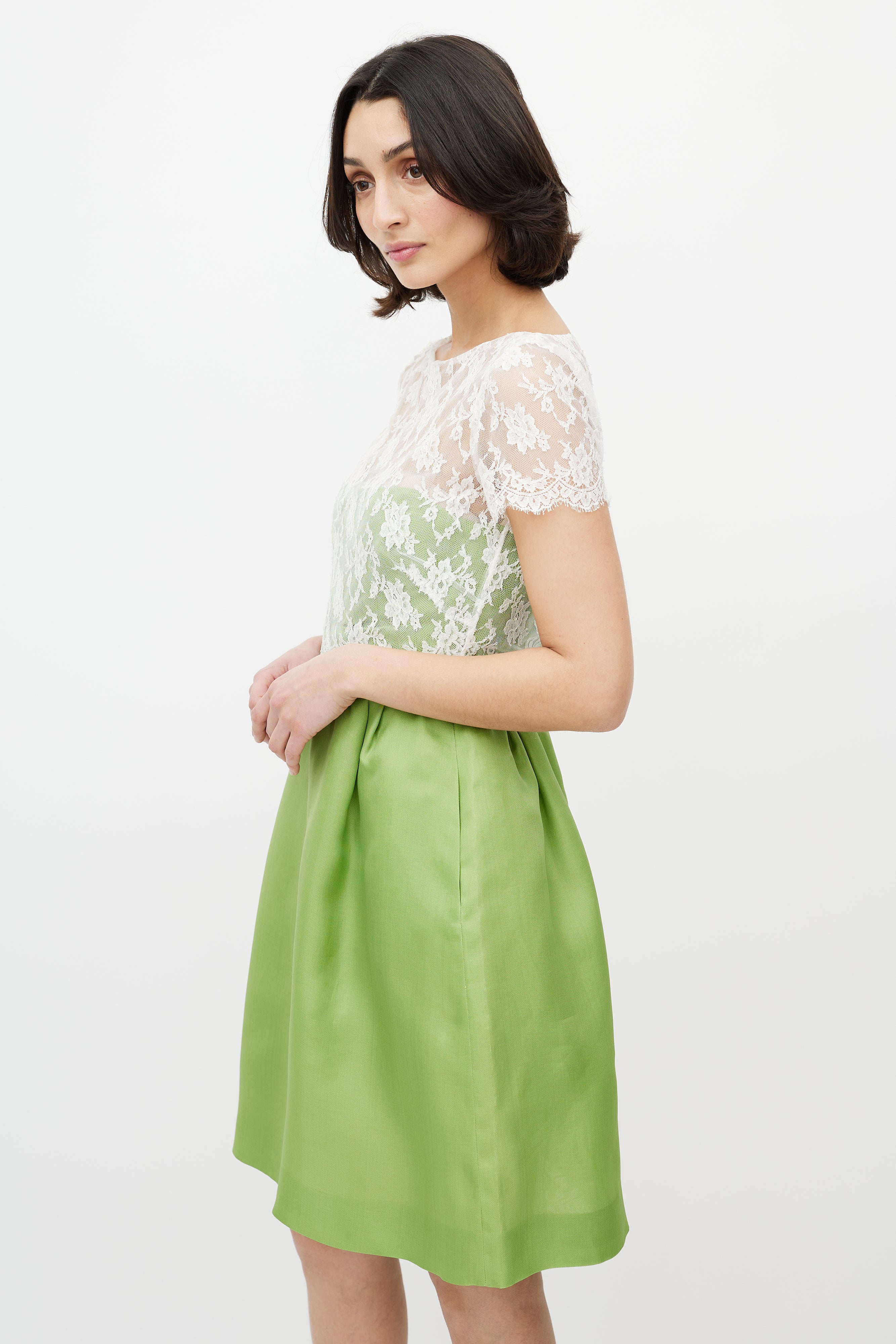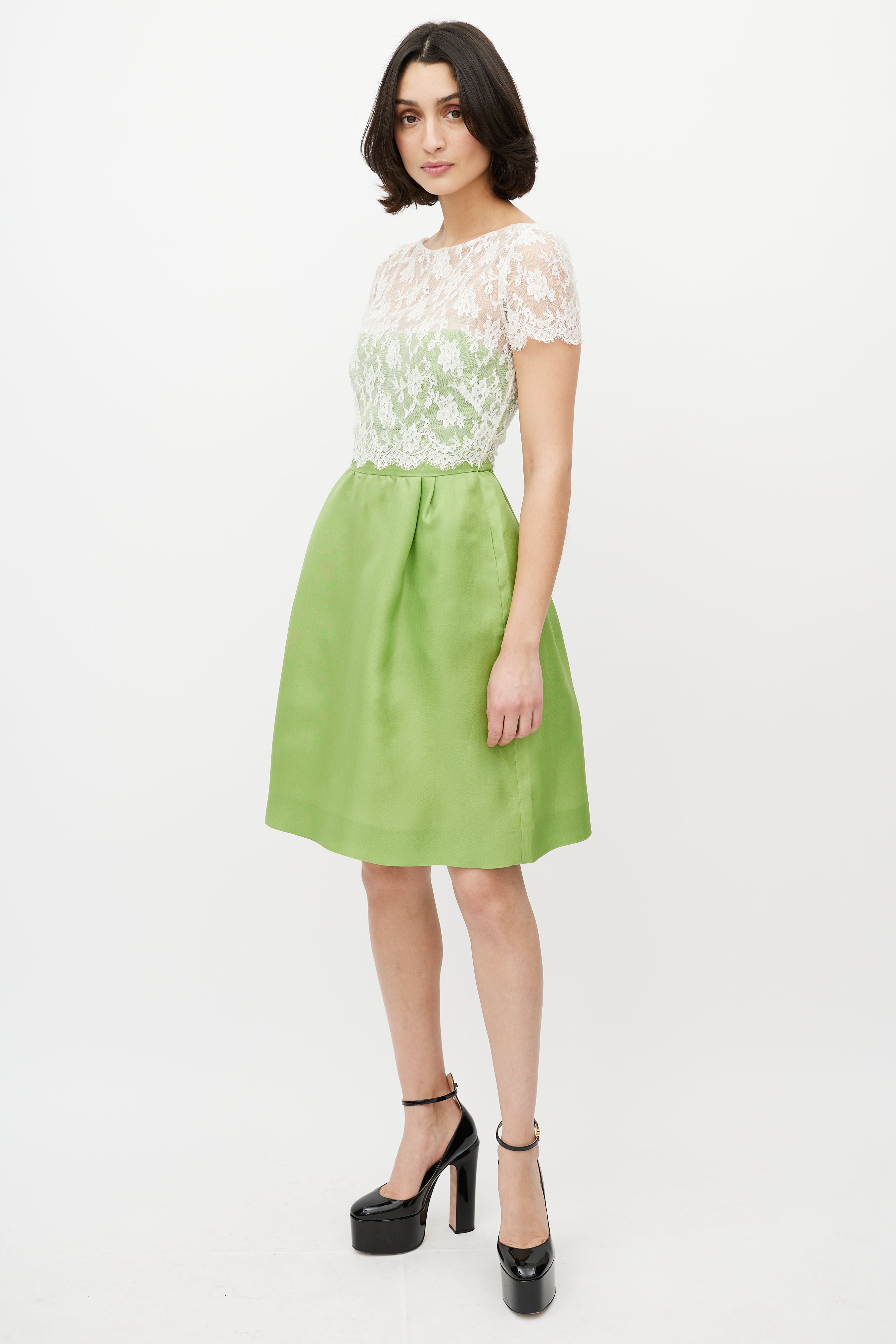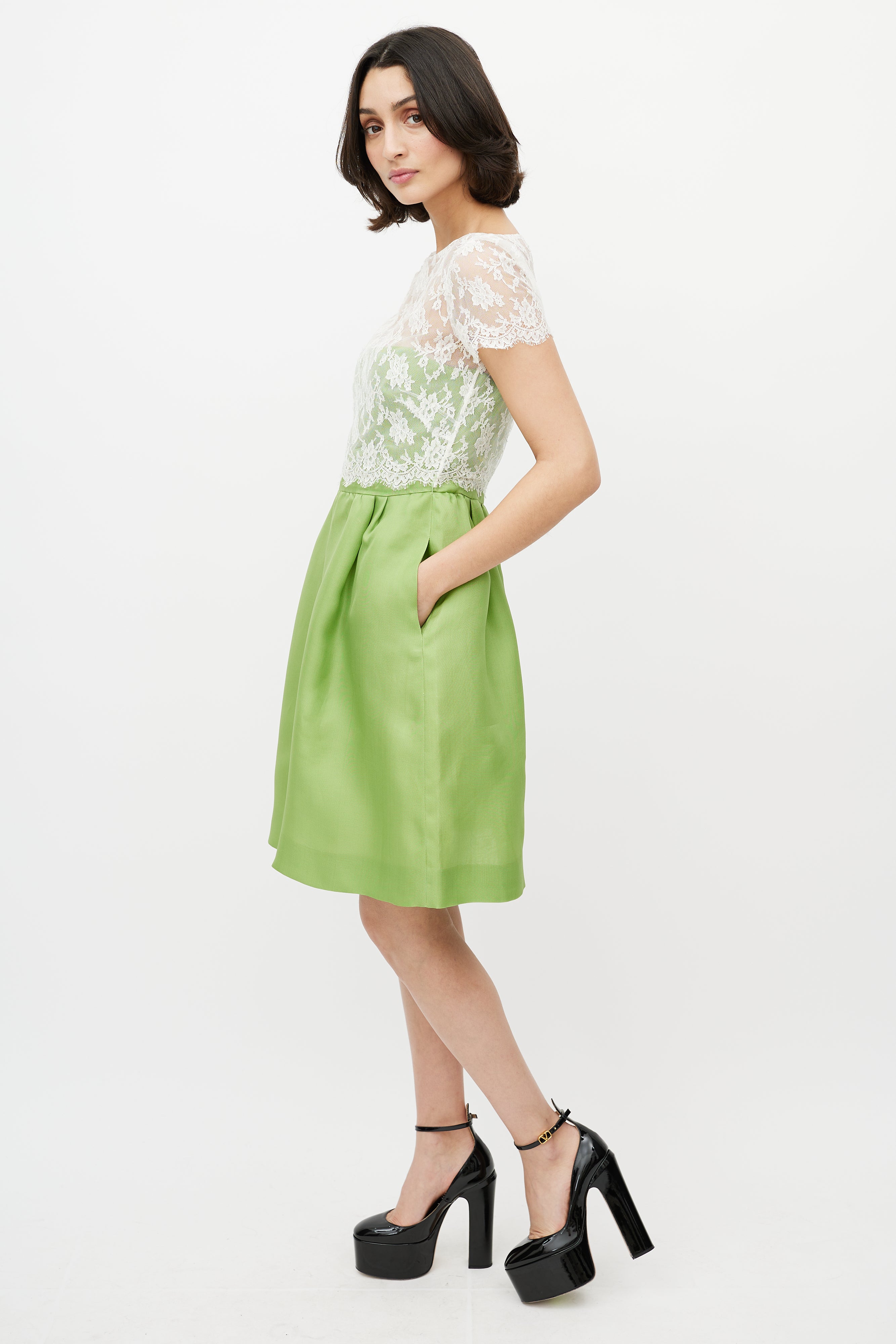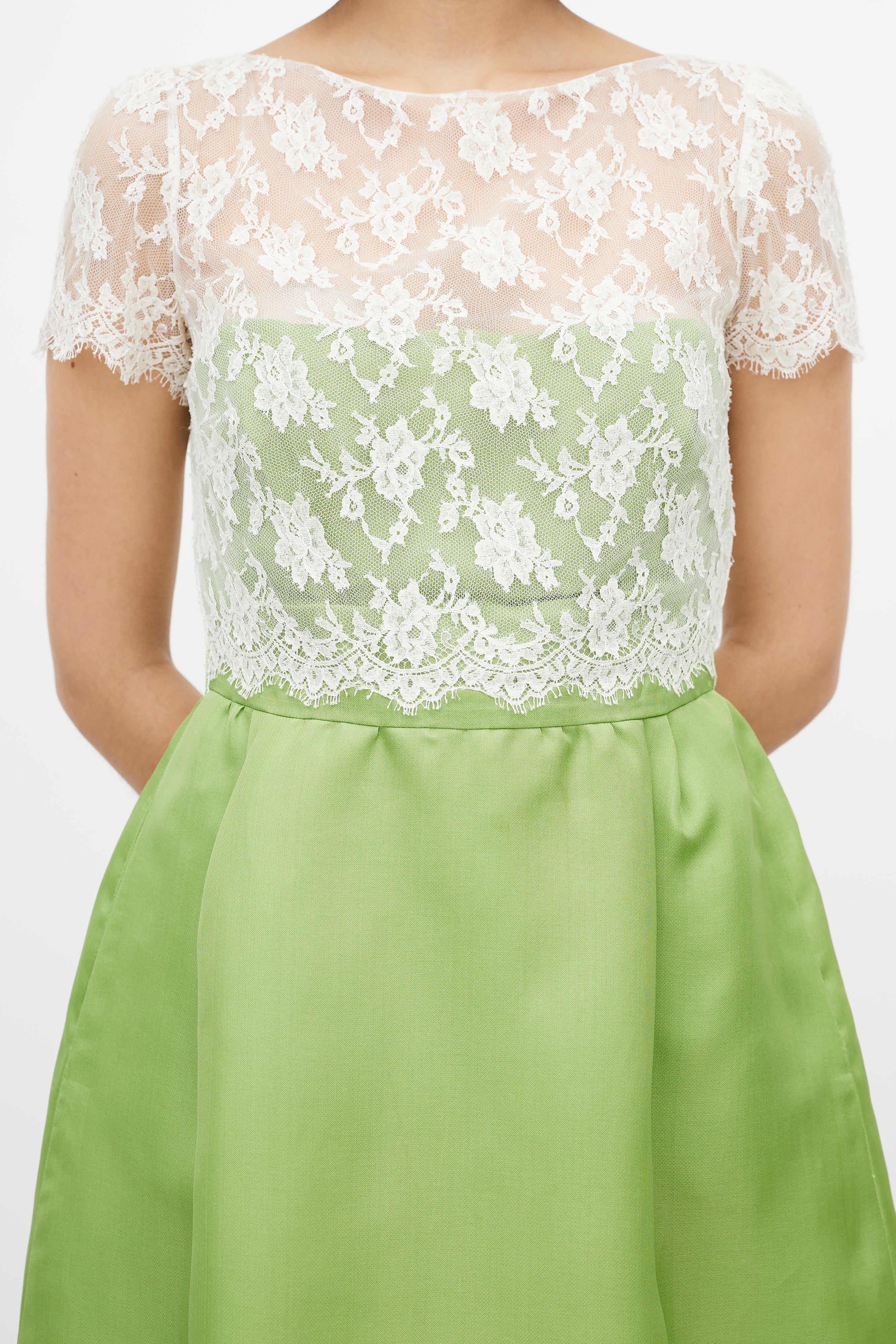 Pre-owned Valentino white and green silk dress featuring lace bodice, short sleeves, crew neckline, A-line skirt, two hip pockets, keyhole back, and zip closure at back. Lined. Clipped to fit model.