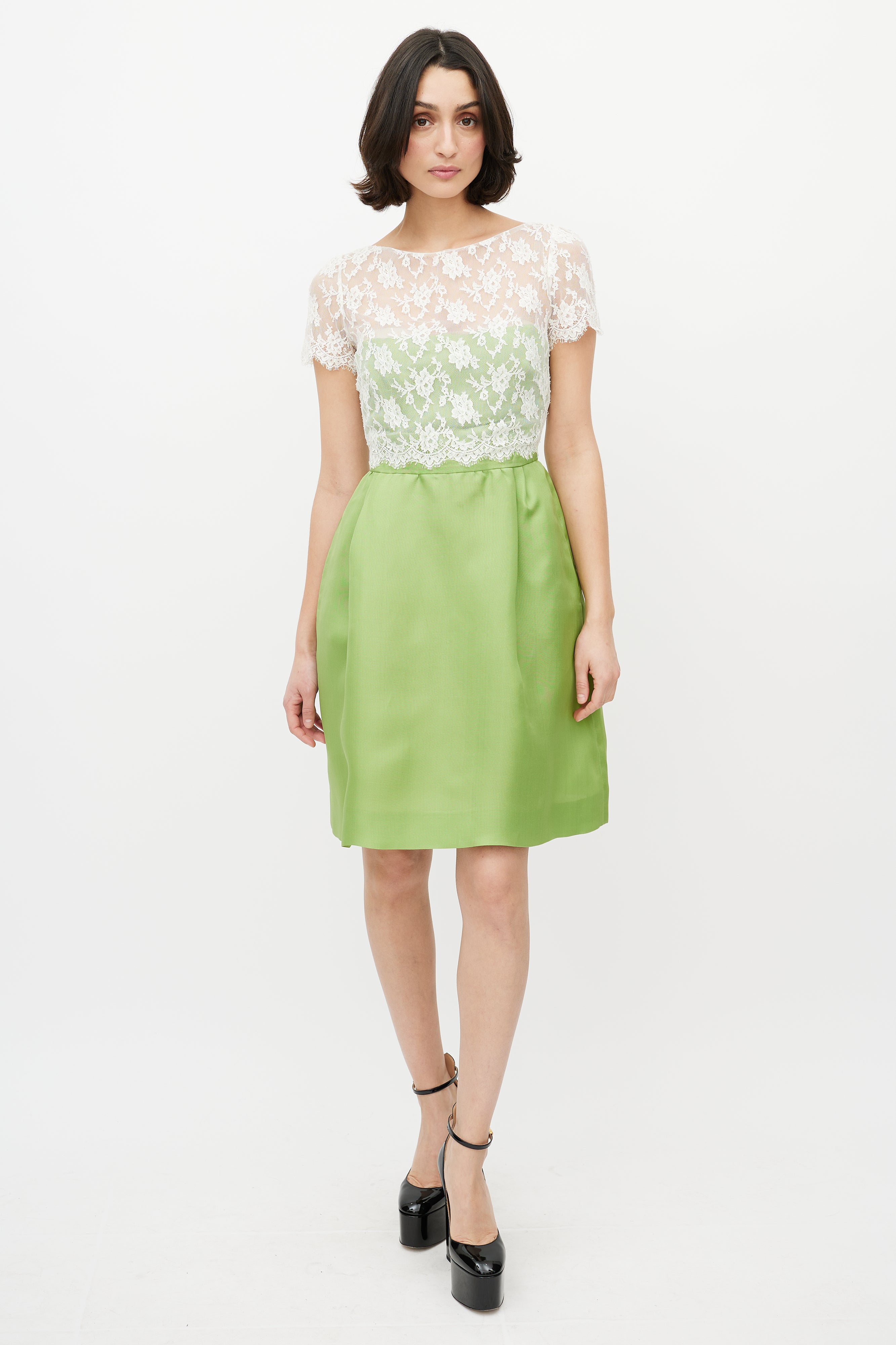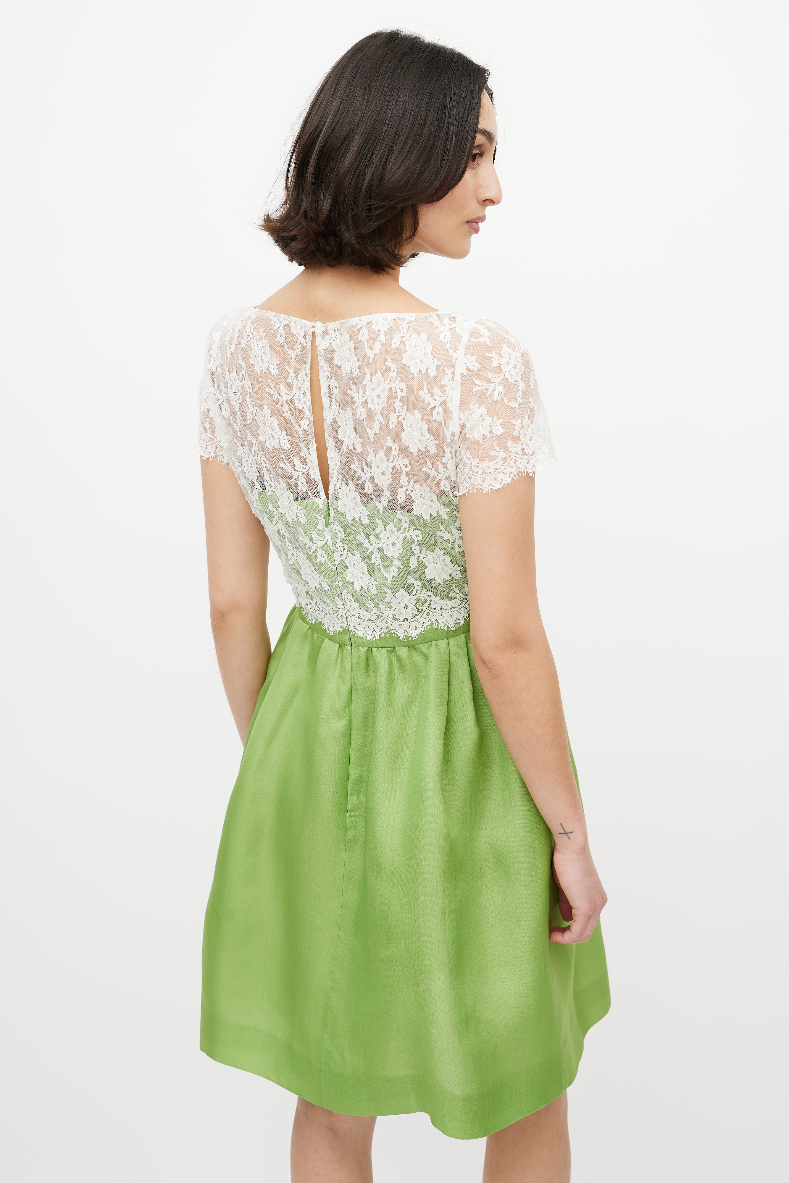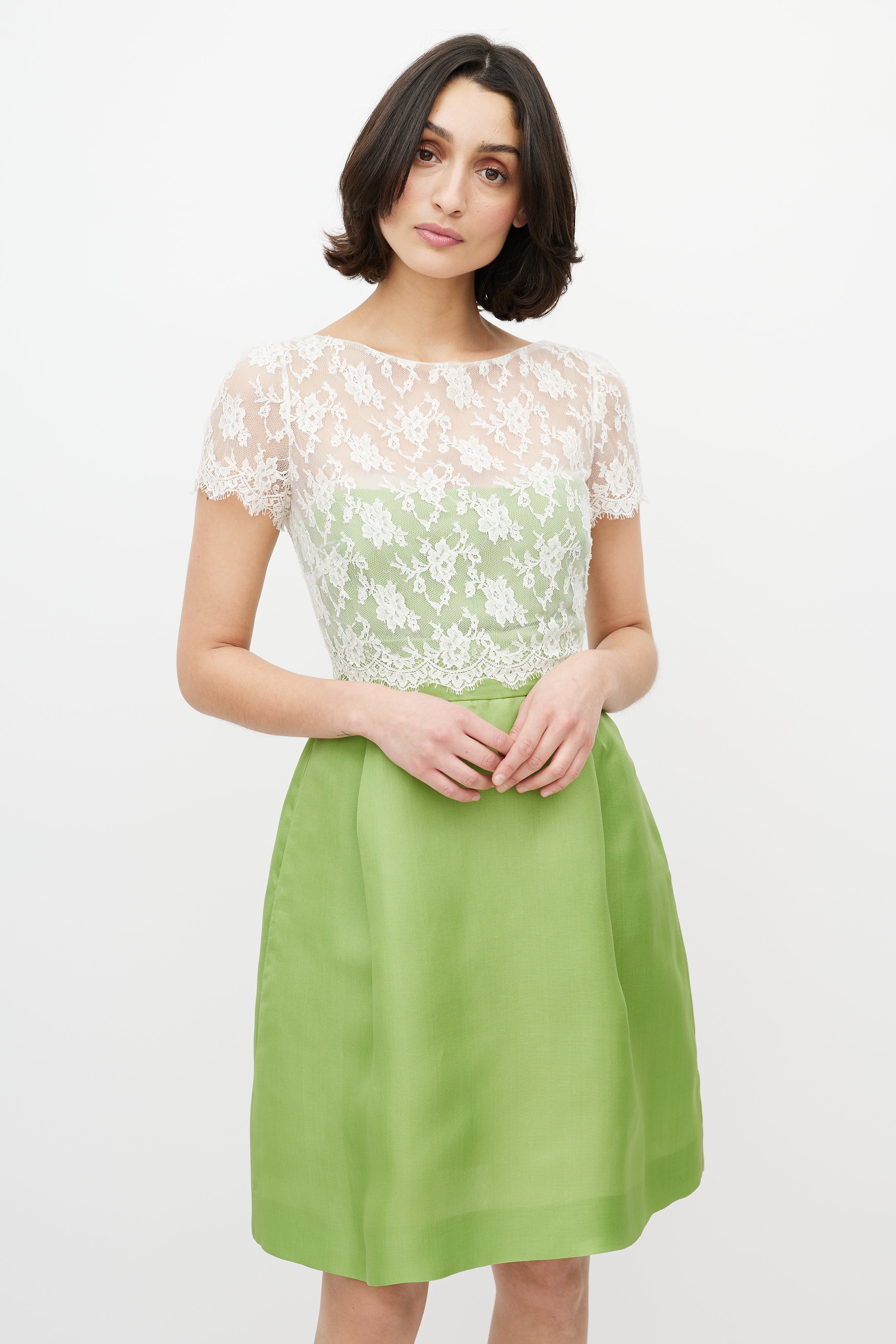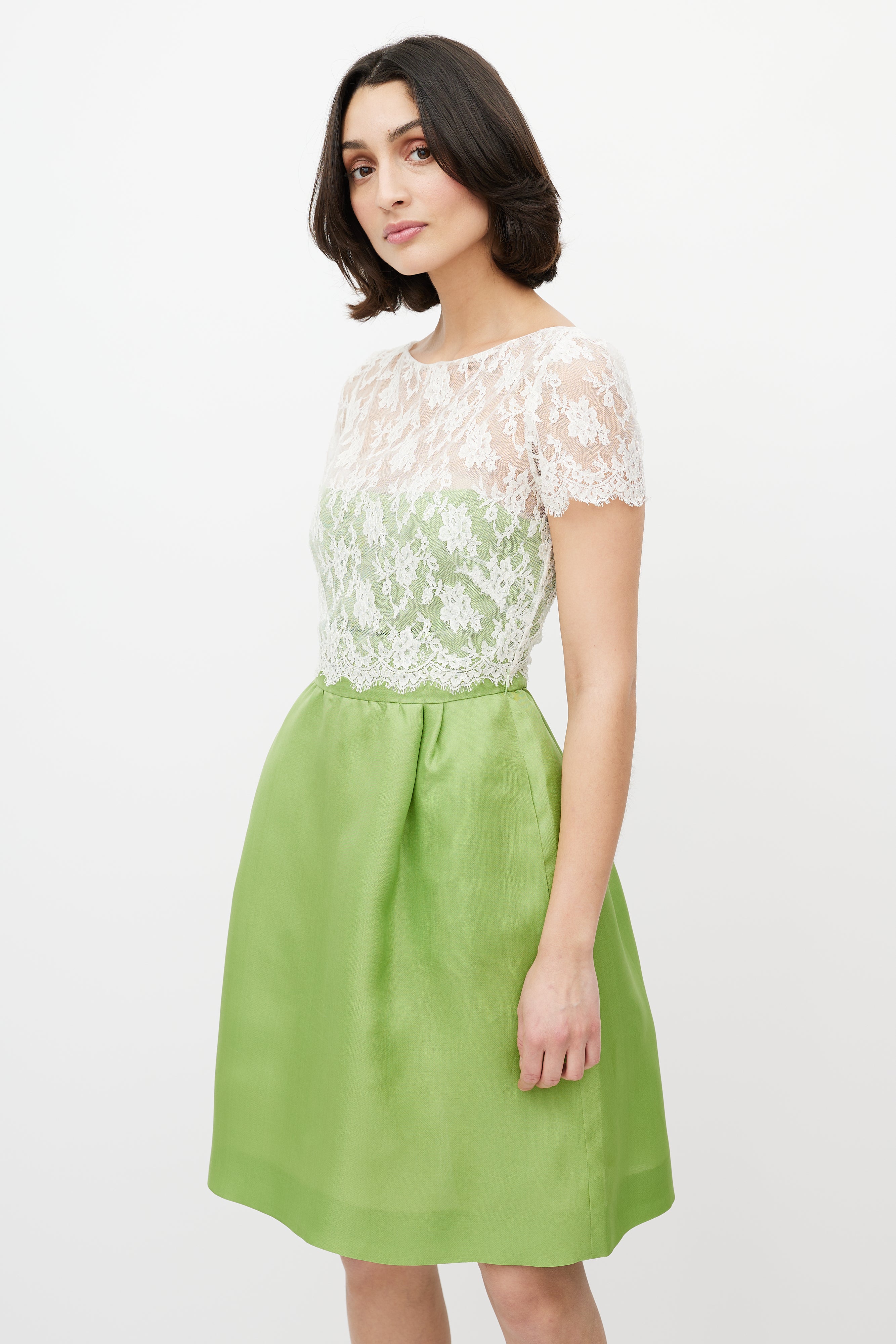 Pre-owned Valentino white and green silk dress featuring lace bodice, short sleeves, crew neckline, A-line skirt, two hip pockets, keyhole back, and zip closure at back. Lined. Clipped to fit model.