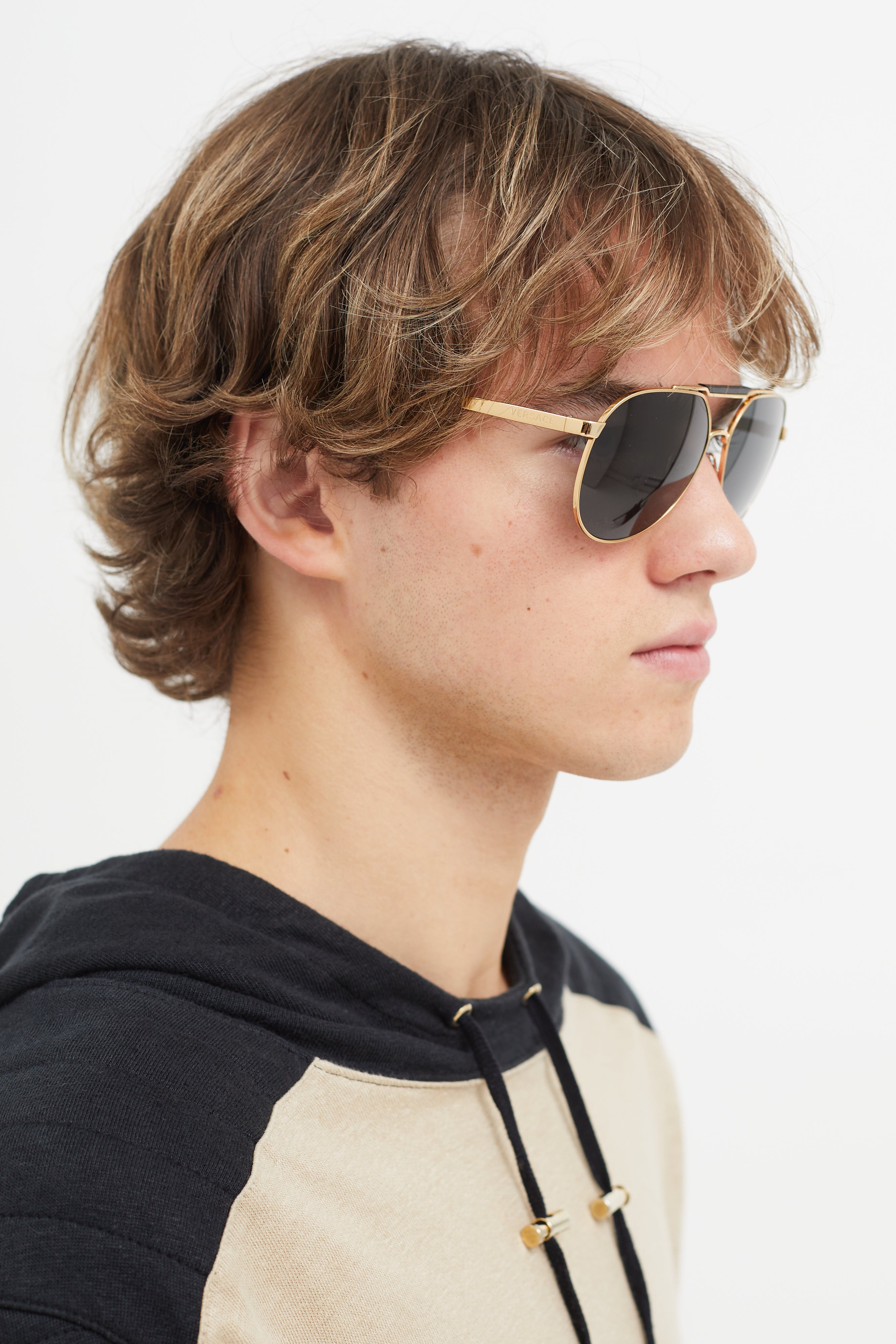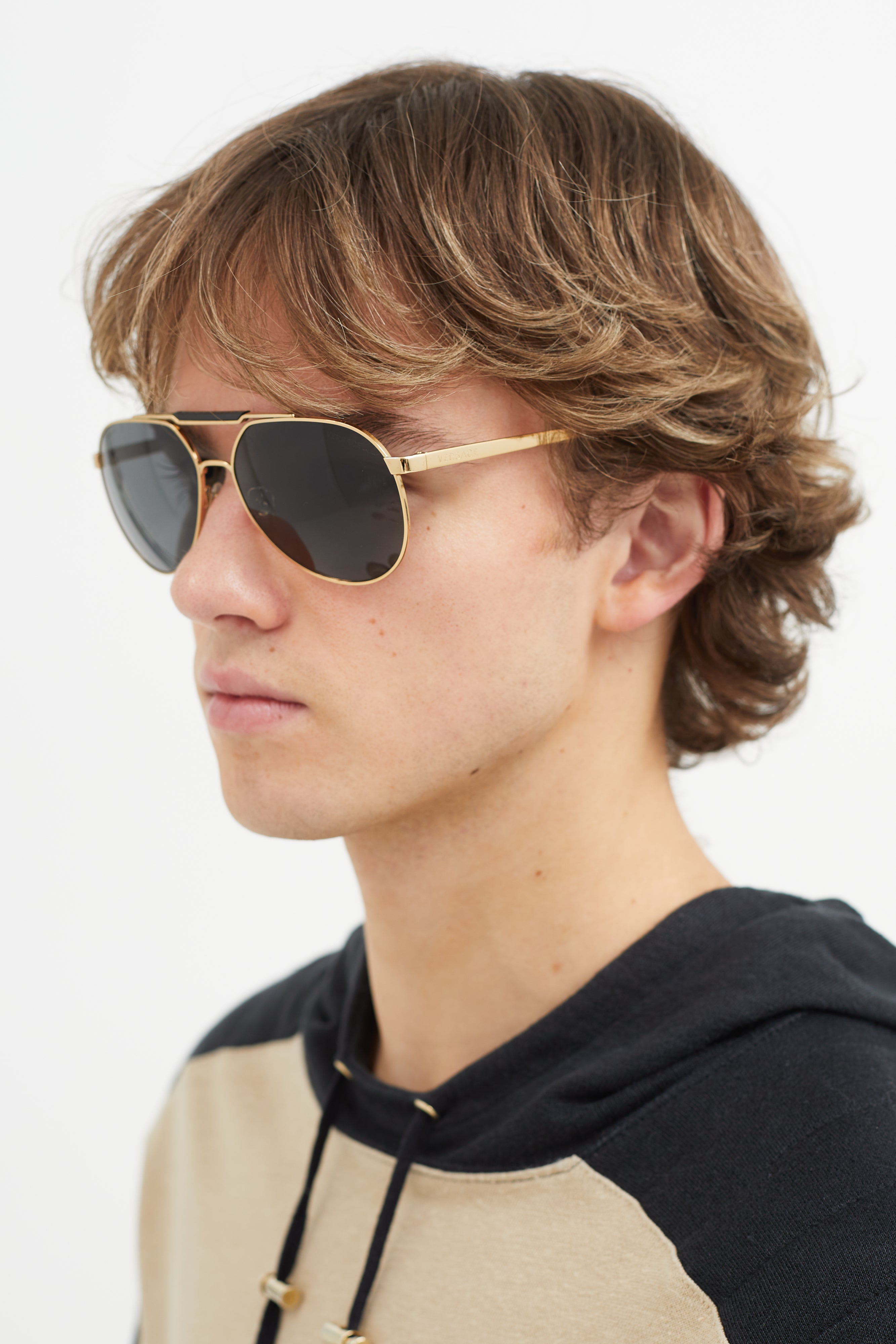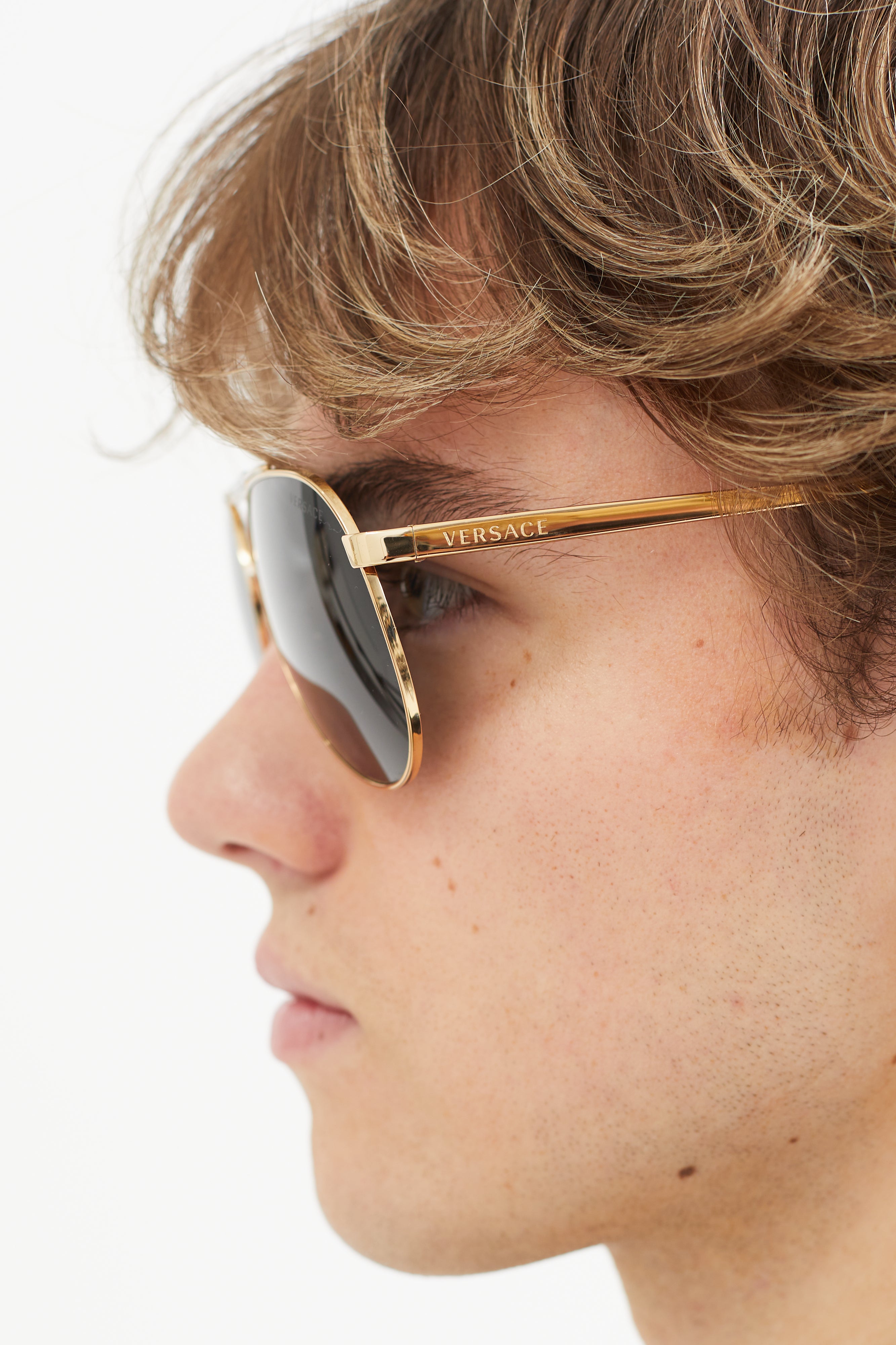Pre-owned Versace black VE 2155 aviator sunglasses featuring tinted black lenses, gold tone hardware, nose pads, gold tone brow bridge, embossed logo at sides, and gold tone arms. Comes with original case.
