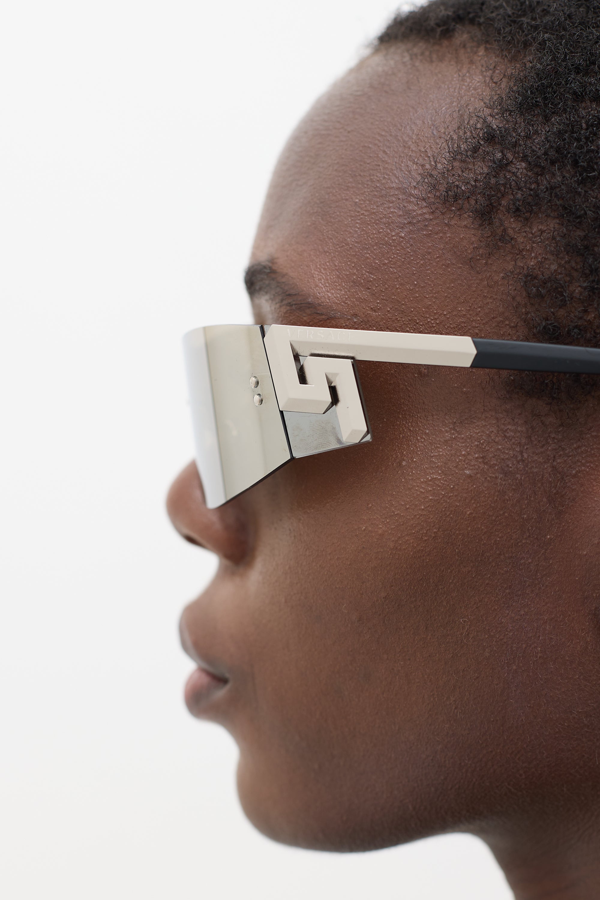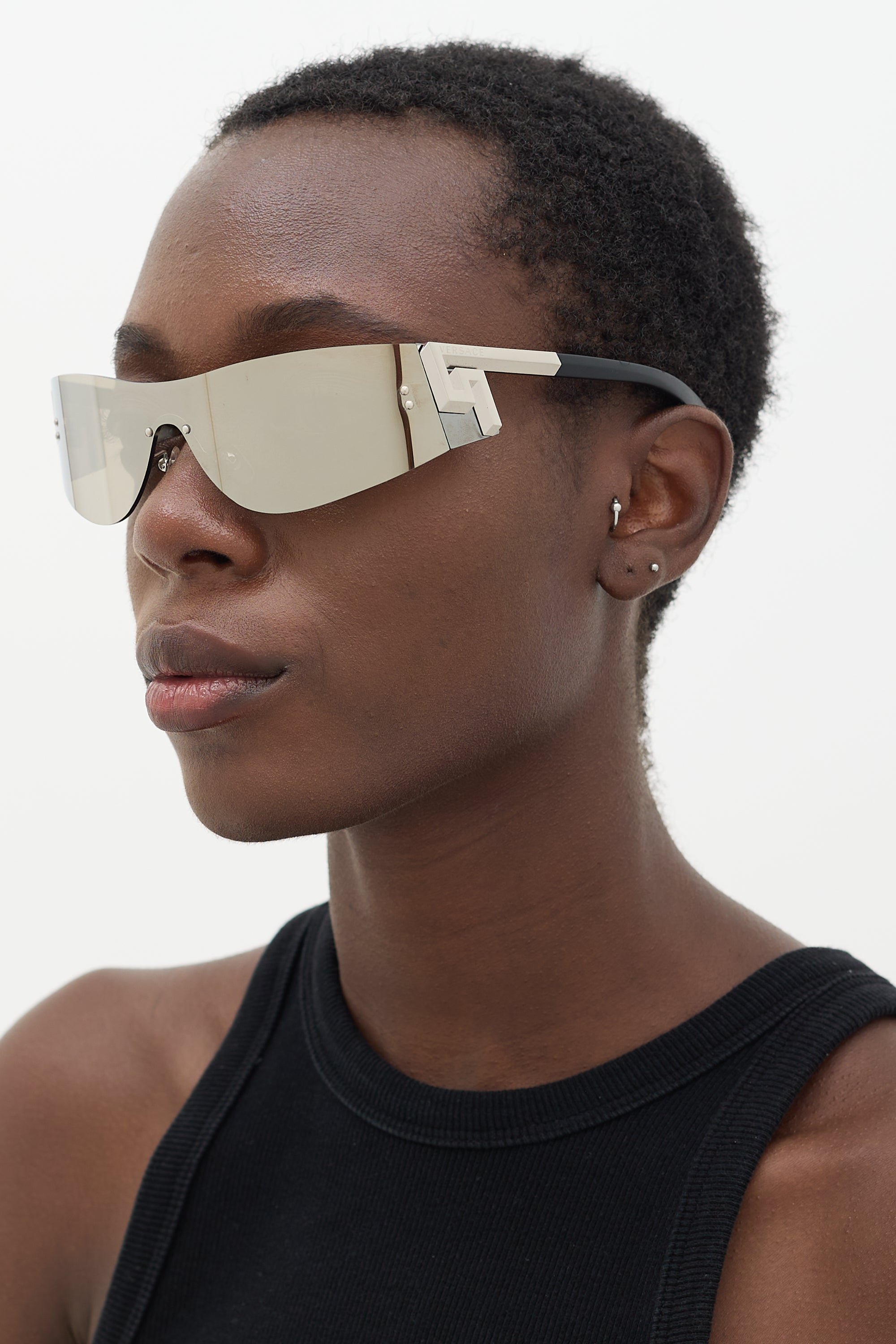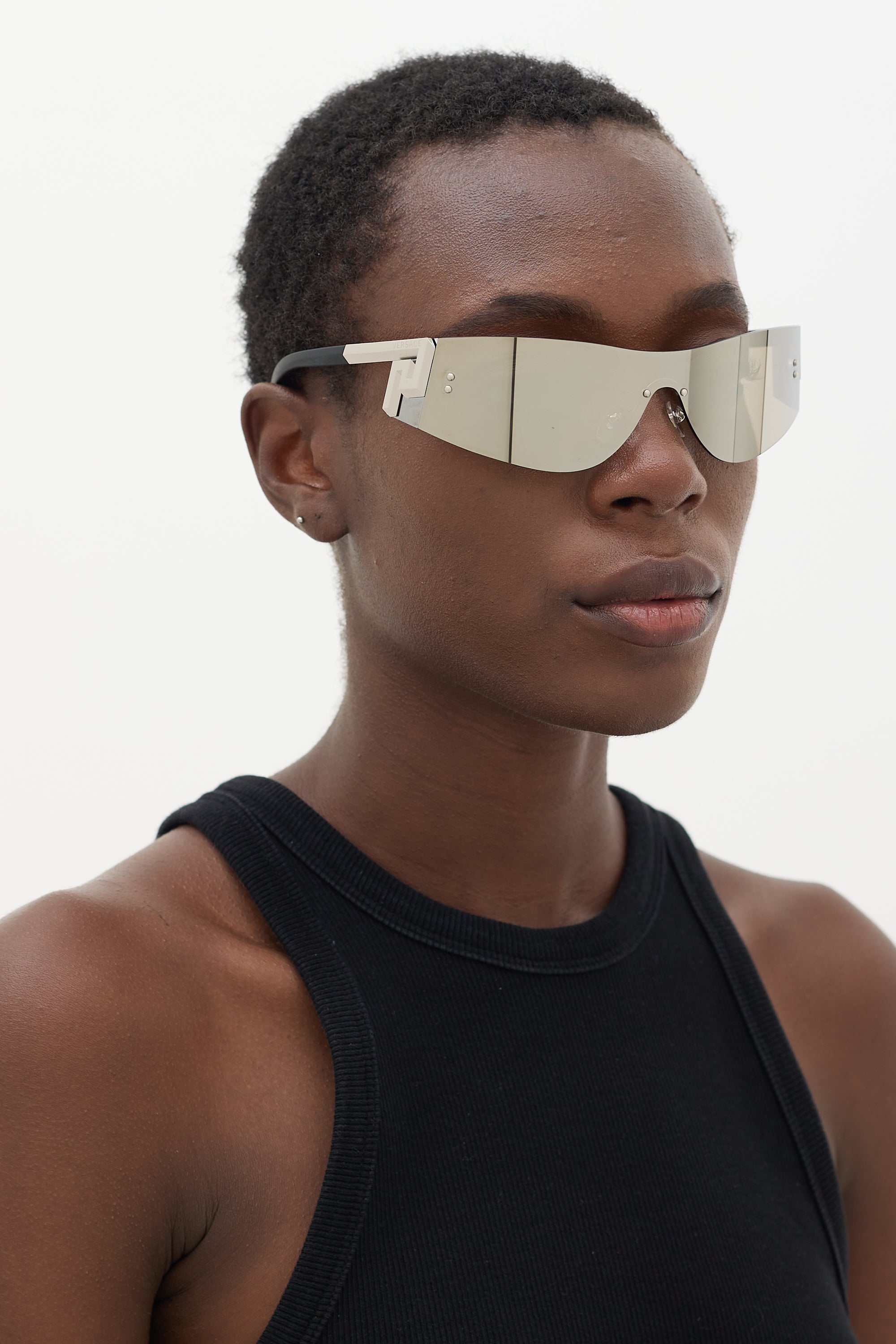 Pre-owned Versace silver 2241 shield sunglasses featuring a rimless reflective lens, adjustable nose pads, engraved logo at temples, and black arms. Comes with original case.