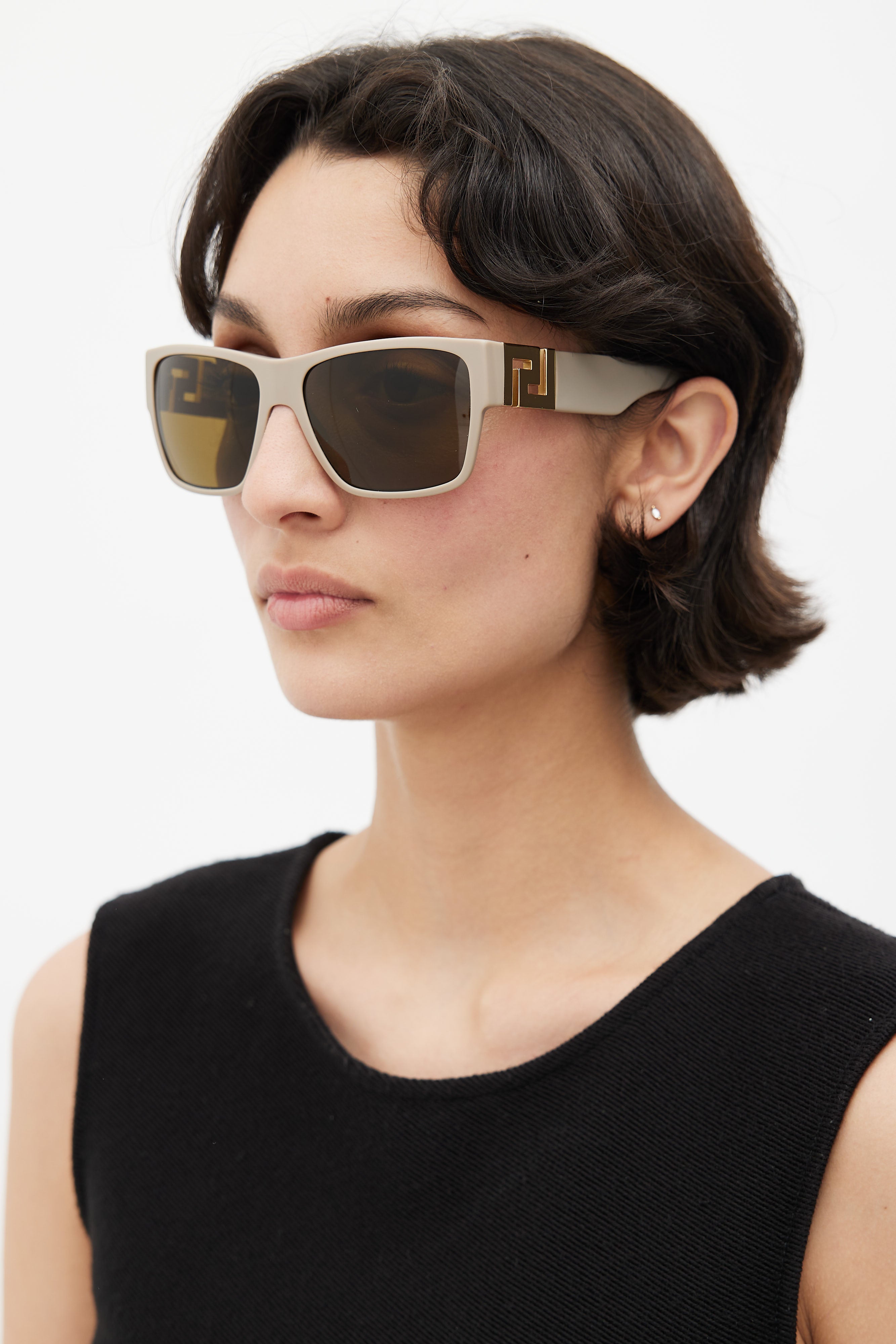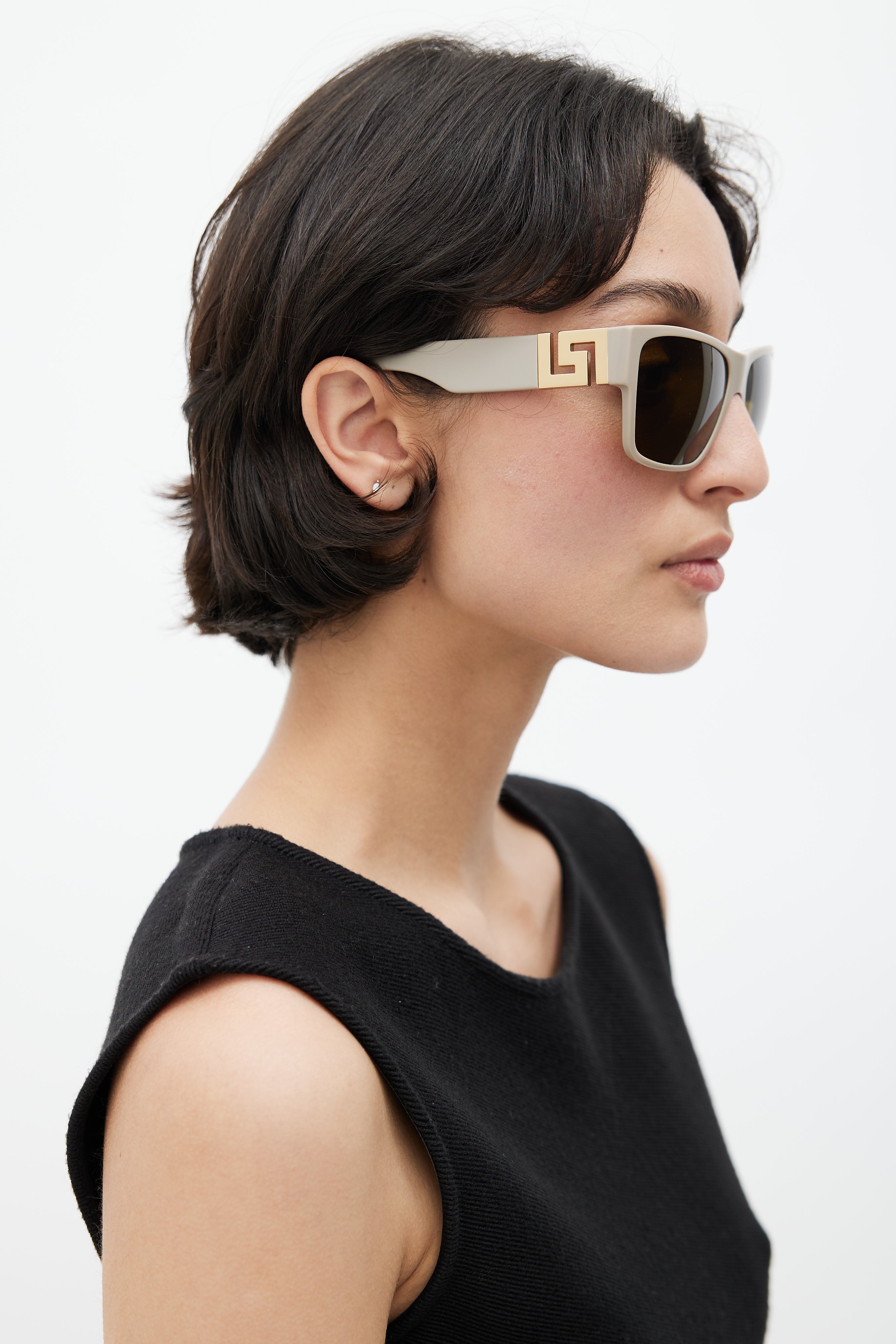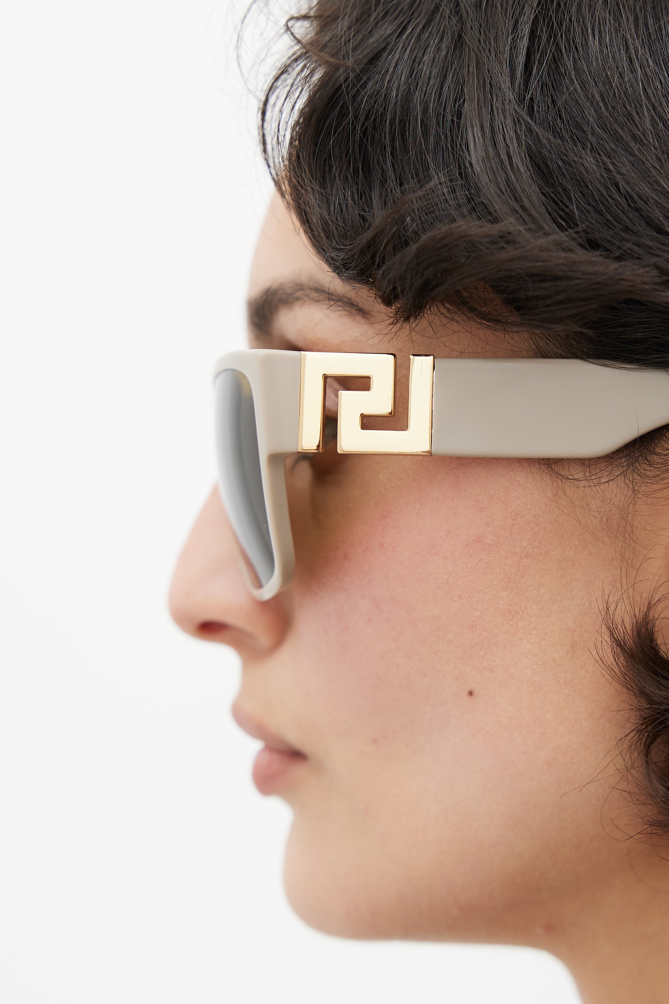 Pre-owned Versace taupe MOD 4196 sunglasses featuring tinted rectangular lens, nose saddle bridge, and gold tone Greek key logo motif hardware at temple. Comes with original case.
